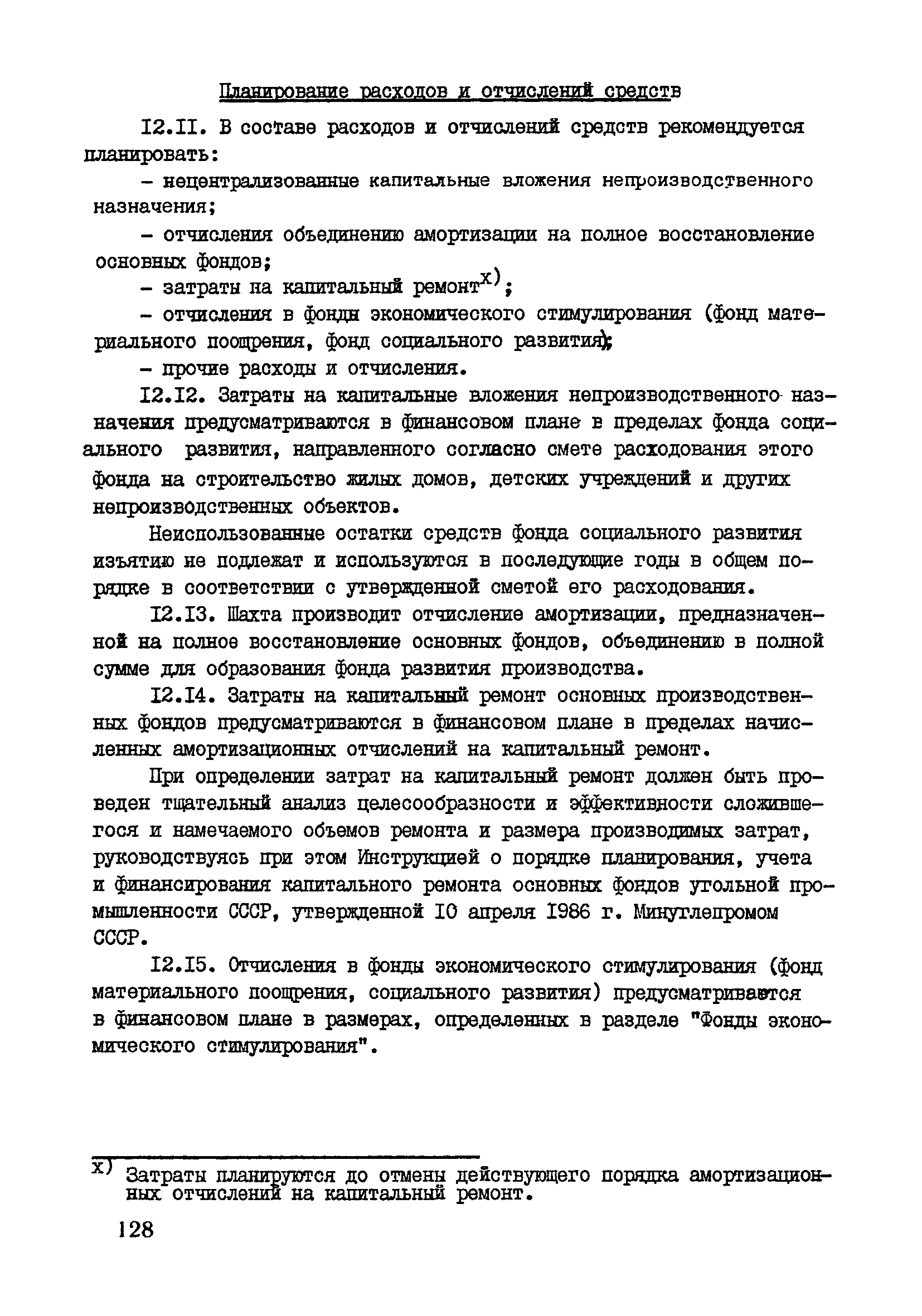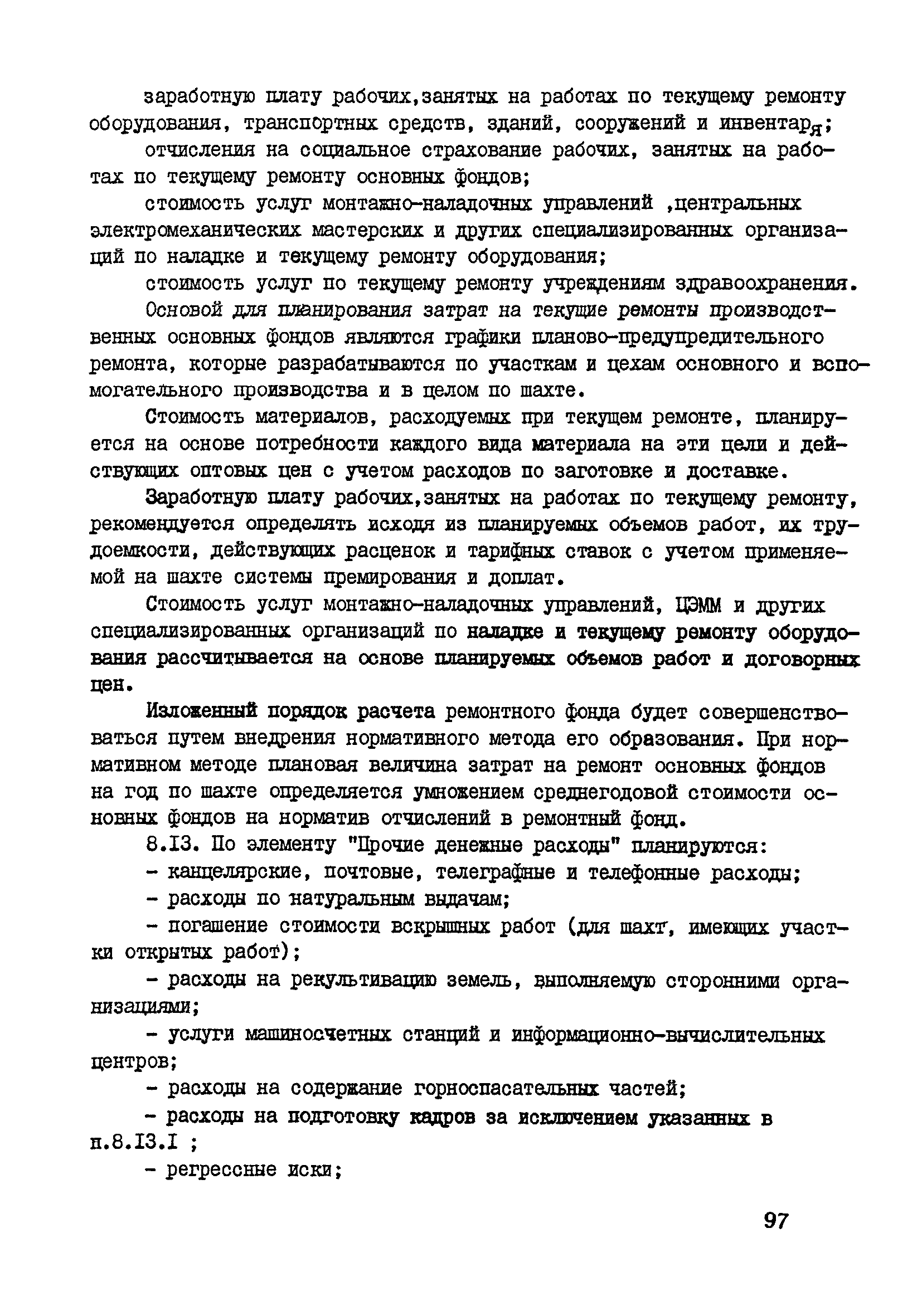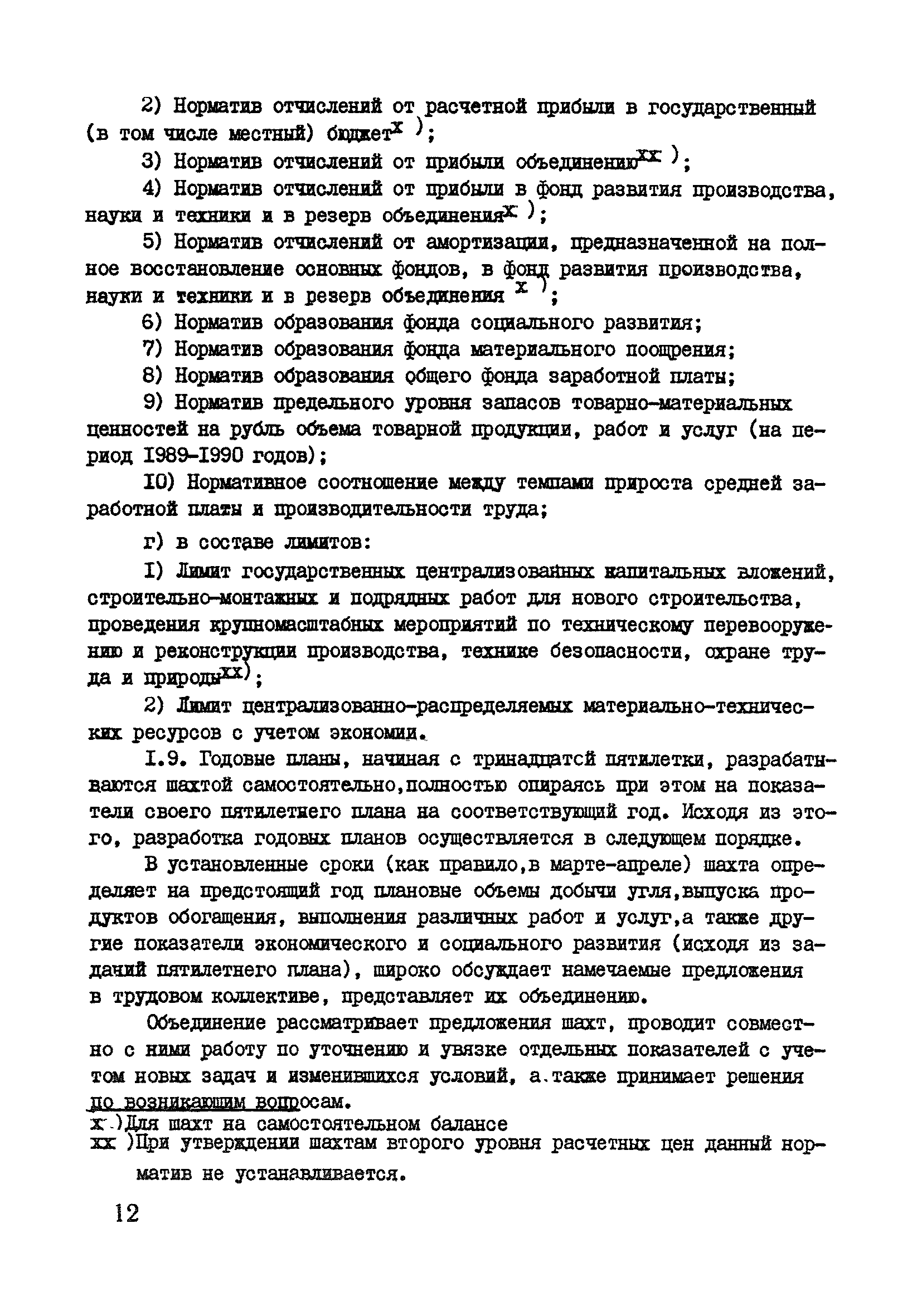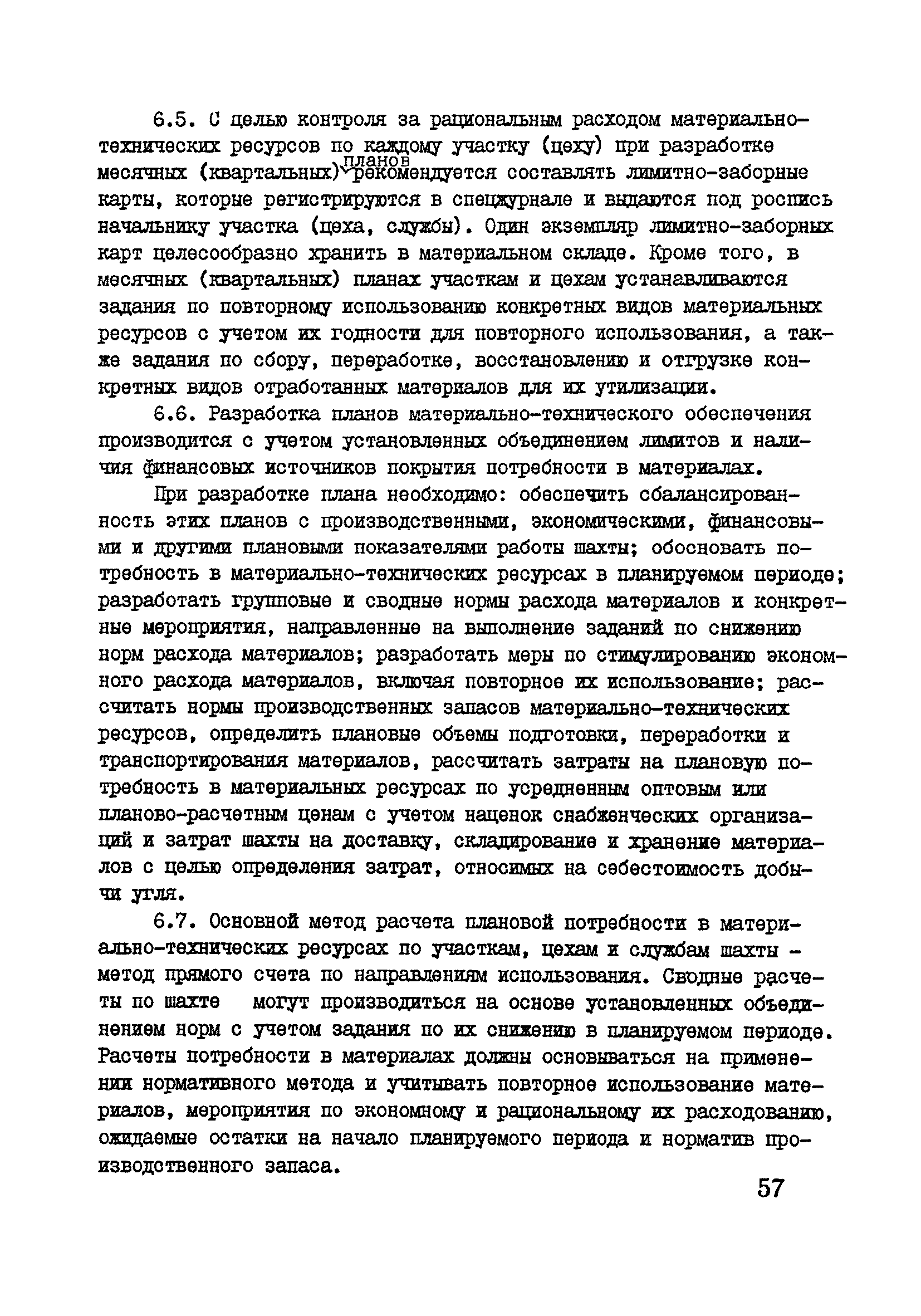 | Оглавление: | Введение Раздел 1. Основные организационно-методические положения Раздел 2. Планирование привоза продукции Раздел 3. Планирование технического развития производства Раздел 4. Планирование экономической эффективности производства Раздел 5. Планирование капитальных вложений Раздел 6. Планирование материально-технического обеспечения Раздел 7. Планирование труда и заработной платы Раздел 8. Планирование себестоимости, прибыли и рентабельности Раздел 9. Планирование фондов экономического стимулирования Раздел 10. Планирование социального развития коллектива Раздел 11. Планирование охраны окружающей среды и рационального использования природных ресурсов Раздел 12. Разработка финансового плана Раздел 13. Нормы и нормативы Приложение 1. Пример расчета средней продолжительности отпуска рабочих по добыче угла Приложение 2. Примеры расчета коэффициентов списочного состава рабочих по добыче угля, применяемых при разработке месячных планов Приложение 3. Коэффициенты списочного состава рабочих по добыче угля для различных режимов работы и различной продолжительности очередного отпуска, применяемые при разработке месячных планов Приложение 4. Расчет фонда заработной платы промышленно-производственного персонала по добыче угля по шахте (примерная форма) Приложение 5. Смета затрат на производство Приложение 6. Расчет услуг промышленного характера капитальному строительству, капитальному ремонту и на сторону (примерная форма) Приложение 7. Расчетный баланс расходов и доходов (примерная форма) Приложение 8. Перечень методических документов по расчету норм и нормативов для планирования на шахтах (по состоянию на 01.02.89) Приложение 9. Перечень нормативных документов по расчету норм и нормативов, подлежащих разработке и обновлению в 1989 - 1990 гг. |