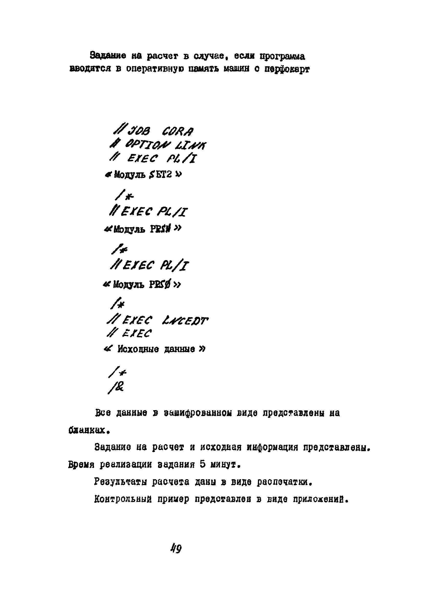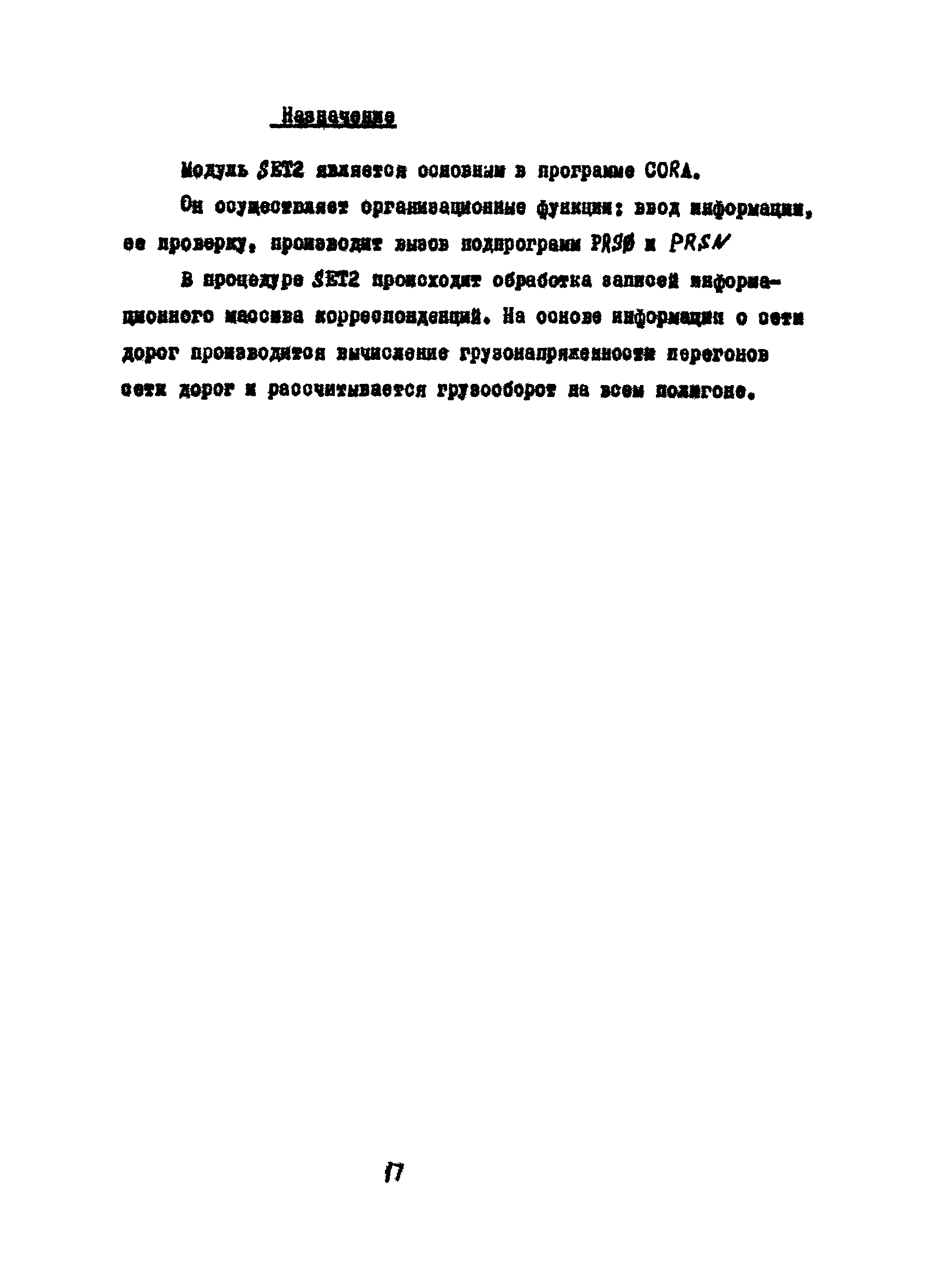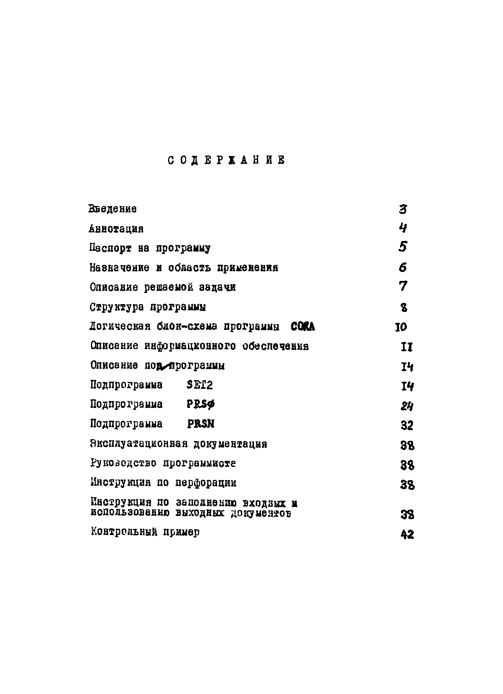 | Оглавление: | Введение Аннотация 1. Паспорт на программу 2. Назначение и область применения 3. Описание решаемой задачи 4. Структура программы 5. Логическая блок-схема программы CORA 6. Описание информационного обеспечения 7. Описание подпрограмм 7.1. Подпрограмма SET2 7.2. Подпрограмма PRSO 7.3. Подпрограмма PRSN 8. Эксплуатационная документация 8.1. Руководство программиста 8.2. Инструкция по перфорации 8.3. Инструкция по заполнению входных и использованию выходных документов 8.4. Контрольный пример |