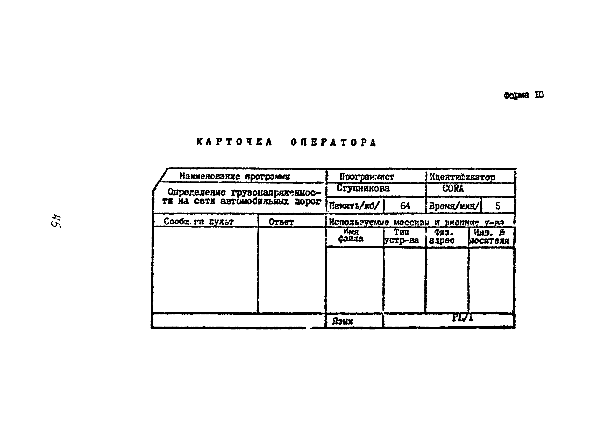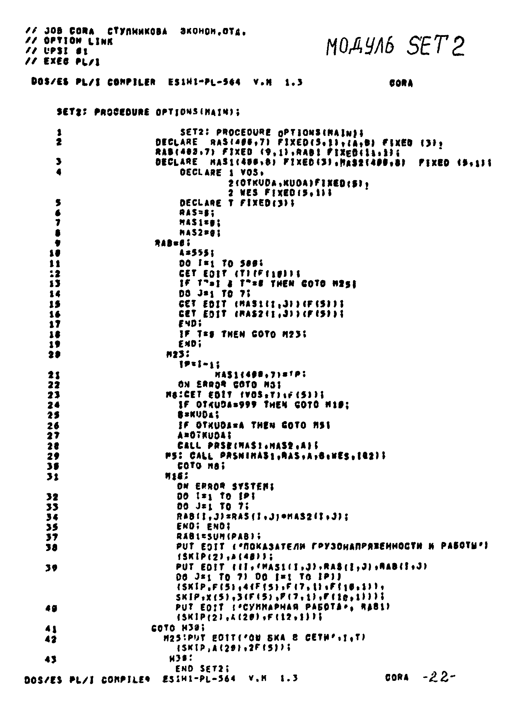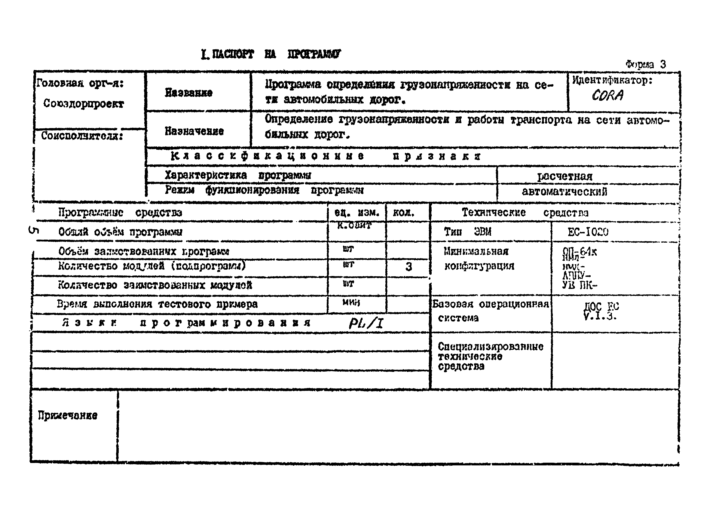 | Оглавление: | Введение Аннотация 1. Паспорт на программу 2. Назначение и область применения 3. Описание решаемой задачи 4. Структура программы 5. Логическая блок-схема программы CORA 6. Описание информационного обеспечения 7. Описание подпрограмм 7.1. Подпрограмма SET2 7.2. Подпрограмма PRSO 7.3. Подпрограмма PRSN 8. Эксплуатационная документация 8.1. Руководство программиста 8.2. Инструкция по перфорации 8.3. Инструкция по заполнению входных и использованию выходных документов 8.4. Контрольный пример |