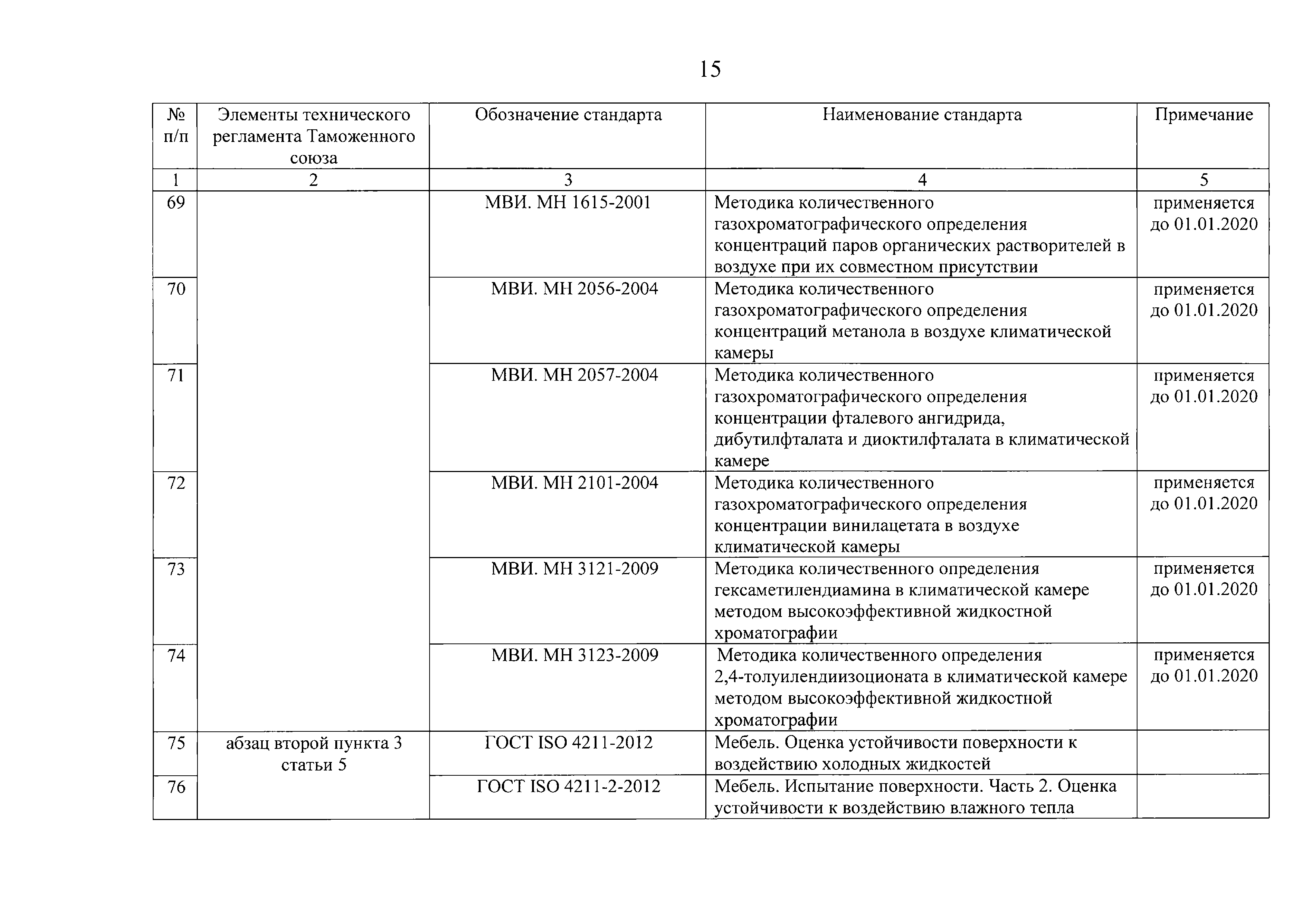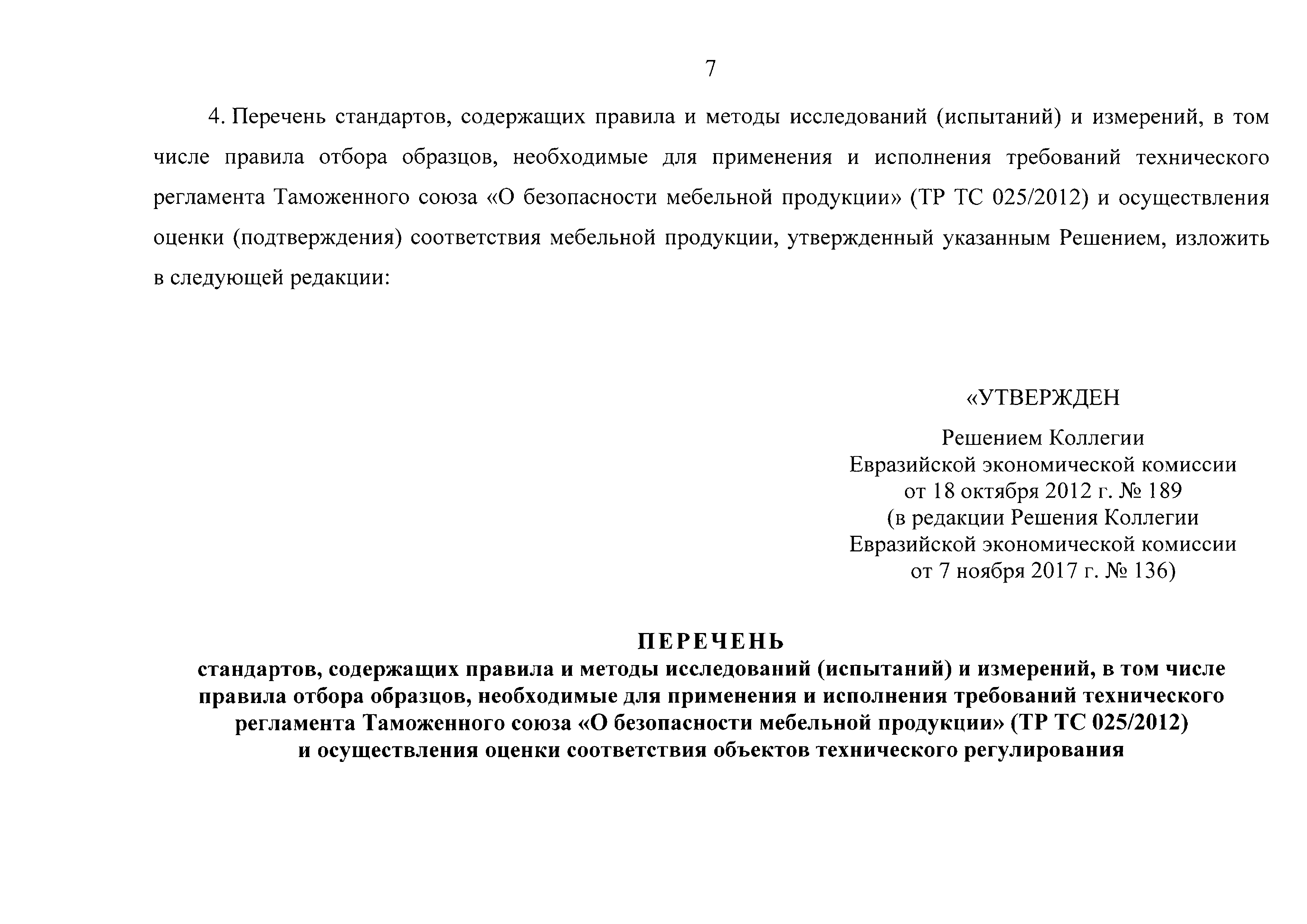Перечень стандартов, содержащих правила и методы исследований (испытаний) и измерений, в том числе правила отбора образцов, необходимые для применения и исполнения требований технического регламента Таможенного союза "О безопасности мебельной продукции" (ТР ТС 025/2012) и осуществления оценки соответствия объектов технического регулирования. Редакция 2| Статус: | действует | | Название рус.: | Перечень стандартов, содержащих правила и методы исследований (испытаний) и измерений, в том числе правила отбора образцов, необходимые для применения и исполнения требований технического регламента Таможенного союза "О безопасности мебельной продукции" (ТР ТС 025/2012) и осуществления оценки соответствия объектов технического регулирования. Редакция 2 | | Дата добавления в базу: | 01.01.2018 | | Дата актуализации: | 01.01.2021 | | Дата введения: | 10.12.2017 | | Утверждён: | 07.11.2017 Коллегия Евразийской экономической комиссии (136)