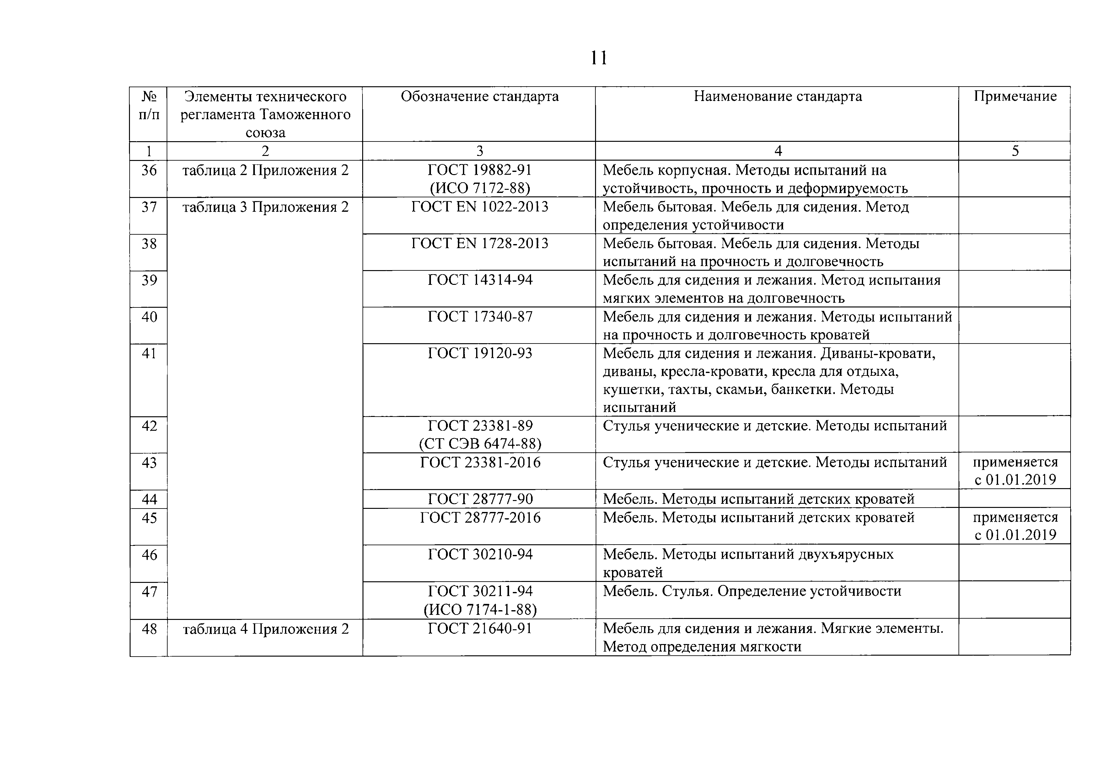 | | Заменяет собой: | | | Нормативные ссылки: |   ГОСТ 30108-94 «Материалы и изделия строительные. Определение удельной эффективной активности естественных радионуклидов»  ГОСТ 16143-81 «Детали и изделия из древесины и древесных материалов. Методы определения блеска прозрачных лаковых покрытий»  ГОСТ 12.1.044-89 «Система стандартов безопасности труда. Пожаровзрывоопасность веществ и материалов. Номенклатура показателей и методы их определения»  ГОСТ Р 50810-95 «Пожарная безопасность текстильных материалов. Ткани декоративные. Метод испытания на воспламеняемость и классификация»  ГОСТ 12029-93 «Мебель. Стулья и табуреты. Определение прочности и долговечности» ГОСТ 14314-94 «Мебель для сидения и лежания. Метод испытания мягких элементов на долговечность»  ГОСТ 16371-93 «Мебель. Общие технические условия» ГОСТ 16854-91 «Кресла для зрительных залов. Общие технические условия»  ГОСТ 17340-87 «Мебель для сидения и лежания. Методы испытаний на прочность и долговечность кроватей» ГОСТ 19120-93 «Мебель для сидения и лежания. Диваны-кровати, диваны, кресла-кровати, кресла для отдыха, кушетки, тахты, скамьи, банкетки. Методы испытаний» ГОСТ 19194-73 «Мебель. Метод определения прочности крепления подсадных ножек мебели» ГОСТ 19195-89 «Мебель. Методы испытаний крепления дверей с вертикальной и горизонтальной осью вращения»  ГОСТ 19882-91 «Мебель корпусная. Методы испытаний на устойчивость, прочность и деформируемость»  ГОСТ 19917-93 «Мебель для сидения и лежания. Общие технические условия» ГОСТ 19918.3-79 «Мебель для сидения и лежания. Метод определения остаточной деформации беспружинных мягких элементов» ГОСТ 21640-91 «Мебель для сидения и лежания. Мягкие элементы. Метод определения мягкости»  ГОСТ 23190-78 «Мебель книготорговая. Общие технические условия» ГОСТ 23380-83 «Столы ученические и для учителя. Методы испытаний» ГОСТ 23381-89 «Стулья ученические и детские. Методы испытаний» ГОСТ 23508-79 «Мебель книготорговая для складских помещений. Общие технические условия» ГОСТ 26003-83 «Кресла для зрительных залов. Методы испытаний на устойчивость и прочность» ГОСТ 26756-85 «Мебель для предприятий торговли. Общие технические условия»  ГОСТ 27627-88 «Детали и изделия из древесины и древесных материалов. Метод определения стойкости защитно-декоративных покрытий к пятнообразованию»  ГОСТ 28102-89 «Мебель корпусная. Методы испытаний штанг»  ГОСТ 28105-89 «Мебель корпусная и столы. Методы испытаний выдвижных ящиков и полуящиков»  ГОСТ 28136-89 «Мебель корпусная настенная. Методы испытания на прочность» ГОСТ 28777-90 «Мебель. Методы испытаний детских кроватей» ГОСТ 28793-90 «Мебель. Столы. Определение устойчивости»  ГОСТ 30099-93 «Столы. Методы испытаний»  ГОСТ 30209-94 «Мебель корпусная. Двери раздвижные. Методы испытаний»  ГОСТ 30210-94 «Мебель. Методы испытаний двухъярусных кроватей» ГОСТ 30211-94 «Мебель. Стулья. Определение устойчивости» ГОСТ 30212-94 «Столы журнальные и письменные. Методы испытаний»  ГОСТ 22046-2002 «Мебель для учебных заведений. Общие технические условия»  ГОСТ 6799-2005 «Стеклоизделия для мебели. Технические условия» ГОСТ 30877-2003 «Материалы текстильные. Покрытия и изделия ковровые машинного способа производства. Показатели безопасности и методы их определения»  ГОСТ Р ИСО 16017-1-2007 «Воздух атмосферный, рабочей зоны и замкнутых помещений. Отбор проб летучих органических соединений при помощи сорбционной трубки с последующей термодесо