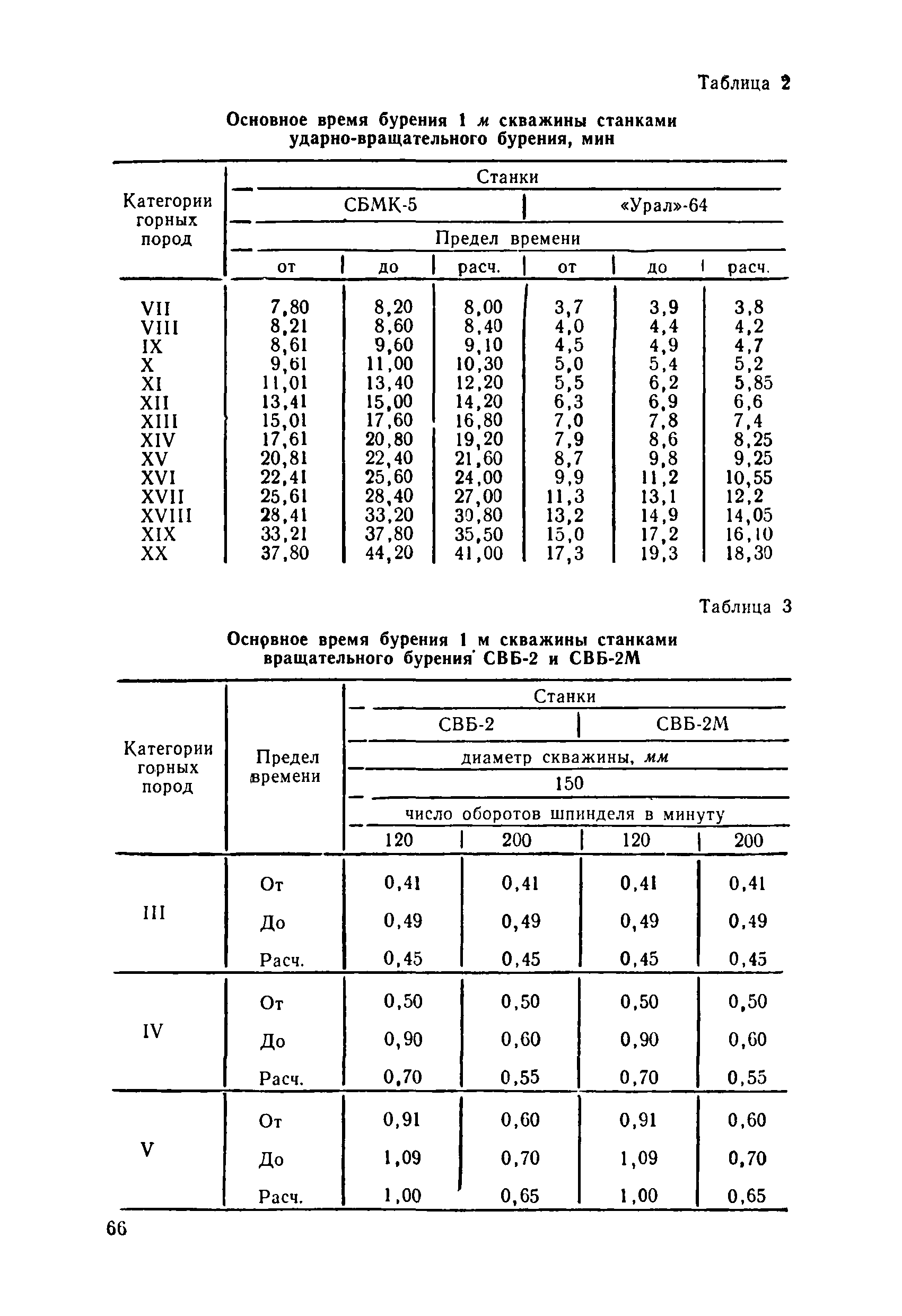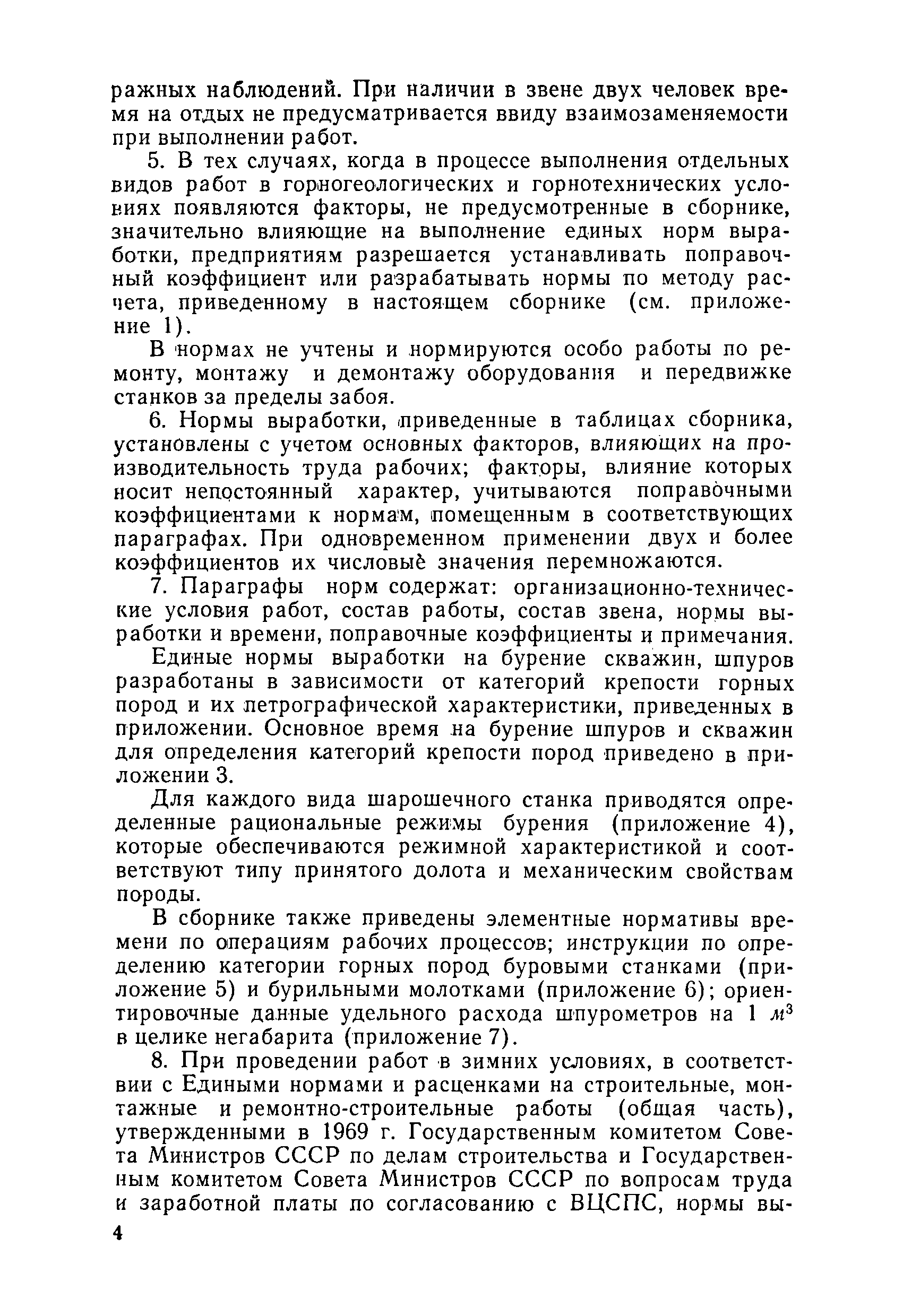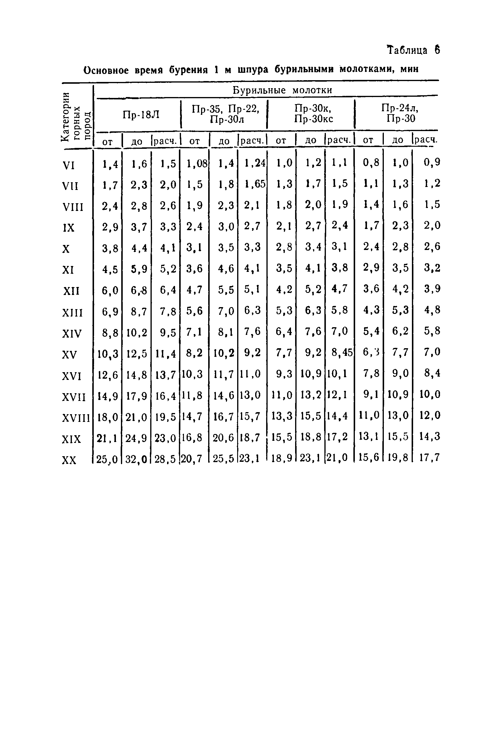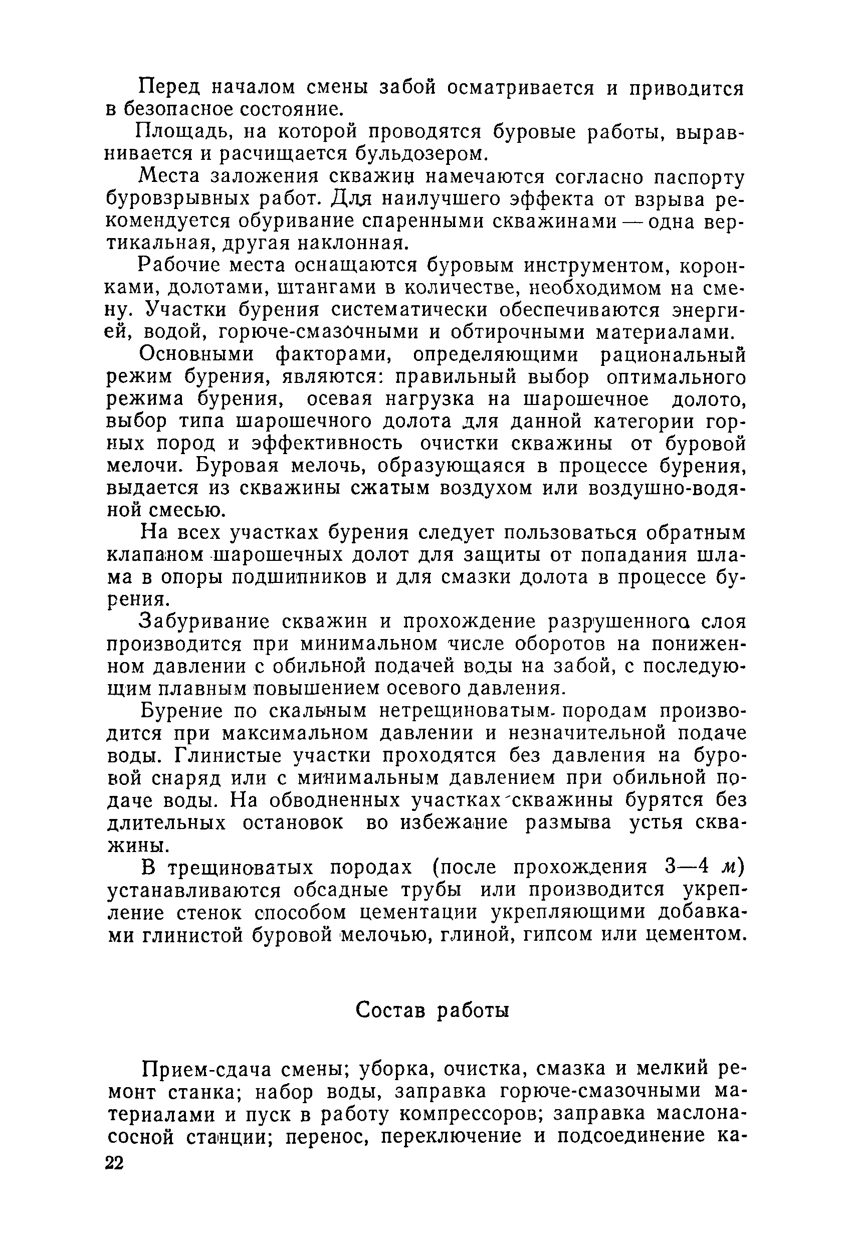 Единые нормы выработки (времени) на открытые горные работы для предприятий горнодобывающей промышленности. Бурение| Статус: | не действует | | Название рус.: | Единые нормы выработки (времени) на открытые горные работы для предприятий горнодобывающей промышленности. Бурение | | Дата добавления в базу: | 01.01.2019 | | Дата актуализации: | 01.01.2021 | | Область применения: | Документ содержит нормы выработки (времени) и нормативы на бурение скважин станками ударно-канатного, ударно-вращательного, вращательного, шарошечного и огневого бурения и на бурение шпуров бурильными молотками, и является обязательным для применения на всех предприятиях горнодобывающей промышленности. Нормы выработки рассчитаны на звено рабочих, за исключением норм на бурение шпуров бурильными молотками, которые даны на одного человека в смену | | Оглавление: | Общая часть Характеристики применяемого оборудование Организация труда Нормативная часть Раздел 1. Нормы выработки и времени Глава 1. Бурение скважин буровыми станками § 1. Бурение скважин станками ударно-канатного бурения БУ-20-2М и БС-1 § 2. Бурение скважин станками ударно-вращательного бурения СБМК-5, "Урал"-64 § 3. Бурение скважин станками вращательного бурения СВБ-2 и СВБ-2М § 4. Бурение скважин станками шарошечного бурения БСШ-1М, БСШ-2М, 2БСШ-200, СВБК-200, СБШ-250, СБШ-250МН, БАШ-250 и СБШ-320 § 5. Бурение скважин станками огневого бурения СБО-160/20 Глава 2. Бурение шпуров бурильными молотками § 6. Бурение шпуров бурильными молотками Раздел 2. Нормативы времени § 7. Бурение скважин станками ударно-канатного бурения § 8. Бурение скважин станками ударно-вращательного бурения § 9. Бурение скважин станками вращательного бурения § 10. Бурение скважин станками шарошечного бурения § 11. Бурение скважин станками огневого бурения § 12. Бурение шпуров бурильными молотками Приложение 1. Метод расчета норм выработки на бурение скважин и шпуров Приложение 2. Единая классификация горных пород Приложение 3. Основное время на бурение скважин и шпуров Приложение 4. Инструкция по определению категорий горных пород при бурении станками шарошечного бурения Приложение 5. Инструкция по определению категории горных пород при бурении станками ударно-канатного, ударно-вращательного и вращательного бурения Приложение 6. Инструкция по определению категорий горных пород по буримости ручными бурильными молотками Приложение 7. Ориентировочные данные удельного расхода шпурометров на 1 м3 в целике негабарита Приложение 8. Температурные зоны по союзным и автономным республикам, краям и областям СССР | | Разработан: | ЦБНТ