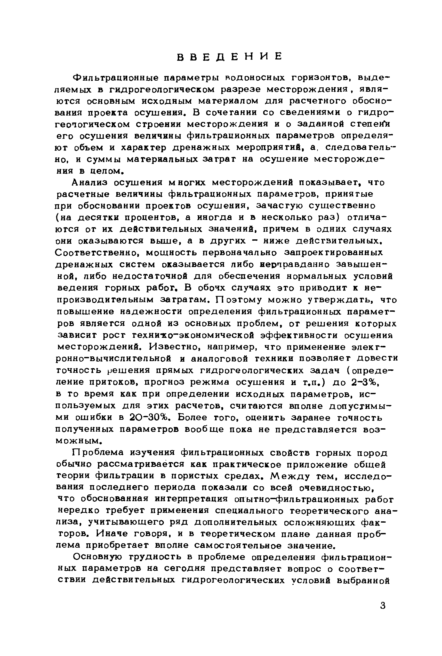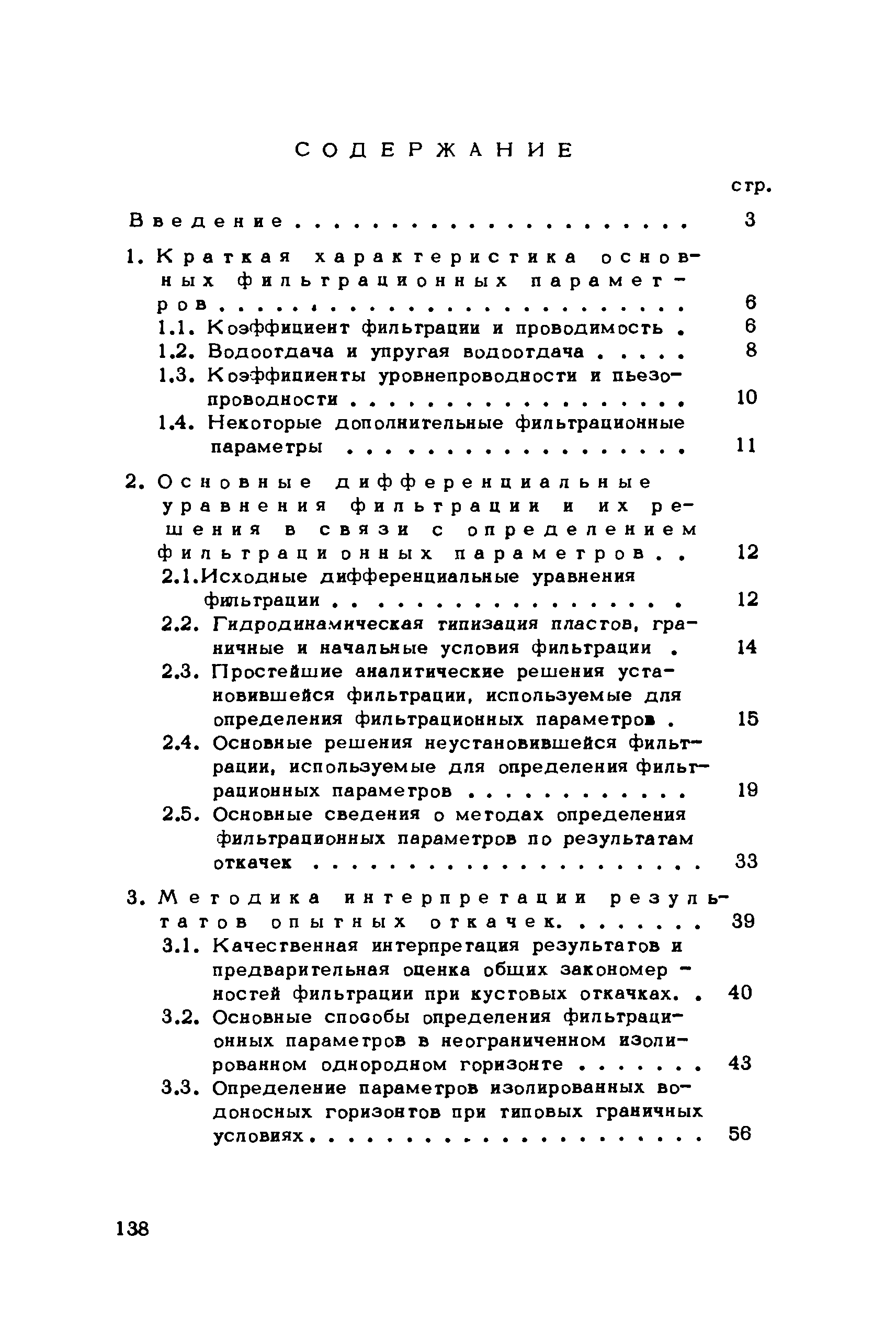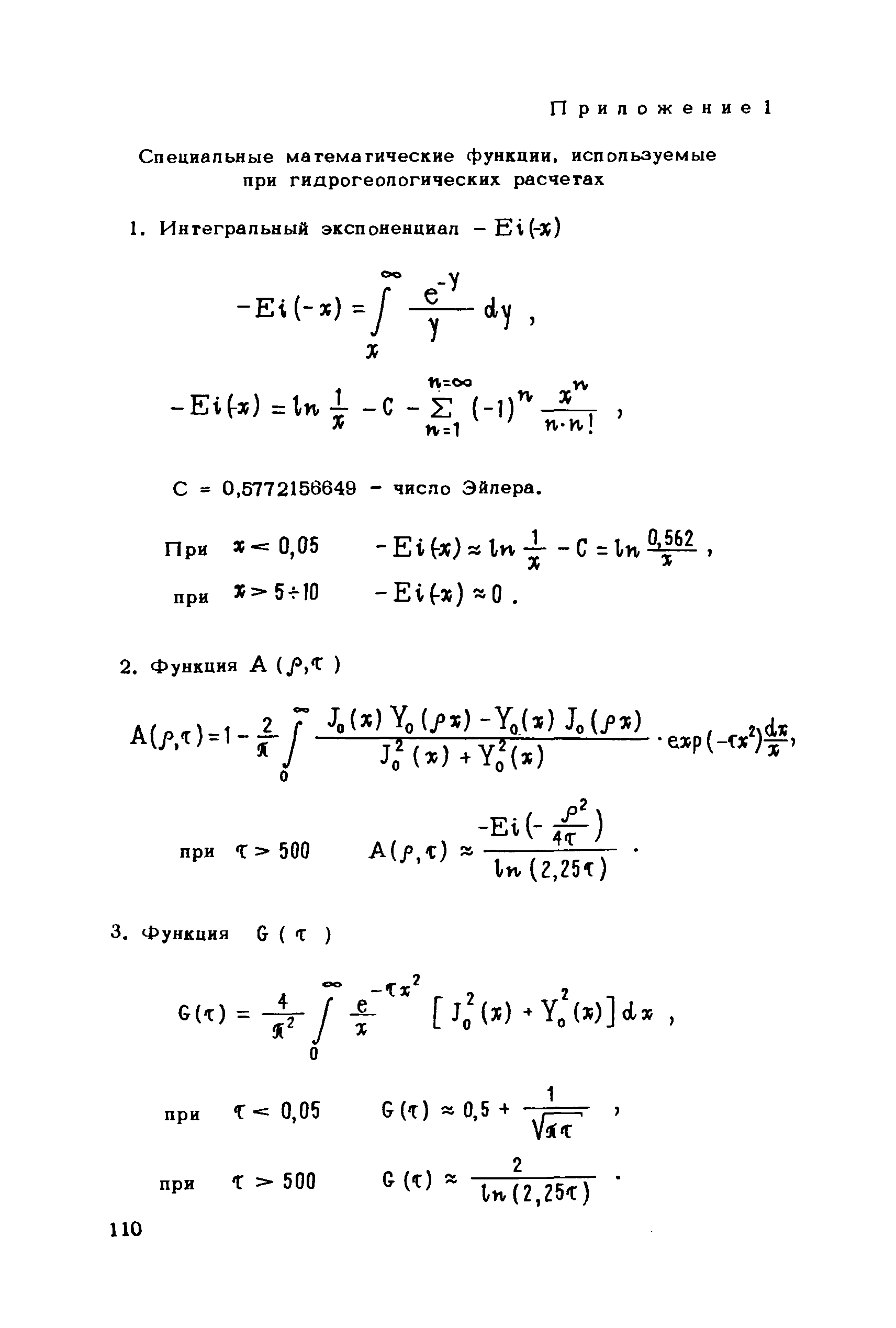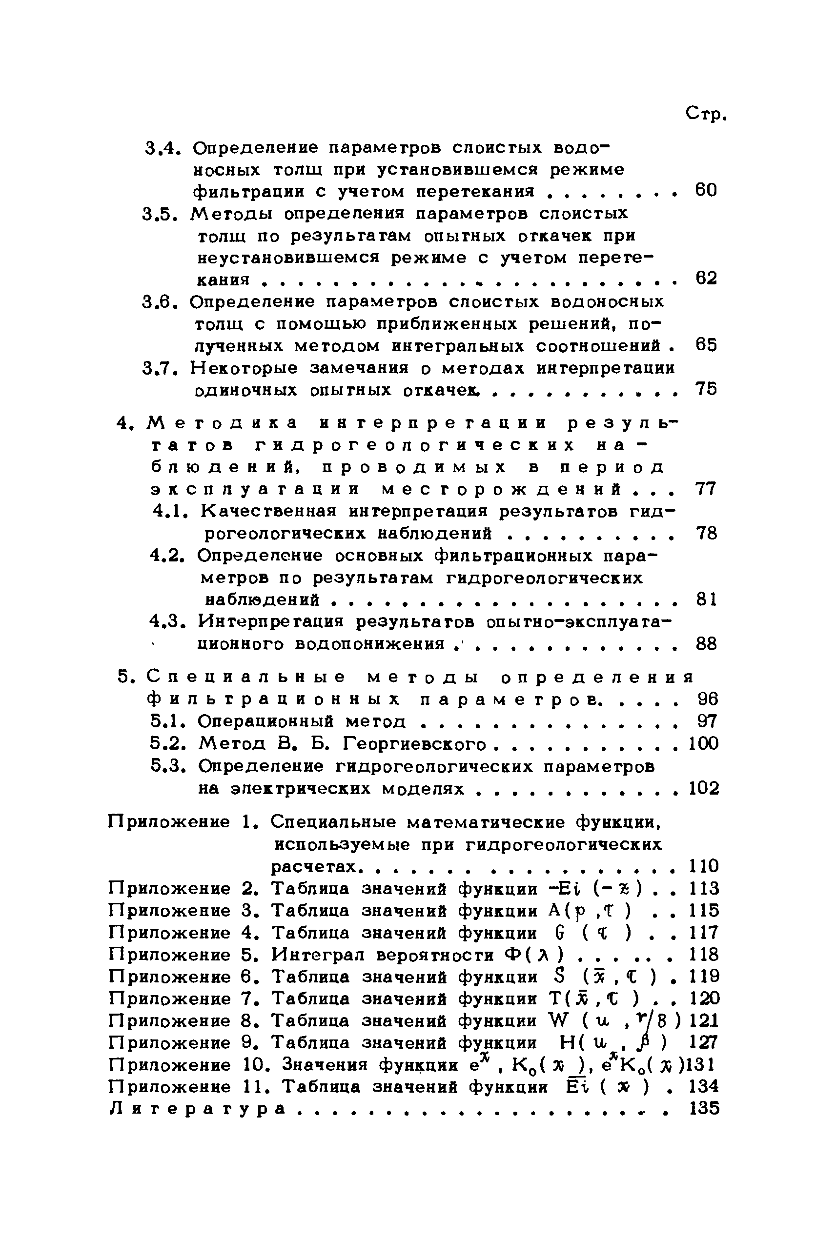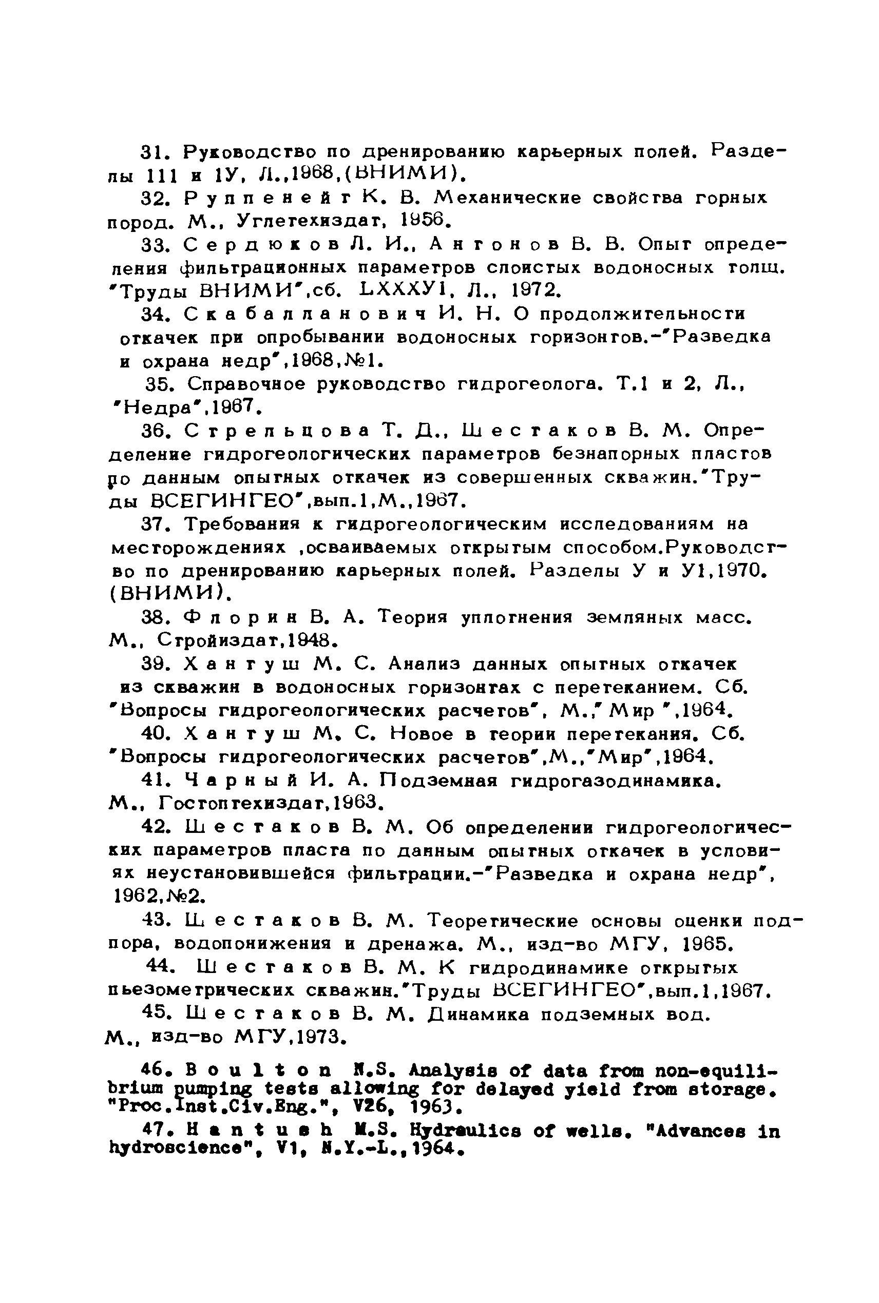Методические указания по определению гидрогеологических параметров при разведке и освоении угольных месторождений| Статус: | справочные материалы, мп, тпр | | Название рус.: | Методические указания по определению гидрогеологических параметров при разведке и освоении угольных месторождений | | Дата добавления в базу: | 01.01.2019 | | Дата актуализации: | 01.01.2021 | | Область применения: | В документе изложена методика определения основных фильтрационных параметров водоносных горизонтов по результатам опытных откачек и гидрогеологических наблюдений за режимом подземных вод | | Оглавление: | Введение 1. Краткая характеристика основных фильтрационных параметров 1.1. Коэффициент фильтрации и проводимость 1.2. Водоотдача и упругая водоотдача 1.3. Коэффициенты уровнепроводности и пьезопроводности 1.4. Некоторые дополнительные фильтрационные параметры 2. Основные дифференциальные уравнения фильтрации и их решения в связи с определением фильтрационных параметров 2.1. Исходные дифференциальные уравнения фильтрации 2.2. Гидродинамическая типизация пластов, граничные и начальные условия фильтрации 2.3. Простейшие аналитические решения установившейся фильтрации, используемые для определения фильтрационных параметров 2.4. Основные решения неустановившейся фильтрации, используемые для определения фильтрационных параметров 2.5. Основные сведения о методах определения фильтрационных параметров по результатам откачек 3. Методика интерпретации результатов опытных откачек 3.1. Качественная интерпретация результатов и предварительная опенка общих закономерностей фильтрации при кустовых откачках 3.2. Основные способы определения фильтрационных параметров в неограниченном изолированном однородном горизонте 3.3. Определение параметров изолированных водоносных горизонтов при типовых граничных условиях 3.4. Определение параметров слоистых водоносных толщ при установившемся режиме фильтрации с учетом перетекания 3.5. Методы определения параметров слоистых толщ по результатам опытных откачек при неустановившемся режиме с учетом перетекания 3.6. Определение параметров слоистых водоносных толщ с помощью приближенных решений, полученных методом интегральных соотношений 3.7. Некоторые замечания о методах интерпретации одиночных опытных откачек 4. Методика интерпретации результатов гидрогеологических наблюдений, проводимых в период эксплуатации месторождений 4.1. Качественная интерпретация результатов гидрогеологических наблюдений 4.2. Определение основных фильтрационных параметров по результатам гидрогеологических наблюдений 4.3. Интерпретация результатов опытно-эксплуатационного водопонижения 5. Специальные методы определения фильтрационных параметров 5.1. Операционный метод 5.2. Метод В.Б. Георгиевского 5.3. Определение гидрогеологических параметров на электрических моделях Приложение 1. Специальные математические функции, используемые при гидрогеологических расчетах Приложение 2. Таблица значения функции -Ei Приложение 3. Таблица значения функции A Приложение 4. Таблица значения функции G Приложение 5. Интеграл вероятности Ф Приложение 6. Таблица значения функции S Приложение 7. Таблица значения функции T Приложение 8. Таблица значения функции W Приложение 9. Таблица значения функции H Приложение 10. Значения функции e в степени x Приложение 11. Та