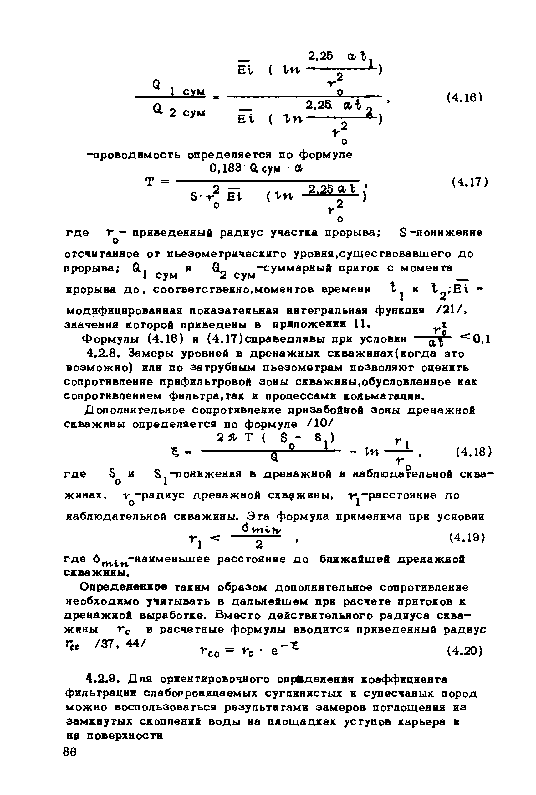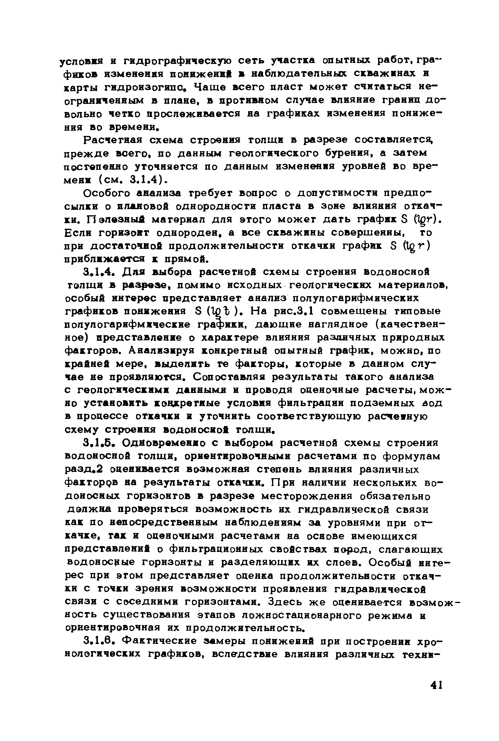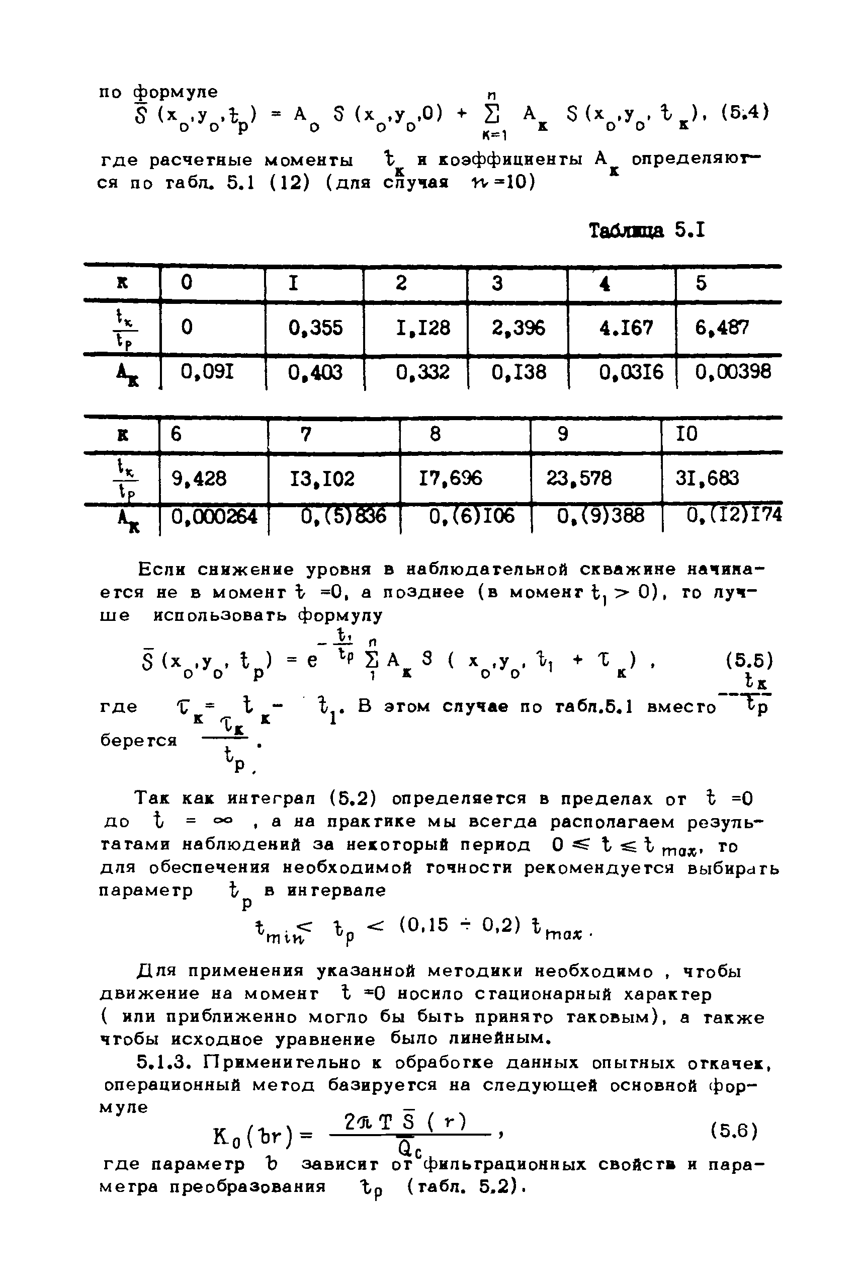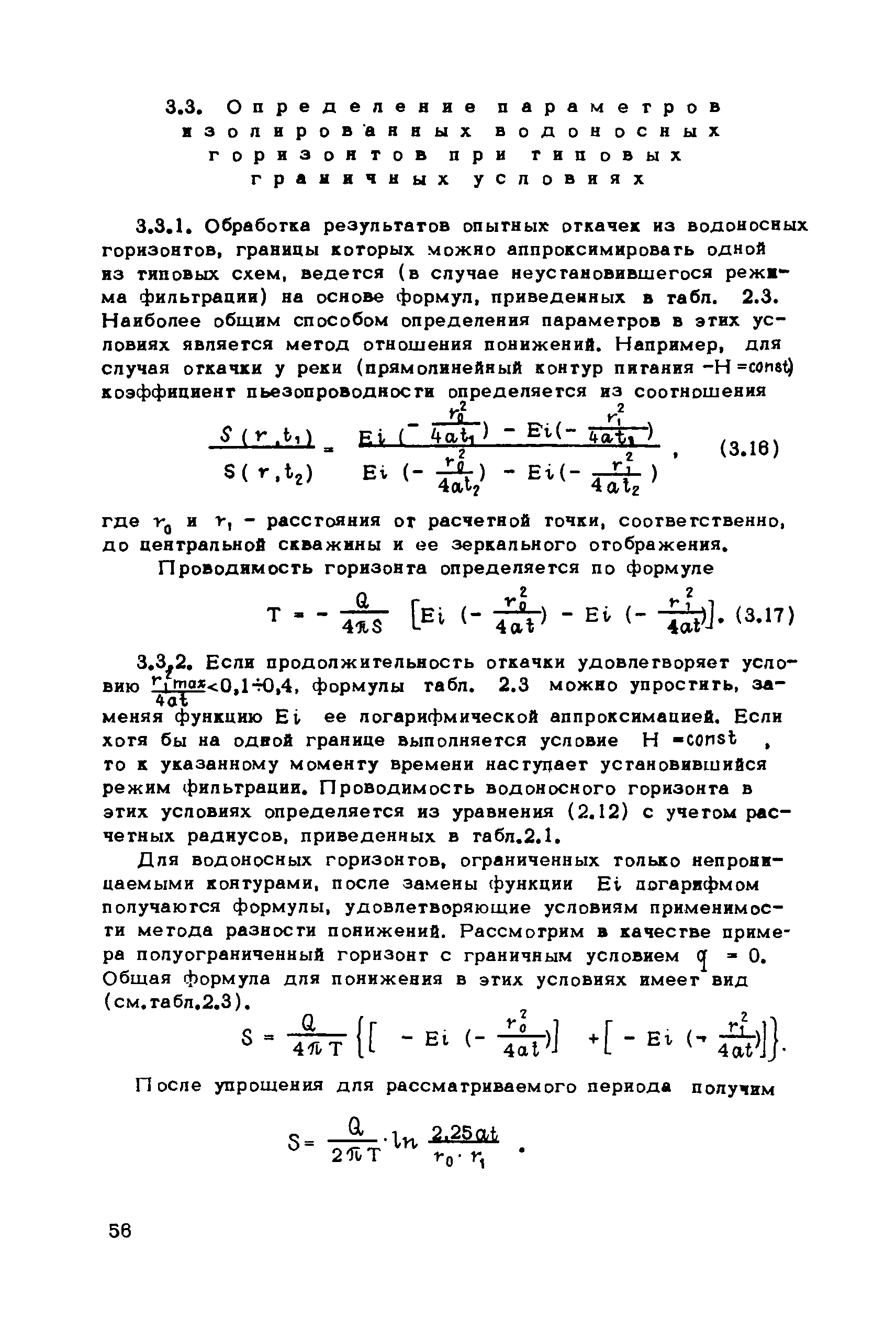 Методические указания по определению гидрогеологических параметров при разведке и освоении угольных месторождений| Статус: | справочные материалы, мп, тпр | | Название рус.: | Методические указания по определению гидрогеологических параметров при разведке и освоении угольных месторождений | | Дата добавления в базу: | 01.01.2019 | | Дата актуализации: | 01.01.2021 | | Область применения: | В документе изложена методика определения основных фильтрационных параметров водоносных горизонтов по результатам опытных откачек и гидрогеологических наблюдений за режимом подземных вод | | Оглавление: | Введение 1. Краткая характеристика основных фильтрационных параметров 1.1. Коэффициент фильтрации и проводимость 1.2. Водоотдача и упругая водоотдача 1.3. Коэффициенты уровнепроводности и пьезопроводности 1.4. Некоторые дополнительные фильтрационные параметры 2. Основные дифференциальные уравнения фильтрации и их решения в связи с определением фильтрационных параметров 2.1. Исходные дифференциальные уравнения фильтрации 2.2. Гидродинамическая типизация пластов, граничные и начальные условия фильтрации 2.3. Простейшие аналитические решения установившейся фильтрации, используемые для определения фильтрационных параметров 2.4. Основные решения неустановившейся фильтрации, используемые для определения фильтрационных параметров 2.5. Основные сведения о методах определения фильтрационных параметров по результатам откачек 3. Методика интерпретации результатов опытных откачек 3.1. Качественная интерпретация результатов и предварительная опенка общих закономерностей фильтрации при кустовых откачках 3.2. Основные способы определения фильтрационных параметров в неограниченном изолированном однородном горизонте 3.3. Определение параметров изолированных водоносных горизонтов при типовых граничных условиях 3.4. Определение параметров слоистых водоносных толщ при установившемся режиме фильтрации с учетом перетекания 3.5. Методы определения параметров слоистых толщ по результатам опытных откачек при неустановившемся режиме с учетом перетекания 3.6. Определение параметров слоистых водоносных толщ с помощью приближенных решений, полученных методом интегральных соотношений 3.7. Некоторые замечания о методах интерпретации одиночных опытных откачек 4. Методика интерпретации результатов гидрогеологических наблюдений, проводимых в период эксплуатации месторождений 4.1. Качественная интерпретация результатов гидрогеологических наблюдений 4.2. Определение основных фильтрационных параметров по результатам гидрогеологических наблюдений 4.3. Интерпретация результатов опытно-эксплуатационного водопонижения 5. Специальные методы определения фильтрационных параметров 5.1. Операционный метод 5.2. Метод В.Б. Георгиевского 5.3. Определение гидрогеологических параметров на электрических моделях Приложение 1. Специальные математические функции, используемые при гидрогеологических расчетах Приложение 2. Таблица значения функции -Ei Приложение 3. Таблица значения функции A Приложение 4. Таблица значения функции G Приложение 5. Интеграл вероятности Ф Приложение 6. Таблица значения функции S Приложение 7. Таблица значения функции T Приложение 8. Таблица значения функции W Приложение 9. Таблица значения функции H Приложение 10. Значения функции e в степени x Приложение 11. Та