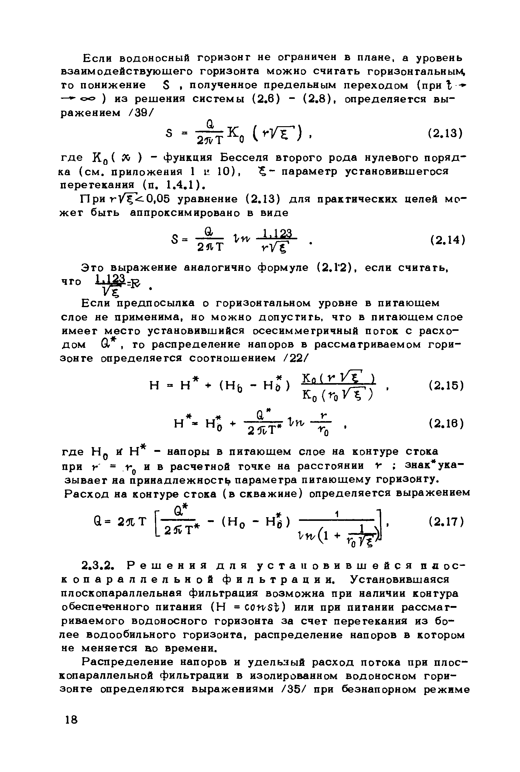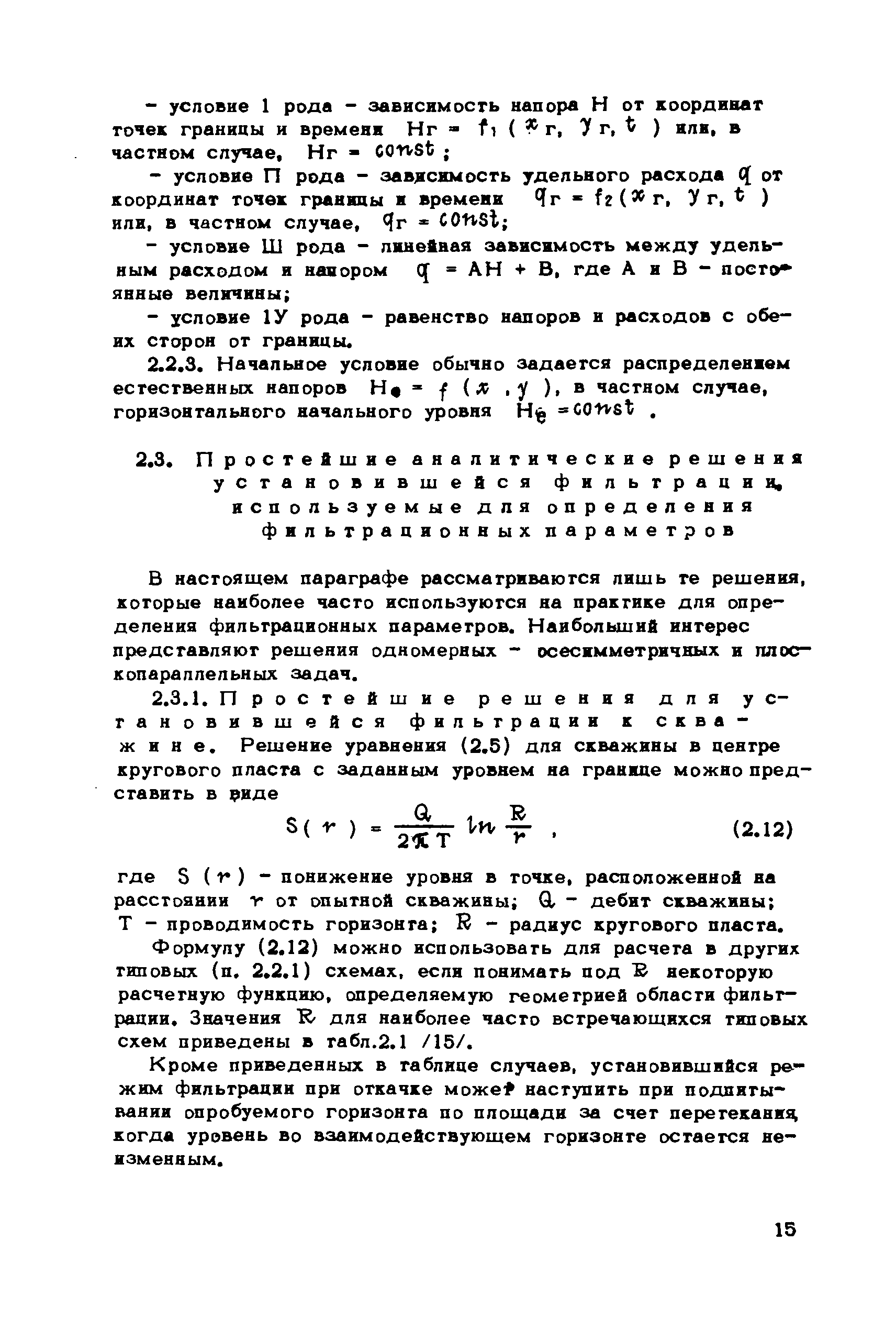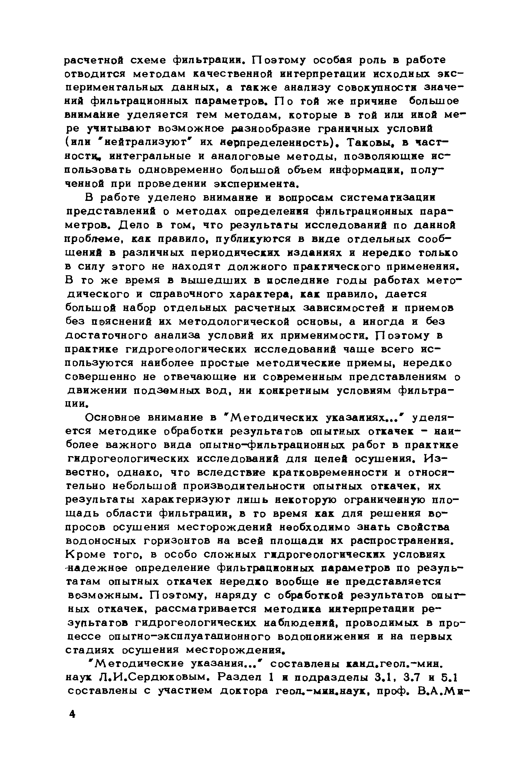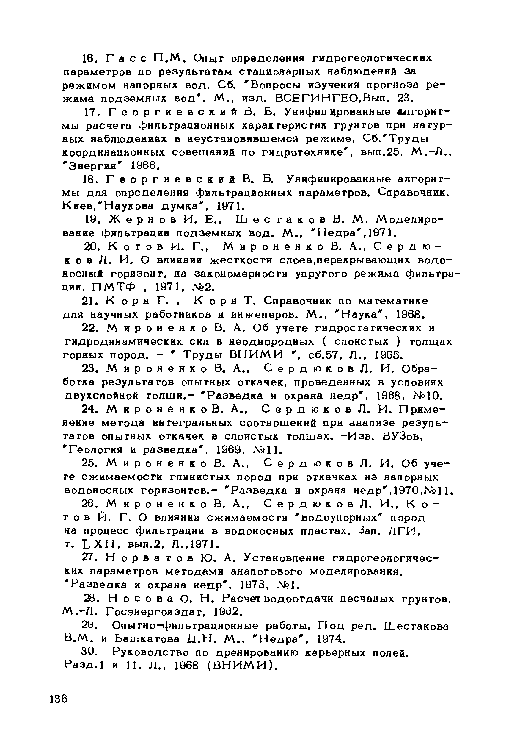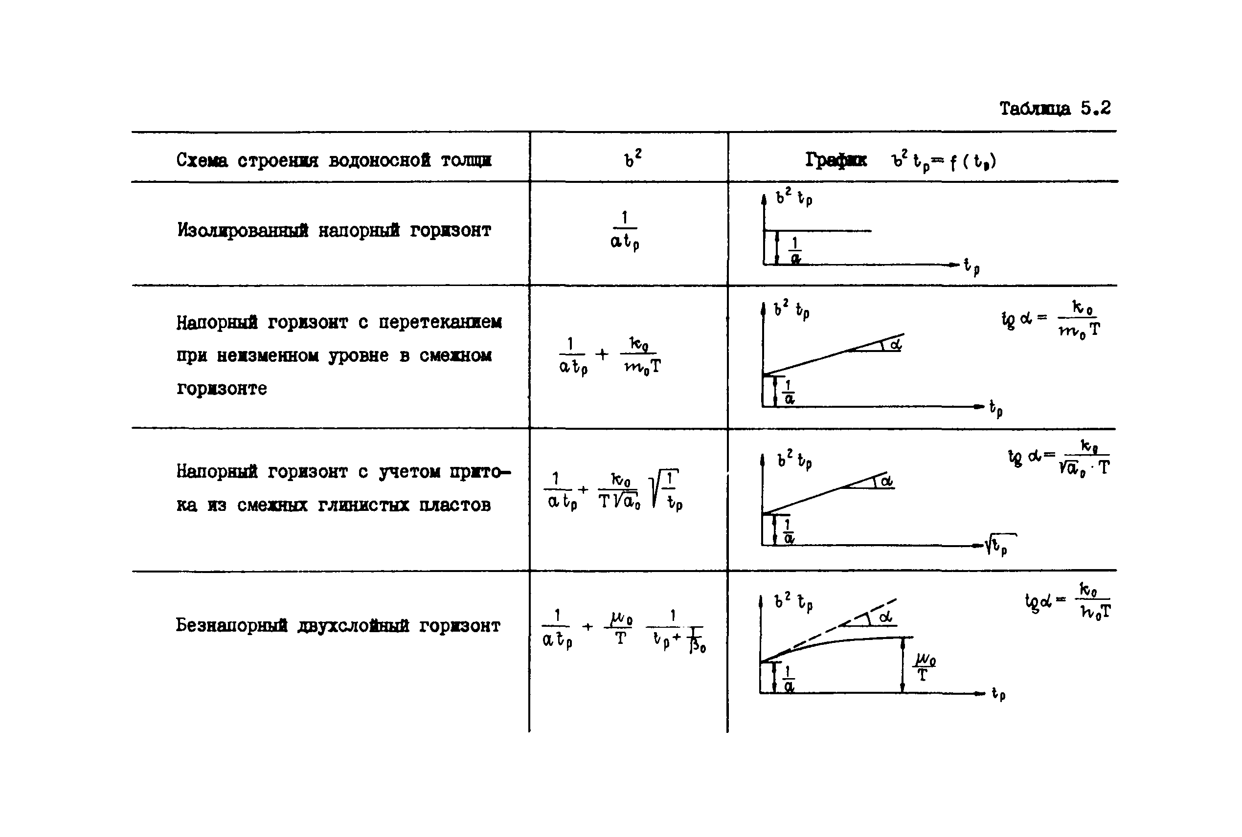 Методические указания по определению гидрогеологических параметров при разведке и освоении угольных месторождений| Статус: | справочные материалы, мп, тпр | | Название рус.: | Методические указания по определению гидрогеологических параметров при разведке и освоении угольных месторождений | | Дата добавления в базу: | 01.01.2019 | | Дата актуализации: | 01.01.2021 | | Область применения: | В документе изложена методика определения основных фильтрационных параметров водоносных горизонтов по результатам опытных откачек и гидрогеологических наблюдений за режимом подземных вод | | Оглавление: | Введение 1. Краткая характеристика основных фильтрационных параметров 1.1. Коэффициент фильтрации и проводимость 1.2. Водоотдача и упругая водоотдача 1.3. Коэффициенты уровнепроводности и пьезопроводности 1.4. Некоторые дополнительные фильтрационные параметры 2. Основные дифференциальные уравнения фильтрации и их решения в связи с определением фильтрационных параметров 2.1. Исходные дифференциальные уравнения фильтрации 2.2. Гидродинамическая типизация пластов, граничные и начальные условия фильтрации 2.3. Простейшие аналитические решения установившейся фильтрации, используемые для определения фильтрационных параметров 2.4. Основные решения неустановившейся фильтрации, используемые для определения фильтрационных параметров 2.5. Основные сведения о методах определения фильтрационных параметров по результатам откачек 3. Методика интерпретации результатов опытных откачек 3.1. Качественная интерпретация результатов и предварительная опенка общих закономерностей фильтрации при кустовых откачках 3.2. Основные способы определения фильтрационных параметров в неограниченном изолированном однородном горизонте 3.3. Определение параметров изолированных водоносных горизонтов при типовых граничных условиях 3.4. Определение параметров слоистых водоносных толщ при установившемся режиме фильтрации с учетом перетекания 3.5. Методы определения параметров слоистых толщ по результатам опытных откачек при неустановившемся режиме с учетом перетекания 3.6. Определение параметров слоистых водоносных толщ с помощью приближенных решений, полученных методом интегральных соотношений 3.7. Некоторые замечания о методах интерпретации одиночных опытных откачек 4. Методика интерпретации результатов гидрогеологических наблюдений, проводимых в период эксплуатации месторождений 4.1. Качественная интерпретация результатов гидрогеологических наблюдений 4.2. Определение основных фильтрационных параметров по результатам гидрогеологических наблюдений 4.3. Интерпретация результатов опытно-эксплуатационного водопонижения 5. Специальные методы определения фильтрационных параметров 5.1. Операционный метод 5.2. Метод В.Б. Георгиевского 5.3. Определение гидрогеологических параметров на электрических моделях Приложение 1. Специальные математические функции, используемые при гидрогеологических расчетах Приложение 2. Таблица значения функции -Ei Приложение 3. Таблица значения функции A Приложение 4. Таблица значения функции G Приложение 5. Интеграл вероятности Ф Приложение 6. Таблица значения функции S Приложение 7. Таблица значения функции T Приложение 8. Таблица значения функции W Приложение 9. Таблица значения функции H Приложение 10. Значения функции e в степени x Приложение 11. Та