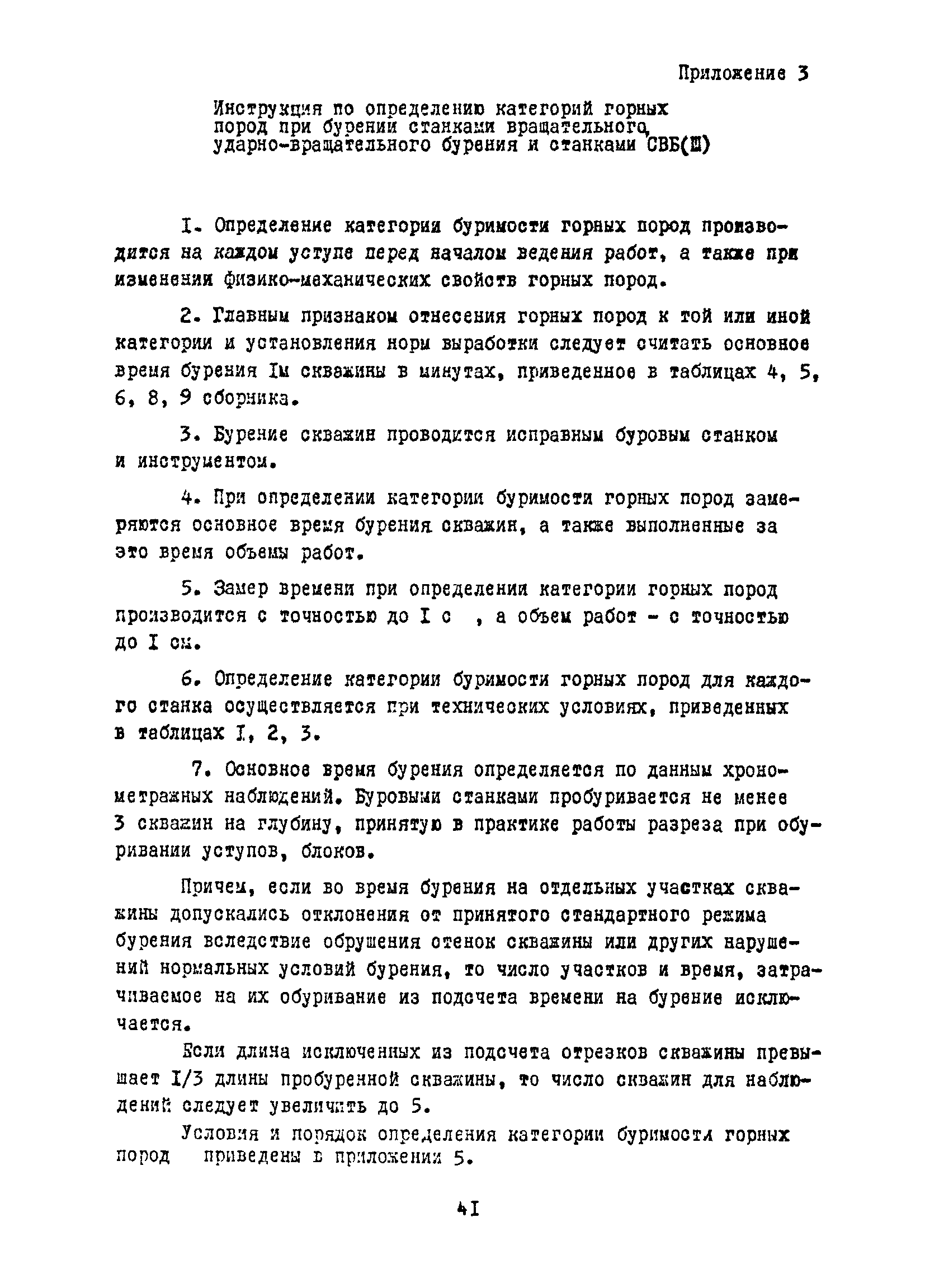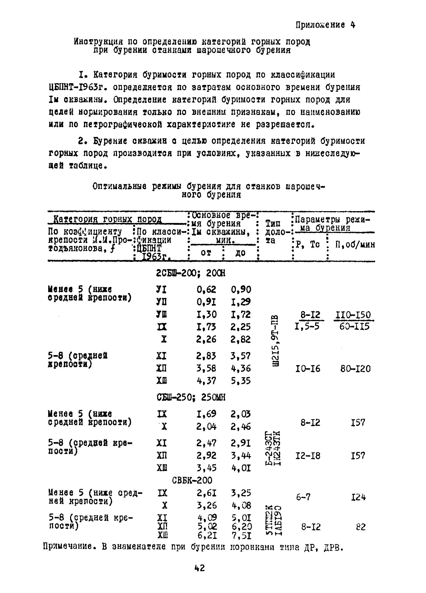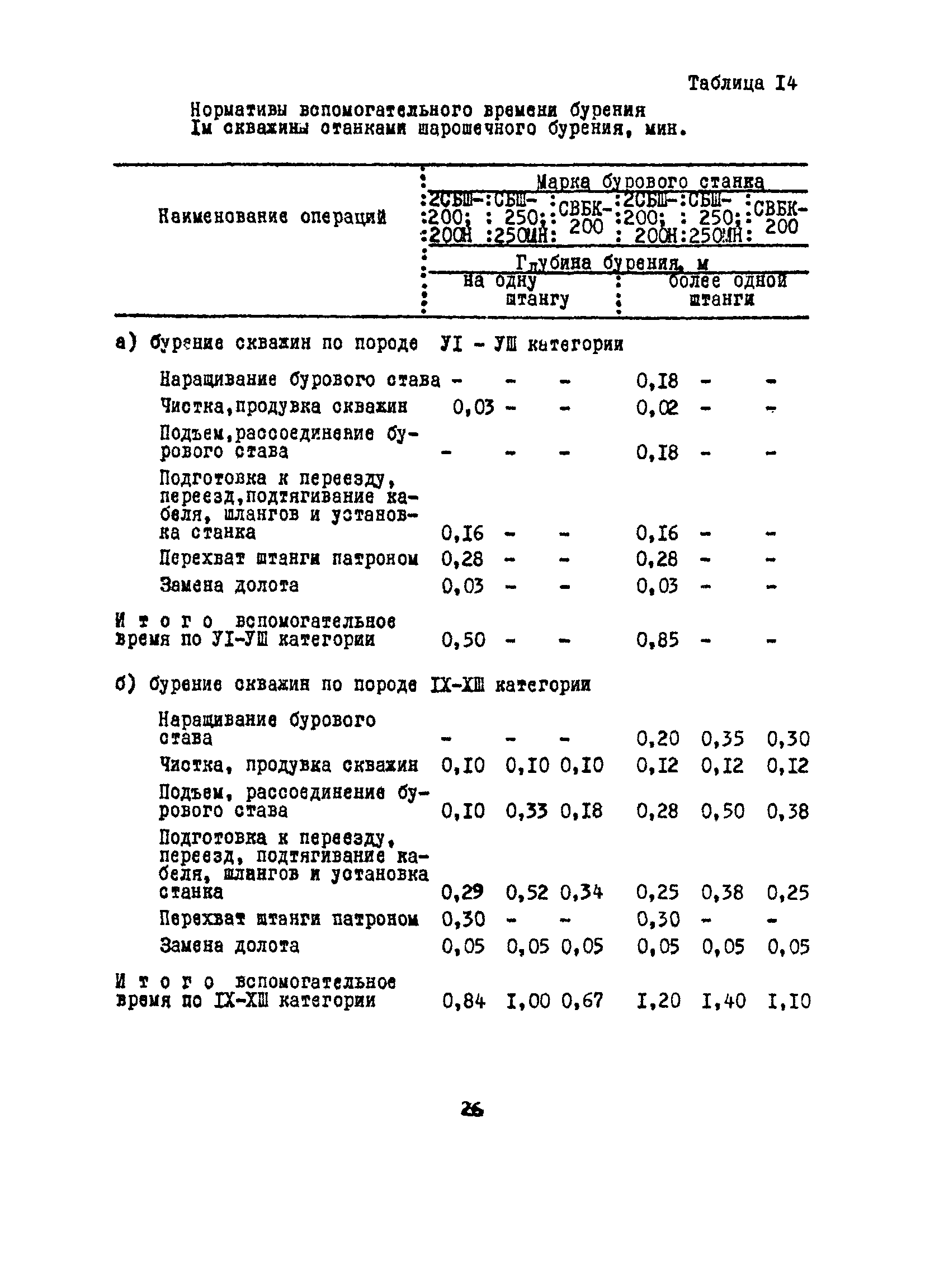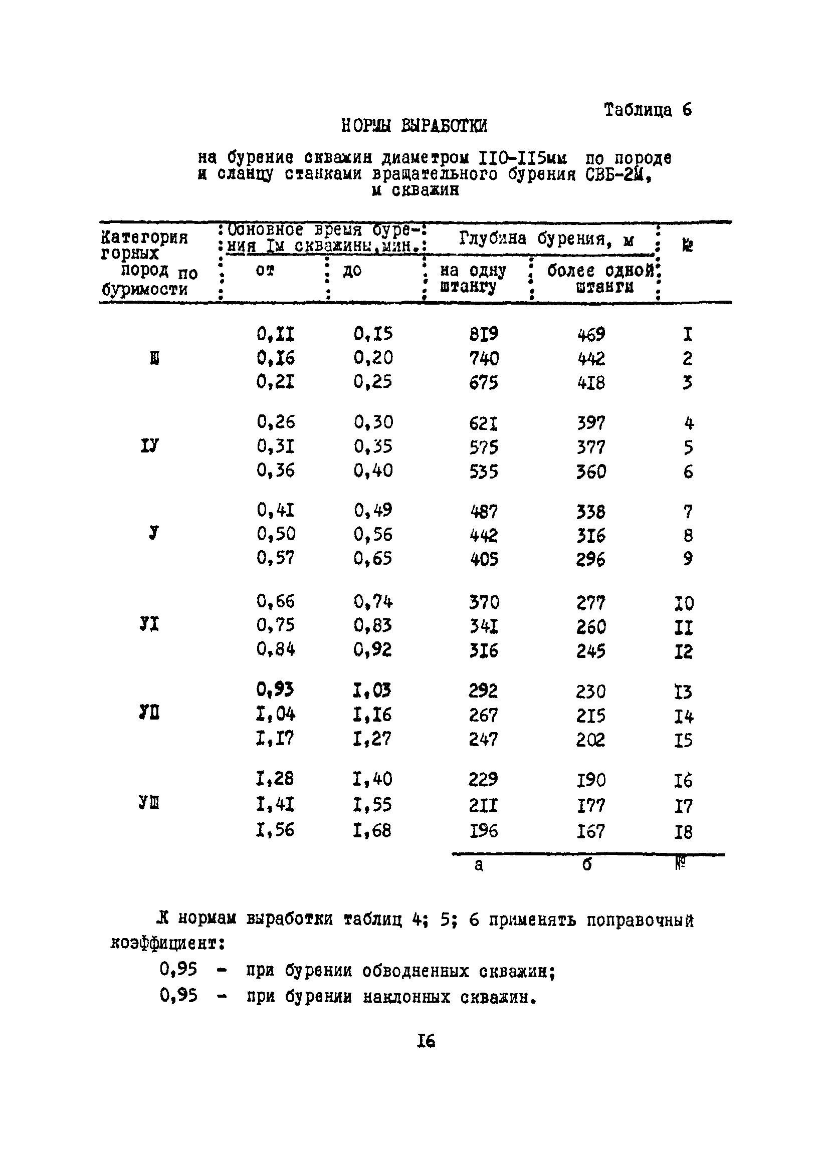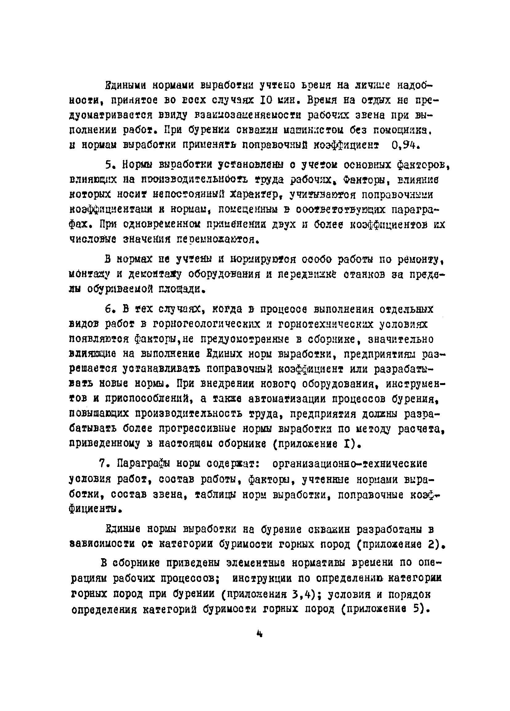 Единые нормы выработки (времени) на бурение скважин на открытых горных работах предприятий угольной и сланцевой промышленности| Статус: | справочные материалы, мп, тпр | | Название рус.: | Единые нормы выработки (времени) на бурение скважин на открытых горных работах предприятий угольной и сланцевой промышленности | | Дата добавления в базу: | 01.01.2019 | | Дата актуализации: | 01.01.2021 | | Область применения: | Документ содержит нормы выработки и нормативы времени на бурение скважин станками ударно-вращательного, вращательного и шарошечного бурения. Является обязательным для применения на предприятиях на предприятиях угольной и сланцевой промышленности Минуглепрома СССР | | Оглавление: | 1. Общая часть 2. Техническая часть 3. Организация работ 4. Нормативная часть Глава 1. Нормы выработки 1. Бурение скважин станками вращательного бурения СВБ-2М, СВР-160, БТС-2, БТС-150 2. Бурение скважин станками шарошечного бурения 2СБШ-200; 200Н, СБШ-250; 250МН, СВБК-200, СВБ(Ш) 3. Бурение скважин станками ударно-вращательного бурения Урал-64 Глава 2. Нормативы времени Нормативы времени на подготовительно-заключительные операции для станков вращательного, шарошечного и ударно-вращательного бурения Нормативы основного времени бурения 1м скважины станками вращательного, шарошечного и ударно-вращательного бурения Нормативы вспомогательного времени бурения 1м скважины станками вращательного бурения Нормативы вспомогательного времени бурения 1м скважины диаметром 110 - 115 мм станками вращательного бурения СВБ-2М Нормативы вспомогательного времени бурения 1м скважины станками шарошечного бурения Нормативы вспомогательного времени бурения 1м скважины станками шарошечного бурения СВБ(Ш) Нормативы вспомогательного времени бурения 1м скважины станками вращательного бурения Урал-64 Нормативы оперативного времени бурения 1м скважины станками вращательного бурения Нормативы оперативного времени бурения 1м скважины диаметром 110 - 115 мм станками вращательного бурения СВБ-2м Нормативы оперативного времени бурения 1м скважины станками шарошечного и ударно-вращательного бурения Приложение 1. Методика расчета норм выработки Приложение 2. Единая классификация горных пород Приложение 3. Инструкция по определению категорий горных пород при бурении станками вращательного, ударно-вращательного бурения станками СВБ(Ш) Приложение 4. Инструкция по определению категорий горных пород при бурении станками шарошечного бурения Приложение 5. Условия и порядок определения категорий буримости горных пород Приложение 6. Температурные зоны по союзным республикам, АССР, краям и областям СССР Список литературы | | Разработан: | НИС производственного объединения Кемеровоуголь