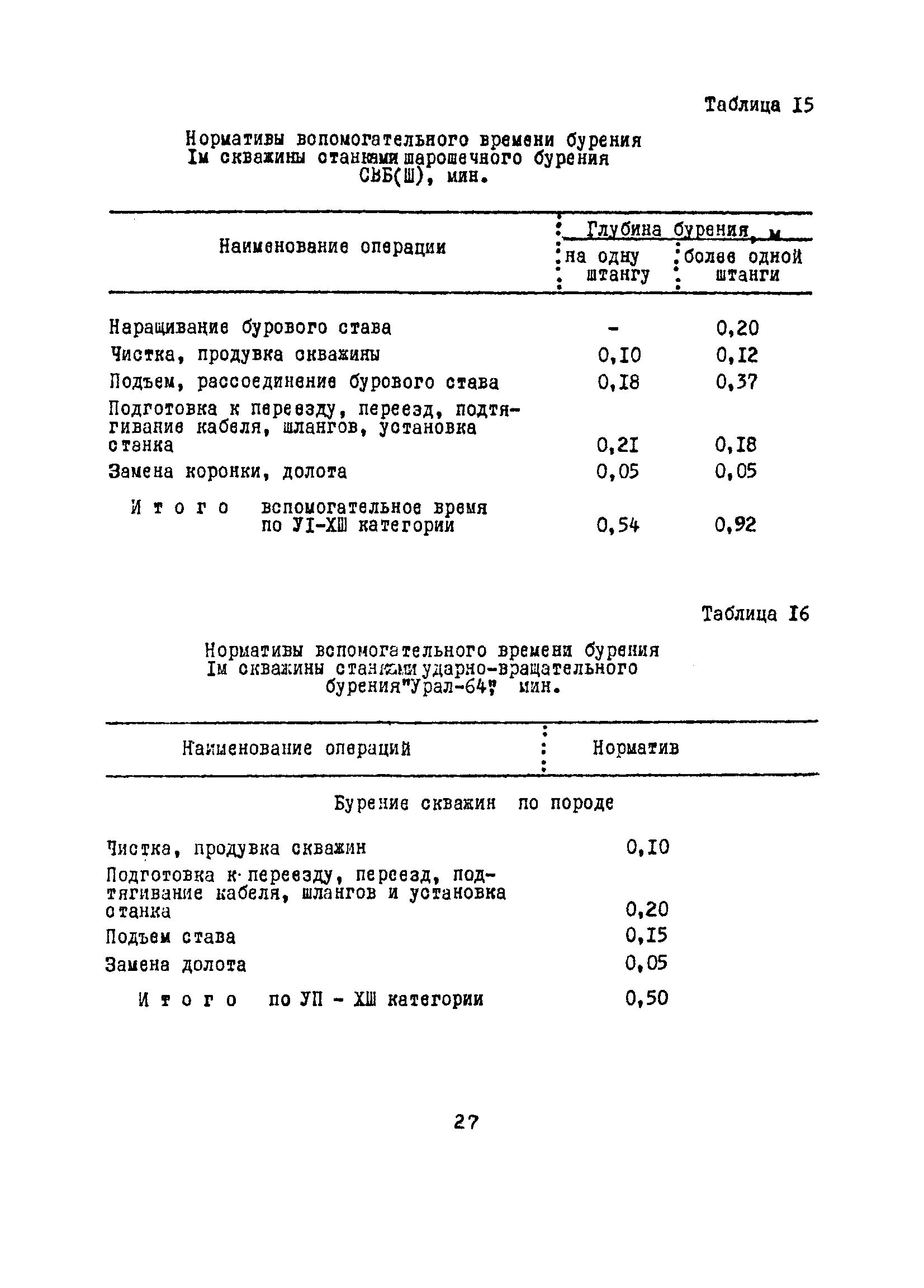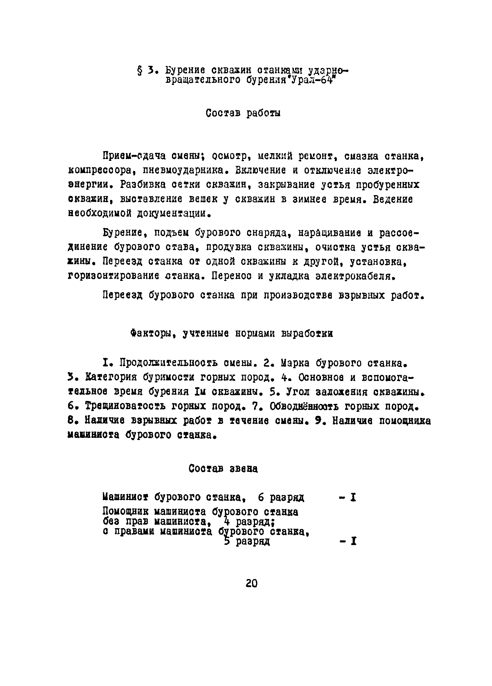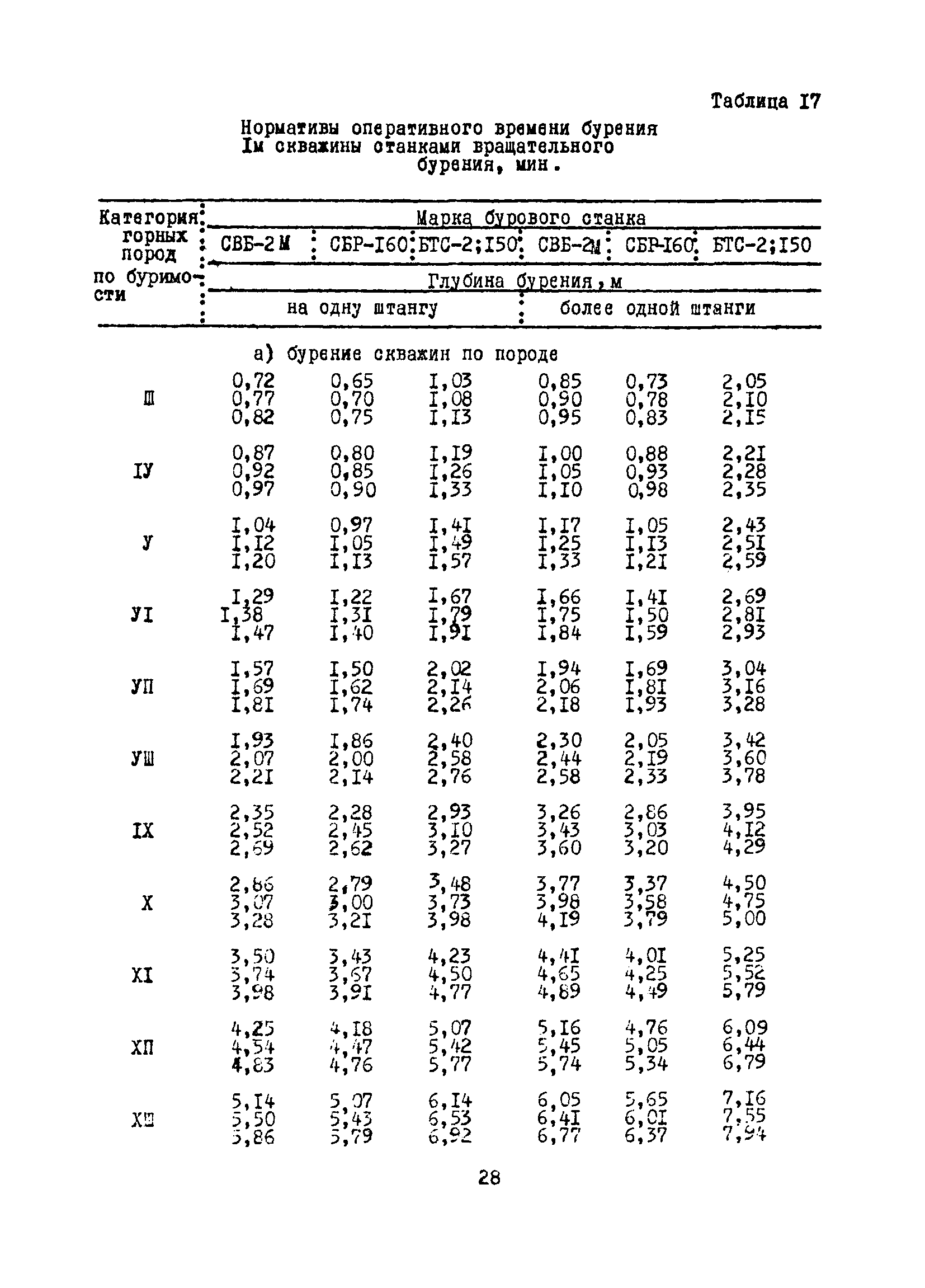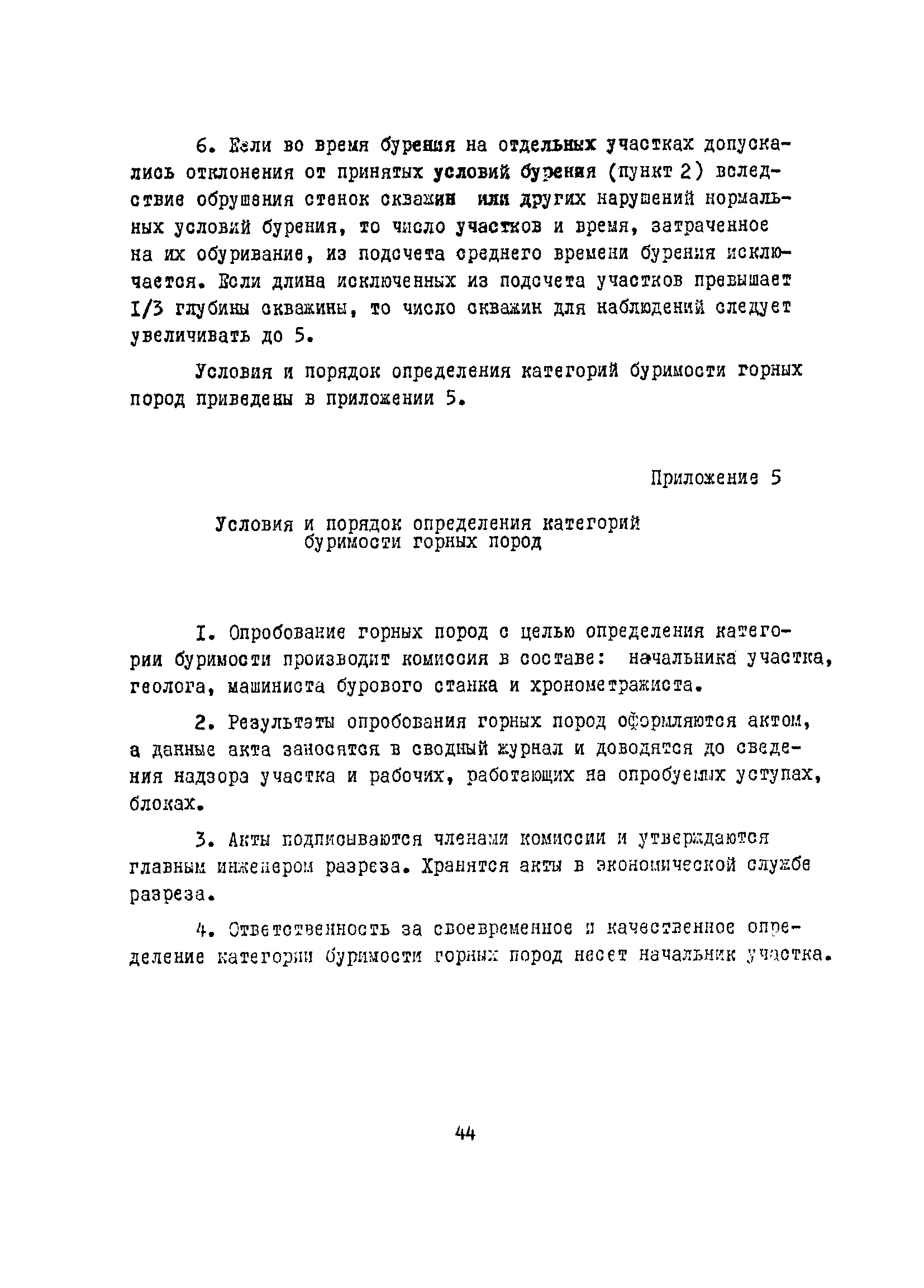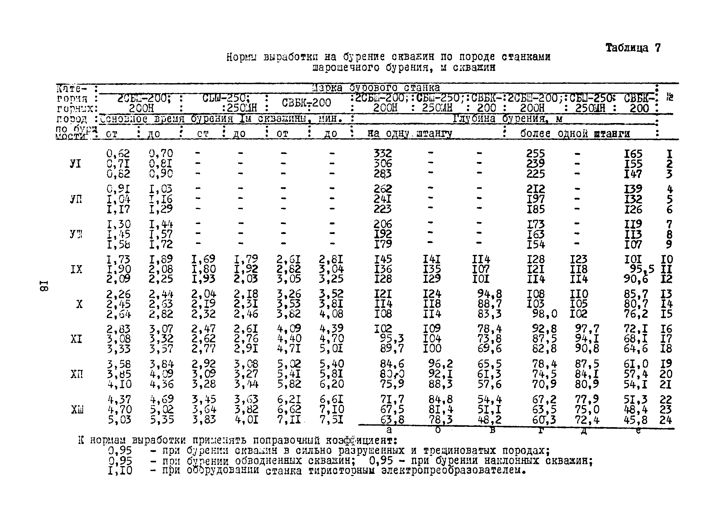 Единые нормы выработки (времени) на бурение скважин на открытых горных работах предприятий угольной и сланцевой промышленности| Статус: | справочные материалы, мп, тпр | | Название рус.: | Единые нормы выработки (времени) на бурение скважин на открытых горных работах предприятий угольной и сланцевой промышленности | | Дата добавления в базу: | 01.01.2019 | | Дата актуализации: | 01.01.2021 | | Область применения: | Документ содержит нормы выработки и нормативы времени на бурение скважин станками ударно-вращательного, вращательного и шарошечного бурения. Является обязательным для применения на предприятиях на предприятиях угольной и сланцевой промышленности Минуглепрома СССР | | Оглавление: | 1. Общая часть 2. Техническая часть 3. Организация работ 4. Нормативная часть Глава 1. Нормы выработки 1. Бурение скважин станками вращательного бурения СВБ-2М, СВР-160, БТС-2, БТС-150 2. Бурение скважин станками шарошечного бурения 2СБШ-200; 200Н, СБШ-250; 250МН, СВБК-200, СВБ(Ш) 3. Бурение скважин станками ударно-вращательного бурения Урал-64 Глава 2. Нормативы времени Нормативы времени на подготовительно-заключительные операции для станков вращательного, шарошечного и ударно-вращательного бурения Нормативы основного времени бурения 1м скважины станками вращательного, шарошечного и ударно-вращательного бурения Нормативы вспомогательного времени бурения 1м скважины станками вращательного бурения Нормативы вспомогательного времени бурения 1м скважины диаметром 110 - 115 мм станками вращательного бурения СВБ-2М Нормативы вспомогательного времени бурения 1м скважины станками шарошечного бурения Нормативы вспомогательного времени бурения 1м скважины станками шарошечного бурения СВБ(Ш) Нормативы вспомогательного времени бурения 1м скважины станками вращательного бурения Урал-64 Нормативы оперативного времени бурения 1м скважины станками вращательного бурения Нормативы оперативного времени бурения 1м скважины диаметром 110 - 115 мм станками вращательного бурения СВБ-2м Нормативы оперативного времени бурения 1м скважины станками шарошечного и ударно-вращательного бурения Приложение 1. Методика расчета норм выработки Приложение 2. Единая классификация горных пород Приложение 3. Инструкция по определению категорий горных пород при бурении станками вращательного, ударно-вращательного бурения станками СВБ(Ш) Приложение 4. Инструкция по определению категорий горных пород при бурении станками шарошечного бурения Приложение 5. Условия и порядок определения категорий буримости горных пород Приложение 6. Температурные зоны по союзным республикам, АССР, краям и областям СССР Список литературы | | Разработан: | НИС производственного объединения Кемеровоуголь