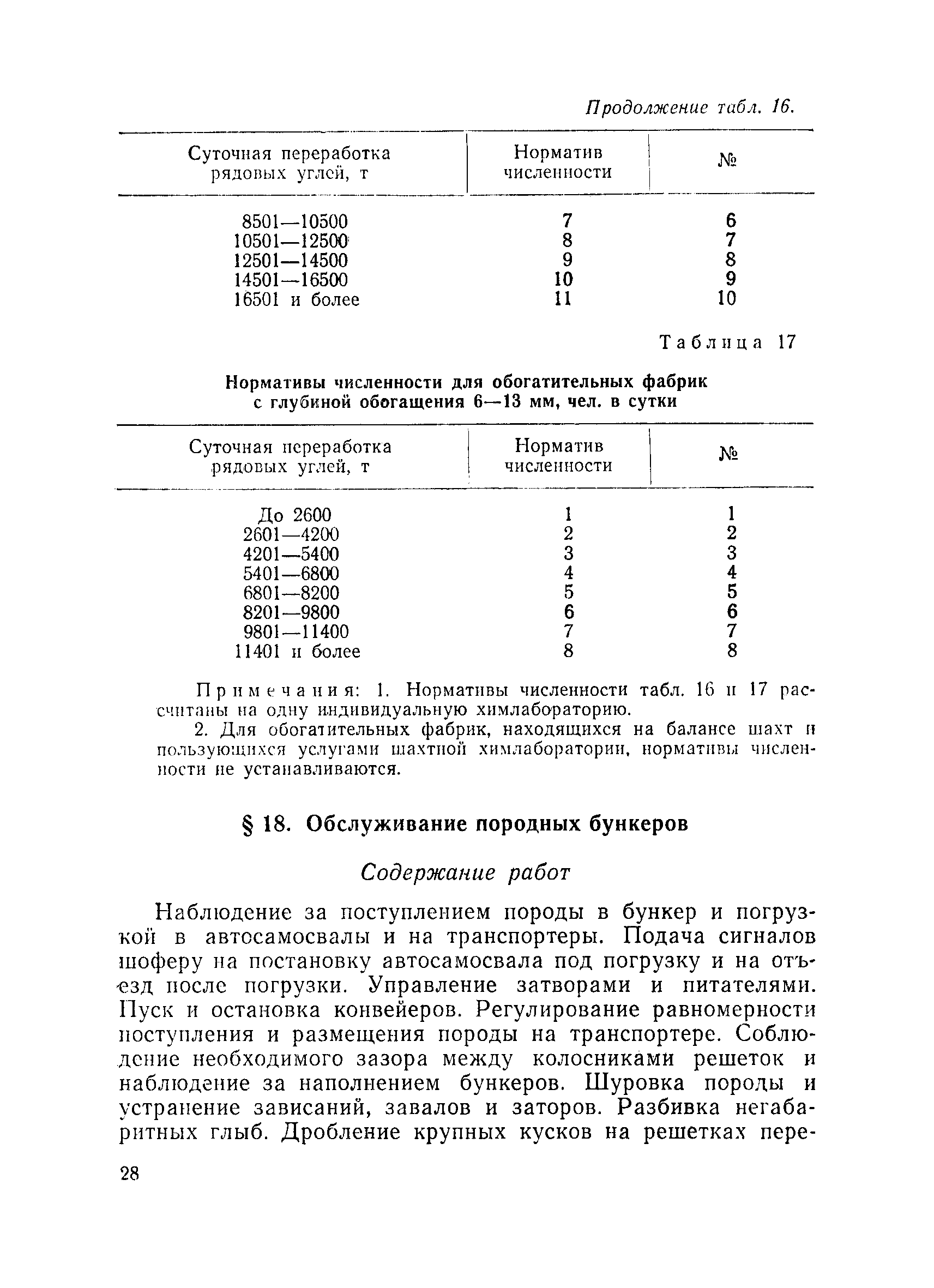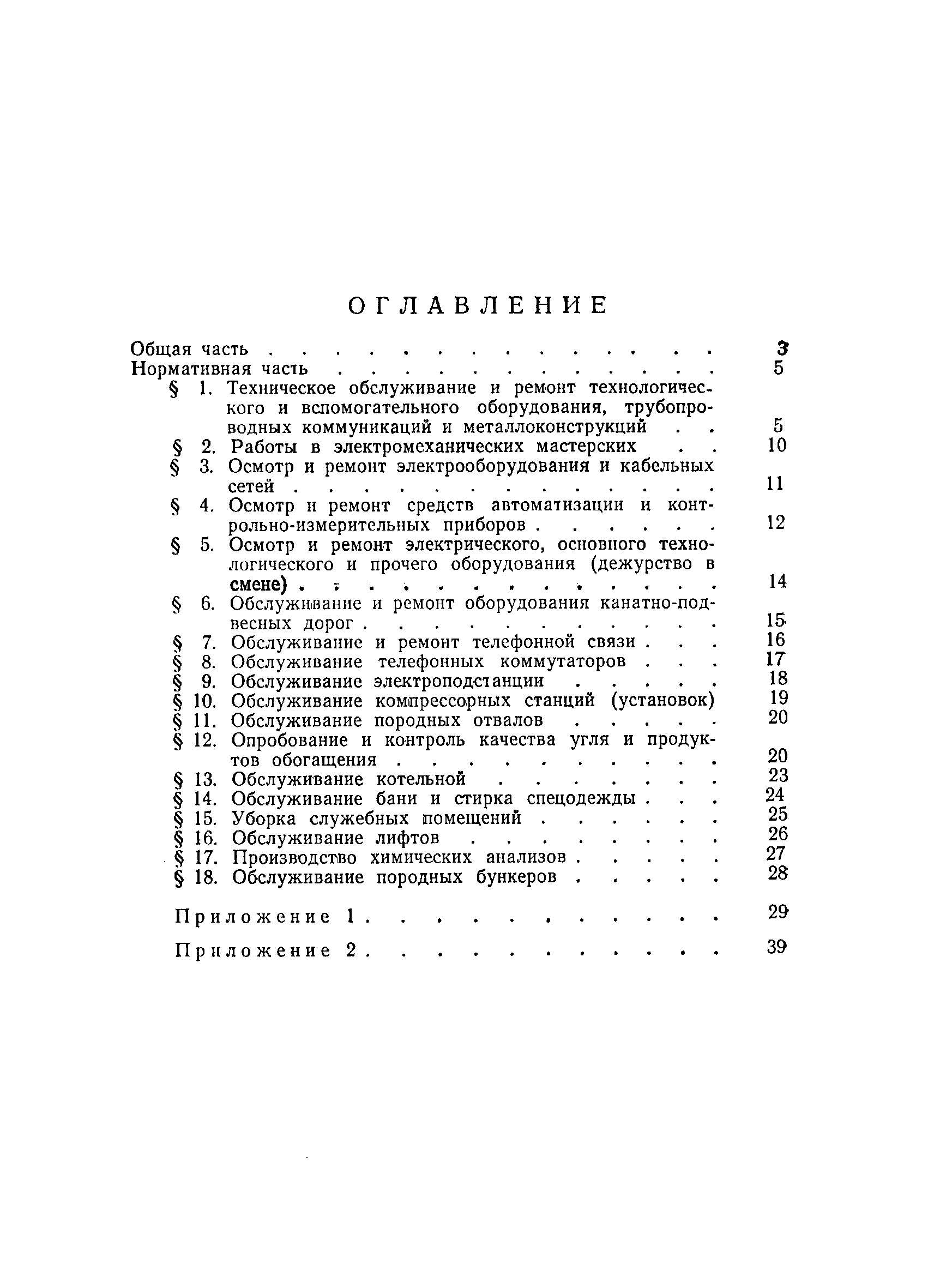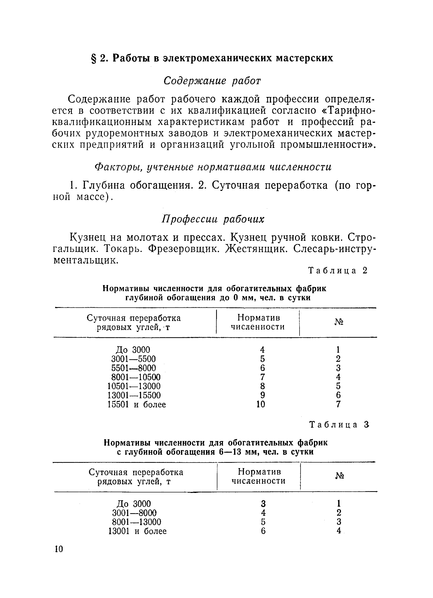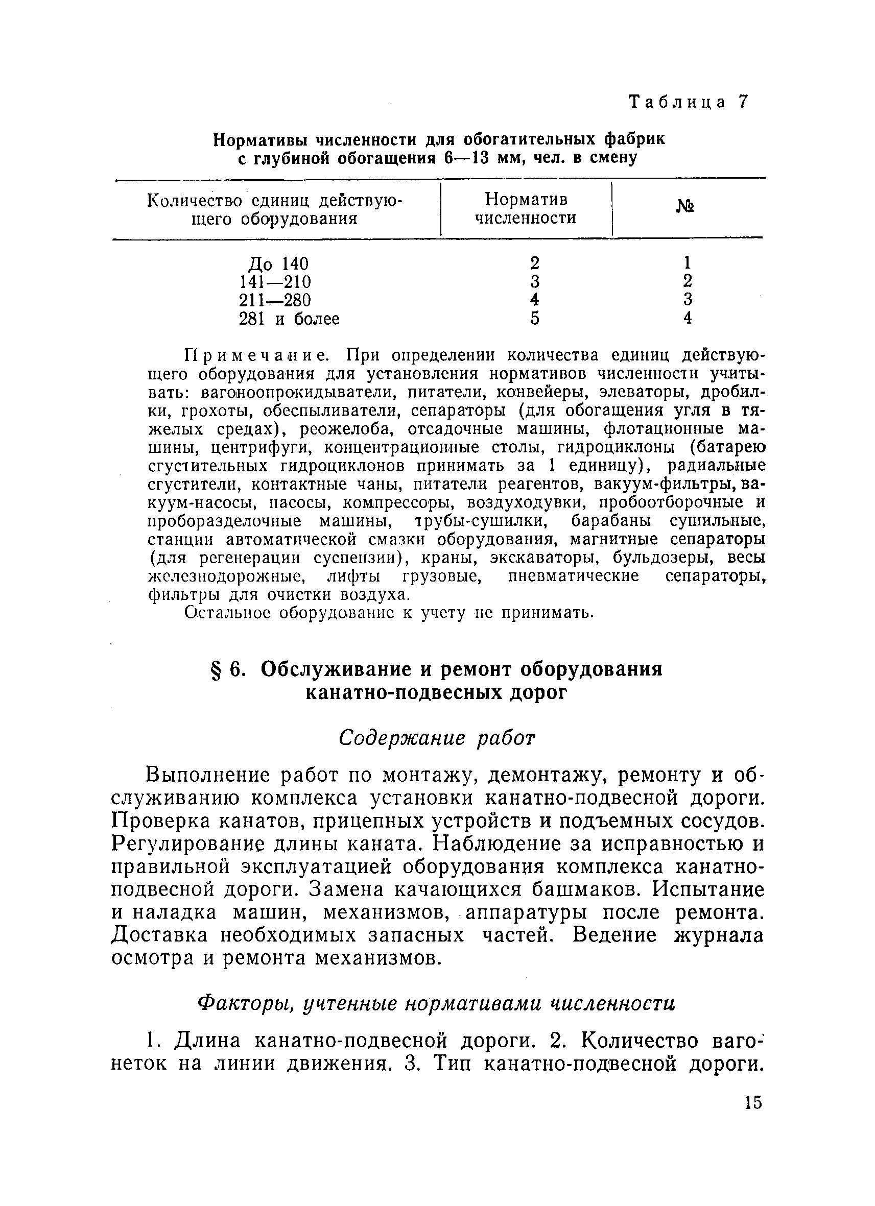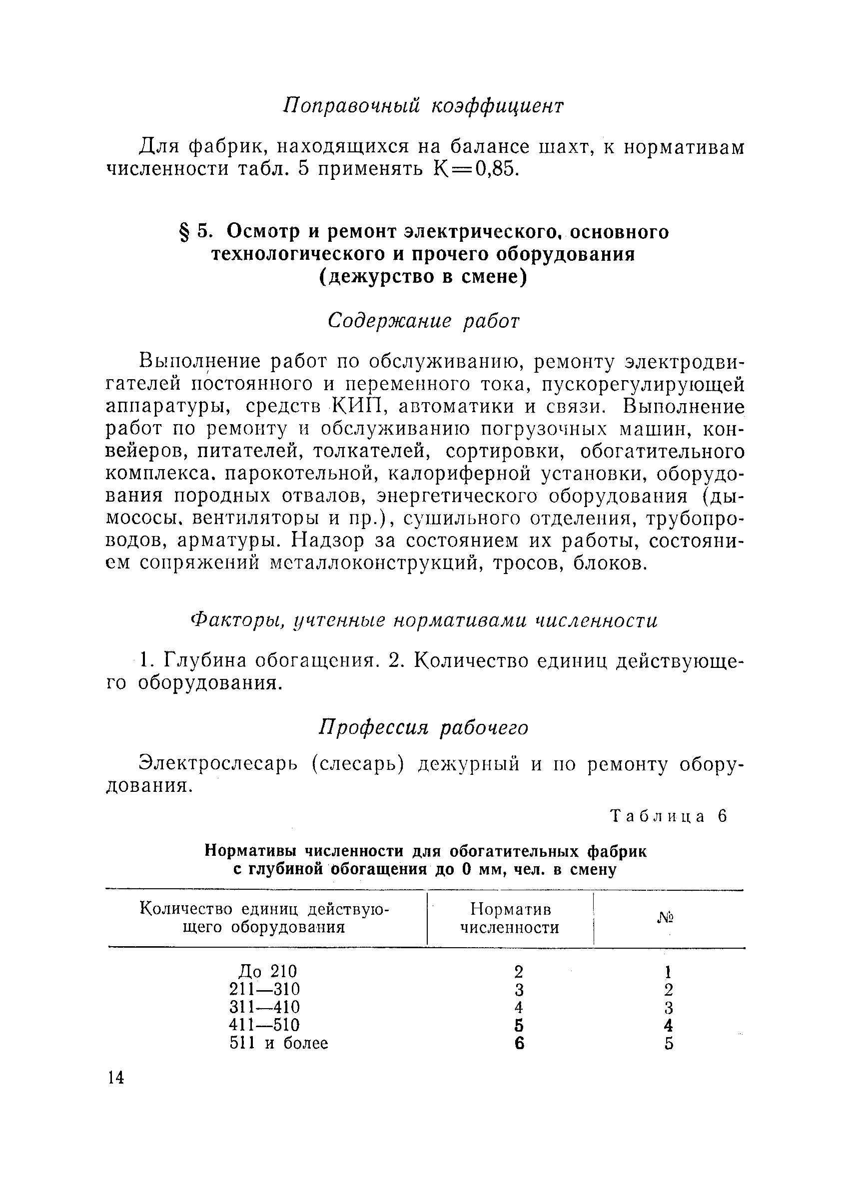 | Оглавление: | Общая часть Нормативная часть § 1. Техническое обслуживание и ремонт технологического и вспомогательного оборудования, трубопроводных коммуникаций и металлоконструкций § 2. Работы в электромеханических мастерских § 3. Осмотр и ремонт электрооборудования и кабельных сетей § 4. Осмотр и ремонт средств автоматизации и контрольно-измерительных приборов § 5. Осмотр и ремонт электрического, основного техно логического и прочего оборудования (дежурство смене) § б. Обслуживание и ремонт оборудования канатно-подвесных дорог § 7. Обслуживание и ремонт телефонной связи § 8. Обслуживание телефонных коммутаторов § 9. Обслуживание электроподстанции § 10. Обслуживание компрессорных станций (установок) § 11. Обслуживание породных отвалов § 12. Опробование и контроль качества угля и продуктов обогащения § 13. Обслуживание котельной § 14. Обслуживание бани и стирка спецодежды § 15. Уборка служебных помещений § 16. Обслуживание лифтов § 17. Производство химических анализов § 18. Обслуживание породных бункеров Приложение 1. Методические указания по определению суммарной ремонтосложности на углеобогатительной фабрике Приложение 2. Пример определения численности рабочих для технического обслуживания и ремонта технологического и вспомогательного оборудования, трубопроводных коммуникаций и металлоконструкций |