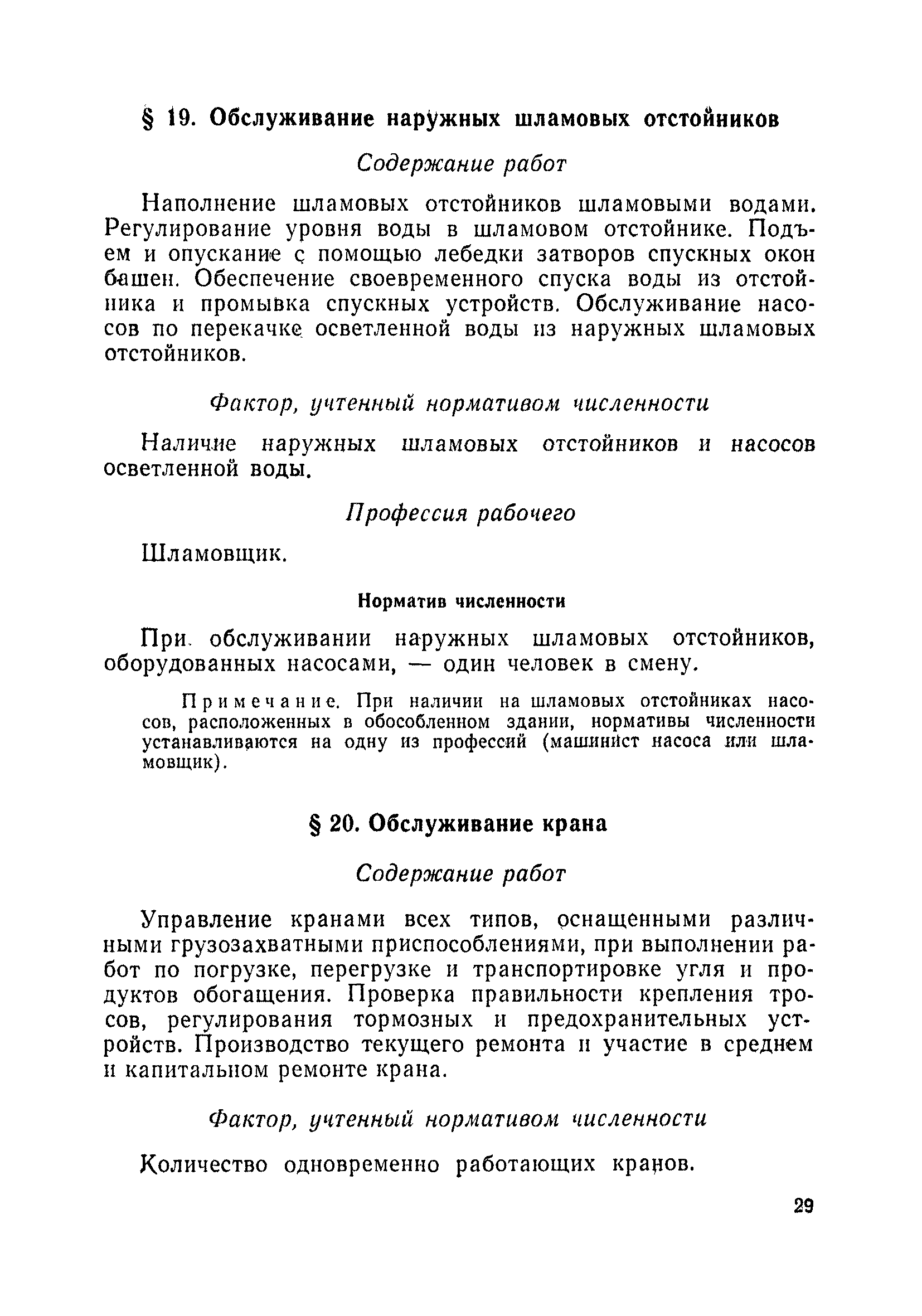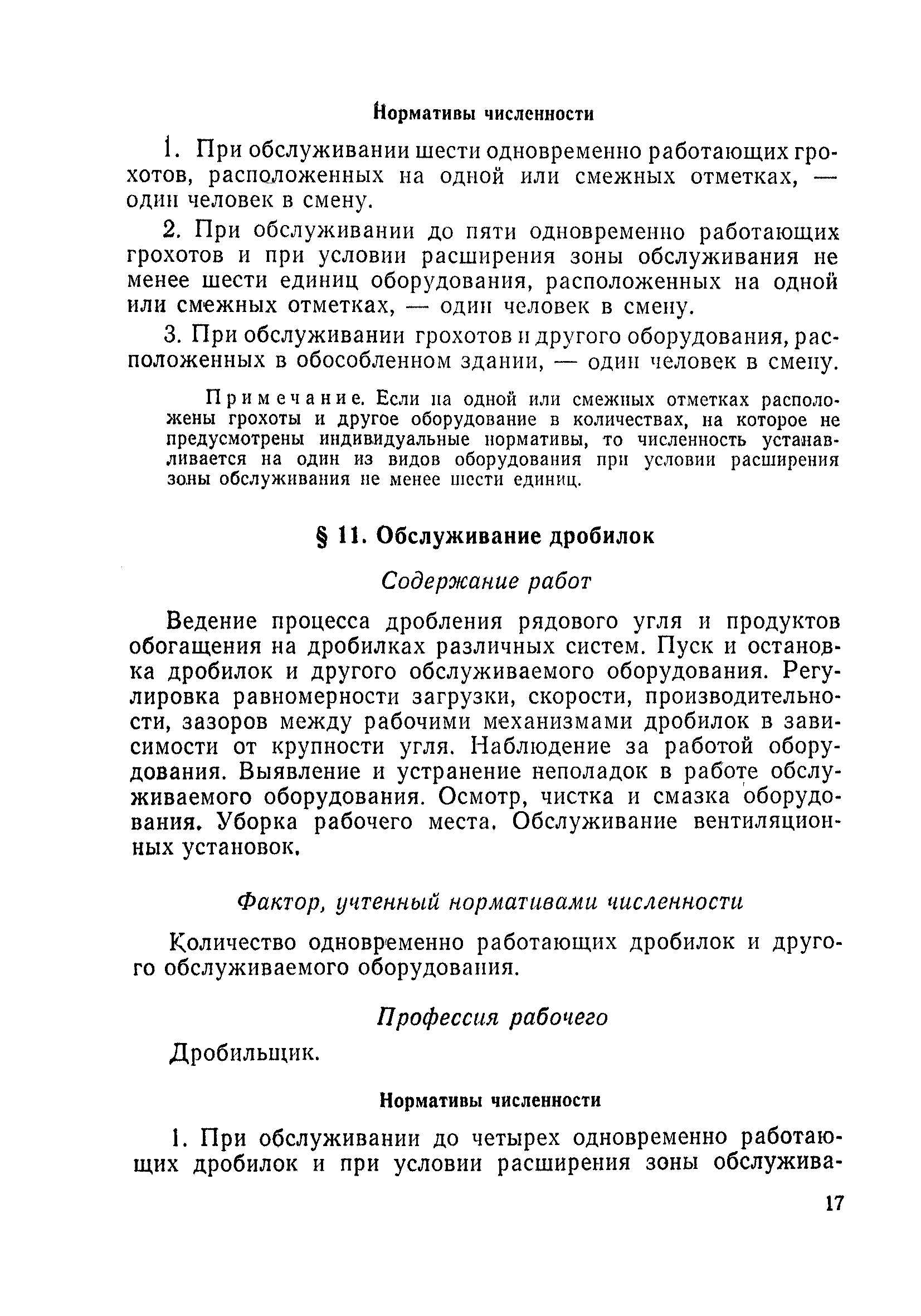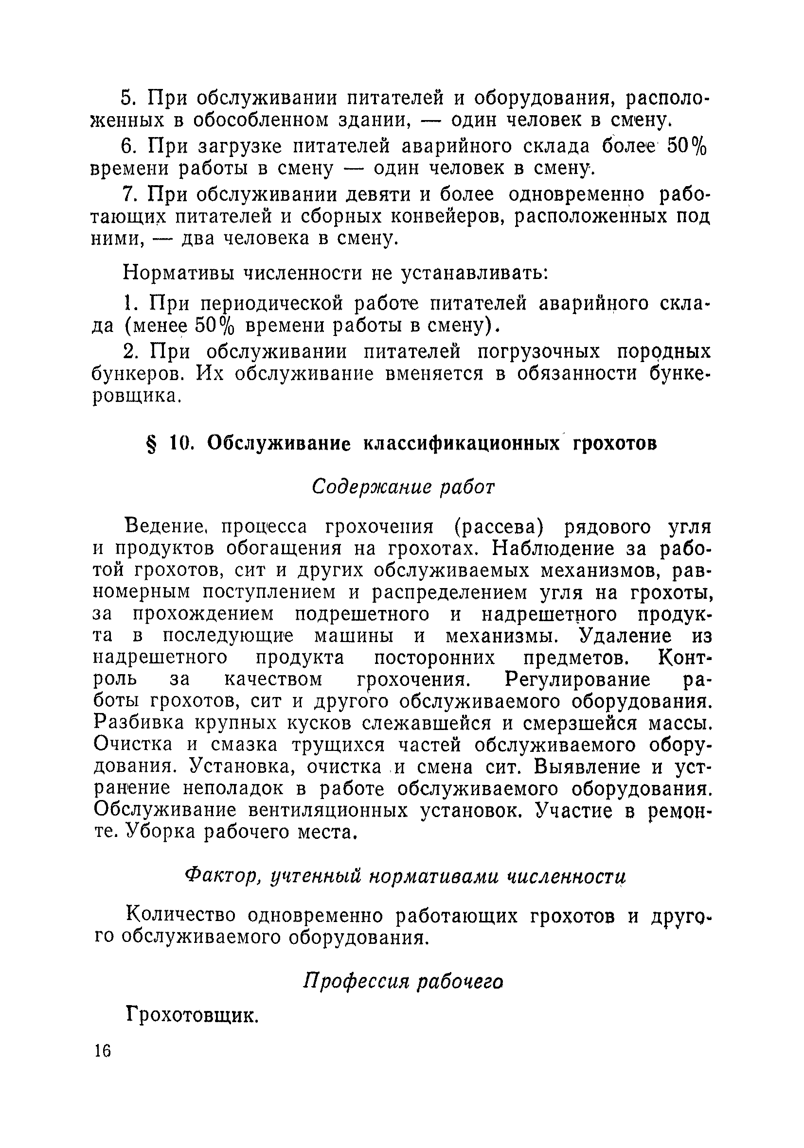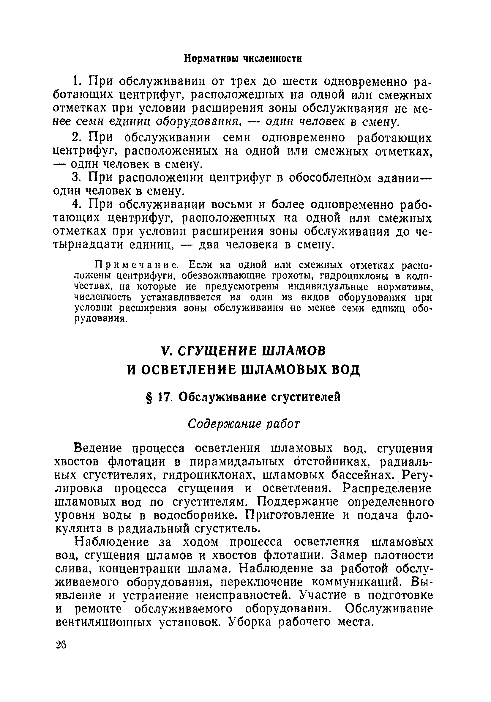 Единые отраслевые нормативы численности рабочих углеобогатительных фабрик, занятых на основных технологических процессах| Статус: | справочные материалы, мп, тпр | | Название рус.: | Единые отраслевые нормативы численности рабочих углеобогатительных фабрик, занятых на основных технологических процессах | | Дата добавления в базу: | 01.01.2019 | | Дата актуализации: | 01.01.2021 | | Область применения: | Документ является обязательным для применения на всех действующих углеобогатительных фабриках Министерства угольной промышленности СССР и предназначены для планирования численности повременно оплачиваемых рабочих и установления доплат рабочим за совмещение профессий, расширение зоны обслуживания или увеличение объема выполняемых работ | | Оглавление: | Общая часть Нормативная часть § 1. Контроль приема рядовых углей § 2. Разгрузка рядового угля § 3. Погрузка продуктов обогащения § 4. Обслуживание вагоноопрокидывателей § 5. Взвешивание рядового угля и продуктов обогащения § 6. Очистка бункеров § 7. Обслуживание лебедок § 8. Транспортирование-рядового угля и продуктов обогащения § 9. Обслуживание питателей § 10. Обслуживание классификационных грохотов § 11. Обслуживание дробилок § 12. Обслуживание дозировочных устройств § 13. Обслуживание отсадочных машин, моечных желобов концентрационных столов, гидроциклонов § 14. Обслуживание сепараторов и гидроциклонов при обогащении в тяжелых средах § 15. Обслуживание обезвоживающих грохотов § 16. Обслуживание центрифуг § 17. Обслуживание сгустителей § 18. Обслуживание насосных установок § 19. Обслуживание наружных шламовых отстойников § 20. Обслуживание крана § 21. Обслуживание флотомашин § 22. Обслуживание вакуум-фильтров. § 23. Обслуживание сушильных установок § 24. Управление технологическим процессом обогатительной фабрики § 25. Выборка породы (полезного ископаемого) Приложение 1. Методические указания по определению коэффициентов списочного состава Приложение 2. Перечень машин, механизмов, установок и других объектов, принимаемых за единицу оборудования при расчете зоны обслуживания для установления нормативов численности рабочих | | Разработан: | ЦНИС по труду МУП СССР
