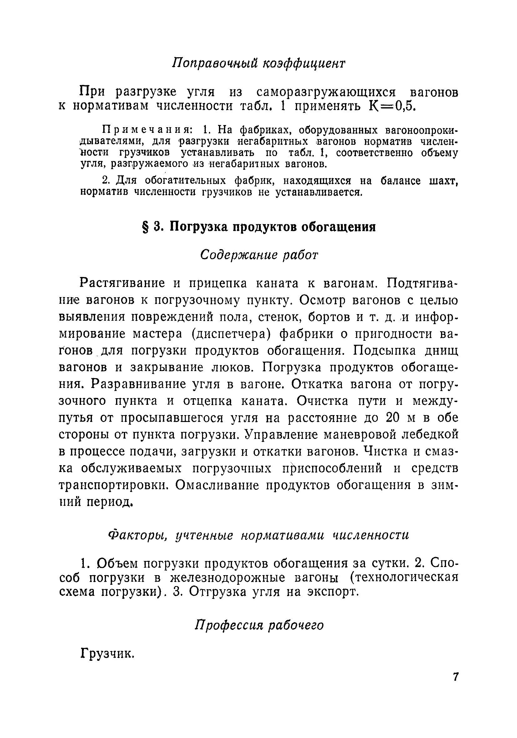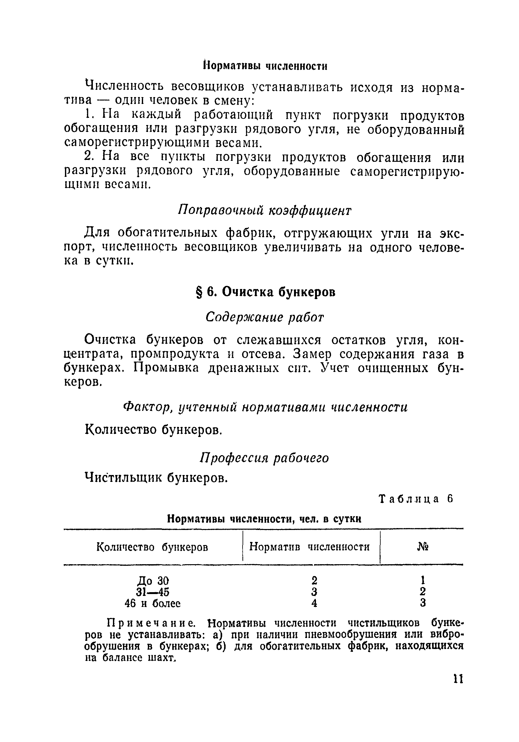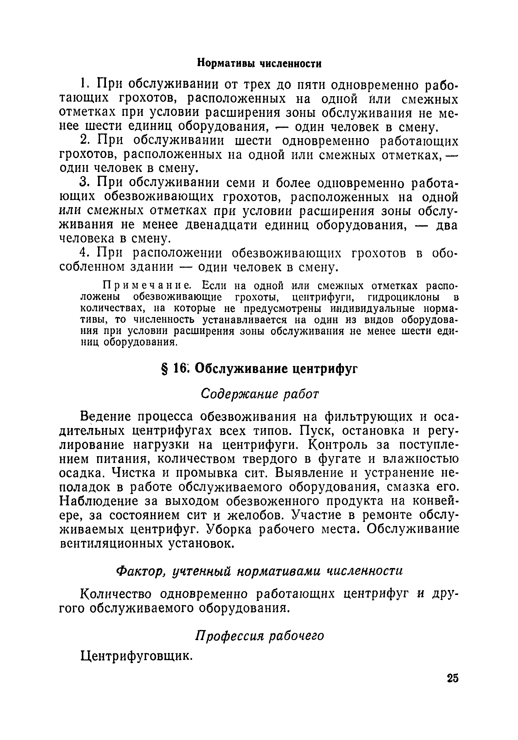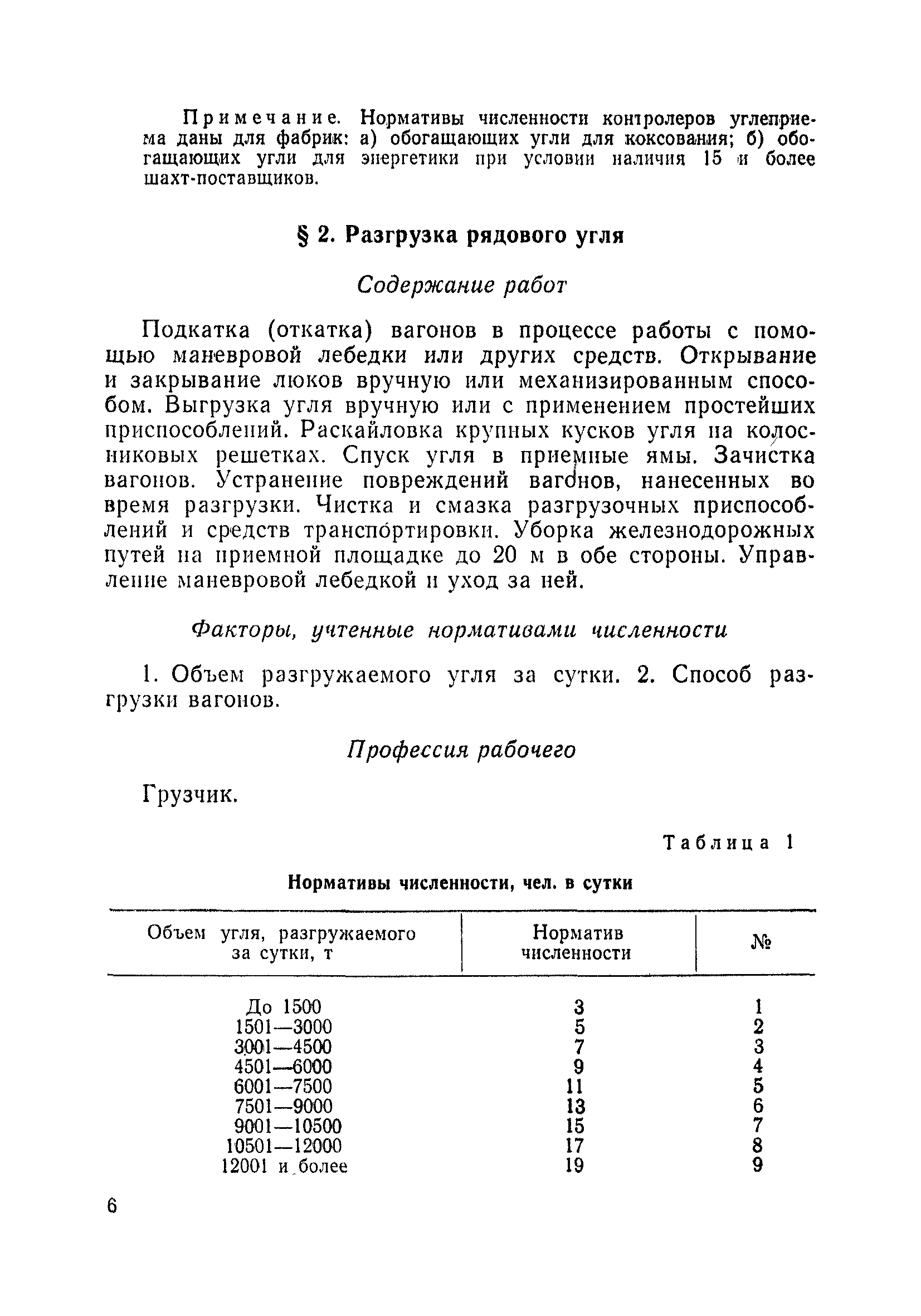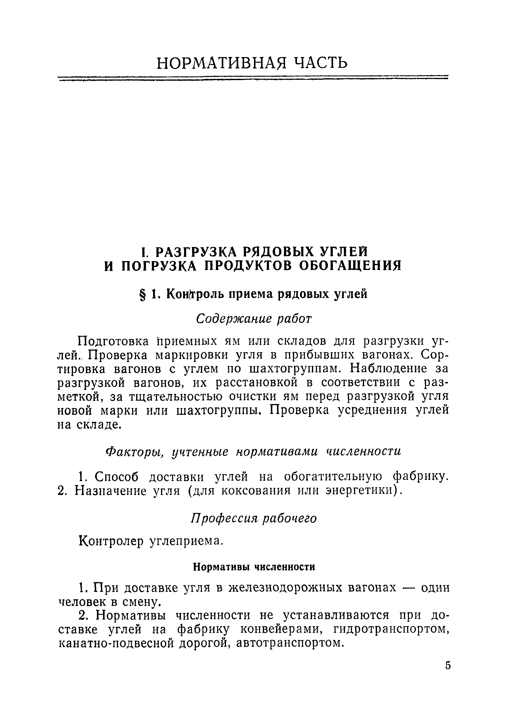 Единые отраслевые нормативы численности рабочих углеобогатительных фабрик, занятых на основных технологических процессах| Статус: | справочные материалы, мп, тпр | | Название рус.: | Единые отраслевые нормативы численности рабочих углеобогатительных фабрик, занятых на основных технологических процессах | | Дата добавления в базу: | 01.01.2019 | | Дата актуализации: | 01.01.2021 | | Область применения: | Документ является обязательным для применения на всех действующих углеобогатительных фабриках Министерства угольной промышленности СССР и предназначены для планирования численности повременно оплачиваемых рабочих и установления доплат рабочим за совмещение профессий, расширение зоны обслуживания или увеличение объема выполняемых работ | | Оглавление: | Общая часть Нормативная часть § 1. Контроль приема рядовых углей § 2. Разгрузка рядового угля § 3. Погрузка продуктов обогащения § 4. Обслуживание вагоноопрокидывателей § 5. Взвешивание рядового угля и продуктов обогащения § 6. Очистка бункеров § 7. Обслуживание лебедок § 8. Транспортирование-рядового угля и продуктов обогащения § 9. Обслуживание питателей § 10. Обслуживание классификационных грохотов § 11. Обслуживание дробилок § 12. Обслуживание дозировочных устройств § 13. Обслуживание отсадочных машин, моечных желобов концентрационных столов, гидроциклонов § 14. Обслуживание сепараторов и гидроциклонов при обогащении в тяжелых средах § 15. Обслуживание обезвоживающих грохотов § 16. Обслуживание центрифуг § 17. Обслуживание сгустителей § 18. Обслуживание насосных установок § 19. Обслуживание наружных шламовых отстойников § 20. Обслуживание крана § 21. Обслуживание флотомашин § 22. Обслуживание вакуум-фильтров. § 23. Обслуживание сушильных установок § 24. Управление технологическим процессом обогатительной фабрики § 25. Выборка породы (полезного ископаемого) Приложение 1. Методические указания по определению коэффициентов списочного состава Приложение 2. Перечень машин, механизмов, установок и других объектов, принимаемых за единицу оборудования при расчете зоны обслуживания для установления нормативов численности рабочих | | Разработан: | ЦНИС по труду МУП СССР
