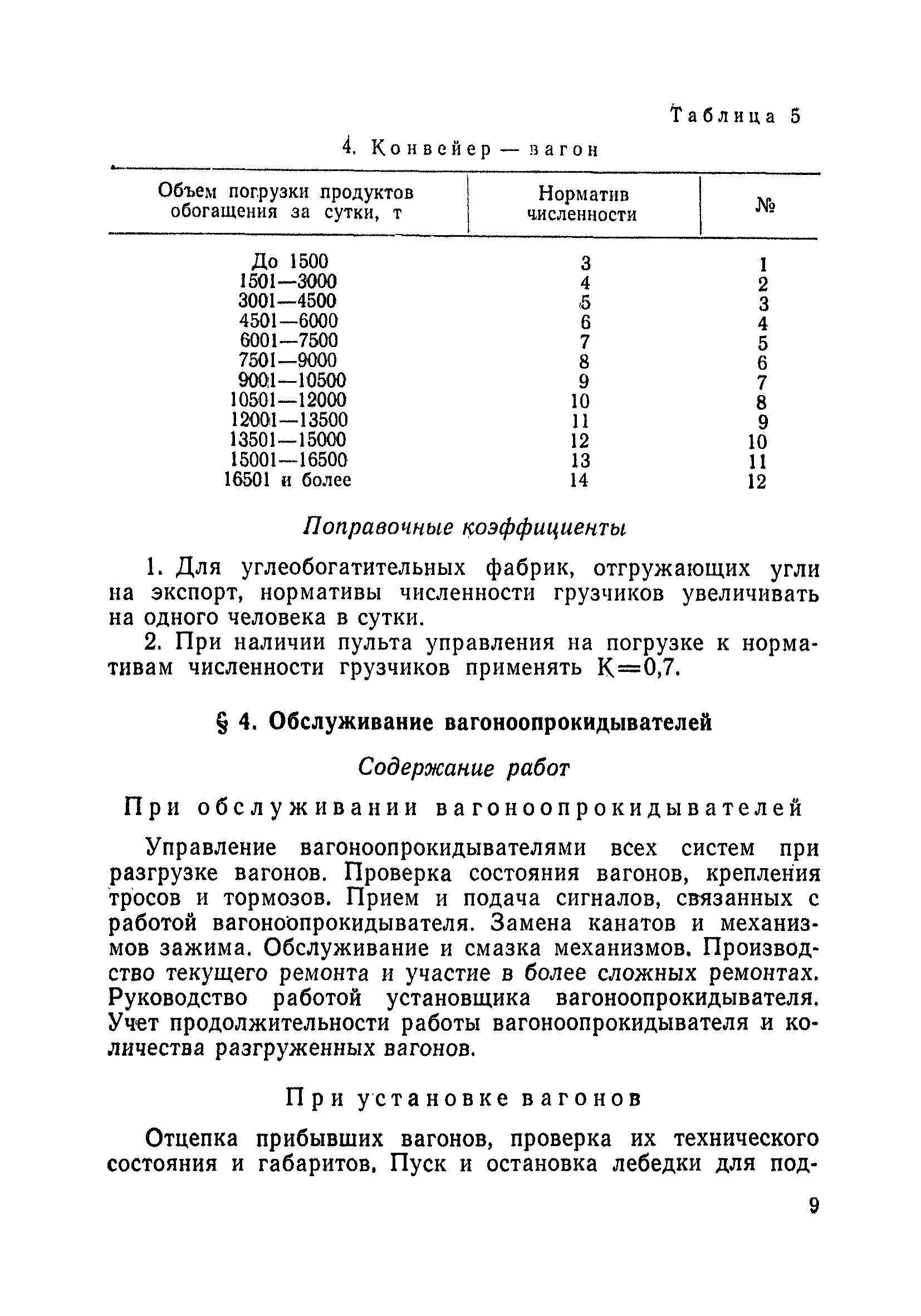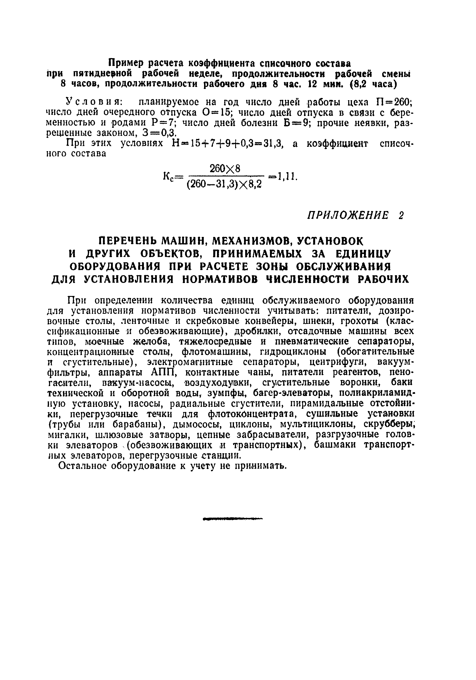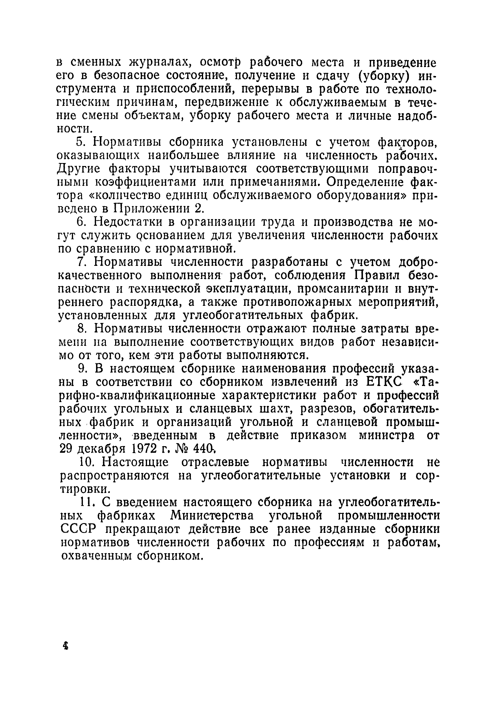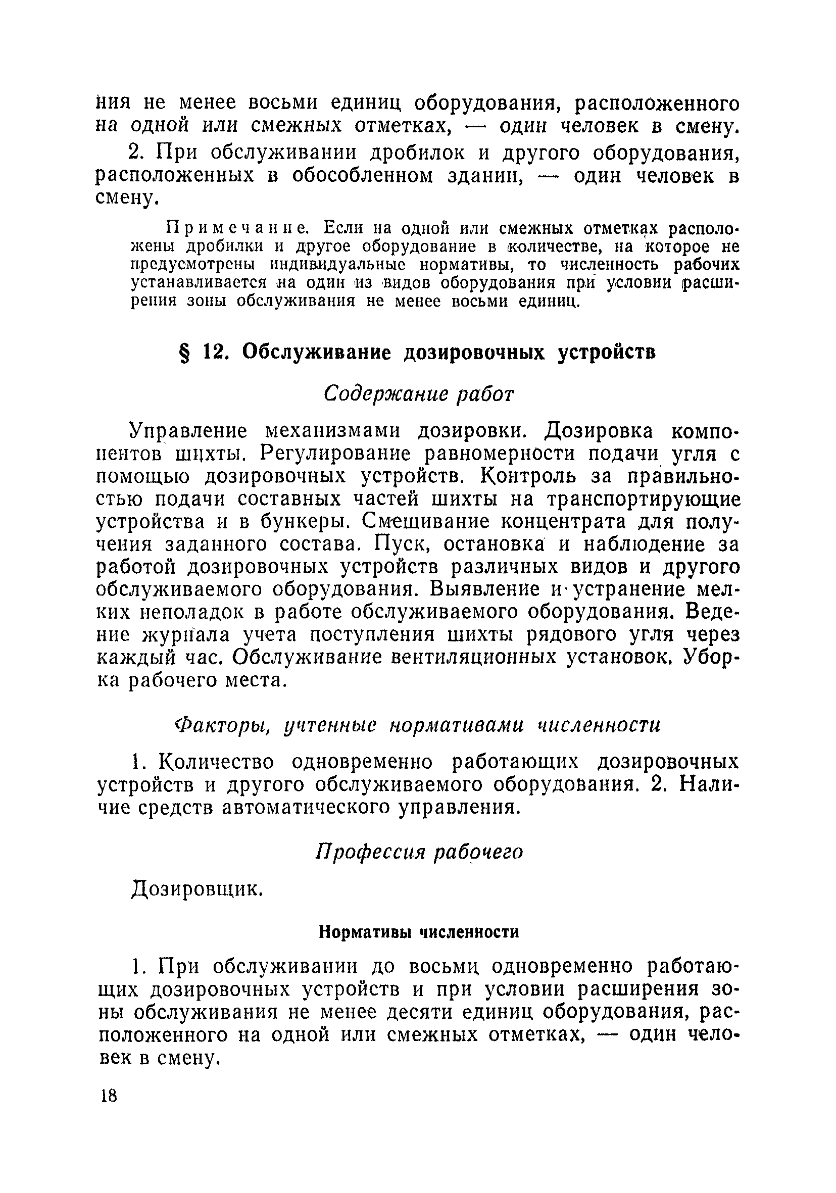 Единые отраслевые нормативы численности рабочих углеобогатительных фабрик, занятых на основных технологических процессах| Статус: | справочные материалы, мп, тпр | | Название рус.: | Единые отраслевые нормативы численности рабочих углеобогатительных фабрик, занятых на основных технологических процессах | | Дата добавления в базу: | 01.01.2019 | | Дата актуализации: | 01.01.2021 | | Область применения: | Документ является обязательным для применения на всех действующих углеобогатительных фабриках Министерства угольной промышленности СССР и предназначены для планирования численности повременно оплачиваемых рабочих и установления доплат рабочим за совмещение профессий, расширение зоны обслуживания или увеличение объема выполняемых работ | | Оглавление: | Общая часть Нормативная часть § 1. Контроль приема рядовых углей § 2. Разгрузка рядового угля § 3. Погрузка продуктов обогащения § 4. Обслуживание вагоноопрокидывателей § 5. Взвешивание рядового угля и продуктов обогащения § 6. Очистка бункеров § 7. Обслуживание лебедок § 8. Транспортирование-рядового угля и продуктов обогащения § 9. Обслуживание питателей § 10. Обслуживание классификационных грохотов § 11. Обслуживание дробилок § 12. Обслуживание дозировочных устройств § 13. Обслуживание отсадочных машин, моечных желобов концентрационных столов, гидроциклонов § 14. Обслуживание сепараторов и гидроциклонов при обогащении в тяжелых средах § 15. Обслуживание обезвоживающих грохотов § 16. Обслуживание центрифуг § 17. Обслуживание сгустителей § 18. Обслуживание насосных установок § 19. Обслуживание наружных шламовых отстойников § 20. Обслуживание крана § 21. Обслуживание флотомашин § 22. Обслуживание вакуум-фильтров. § 23. Обслуживание сушильных установок § 24. Управление технологическим процессом обогатительной фабрики § 25. Выборка породы (полезного ископаемого) Приложение 1. Методические указания по определению коэффициентов списочного состава Приложение 2. Перечень машин, механизмов, установок и других объектов, принимаемых за единицу оборудования при расчете зоны обслуживания для установления нормативов численности рабочих | | Разработан: | ЦНИС по труду МУП СССР