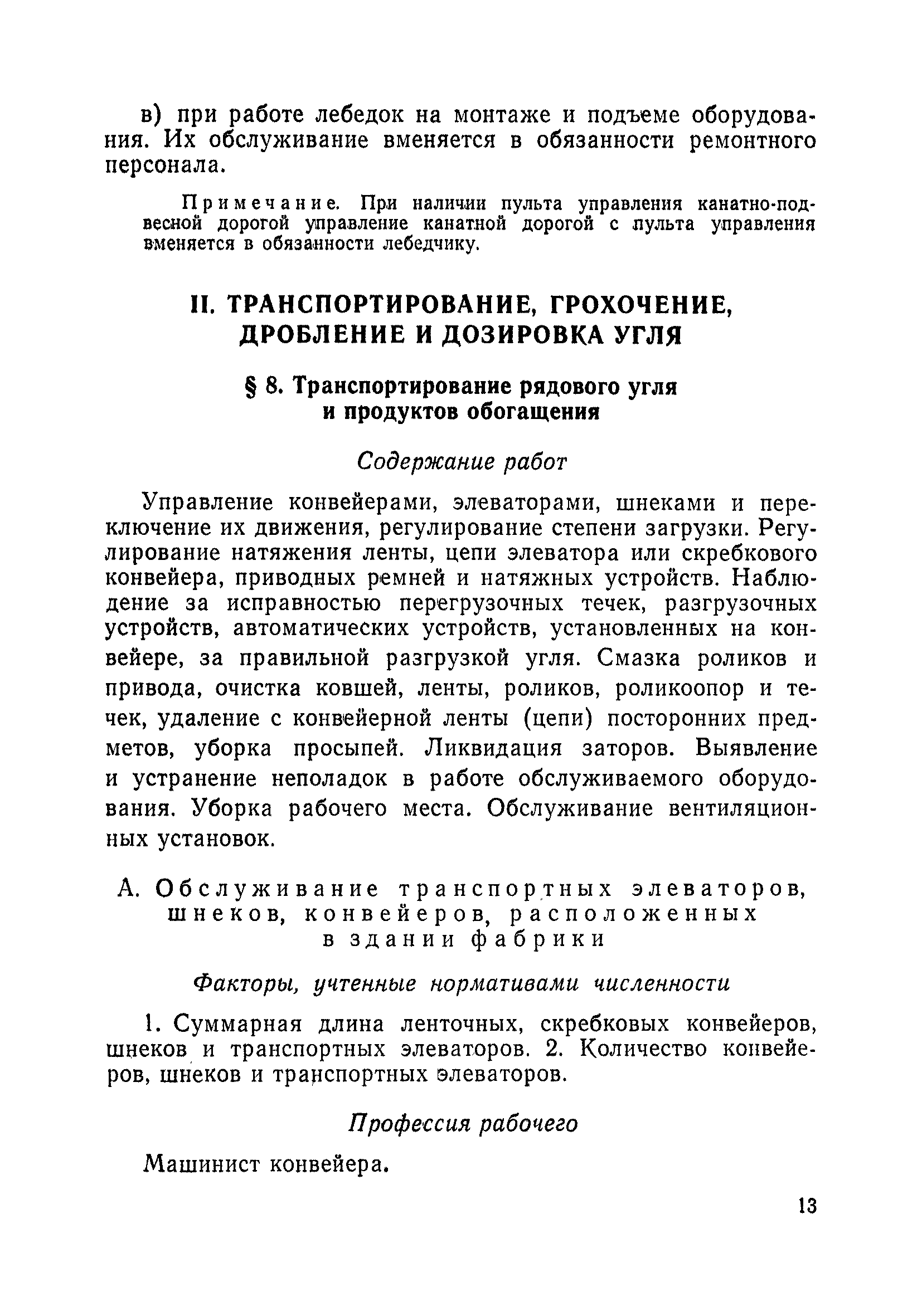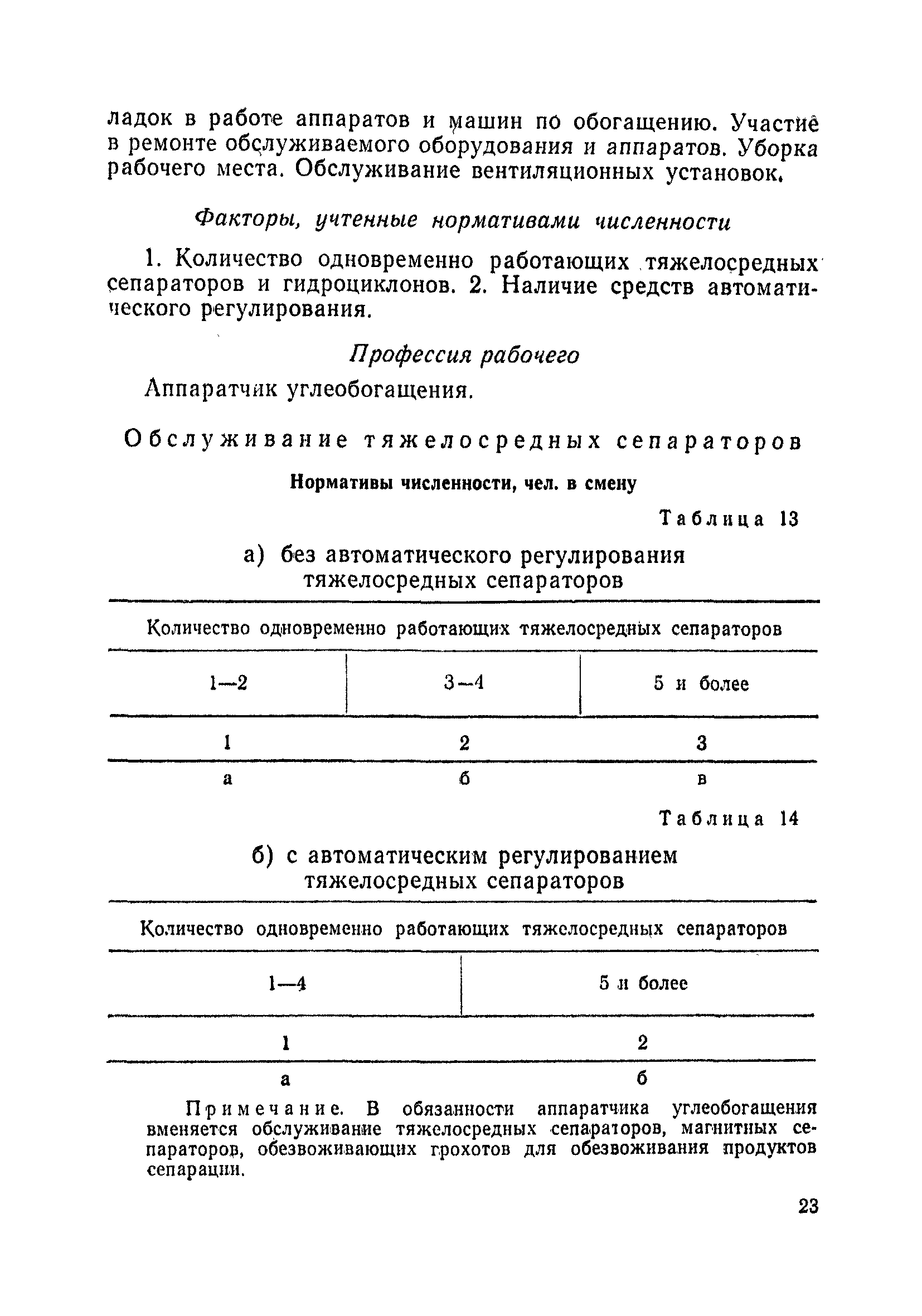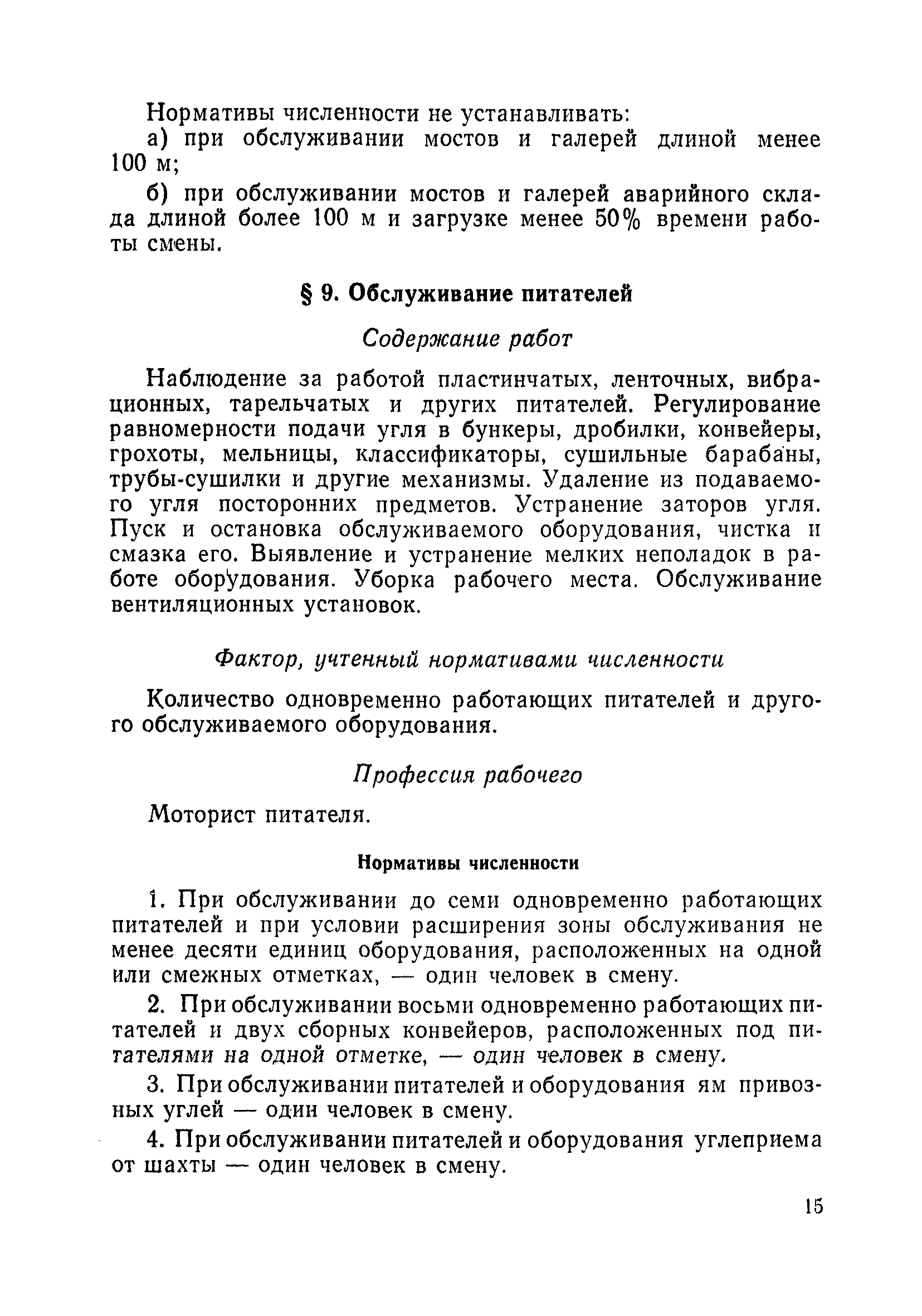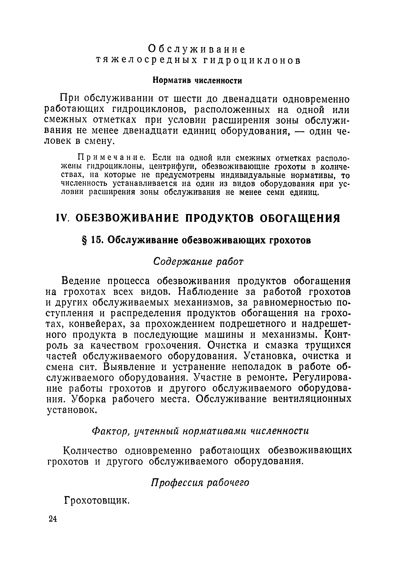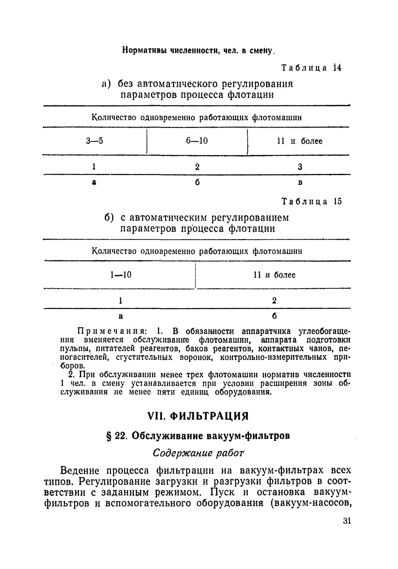 Единые отраслевые нормативы численности рабочих углеобогатительных фабрик, занятых на основных технологических процессах| Статус: | справочные материалы, мп, тпр | | Название рус.: | Единые отраслевые нормативы численности рабочих углеобогатительных фабрик, занятых на основных технологических процессах | | Дата добавления в базу: | 01.01.2019 | | Дата актуализации: | 01.01.2021 | | Область применения: | Документ является обязательным для применения на всех действующих углеобогатительных фабриках Министерства угольной промышленности СССР и предназначены для планирования численности повременно оплачиваемых рабочих и установления доплат рабочим за совмещение профессий, расширение зоны обслуживания или увеличение объема выполняемых работ | | Оглавление: | Общая часть Нормативная часть § 1. Контроль приема рядовых углей § 2. Разгрузка рядового угля § 3. Погрузка продуктов обогащения § 4. Обслуживание вагоноопрокидывателей § 5. Взвешивание рядового угля и продуктов обогащения § 6. Очистка бункеров § 7. Обслуживание лебедок § 8. Транспортирование-рядового угля и продуктов обогащения § 9. Обслуживание питателей § 10. Обслуживание классификационных грохотов § 11. Обслуживание дробилок § 12. Обслуживание дозировочных устройств § 13. Обслуживание отсадочных машин, моечных желобов концентрационных столов, гидроциклонов § 14. Обслуживание сепараторов и гидроциклонов при обогащении в тяжелых средах § 15. Обслуживание обезвоживающих грохотов § 16. Обслуживание центрифуг § 17. Обслуживание сгустителей § 18. Обслуживание насосных установок § 19. Обслуживание наружных шламовых отстойников § 20. Обслуживание крана § 21. Обслуживание флотомашин § 22. Обслуживание вакуум-фильтров. § 23. Обслуживание сушильных установок § 24. Управление технологическим процессом обогатительной фабрики § 25. Выборка породы (полезного ископаемого) Приложение 1. Методические указания по определению коэффициентов списочного состава Приложение 2. Перечень машин, механизмов, установок и других объектов, принимаемых за единицу оборудования при расчете зоны обслуживания для установления нормативов численности рабочих | | Разработан: | ЦНИС по труду МУП СССР