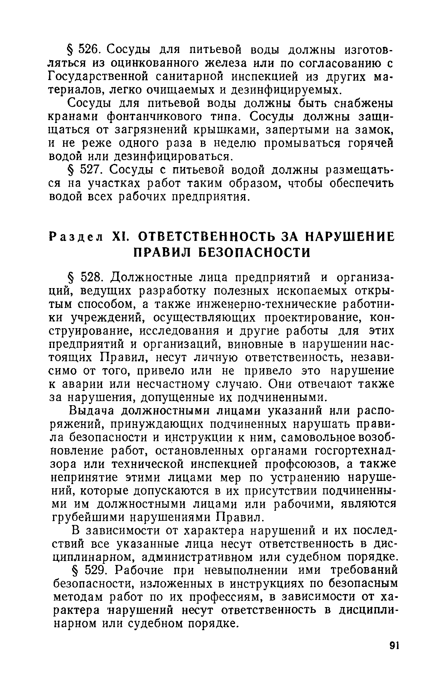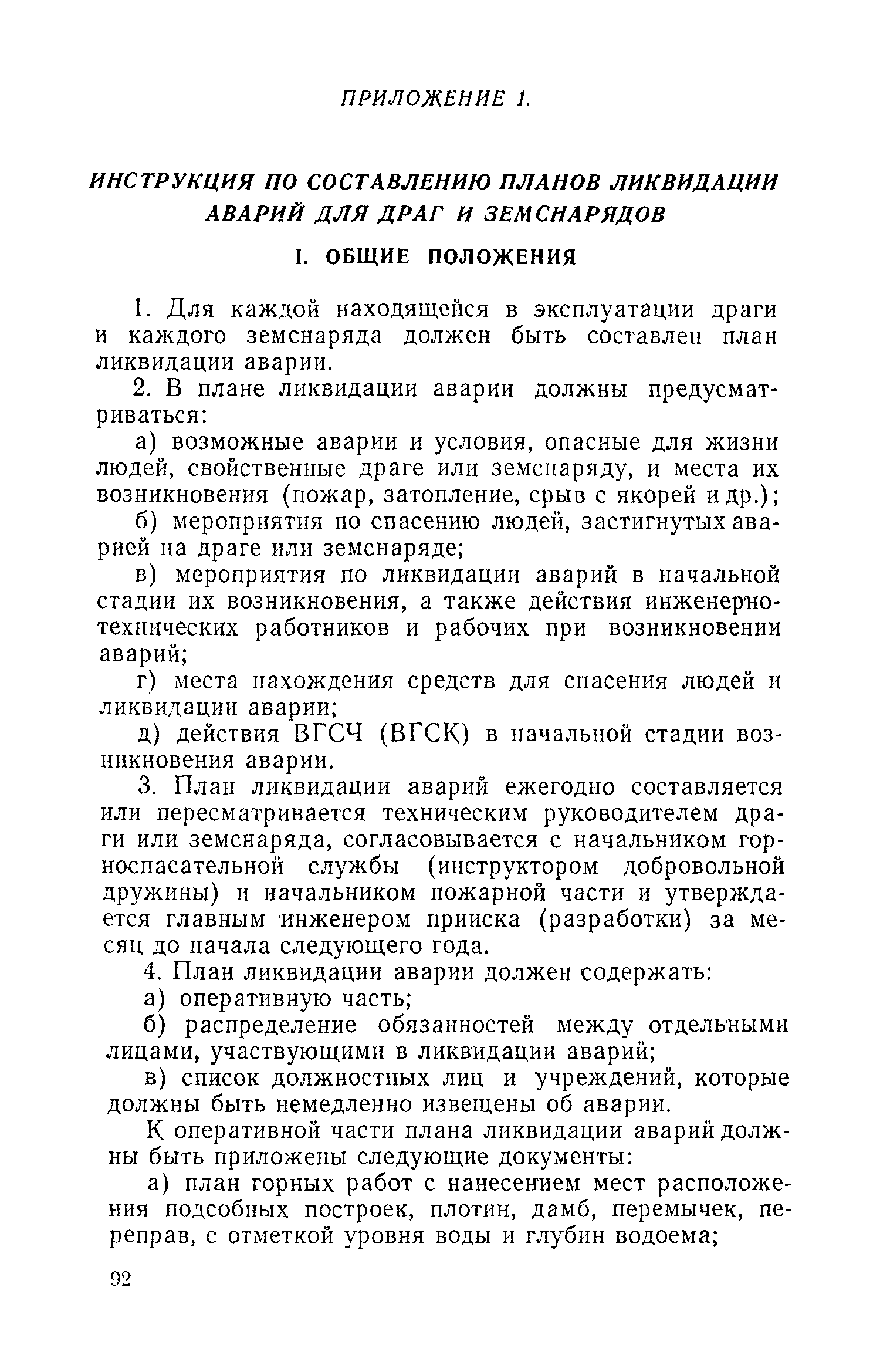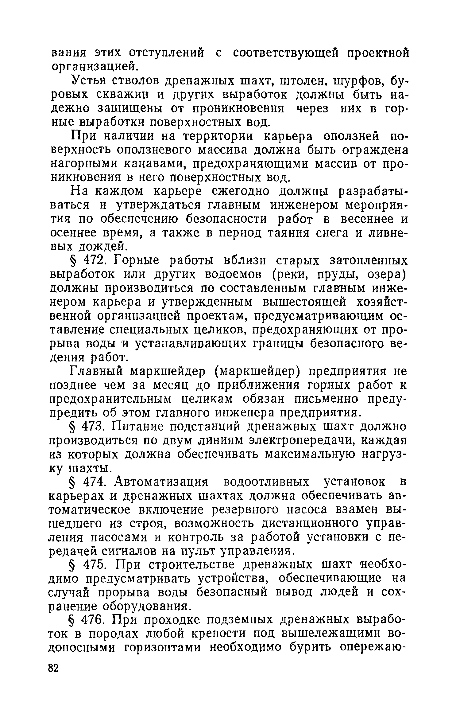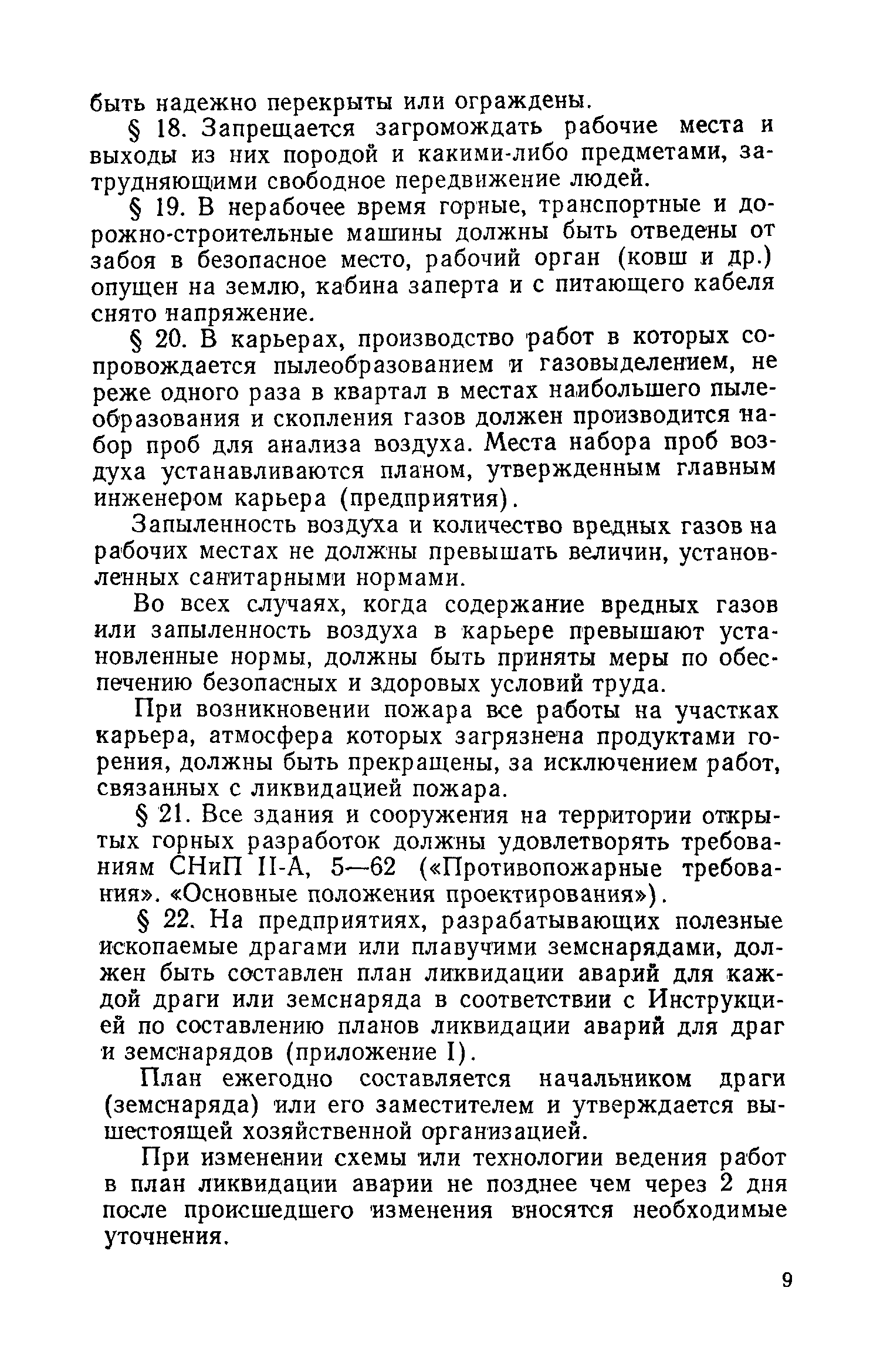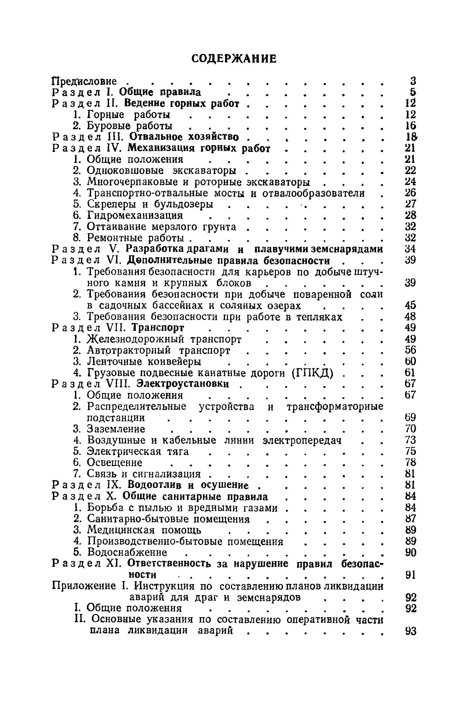 | Оглавление: | Предисловие Раздел I. Общие правила Раздел II. Ведение горных работ 1Горные работы 2 Буровые работы Раздел III. Отвальное хозяйство Раздел I. Механизация горных работ 1Общие положения 2 Одноковшовые экскаваторы 3 Многочерпаковые и роторные экскаваторы 4 Транспортно-отвальные мосты и отвалообразователи 5 Скреперы и бульдозеры 6 Гидромеханизация 7 Оттаивание мерзлого грунта 8 Ремонтные работы Раздел V. Разработка драгами и плавучими земснарядами Раздел VI. Дополнительные правила безопасности 1 Требования безопасности для карьеров по добыче штучного камня и крупных блоков 2 Требования безопасности при добыче поваренной соли в садочных бассейнах и соляных озерах 3 Требования безопасности при работе в тепляках Раздел VII. Транспорт 1 Железнодорожный транспорт 2 Автотракторный транспорт 3 Ленточные конвейеры 4 Грузовые подвесные канатные дороги (ГПКД) Раздел УIII. Электроустановки 1 Общие положения 2 Распределительные устройства и трансформаторные подстанции 3 Заземление 4 Воздушные и кабельные линии электропередач 5 Электрическая тяга 6 Освещение 7 Связь и сигнализация Раздел IХ. Водоотлив и осушение Раздел Х. Общие санитарные правила 1 Борьба с пылью и вредными газами 2 Санитарно-бытовые помещения 3 Медицинская помощь 4 Производственно-бытовые помещения 5 Водоснабжение Раздел ХI. Ответственность за нарушение правил безопасности Приложение 1. Инструкция по составлению планов ликвидации аварий для драг и земснарядов I. Общие положения II. Основные указания по составлению оперативной части плана ликвидации аварий |