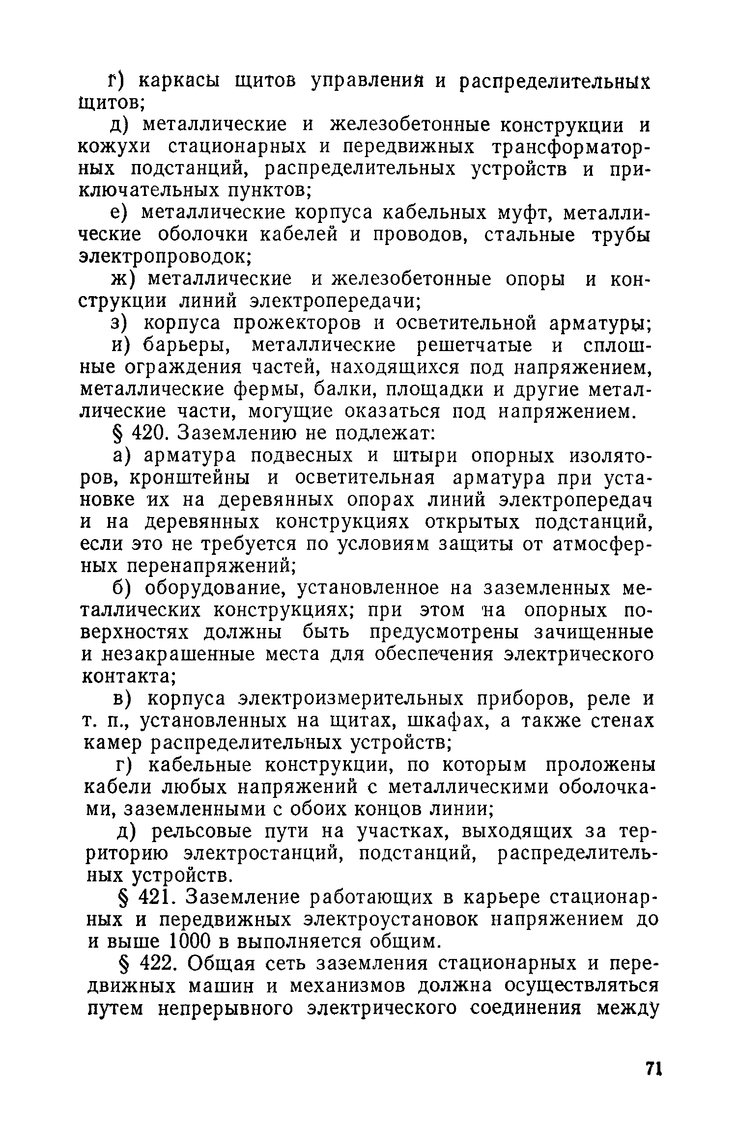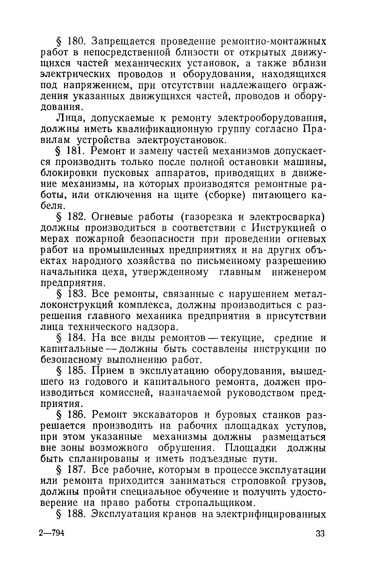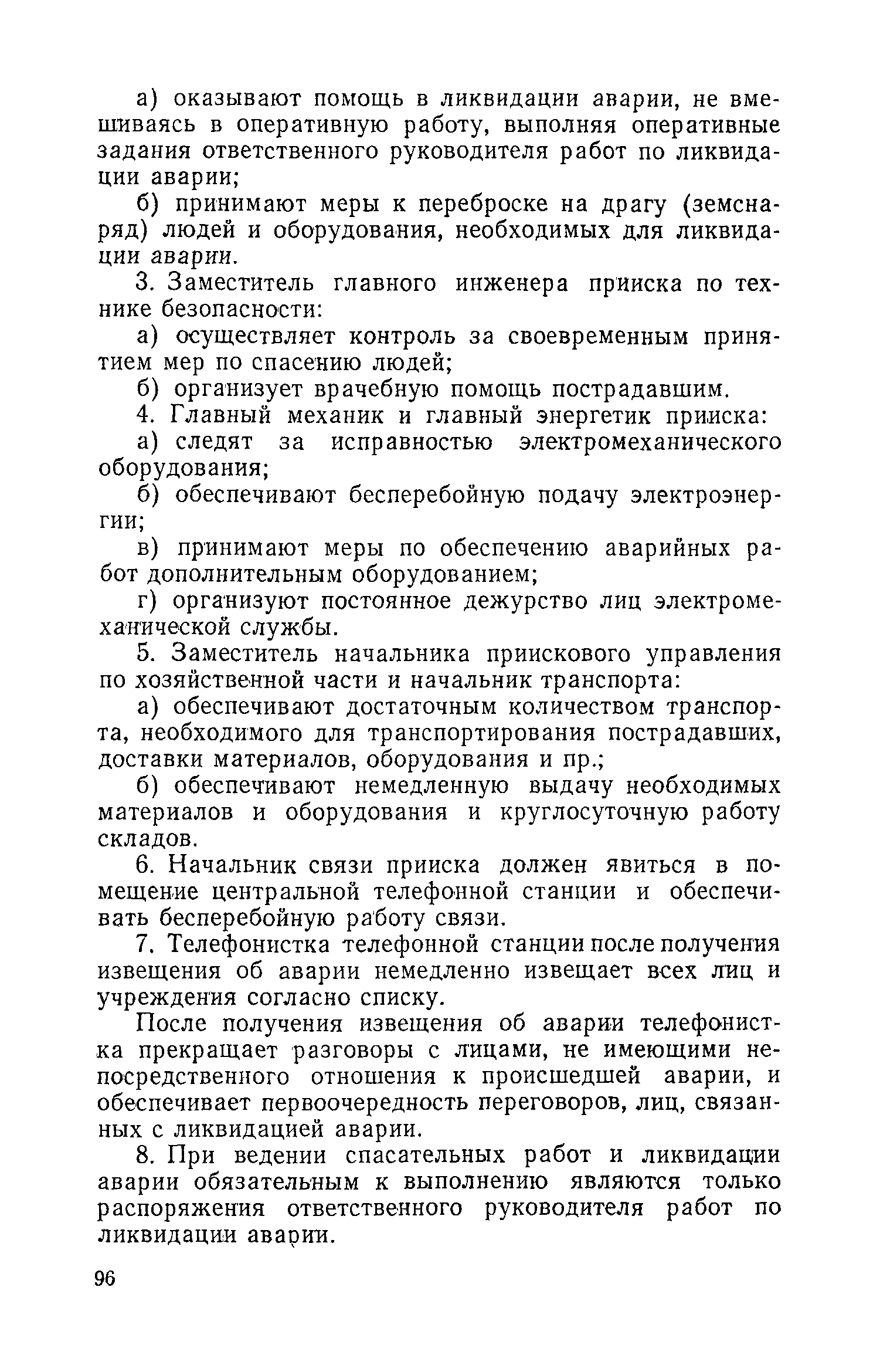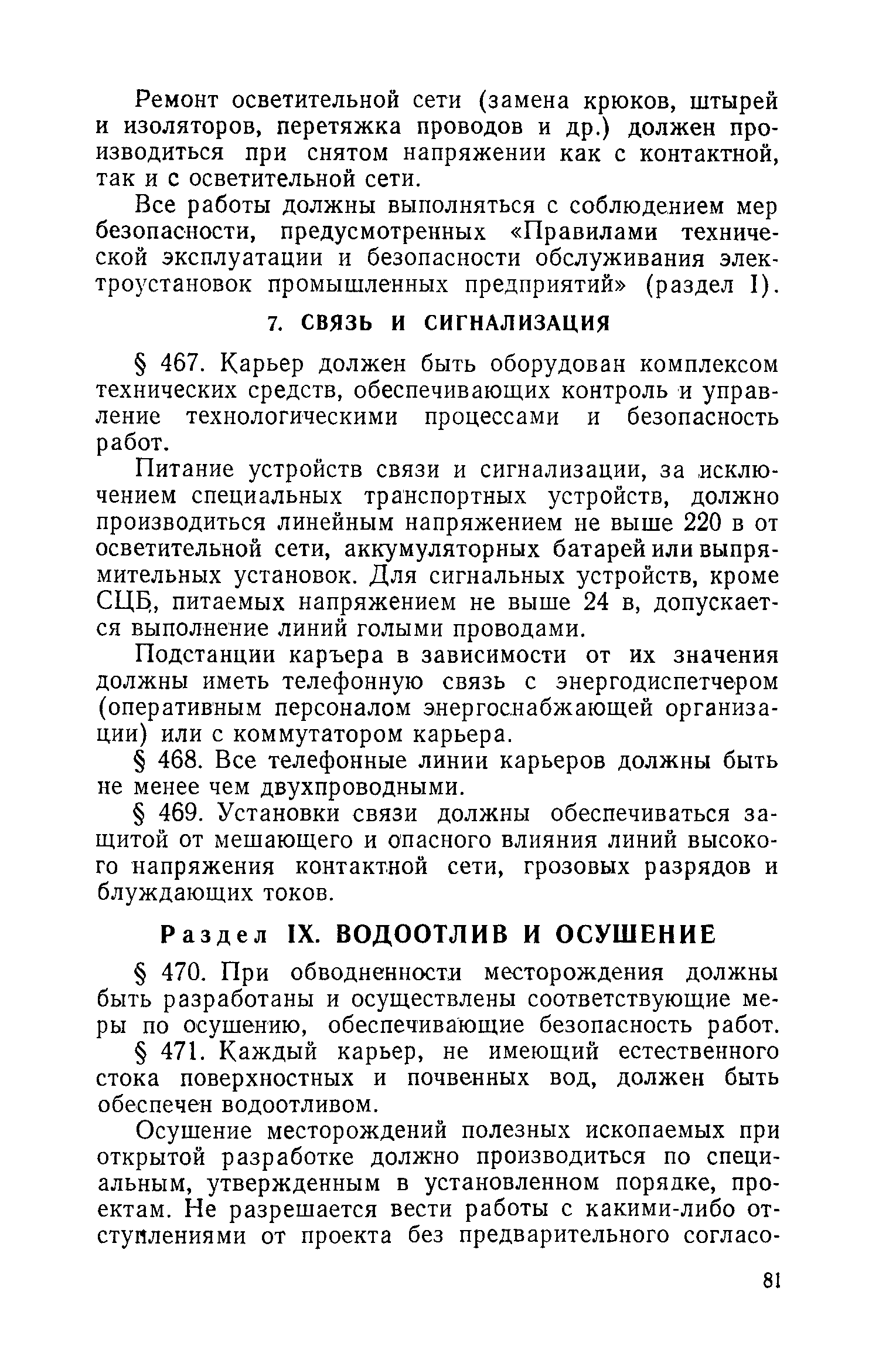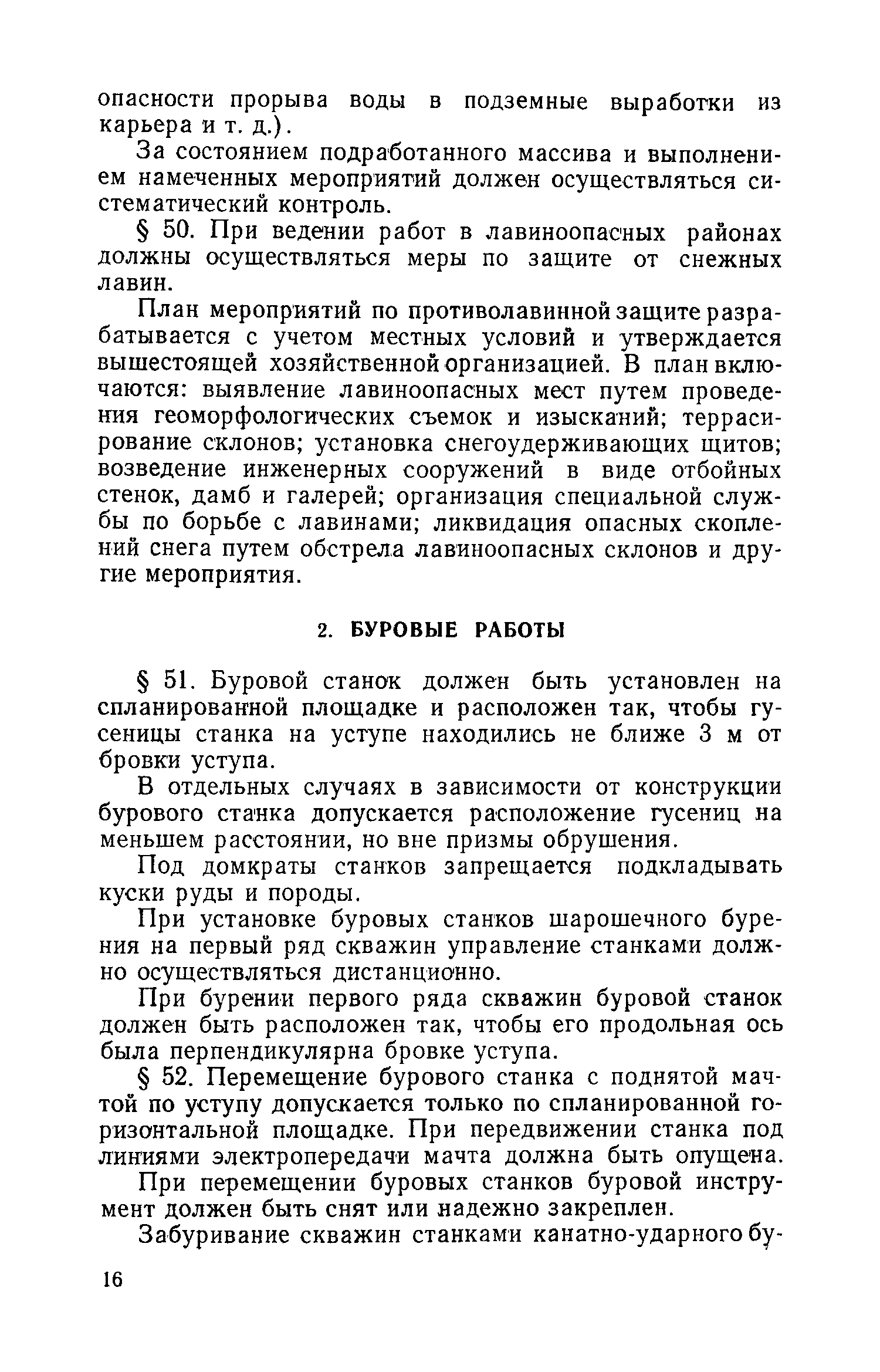 | Оглавление: | Предисловие Раздел I. Общие правила Раздел II. Ведение горных работ 1Горные работы 2 Буровые работы Раздел III. Отвальное хозяйство Раздел I. Механизация горных работ 1Общие положения 2 Одноковшовые экскаваторы 3 Многочерпаковые и роторные экскаваторы 4 Транспортно-отвальные мосты и отвалообразователи 5 Скреперы и бульдозеры 6 Гидромеханизация 7 Оттаивание мерзлого грунта 8 Ремонтные работы Раздел V. Разработка драгами и плавучими земснарядами Раздел VI. Дополнительные правила безопасности 1 Требования безопасности для карьеров по добыче штучного камня и крупных блоков 2 Требования безопасности при добыче поваренной соли в садочных бассейнах и соляных озерах 3 Требования безопасности при работе в тепляках Раздел VII. Транспорт 1 Железнодорожный транспорт 2 Автотракторный транспорт 3 Ленточные конвейеры 4 Грузовые подвесные канатные дороги (ГПКД) Раздел УIII. Электроустановки 1 Общие положения 2 Распределительные устройства и трансформаторные подстанции 3 Заземление 4 Воздушные и кабельные линии электропередач 5 Электрическая тяга 6 Освещение 7 Связь и сигнализация Раздел IХ. Водоотлив и осушение Раздел Х. Общие санитарные правила 1 Борьба с пылью и вредными газами 2 Санитарно-бытовые помещения 3 Медицинская помощь 4 Производственно-бытовые помещения 5 Водоснабжение Раздел ХI. Ответственность за нарушение правил безопасности Приложение 1. Инструкция по составлению планов ликвидации аварий для драг и земснарядов I. Общие положения II. Основные указания по составлению оперативной части плана ликвидации аварий |