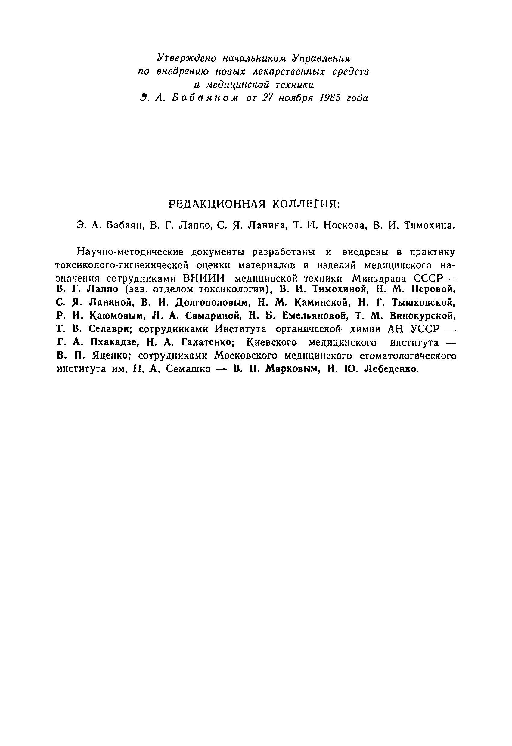 | Утверждён: | 27.11.1985 Начальник Управления по внедрению новых лекарственных средств и медицинской техники |
