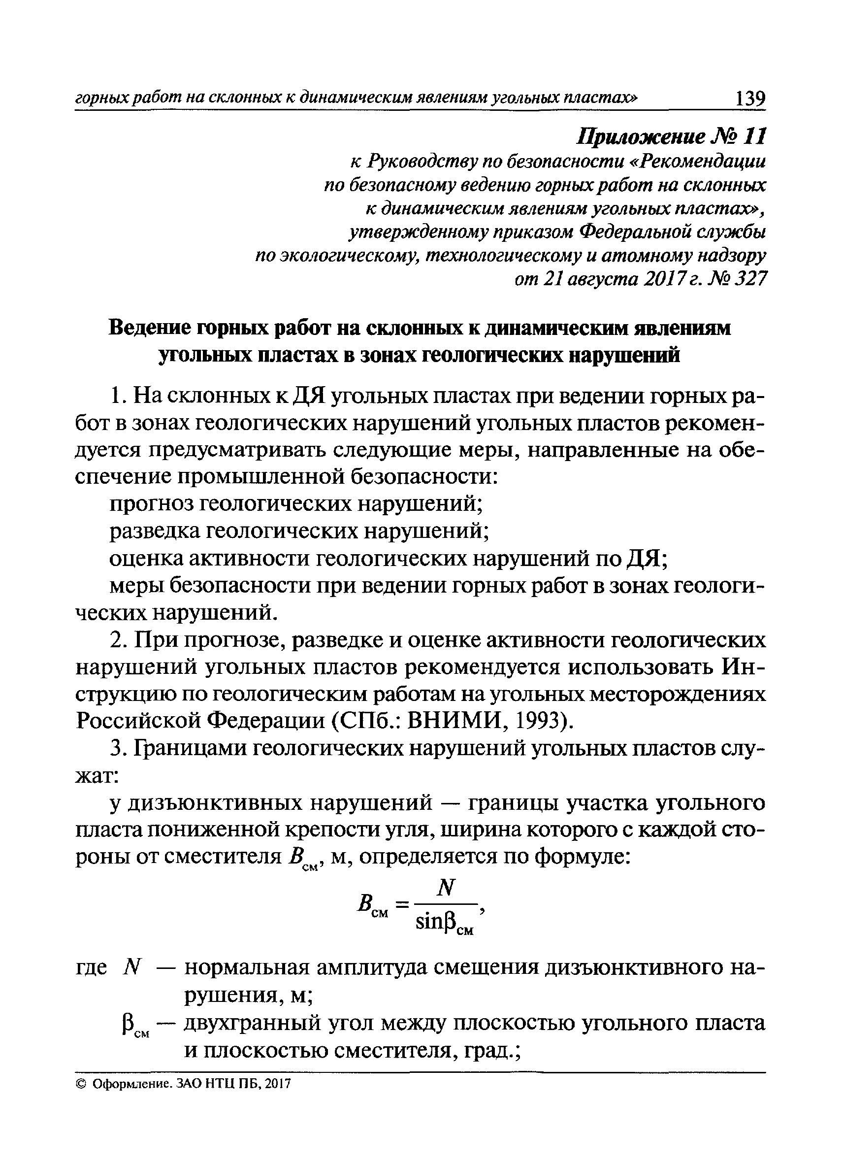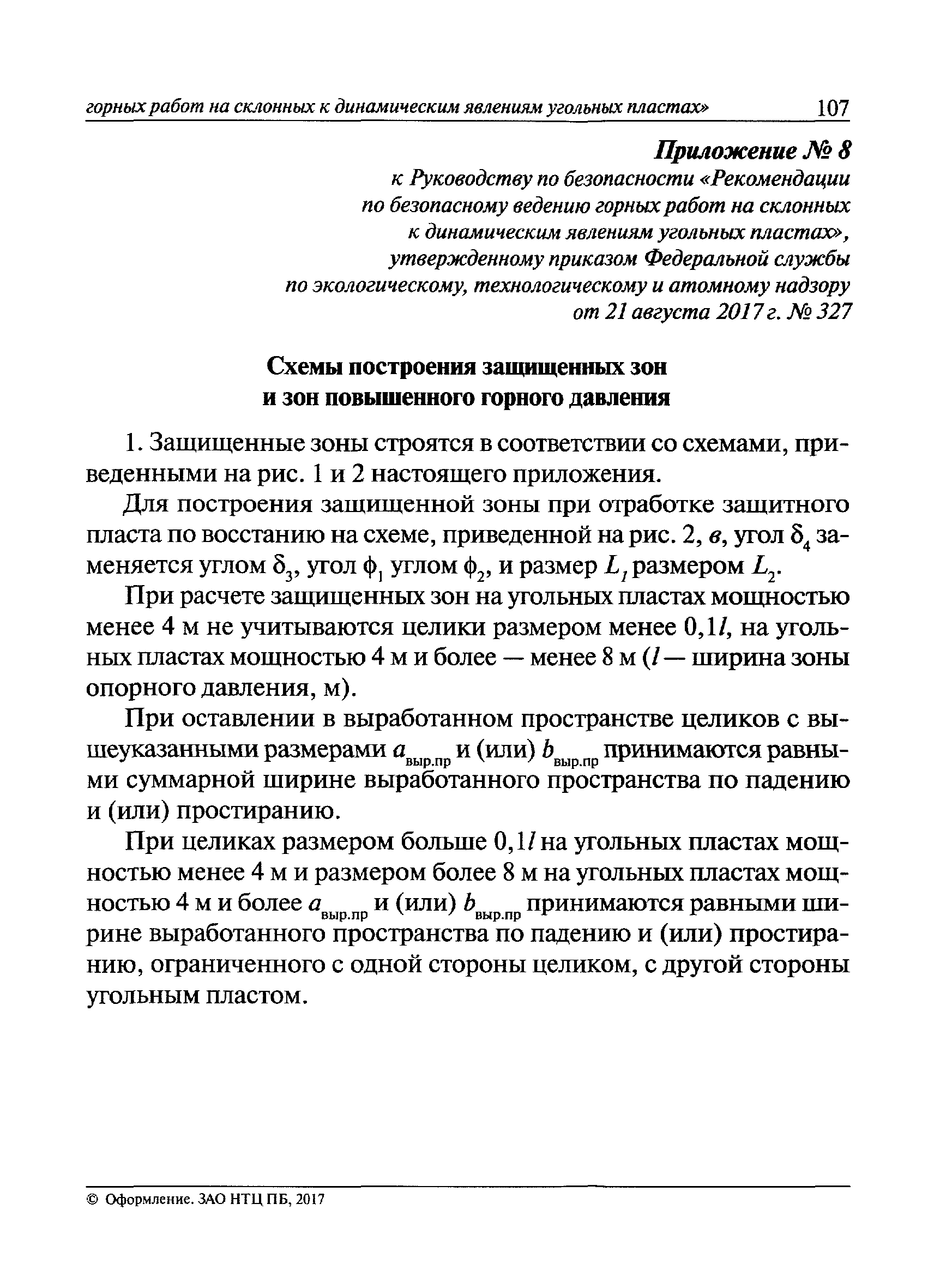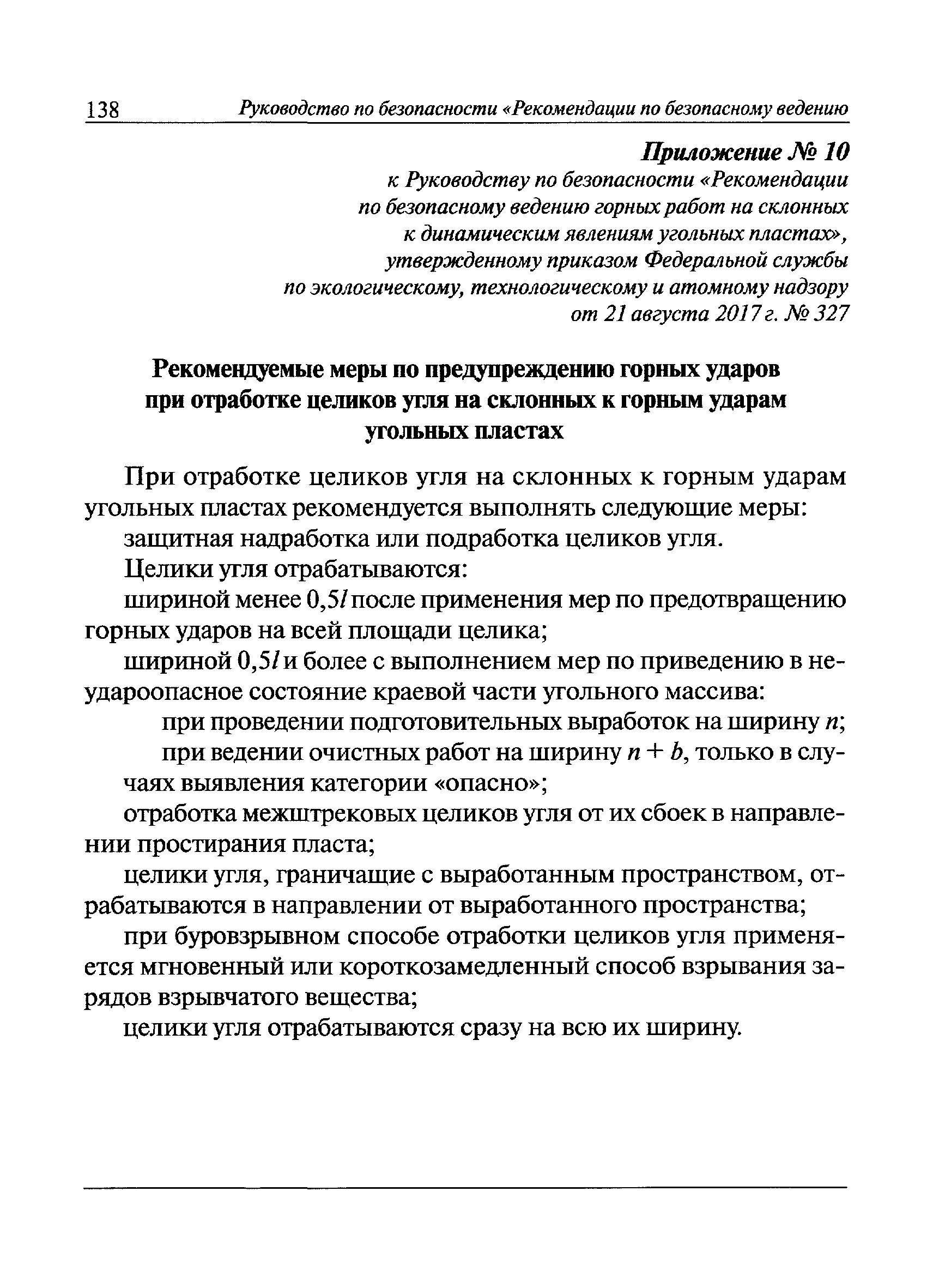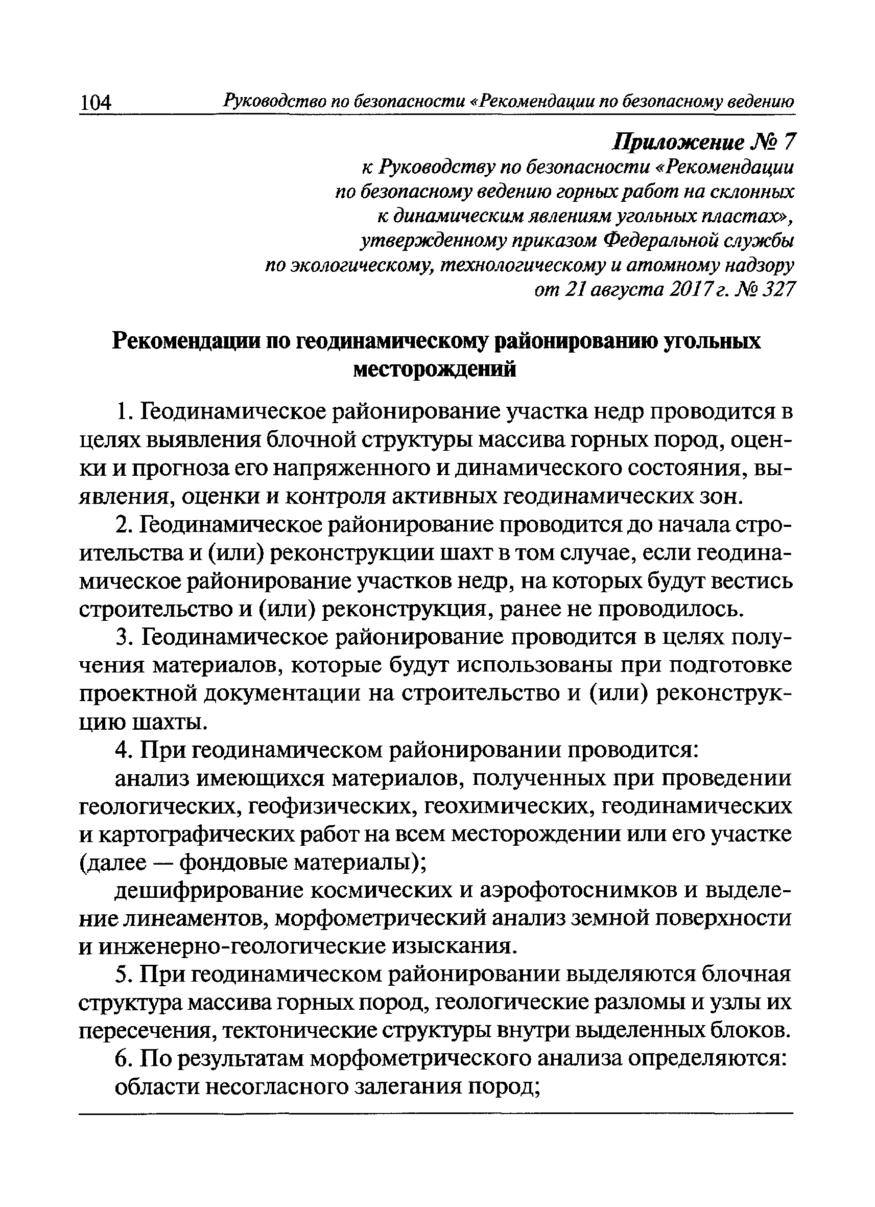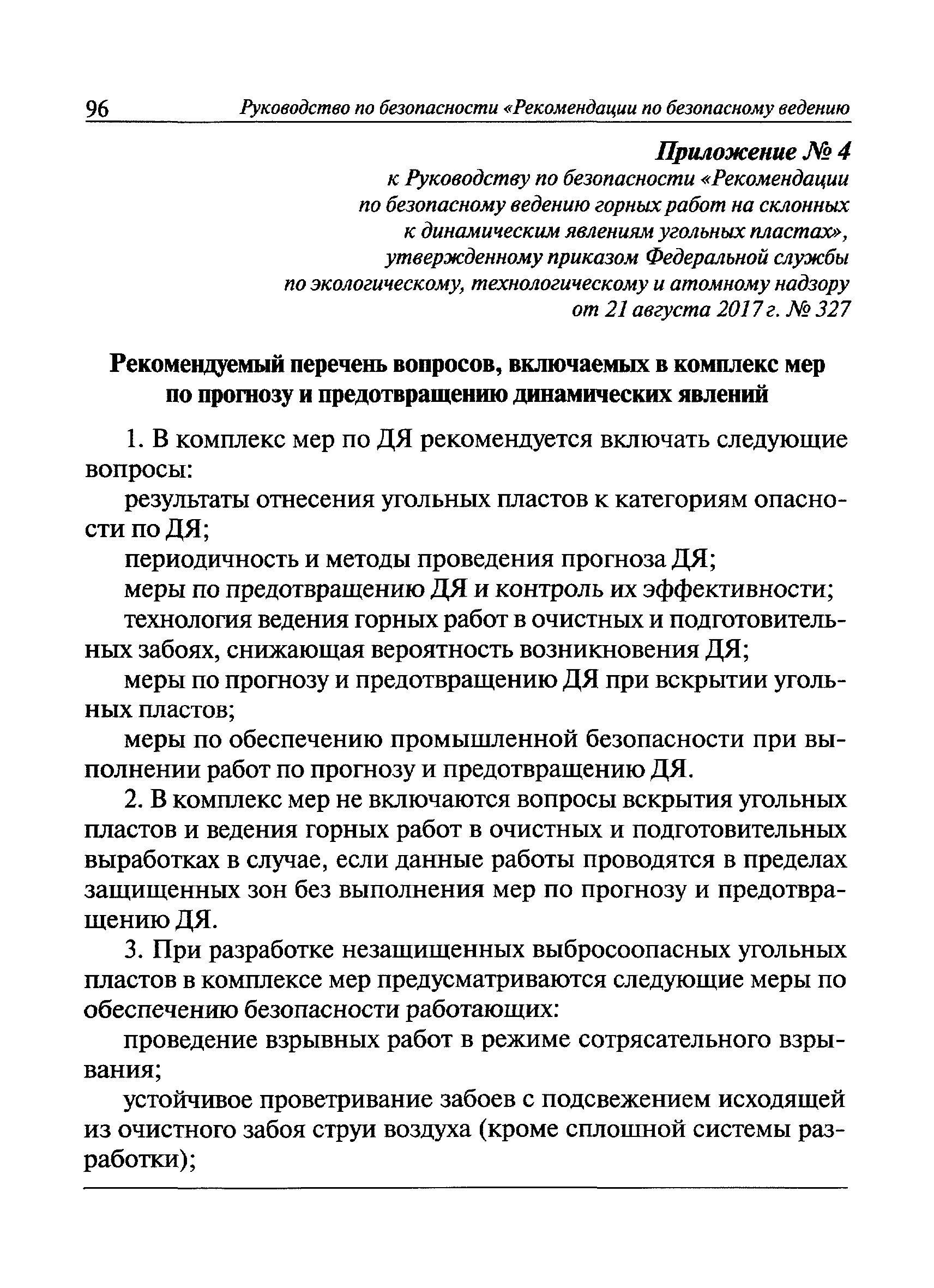 | Оглавление: | Приказ Федеральной службы по экологическому, технологическому и атомному надзору от 21 августа 2017 г. № 327 «Об утверждении Руководства по безопасности «Рекомендации по безопасному ведению горных работ на склонных к динамическим явлениям угольных пластах» Руководство по безопасности «Рекомендации по безопасному ведению горных работ на склонных к динамическим явлениям угольных пластах». I. Общие положения II. Организация работ по предотвращению динамических явлений III. Проектная документация шахт, отрабатывающих склонные к динамическим явлениям угольные пласты IV. Порядок разработки и утверждения комплекса мер по прогнозу и предотвращению динамических явлений V. Ведение горных работ на склонных к динамическим явлениям угольных пластах 1. Вскрытие склонных к динамическим явлениям угольных пластов 1.1. Вскрытие склонных к горным ударам угольных пластов 1.2. Вскрытие склонных к внезапным выбросам угольных пластов (или пропластков мощностью более 0,3 м) 1.3. Меры по предотвращению внезапных выбросов при вскрытии угольных пластов вертикальными стволами 1.3.1. Бурение дренажных скважин 1.3.2. Гидрорыхление угольного пласта 1.3.3. Возведение каркасной крепи 1.4. Меры по предотвращению внезапных выбросов при вскрытии угольных пластов квершлагами и другими полевыми выработками 1.4.1. Бурение дренажных скважин 1.4.2. Гидрорыхление угольного пласта 1.4.3. Увлажнение угольного пласта 1.4.4. Возведение каркасной крепи 2. Порядок отработки свиты угольных пластов 3. Вскрытие и подготовка шахтного поля на склонных к динамическим явлениям угольных пластах 3.1. Вскрытие и подготовка шахтного поля на склонных к горным ударам угольных пластах 3.2. Вскрытие и подготовка шахтного поля на склонных к внезапным выбросам угольных пластах 4. Проведение горных выработок 4.1. Проведение горных выработок на склонных к горным ударам угольных пластах 4.2. Проведение горных выработок на склонных к внезапным выбросам угольных пластах 5. Ведение очистных работ 5.1. Ведение очистных работ на склонных к горным ударам угольных пластах 5.2. Ведение очистных работ на склонных к выбросам угольных пластах 6. Ведение горных работ на склонных к внезапным высыпаниям угольных пластах крутого и крутонаклонного залегания 7. Меры по предотвращению динамических явлений 7.1. Региональные меры по предотвращению динамических явлений 7.1.1. Опережающая отработка защитных угольных пластов 7.1.2. Гидрообработка угольного пласта 7.1.3. Дегазация угольного пласта 7.2. Локальные меры по предотвращению динамических явлений 7.2.1. Бурение разгрузочных скважин 7.2.2. Меры по предотвращению динамических явлений при проведении подготовительных выработок в зонах повышенного горного давления по пласту Тройному Воркутского месторождения 7.2.3. Параметры разгрузочных скважин, в процессе бурения которых проводятся прогноз удароопасности и (или) выбросоопасности и оценка эффективности мер по предотвращению динамических явлений по параметрам искусственного акустического сигнала 7.2.4. Гидрообработка угольного пласта 7.2.5. Камуфлетное взрывание 7.3. Рекомендуемые ограничения по совмещению технологических процессов и мер по предотвращению внезапных выбросов VI. Мониторинг массива горных пород по геофизическим наблюдениям 1. Мониторинг массива горных пород по непрерывным сейсмическим наблюдениям 2. Мони