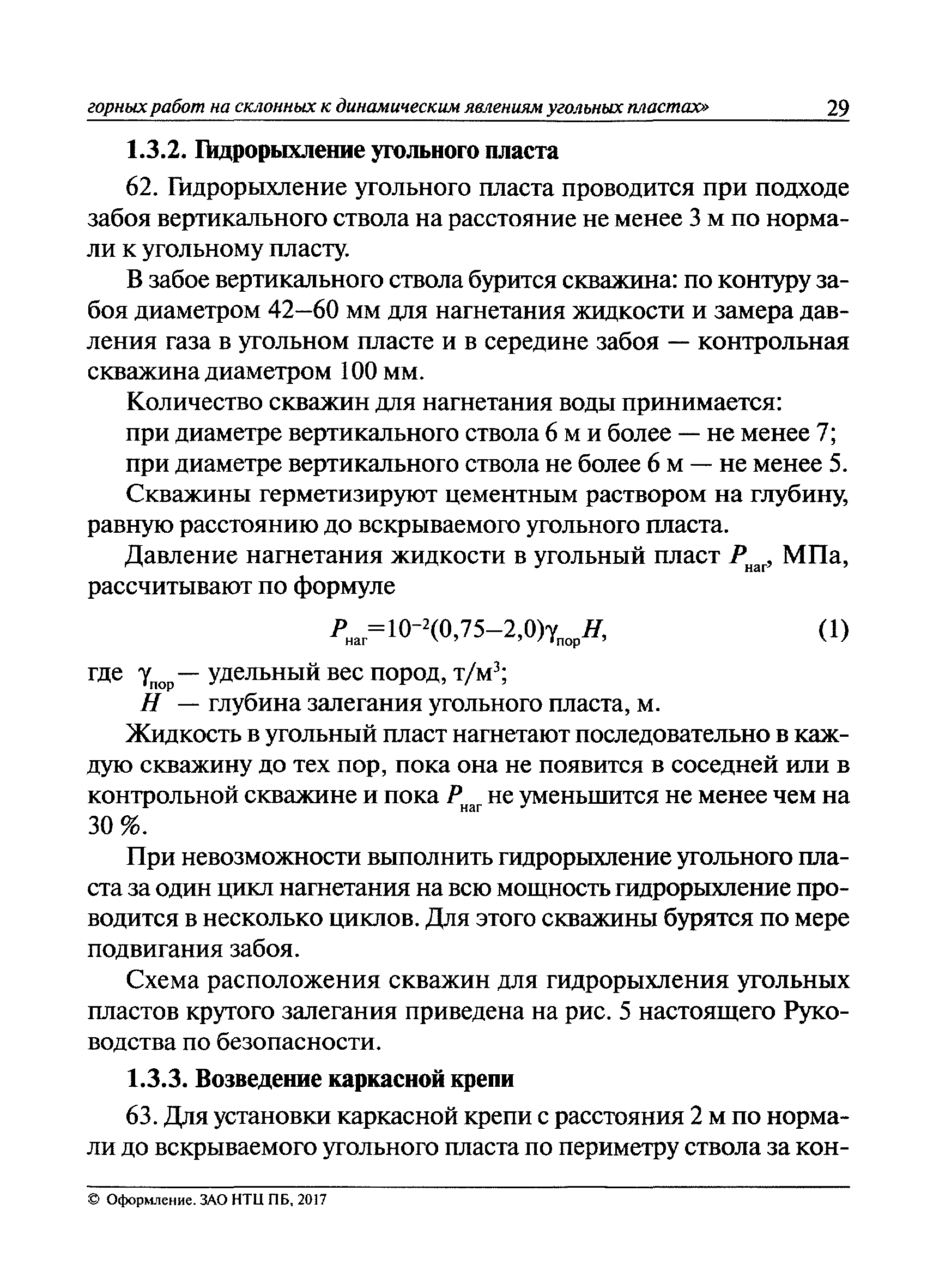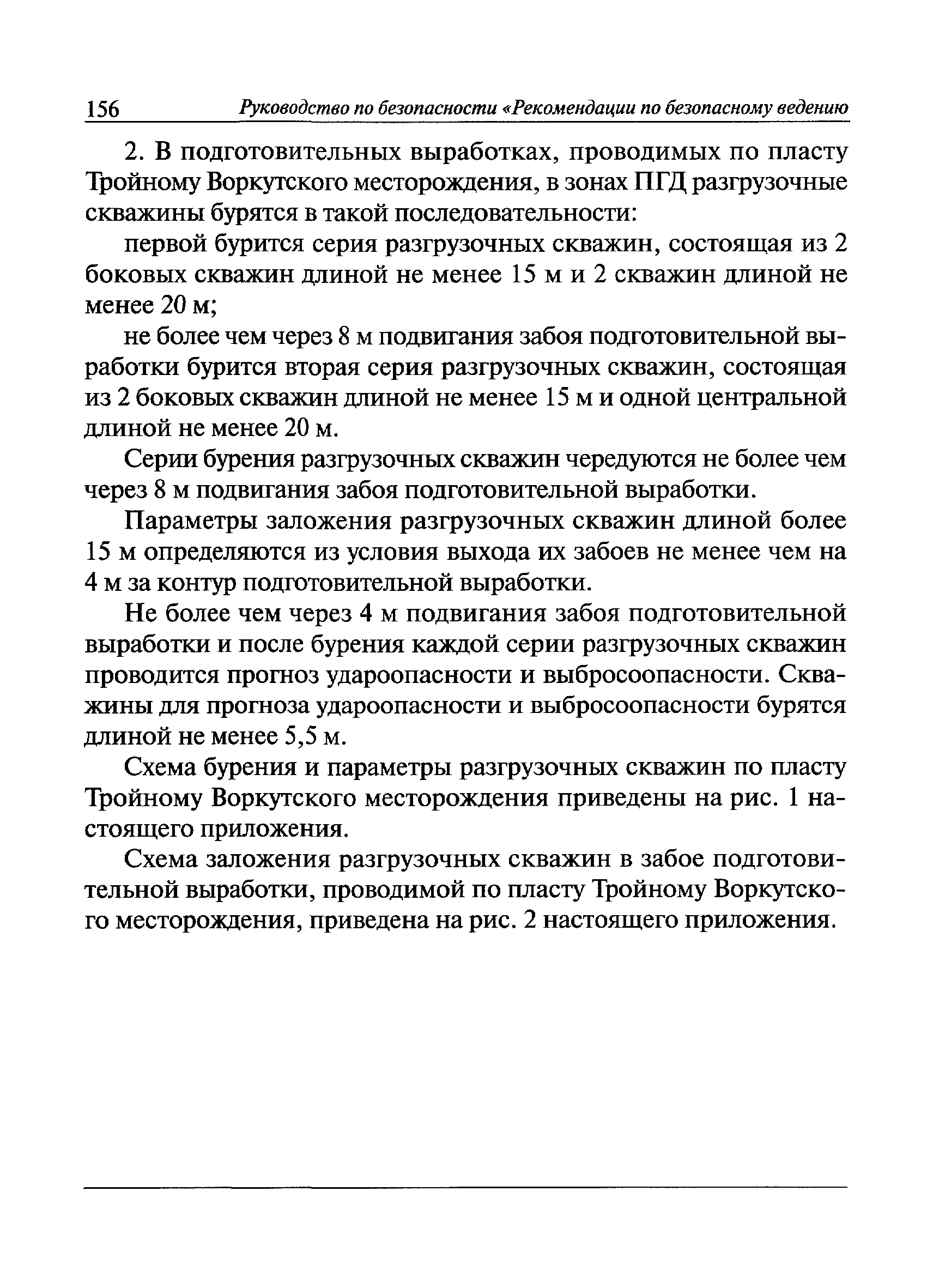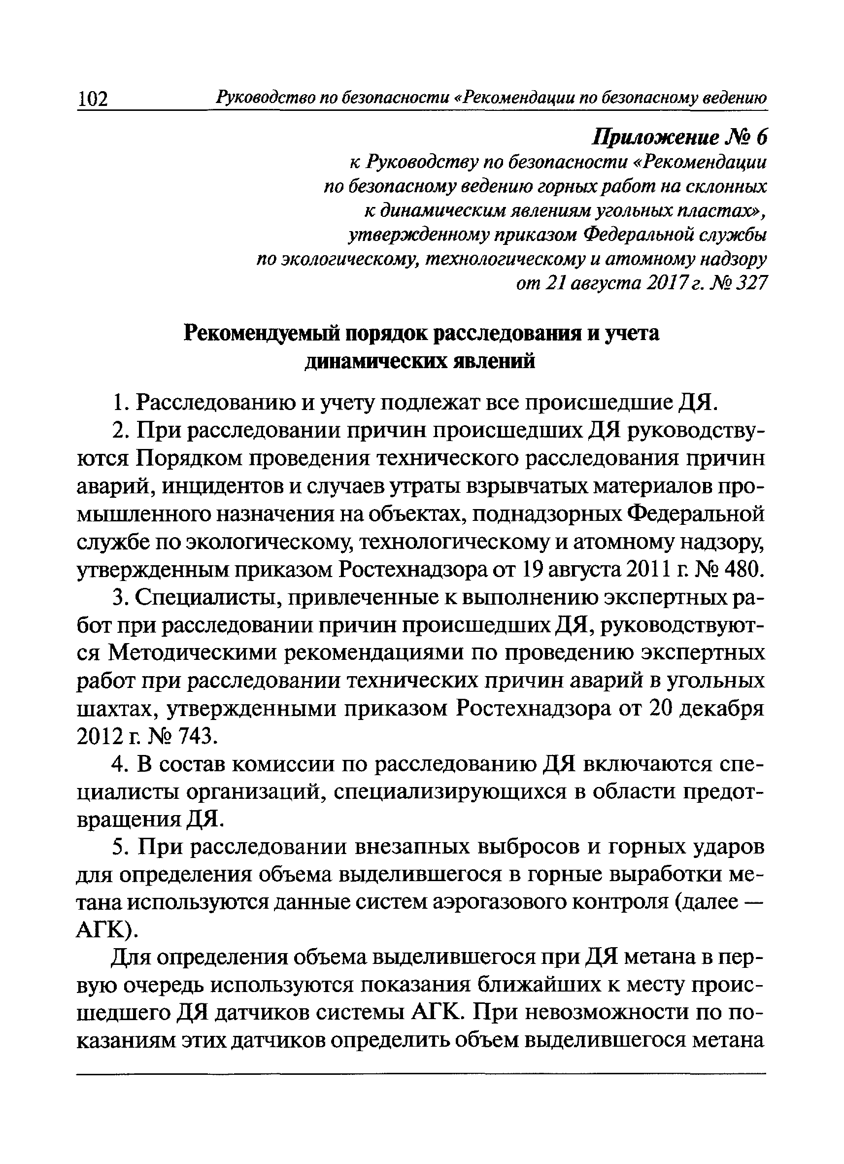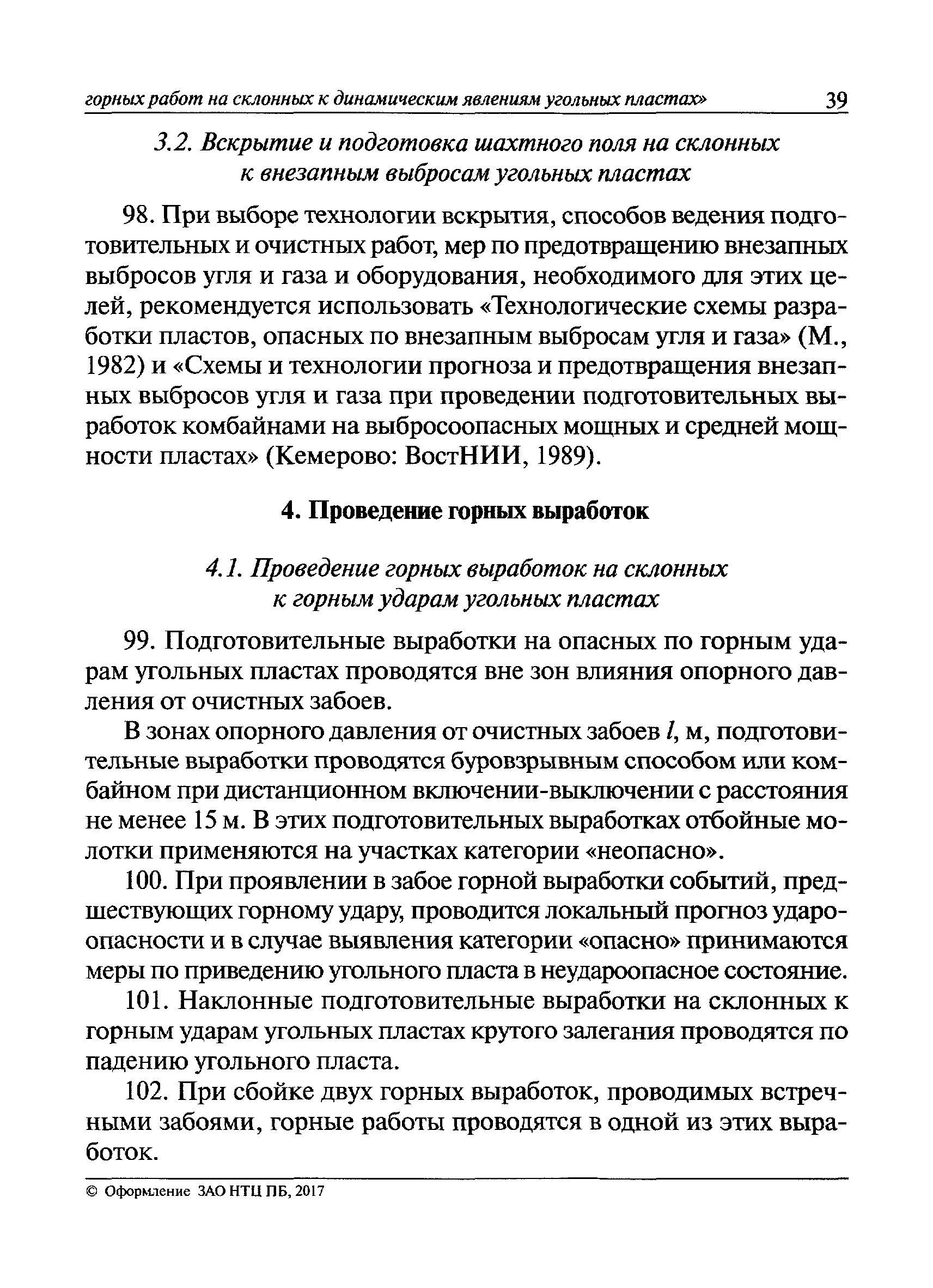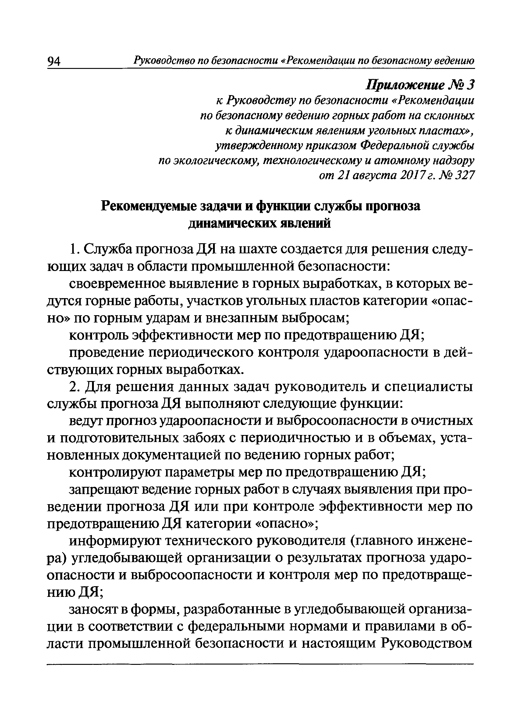 | Оглавление: | Приказ Федеральной службы по экологическому, технологическому и атомному надзору от 21 августа 2017 г. № 327 «Об утверждении Руководства по безопасности «Рекомендации по безопасному ведению горных работ на склонных к динамическим явлениям угольных пластах» Руководство по безопасности «Рекомендации по безопасному ведению горных работ на склонных к динамическим явлениям угольных пластах». I. Общие положения II. Организация работ по предотвращению динамических явлений III. Проектная документация шахт, отрабатывающих склонные к динамическим явлениям угольные пласты IV. Порядок разработки и утверждения комплекса мер по прогнозу и предотвращению динамических явлений V. Ведение горных работ на склонных к динамическим явлениям угольных пластах 1. Вскрытие склонных к динамическим явлениям угольных пластов 1.1. Вскрытие склонных к горным ударам угольных пластов 1.2. Вскрытие склонных к внезапным выбросам угольных пластов (или пропластков мощностью более 0,3 м) 1.3. Меры по предотвращению внезапных выбросов при вскрытии угольных пластов вертикальными стволами 1.3.1. Бурение дренажных скважин 1.3.2. Гидрорыхление угольного пласта 1.3.3. Возведение каркасной крепи 1.4. Меры по предотвращению внезапных выбросов при вскрытии угольных пластов квершлагами и другими полевыми выработками 1.4.1. Бурение дренажных скважин 1.4.2. Гидрорыхление угольного пласта 1.4.3. Увлажнение угольного пласта 1.4.4. Возведение каркасной крепи 2. Порядок отработки свиты угольных пластов 3. Вскрытие и подготовка шахтного поля на склонных к динамическим явлениям угольных пластах 3.1. Вскрытие и подготовка шахтного поля на склонных к горным ударам угольных пластах 3.2. Вскрытие и подготовка шахтного поля на склонных к внезапным выбросам угольных пластах 4. Проведение горных выработок 4.1. Проведение горных выработок на склонных к горным ударам угольных пластах 4.2. Проведение горных выработок на склонных к внезапным выбросам угольных пластах 5. Ведение очистных работ 5.1. Ведение очистных работ на склонных к горным ударам угольных пластах 5.2. Ведение очистных работ на склонных к выбросам угольных пластах 6. Ведение горных работ на склонных к внезапным высыпаниям угольных пластах крутого и крутонаклонного залегания 7. Меры по предотвращению динамических явлений 7.1. Региональные меры по предотвращению динамических явлений 7.1.1. Опережающая отработка защитных угольных пластов 7.1.2. Гидрообработка угольного пласта 7.1.3. Дегазация угольного пласта 7.2. Локальные меры по предотвращению динамических явлений 7.2.1. Бурение разгрузочных скважин 7.2.2. Меры по предотвращению динамических явлений при проведении подготовительных выработок в зонах повышенного горного давления по пласту Тройному Воркутского месторождения 7.2.3. Параметры разгрузочных скважин, в процессе бурения которых проводятся прогноз удароопасности и (или) выбросоопасности и оценка эффективности мер по предотвращению динамических явлений по параметрам искусственного акустического сигнала 7.2.4. Гидрообработка угольного пласта 7.2.5. Камуфлетное взрывание 7.3. Рекомендуемые ограничения по совмещению технологических процессов и мер по предотвращению внезапных выбросов VI. Мониторинг массива горных пород по геофизическим наблюдениям 1. Мониторинг массива горных пород по непрерывным сейсмическим наблюдениям 2. Мони
