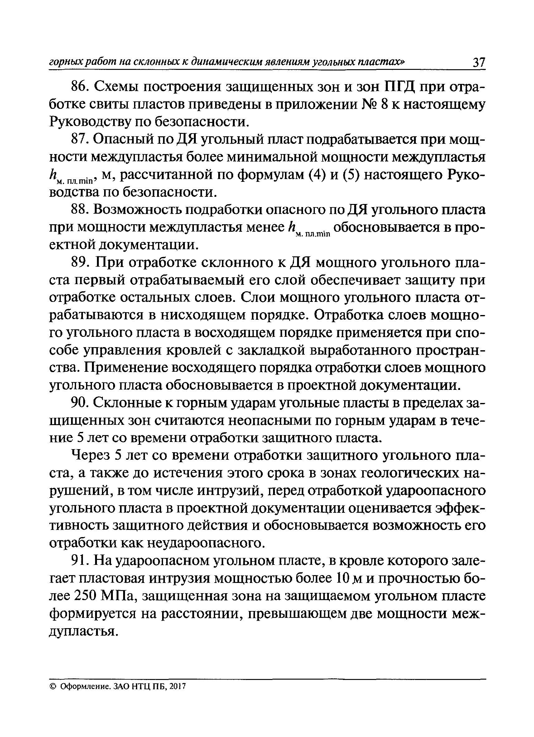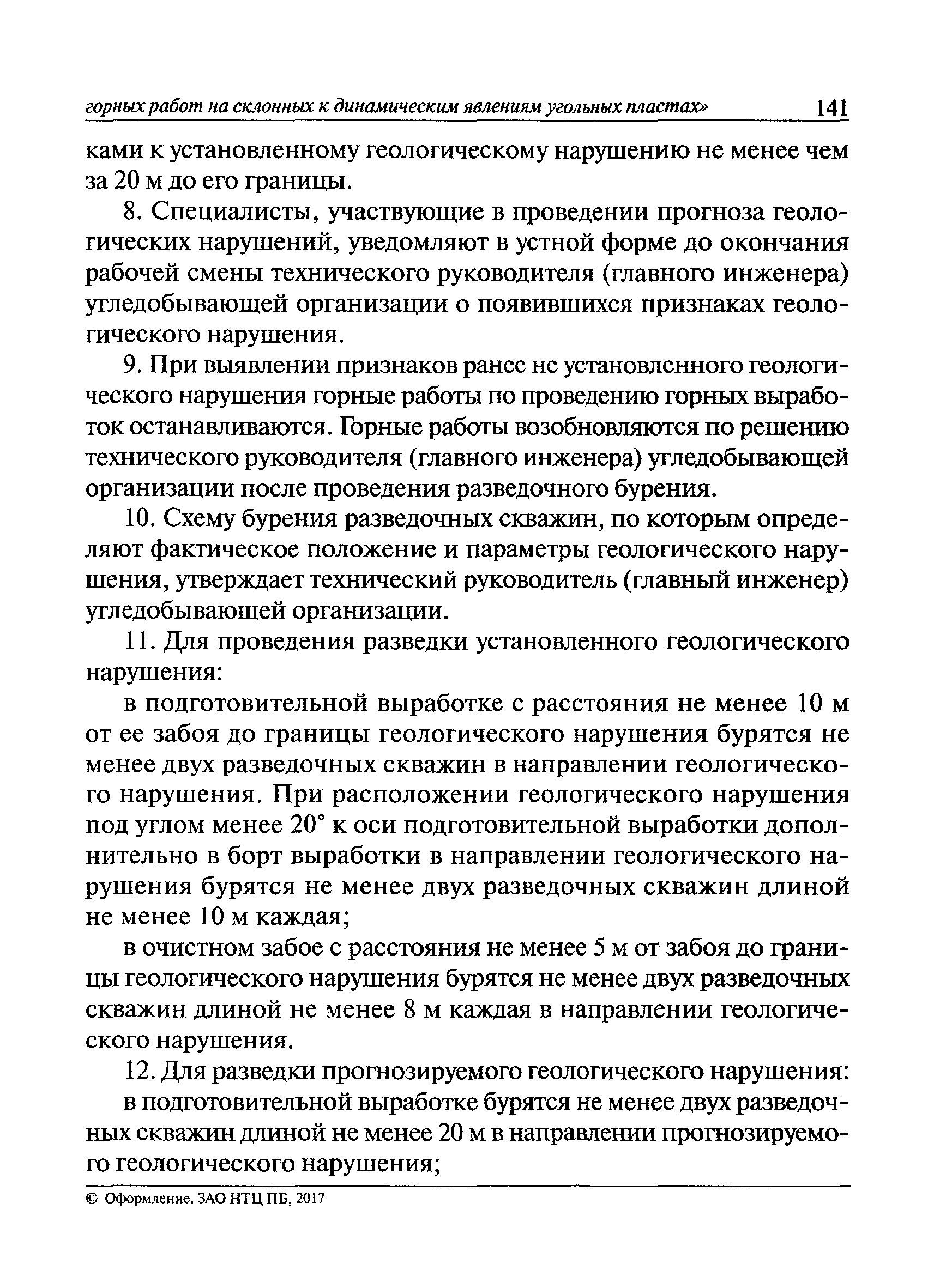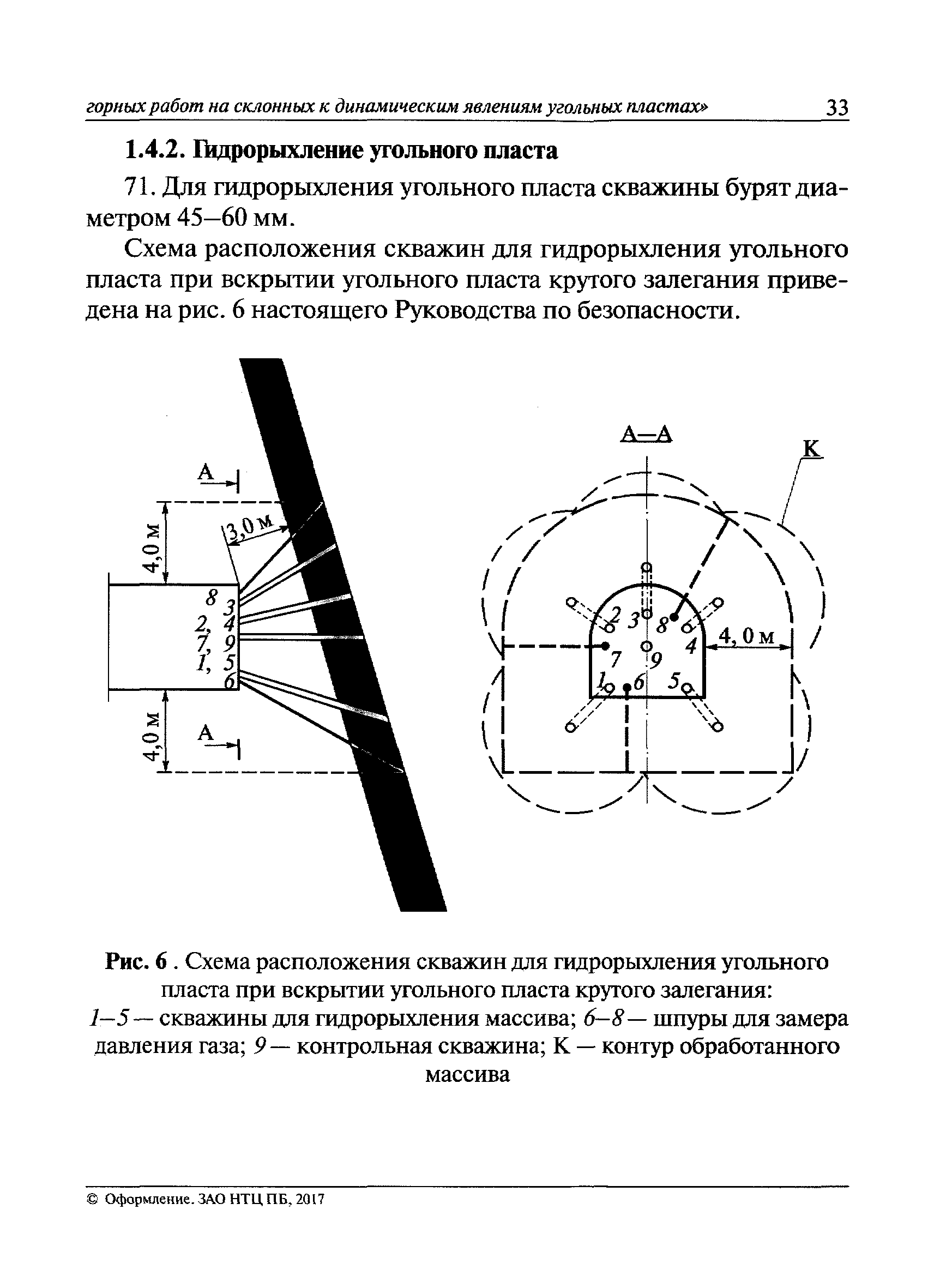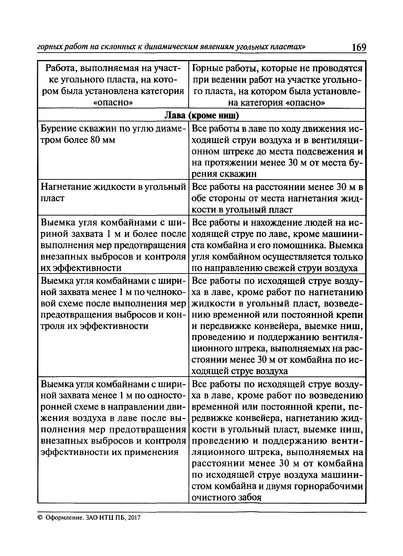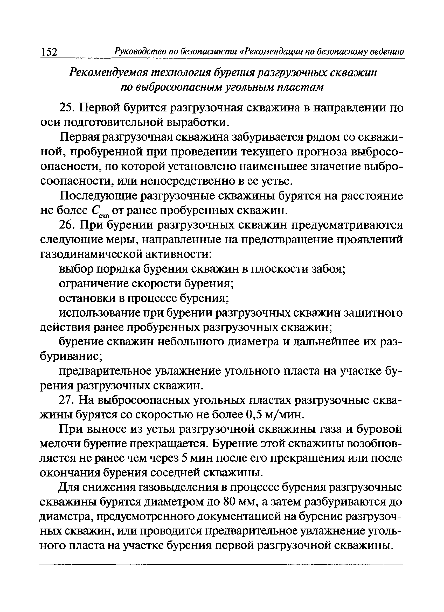 | Оглавление: | Приказ Федеральной службы по экологическому, технологическому и атомному надзору от 21 августа 2017 г. № 327 «Об утверждении Руководства по безопасности «Рекомендации по безопасному ведению горных работ на склонных к динамическим явлениям угольных пластах» Руководство по безопасности «Рекомендации по безопасному ведению горных работ на склонных к динамическим явлениям угольных пластах». I. Общие положения II. Организация работ по предотвращению динамических явлений III. Проектная документация шахт, отрабатывающих склонные к динамическим явлениям угольные пласты IV. Порядок разработки и утверждения комплекса мер по прогнозу и предотвращению динамических явлений V. Ведение горных работ на склонных к динамическим явлениям угольных пластах 1. Вскрытие склонных к динамическим явлениям угольных пластов 1.1. Вскрытие склонных к горным ударам угольных пластов 1.2. Вскрытие склонных к внезапным выбросам угольных пластов (или пропластков мощностью более 0,3 м) 1.3. Меры по предотвращению внезапных выбросов при вскрытии угольных пластов вертикальными стволами 1.3.1. Бурение дренажных скважин 1.3.2. Гидрорыхление угольного пласта 1.3.3. Возведение каркасной крепи 1.4. Меры по предотвращению внезапных выбросов при вскрытии угольных пластов квершлагами и другими полевыми выработками 1.4.1. Бурение дренажных скважин 1.4.2. Гидрорыхление угольного пласта 1.4.3. Увлажнение угольного пласта 1.4.4. Возведение каркасной крепи 2. Порядок отработки свиты угольных пластов 3. Вскрытие и подготовка шахтного поля на склонных к динамическим явлениям угольных пластах 3.1. Вскрытие и подготовка шахтного поля на склонных к горным ударам угольных пластах 3.2. Вскрытие и подготовка шахтного поля на склонных к внезапным выбросам угольных пластах 4. Проведение горных выработок 4.1. Проведение горных выработок на склонных к горным ударам угольных пластах 4.2. Проведение горных выработок на склонных к внезапным выбросам угольных пластах 5. Ведение очистных работ 5.1. Ведение очистных работ на склонных к горным ударам угольных пластах 5.2. Ведение очистных работ на склонных к выбросам угольных пластах 6. Ведение горных работ на склонных к внезапным высыпаниям угольных пластах крутого и крутонаклонного залегания 7. Меры по предотвращению динамических явлений 7.1. Региональные меры по предотвращению динамических явлений 7.1.1. Опережающая отработка защитных угольных пластов 7.1.2. Гидрообработка угольного пласта 7.1.3. Дегазация угольного пласта 7.2. Локальные меры по предотвращению динамических явлений 7.2.1. Бурение разгрузочных скважин 7.2.2. Меры по предотвращению динамических явлений при проведении подготовительных выработок в зонах повышенного горного давления по пласту Тройному Воркутского месторождения 7.2.3. Параметры разгрузочных скважин, в процессе бурения которых проводятся прогноз удароопасности и (или) выбросоопасности и оценка эффективности мер по предотвращению динамических явлений по параметрам искусственного акустического сигнала 7.2.4. Гидрообработка угольного пласта 7.2.5. Камуфлетное взрывание 7.3. Рекомендуемые ограничения по совмещению технологических процессов и мер по предотвращению внезапных выбросов VI. Мониторинг массива горных пород по геофизическим наблюдениям 1. Мониторинг массива горных пород по непрерывным сейсмическим наблюдениям 2. Мони