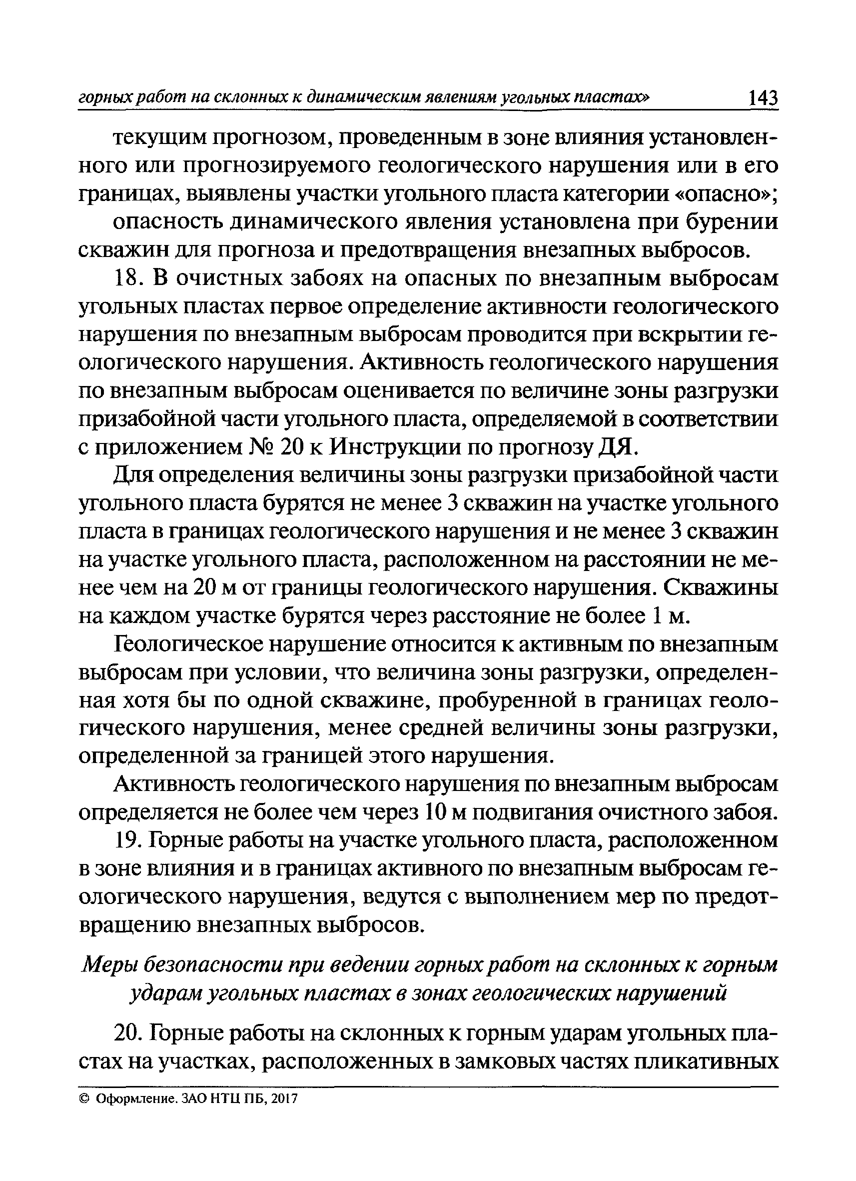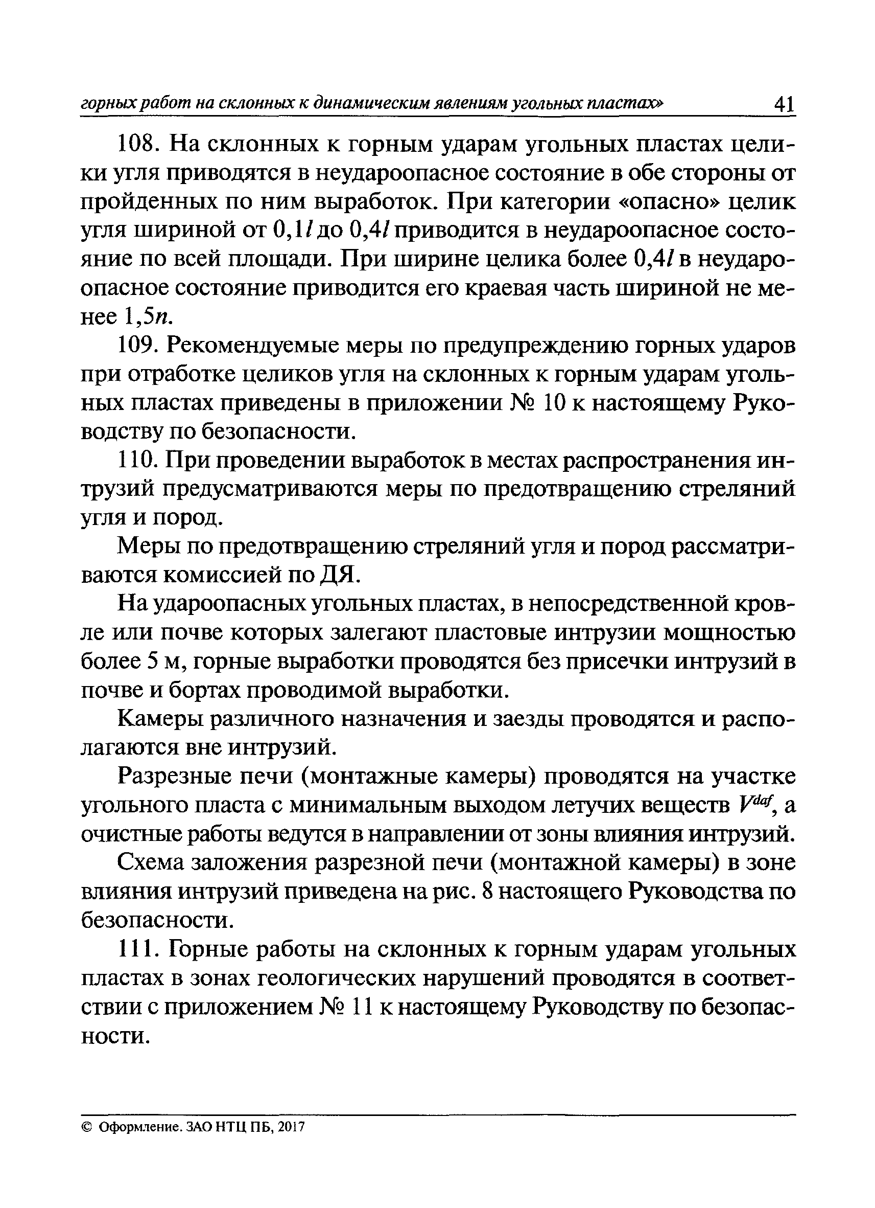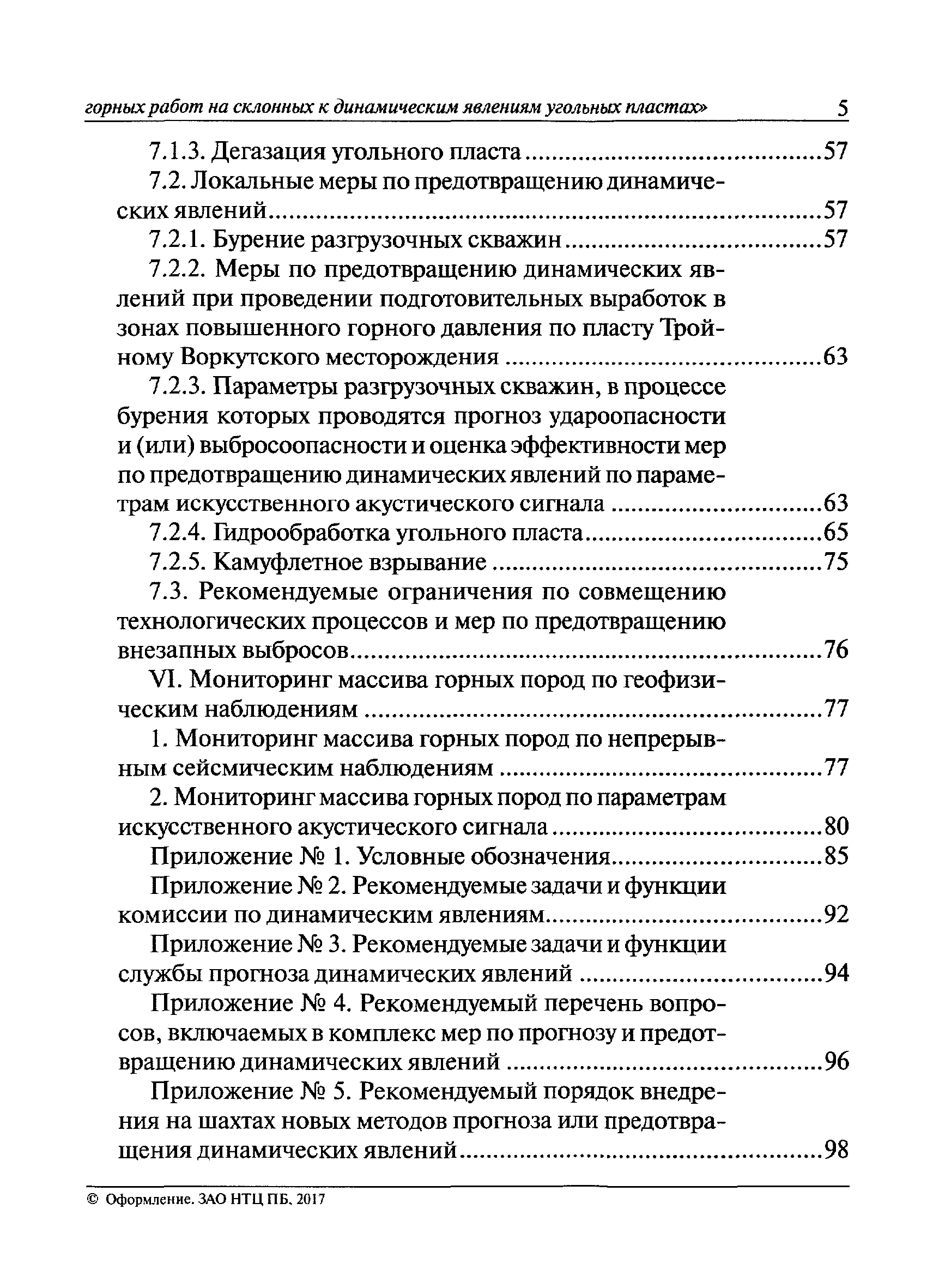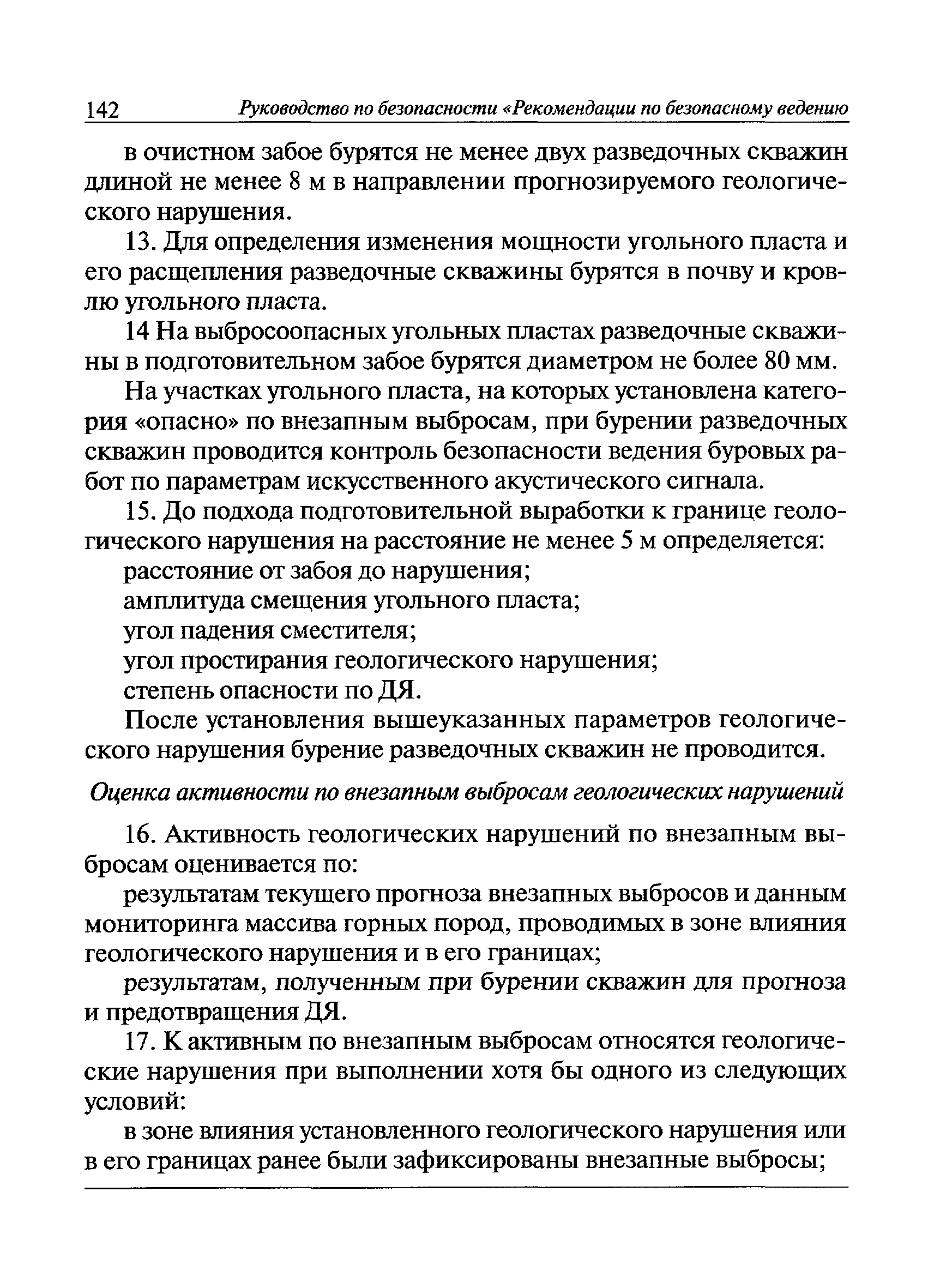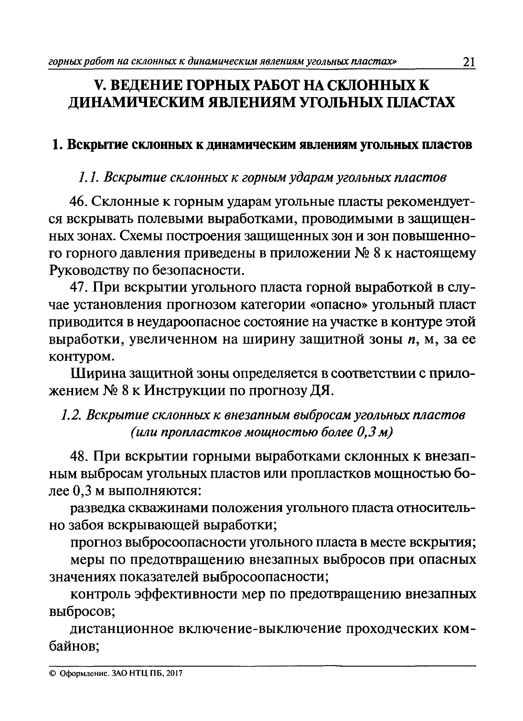 | Оглавление: | Приказ Федеральной службы по экологическому, технологическому и атомному надзору от 21 августа 2017 г. № 327 «Об утверждении Руководства по безопасности «Рекомендации по безопасному ведению горных работ на склонных к динамическим явлениям угольных пластах» Руководство по безопасности «Рекомендации по безопасному ведению горных работ на склонных к динамическим явлениям угольных пластах». I. Общие положения II. Организация работ по предотвращению динамических явлений III. Проектная документация шахт, отрабатывающих склонные к динамическим явлениям угольные пласты IV. Порядок разработки и утверждения комплекса мер по прогнозу и предотвращению динамических явлений V. Ведение горных работ на склонных к динамическим явлениям угольных пластах 1. Вскрытие склонных к динамическим явлениям угольных пластов 1.1. Вскрытие склонных к горным ударам угольных пластов 1.2. Вскрытие склонных к внезапным выбросам угольных пластов (или пропластков мощностью более 0,3 м) 1.3. Меры по предотвращению внезапных выбросов при вскрытии угольных пластов вертикальными стволами 1.3.1. Бурение дренажных скважин 1.3.2. Гидрорыхление угольного пласта 1.3.3. Возведение каркасной крепи 1.4. Меры по предотвращению внезапных выбросов при вскрытии угольных пластов квершлагами и другими полевыми выработками 1.4.1. Бурение дренажных скважин 1.4.2. Гидрорыхление угольного пласта 1.4.3. Увлажнение угольного пласта 1.4.4. Возведение каркасной крепи 2. Порядок отработки свиты угольных пластов 3. Вскрытие и подготовка шахтного поля на склонных к динамическим явлениям угольных пластах 3.1. Вскрытие и подготовка шахтного поля на склонных к горным ударам угольных пластах 3.2. Вскрытие и подготовка шахтного поля на склонных к внезапным выбросам угольных пластах 4. Проведение горных выработок 4.1. Проведение горных выработок на склонных к горным ударам угольных пластах 4.2. Проведение горных выработок на склонных к внезапным выбросам угольных пластах 5. Ведение очистных работ 5.1. Ведение очистных работ на склонных к горным ударам угольных пластах 5.2. Ведение очистных работ на склонных к выбросам угольных пластах 6. Ведение горных работ на склонных к внезапным высыпаниям угольных пластах крутого и крутонаклонного залегания 7. Меры по предотвращению динамических явлений 7.1. Региональные меры по предотвращению динамических явлений 7.1.1. Опережающая отработка защитных угольных пластов 7.1.2. Гидрообработка угольного пласта 7.1.3. Дегазация угольного пласта 7.2. Локальные меры по предотвращению динамических явлений 7.2.1. Бурение разгрузочных скважин 7.2.2. Меры по предотвращению динамических явлений при проведении подготовительных выработок в зонах повышенного горного давления по пласту Тройному Воркутского месторождения 7.2.3. Параметры разгрузочных скважин, в процессе бурения которых проводятся прогноз удароопасности и (или) выбросоопасности и оценка эффективности мер по предотвращению динамических явлений по параметрам искусственного акустического сигнала 7.2.4. Гидрообработка угольного пласта 7.2.5. Камуфлетное взрывание 7.3. Рекомендуемые ограничения по совмещению технологических процессов и мер по предотвращению внезапных выбросов VI. Мониторинг массива горных пород по геофизическим наблюдениям 1. Мониторинг массива горных пород по непрерывным сейсмическим наблюдениям 2. Мони