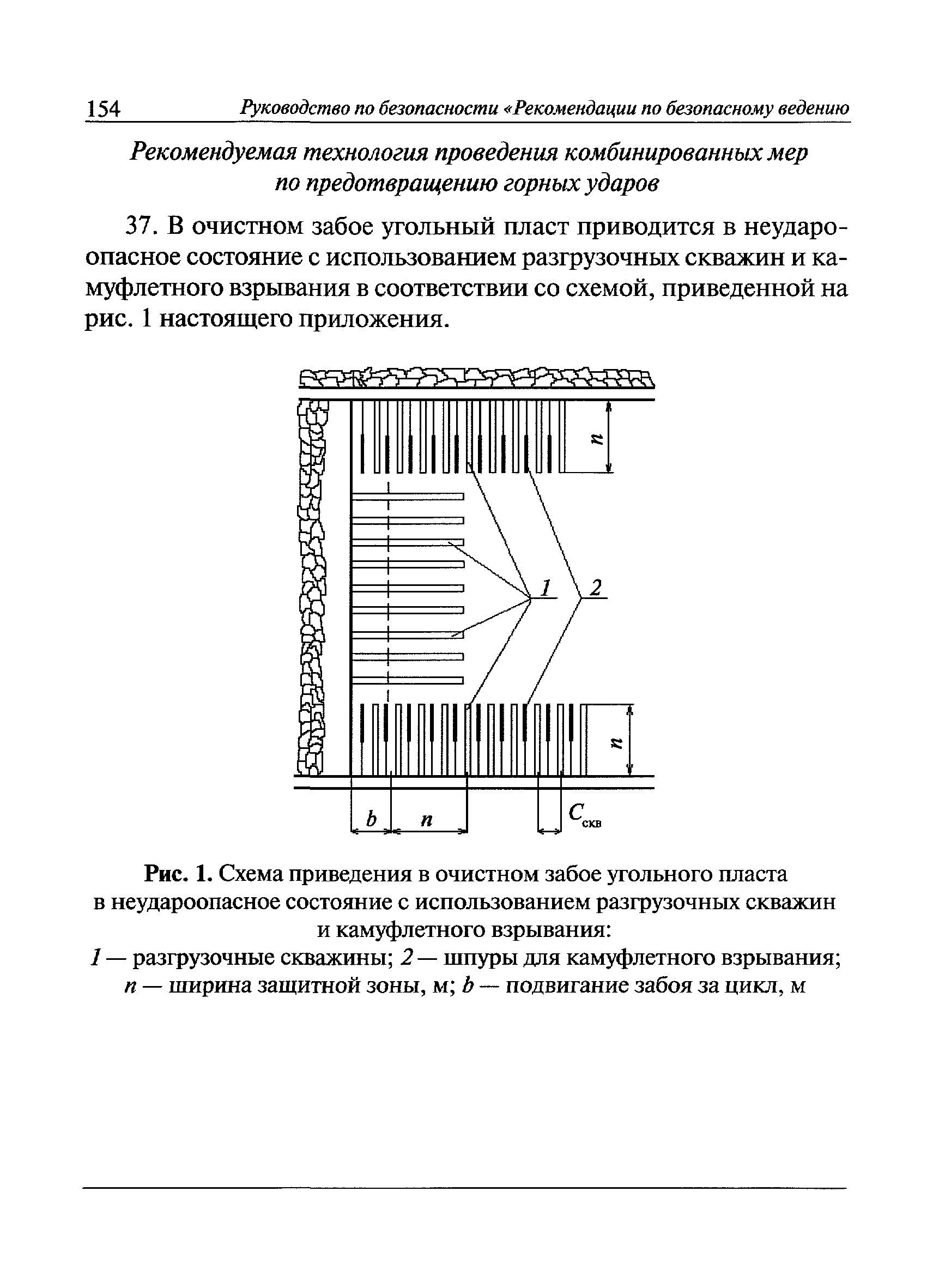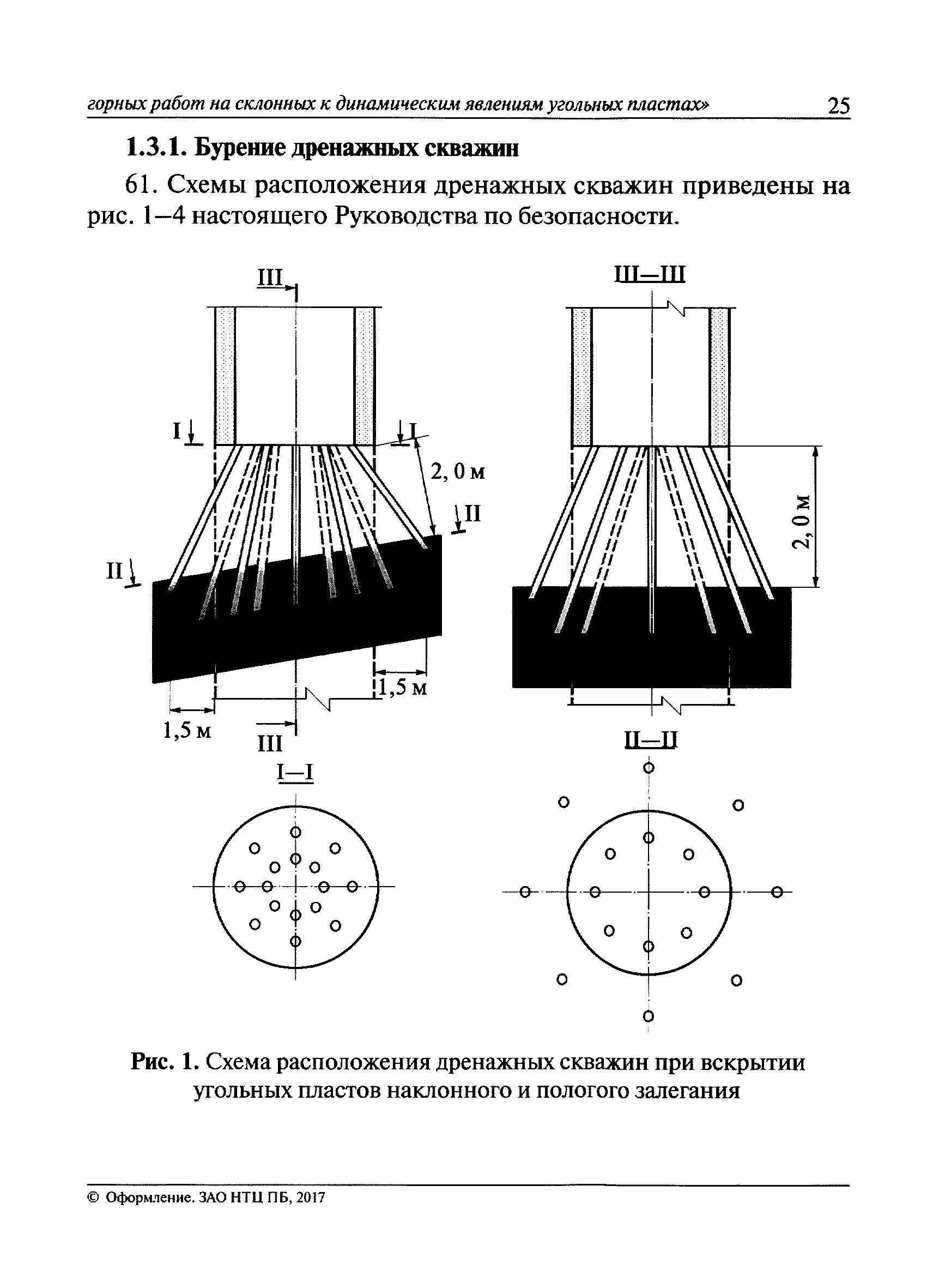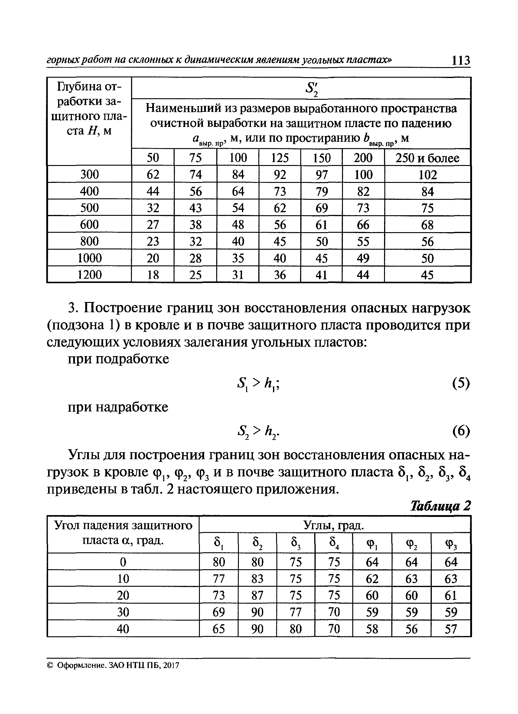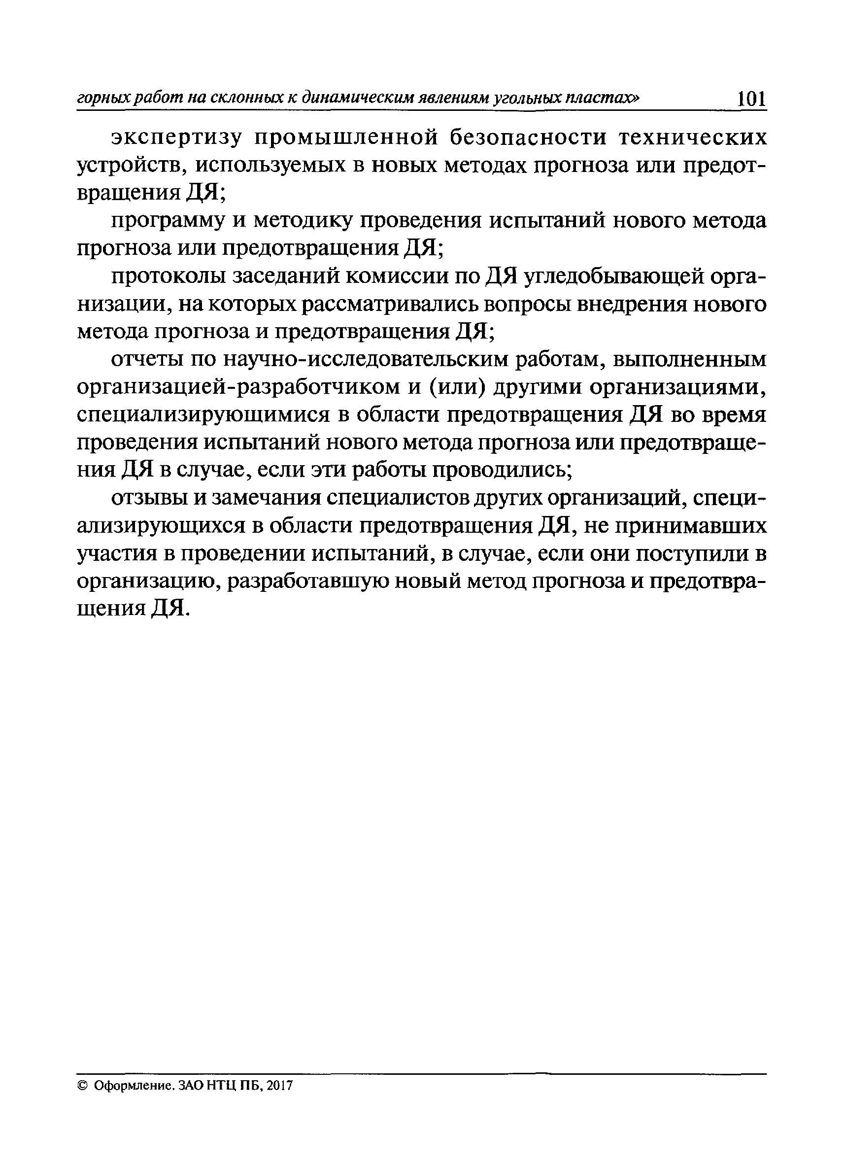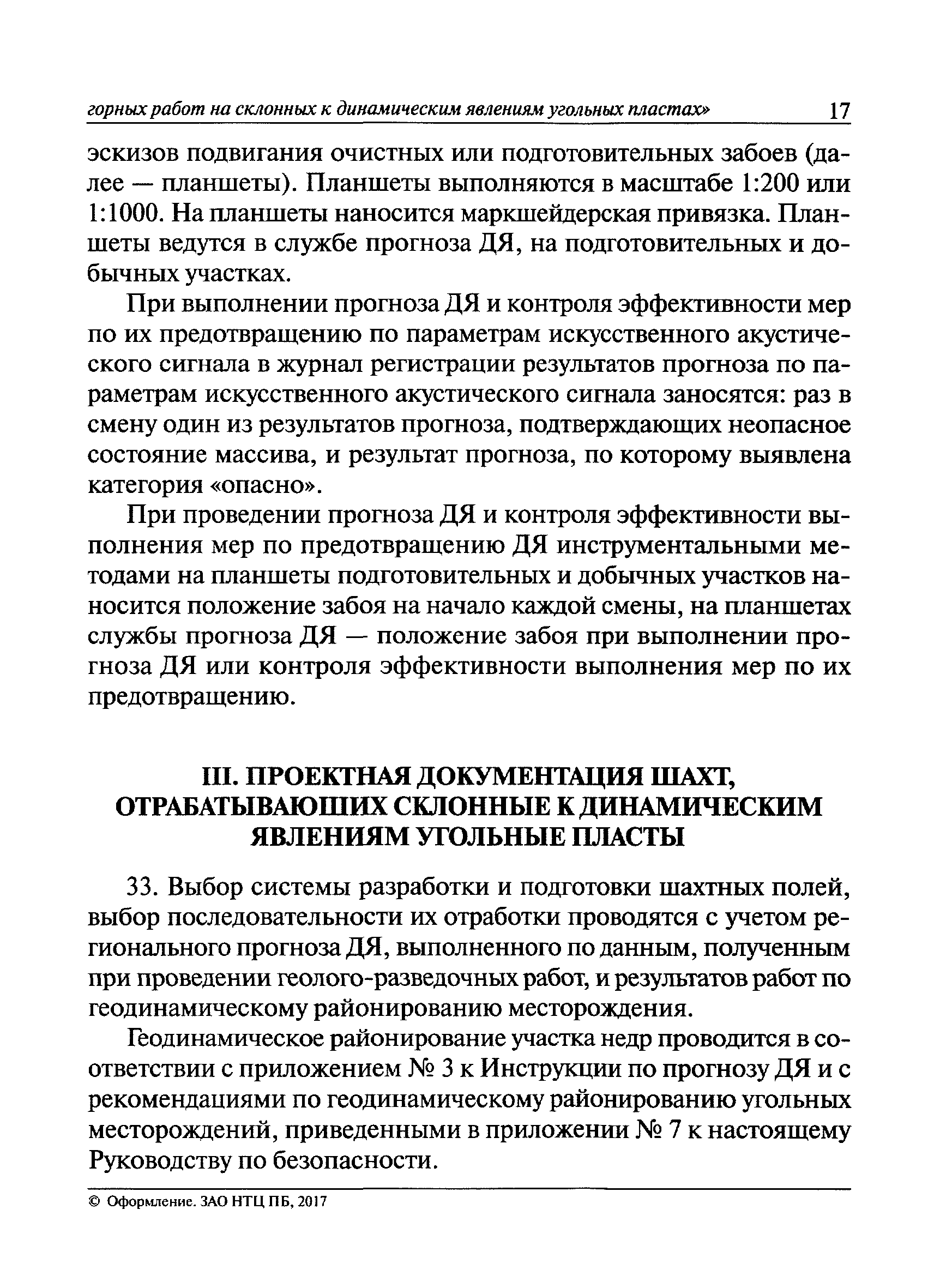 | Оглавление: | Приказ Федеральной службы по экологическому, технологическому и атомному надзору от 21 августа 2017 г. № 327 «Об утверждении Руководства по безопасности «Рекомендации по безопасному ведению горных работ на склонных к динамическим явлениям угольных пластах» Руководство по безопасности «Рекомендации по безопасному ведению горных работ на склонных к динамическим явлениям угольных пластах». I. Общие положения II. Организация работ по предотвращению динамических явлений III. Проектная документация шахт, отрабатывающих склонные к динамическим явлениям угольные пласты IV. Порядок разработки и утверждения комплекса мер по прогнозу и предотвращению динамических явлений V. Ведение горных работ на склонных к динамическим явлениям угольных пластах 1. Вскрытие склонных к динамическим явлениям угольных пластов 1.1. Вскрытие склонных к горным ударам угольных пластов 1.2. Вскрытие склонных к внезапным выбросам угольных пластов (или пропластков мощностью более 0,3 м) 1.3. Меры по предотвращению внезапных выбросов при вскрытии угольных пластов вертикальными стволами 1.3.1. Бурение дренажных скважин 1.3.2. Гидрорыхление угольного пласта 1.3.3. Возведение каркасной крепи 1.4. Меры по предотвращению внезапных выбросов при вскрытии угольных пластов квершлагами и другими полевыми выработками 1.4.1. Бурение дренажных скважин 1.4.2. Гидрорыхление угольного пласта 1.4.3. Увлажнение угольного пласта 1.4.4. Возведение каркасной крепи 2. Порядок отработки свиты угольных пластов 3. Вскрытие и подготовка шахтного поля на склонных к динамическим явлениям угольных пластах 3.1. Вскрытие и подготовка шахтного поля на склонных к горным ударам угольных пластах 3.2. Вскрытие и подготовка шахтного поля на склонных к внезапным выбросам угольных пластах 4. Проведение горных выработок 4.1. Проведение горных выработок на склонных к горным ударам угольных пластах 4.2. Проведение горных выработок на склонных к внезапным выбросам угольных пластах 5. Ведение очистных работ 5.1. Ведение очистных работ на склонных к горным ударам угольных пластах 5.2. Ведение очистных работ на склонных к выбросам угольных пластах 6. Ведение горных работ на склонных к внезапным высыпаниям угольных пластах крутого и крутонаклонного залегания 7. Меры по предотвращению динамических явлений 7.1. Региональные меры по предотвращению динамических явлений 7.1.1. Опережающая отработка защитных угольных пластов 7.1.2. Гидрообработка угольного пласта 7.1.3. Дегазация угольного пласта 7.2. Локальные меры по предотвращению динамических явлений 7.2.1. Бурение разгрузочных скважин 7.2.2. Меры по предотвращению динамических явлений при проведении подготовительных выработок в зонах повышенного горного давления по пласту Тройному Воркутского месторождения 7.2.3. Параметры разгрузочных скважин, в процессе бурения которых проводятся прогноз удароопасности и (или) выбросоопасности и оценка эффективности мер по предотвращению динамических явлений по параметрам искусственного акустического сигнала 7.2.4. Гидрообработка угольного пласта 7.2.5. Камуфлетное взрывание 7.3. Рекомендуемые ограничения по совмещению технологических процессов и мер по предотвращению внезапных выбросов VI. Мониторинг массива горных пород по геофизическим наблюдениям 1. Мониторинг массива горных пород по непрерывным сейсмическим наблюдениям 2. Мони