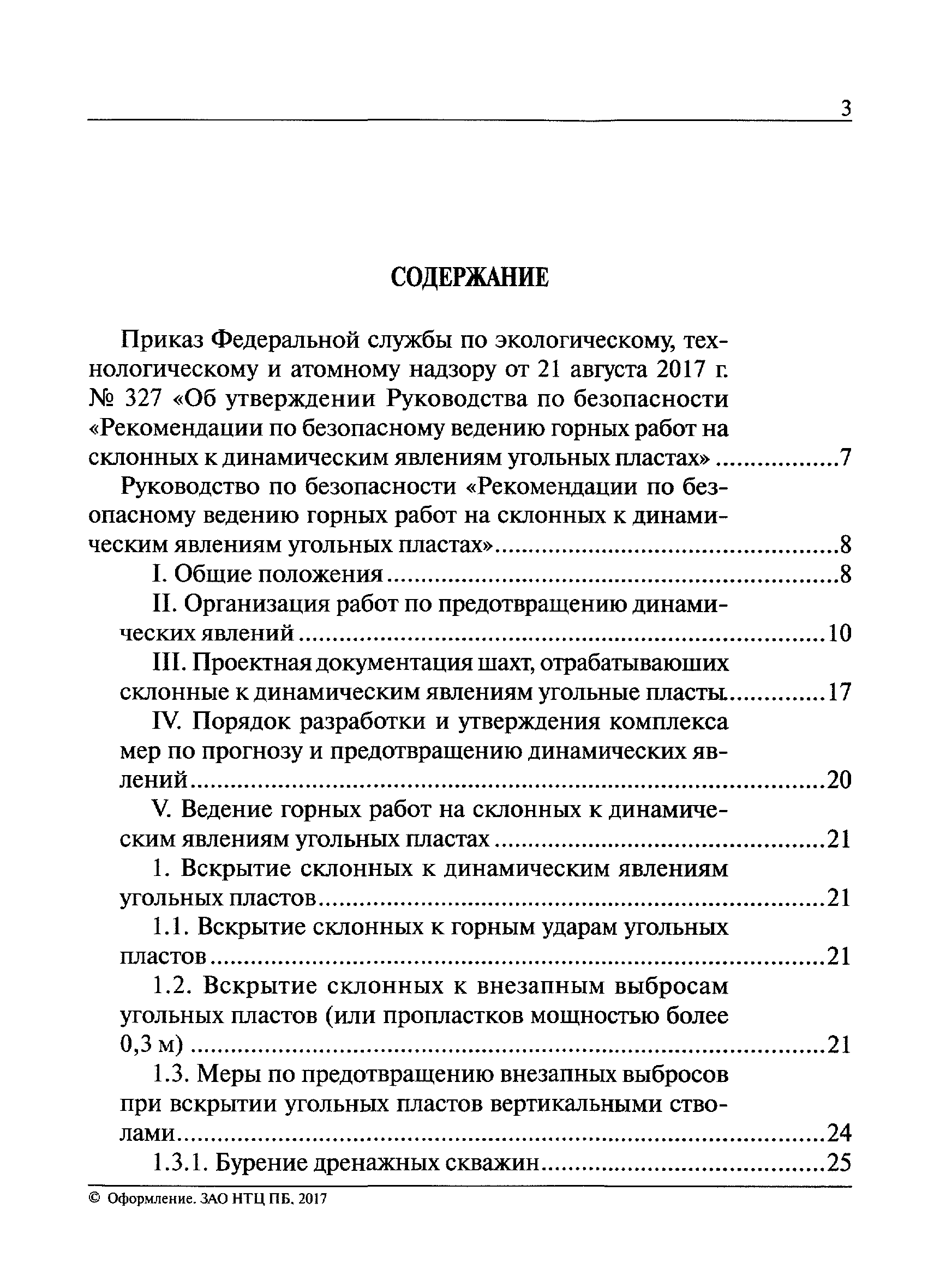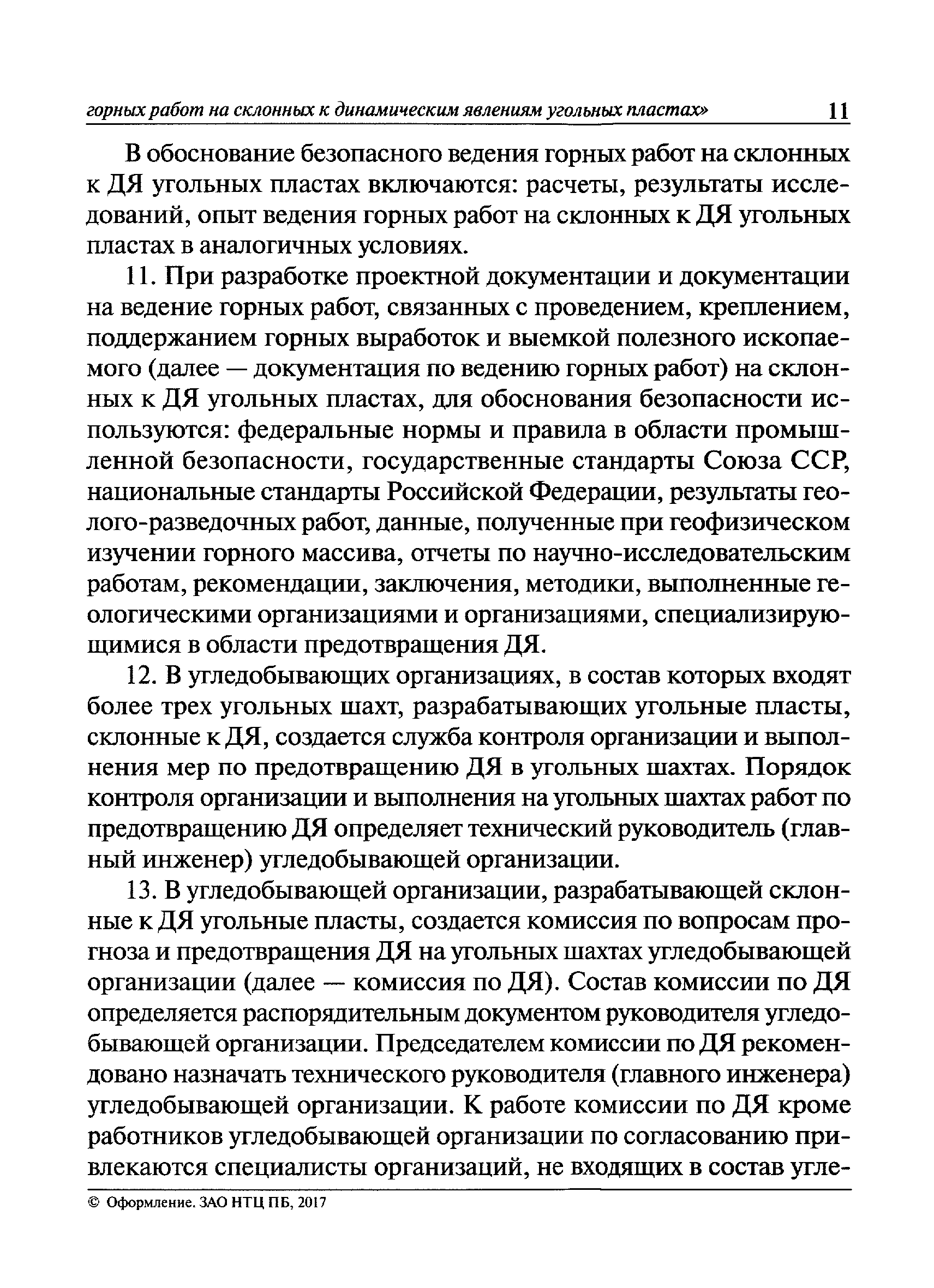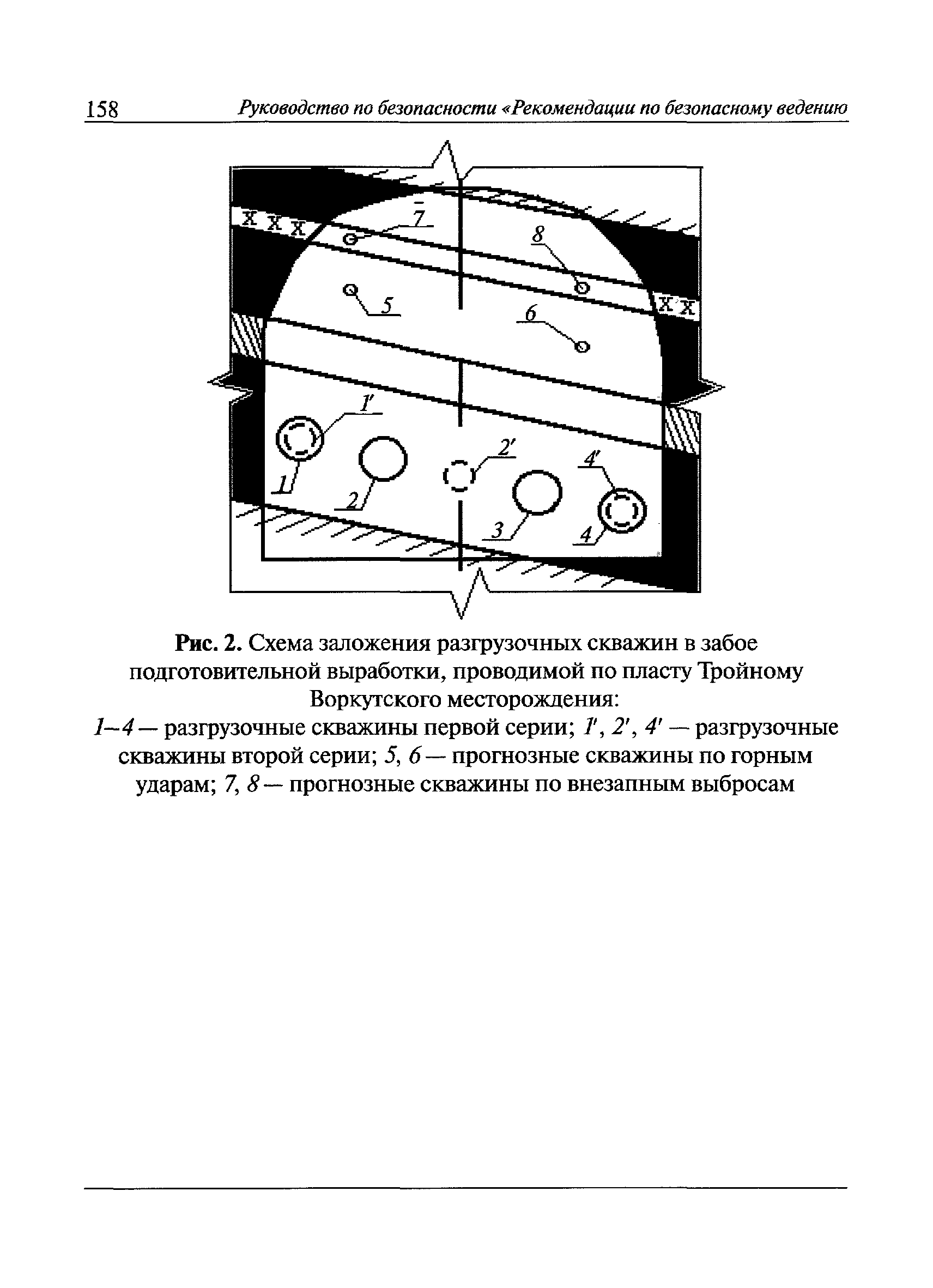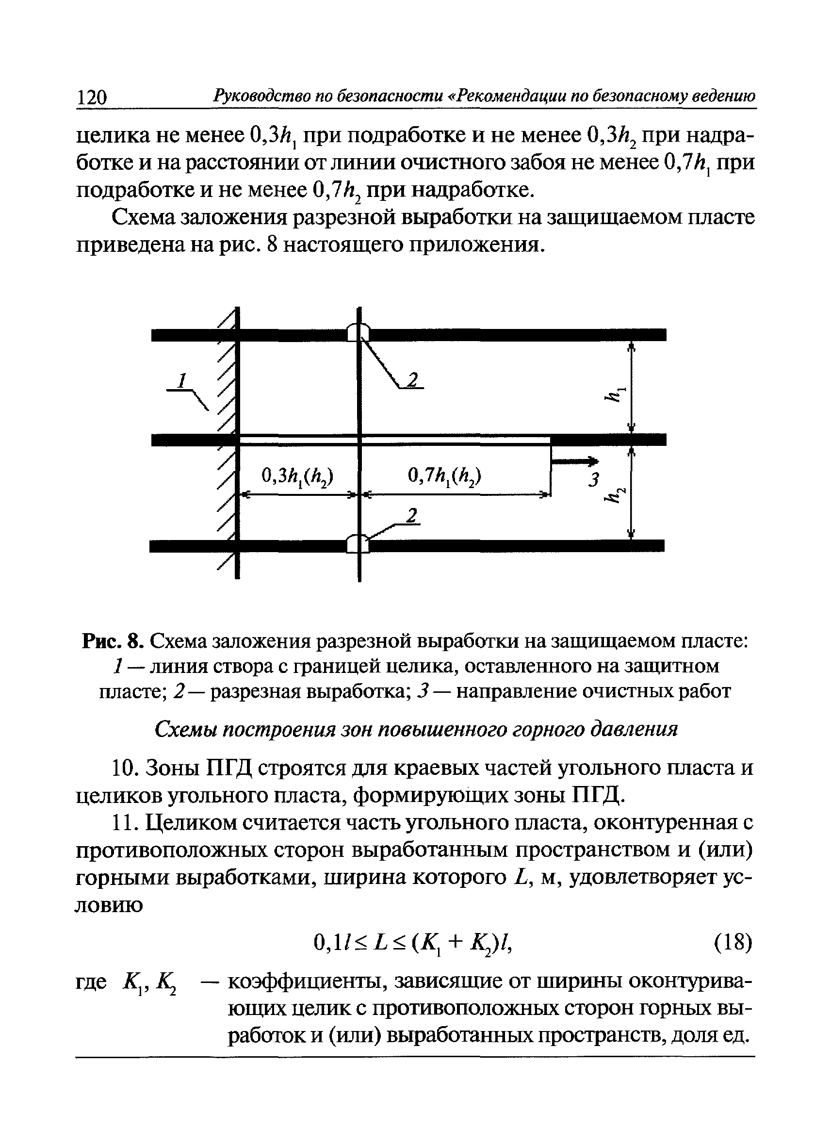 | Оглавление: | Приказ Федеральной службы по экологическому, технологическому и атомному надзору от 21 августа 2017 г. № 327 «Об утверждении Руководства по безопасности «Рекомендации по безопасному ведению горных работ на склонных к динамическим явлениям угольных пластах» Руководство по безопасности «Рекомендации по безопасному ведению горных работ на склонных к динамическим явлениям угольных пластах». I. Общие положения II. Организация работ по предотвращению динамических явлений III. Проектная документация шахт, отрабатывающих склонные к динамическим явлениям угольные пласты IV. Порядок разработки и утверждения комплекса мер по прогнозу и предотвращению динамических явлений V. Ведение горных работ на склонных к динамическим явлениям угольных пластах 1. Вскрытие склонных к динамическим явлениям угольных пластов 1.1. Вскрытие склонных к горным ударам угольных пластов 1.2. Вскрытие склонных к внезапным выбросам угольных пластов (или пропластков мощностью более 0,3 м) 1.3. Меры по предотвращению внезапных выбросов при вскрытии угольных пластов вертикальными стволами 1.3.1. Бурение дренажных скважин 1.3.2. Гидрорыхление угольного пласта 1.3.3. Возведение каркасной крепи 1.4. Меры по предотвращению внезапных выбросов при вскрытии угольных пластов квершлагами и другими полевыми выработками 1.4.1. Бурение дренажных скважин 1.4.2. Гидрорыхление угольного пласта 1.4.3. Увлажнение угольного пласта 1.4.4. Возведение каркасной крепи 2. Порядок отработки свиты угольных пластов 3. Вскрытие и подготовка шахтного поля на склонных к динамическим явлениям угольных пластах 3.1. Вскрытие и подготовка шахтного поля на склонных к горным ударам угольных пластах 3.2. Вскрытие и подготовка шахтного поля на склонных к внезапным выбросам угольных пластах 4. Проведение горных выработок 4.1. Проведение горных выработок на склонных к горным ударам угольных пластах 4.2. Проведение горных выработок на склонных к внезапным выбросам угольных пластах 5. Ведение очистных работ 5.1. Ведение очистных работ на склонных к горным ударам угольных пластах 5.2. Ведение очистных работ на склонных к выбросам угольных пластах 6. Ведение горных работ на склонных к внезапным высыпаниям угольных пластах крутого и крутонаклонного залегания 7. Меры по предотвращению динамических явлений 7.1. Региональные меры по предотвращению динамических явлений 7.1.1. Опережающая отработка защитных угольных пластов 7.1.2. Гидрообработка угольного пласта 7.1.3. Дегазация угольного пласта 7.2. Локальные меры по предотвращению динамических явлений 7.2.1. Бурение разгрузочных скважин 7.2.2. Меры по предотвращению динамических явлений при проведении подготовительных выработок в зонах повышенного горного давления по пласту Тройному Воркутского месторождения 7.2.3. Параметры разгрузочных скважин, в процессе бурения которых проводятся прогноз удароопасности и (или) выбросоопасности и оценка эффективности мер по предотвращению динамических явлений по параметрам искусственного акустического сигнала 7.2.4. Гидрообработка угольного пласта 7.2.5. Камуфлетное взрывание 7.3. Рекомендуемые ограничения по совмещению технологических процессов и мер по предотвращению внезапных выбросов VI. Мониторинг массива горных пород по геофизическим наблюдениям 1. Мониторинг массива горных пород по непрерывным сейсмическим наблюдениям 2. Мони