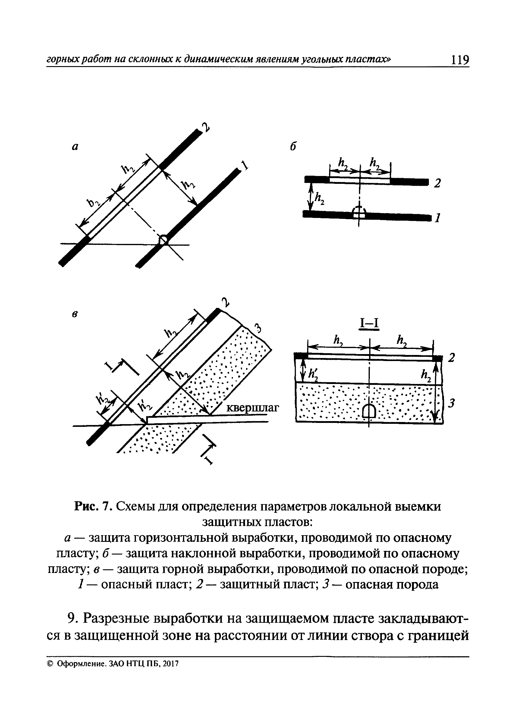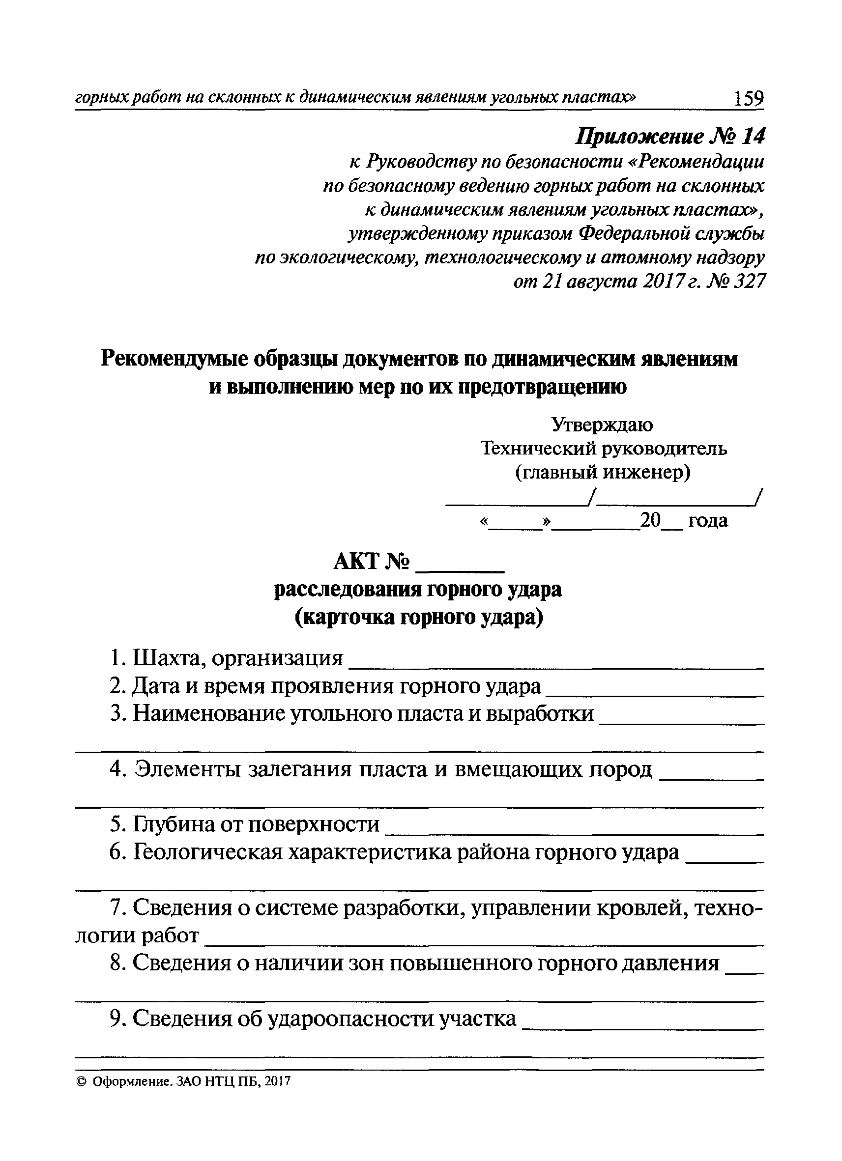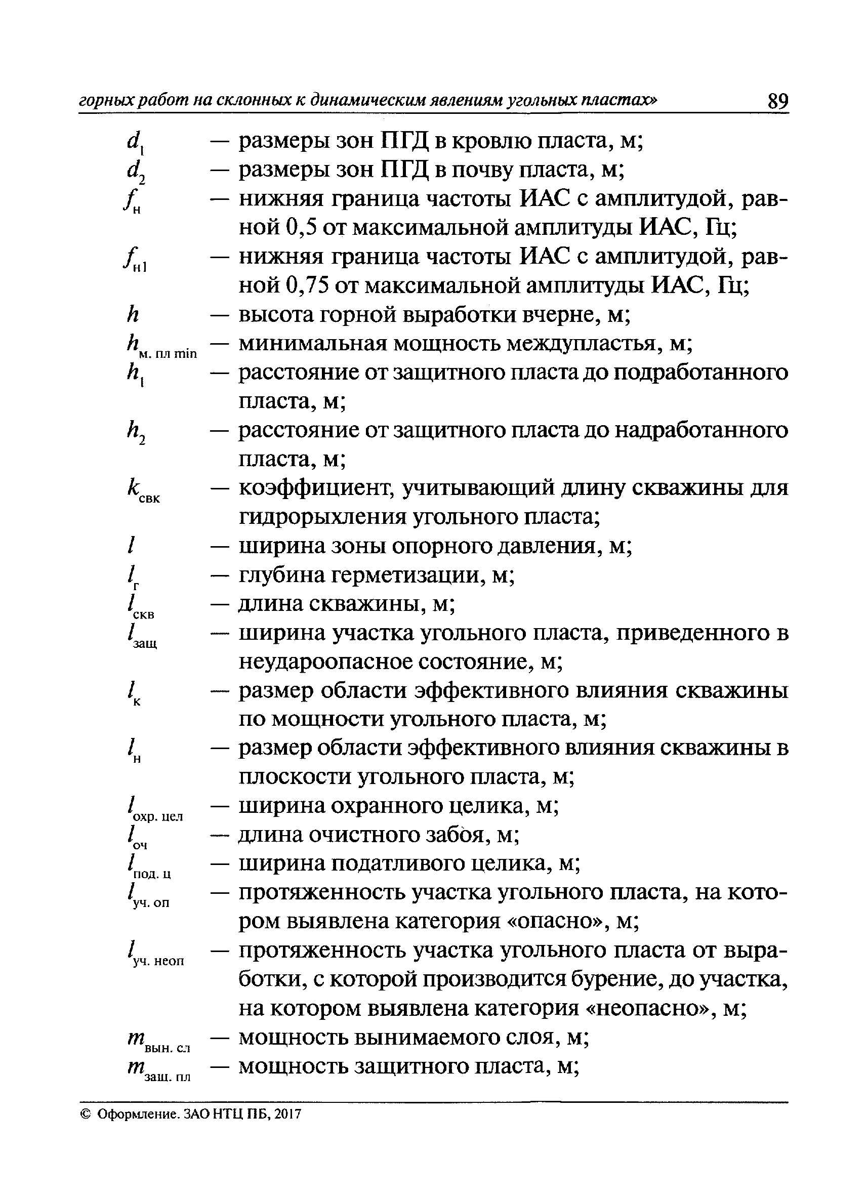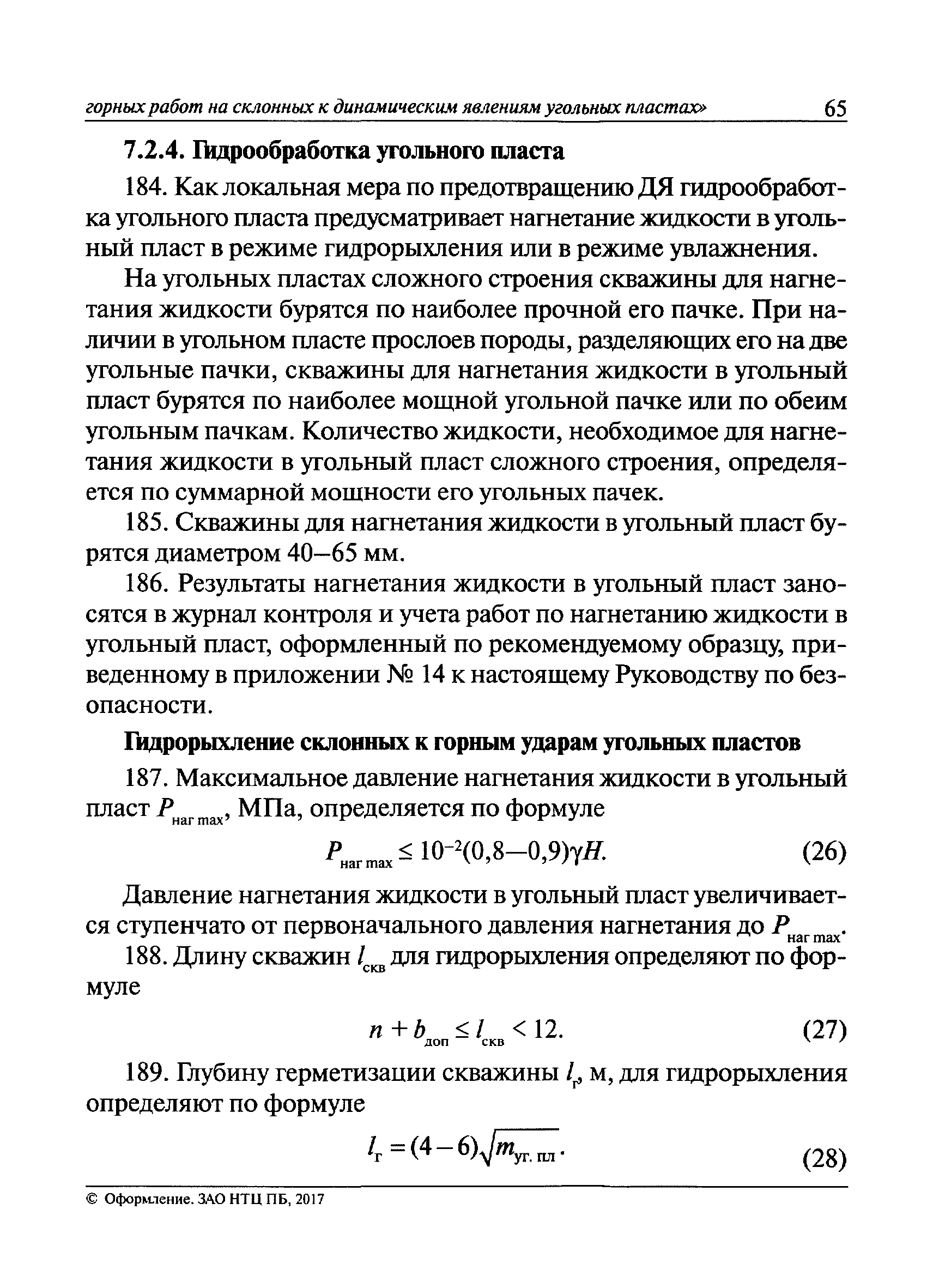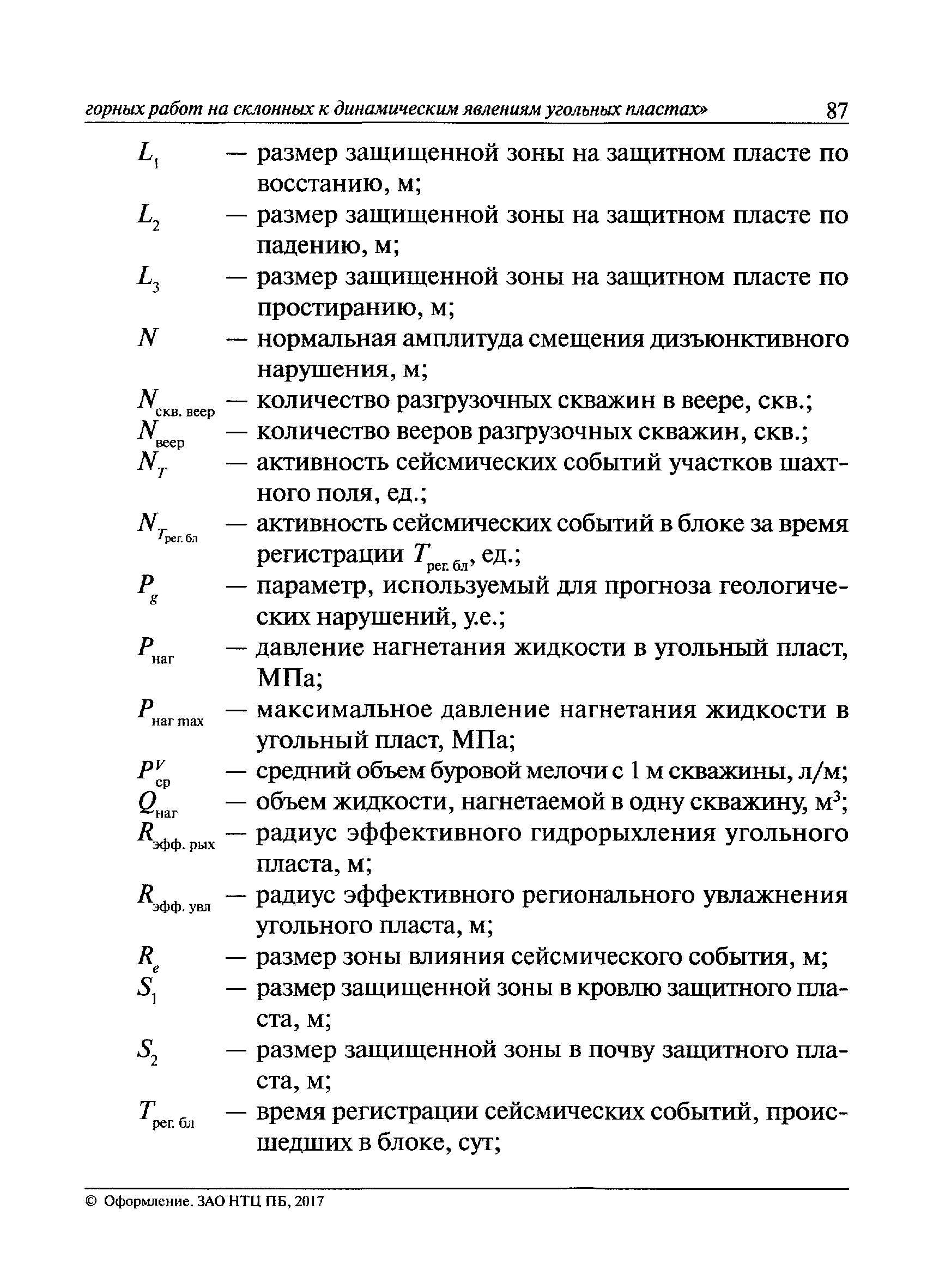 | Оглавление: | Приказ Федеральной службы по экологическому, технологическому и атомному надзору от 21 августа 2017 г. № 327 «Об утверждении Руководства по безопасности «Рекомендации по безопасному ведению горных работ на склонных к динамическим явлениям угольных пластах» Руководство по безопасности «Рекомендации по безопасному ведению горных работ на склонных к динамическим явлениям угольных пластах». I. Общие положения II. Организация работ по предотвращению динамических явлений III. Проектная документация шахт, отрабатывающих склонные к динамическим явлениям угольные пласты IV. Порядок разработки и утверждения комплекса мер по прогнозу и предотвращению динамических явлений V. Ведение горных работ на склонных к динамическим явлениям угольных пластах 1. Вскрытие склонных к динамическим явлениям угольных пластов 1.1. Вскрытие склонных к горным ударам угольных пластов 1.2. Вскрытие склонных к внезапным выбросам угольных пластов (или пропластков мощностью более 0,3 м) 1.3. Меры по предотвращению внезапных выбросов при вскрытии угольных пластов вертикальными стволами 1.3.1. Бурение дренажных скважин 1.3.2. Гидрорыхление угольного пласта 1.3.3. Возведение каркасной крепи 1.4. Меры по предотвращению внезапных выбросов при вскрытии угольных пластов квершлагами и другими полевыми выработками 1.4.1. Бурение дренажных скважин 1.4.2. Гидрорыхление угольного пласта 1.4.3. Увлажнение угольного пласта 1.4.4. Возведение каркасной крепи 2. Порядок отработки свиты угольных пластов 3. Вскрытие и подготовка шахтного поля на склонных к динамическим явлениям угольных пластах 3.1. Вскрытие и подготовка шахтного поля на склонных к горным ударам угольных пластах 3.2. Вскрытие и подготовка шахтного поля на склонных к внезапным выбросам угольных пластах 4. Проведение горных выработок 4.1. Проведение горных выработок на склонных к горным ударам угольных пластах 4.2. Проведение горных выработок на склонных к внезапным выбросам угольных пластах 5. Ведение очистных работ 5.1. Ведение очистных работ на склонных к горным ударам угольных пластах 5.2. Ведение очистных работ на склонных к выбросам угольных пластах 6. Ведение горных работ на склонных к внезапным высыпаниям угольных пластах крутого и крутонаклонного залегания 7. Меры по предотвращению динамических явлений 7.1. Региональные меры по предотвращению динамических явлений 7.1.1. Опережающая отработка защитных угольных пластов 7.1.2. Гидрообработка угольного пласта 7.1.3. Дегазация угольного пласта 7.2. Локальные меры по предотвращению динамических явлений 7.2.1. Бурение разгрузочных скважин 7.2.2. Меры по предотвращению динамических явлений при проведении подготовительных выработок в зонах повышенного горного давления по пласту Тройному Воркутского месторождения 7.2.3. Параметры разгрузочных скважин, в процессе бурения которых проводятся прогноз удароопасности и (или) выбросоопасности и оценка эффективности мер по предотвращению динамических явлений по параметрам искусственного акустического сигнала 7.2.4. Гидрообработка угольного пласта 7.2.5. Камуфлетное взрывание 7.3. Рекомендуемые ограничения по совмещению технологических процессов и мер по предотвращению внезапных выбросов VI. Мониторинг массива горных пород по геофизическим наблюдениям 1. Мониторинг массива горных пород по непрерывным сейсмическим наблюдениям 2. Мони