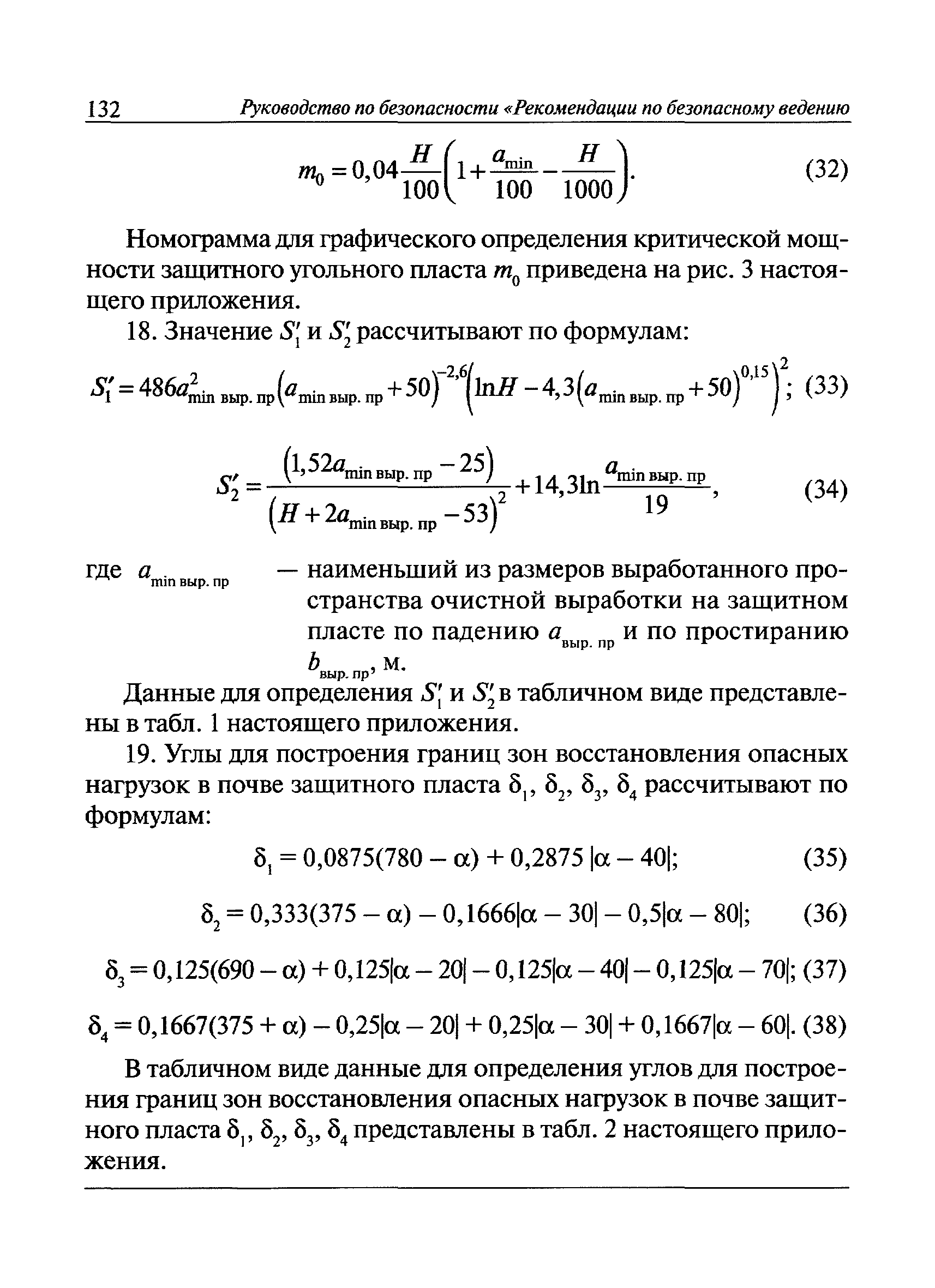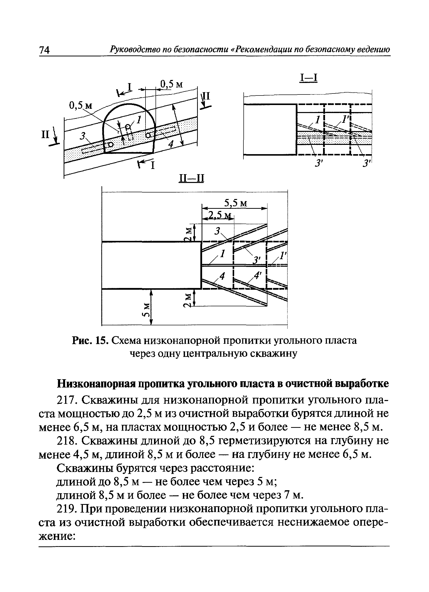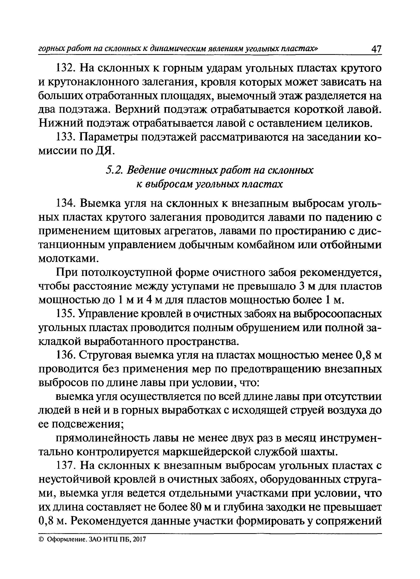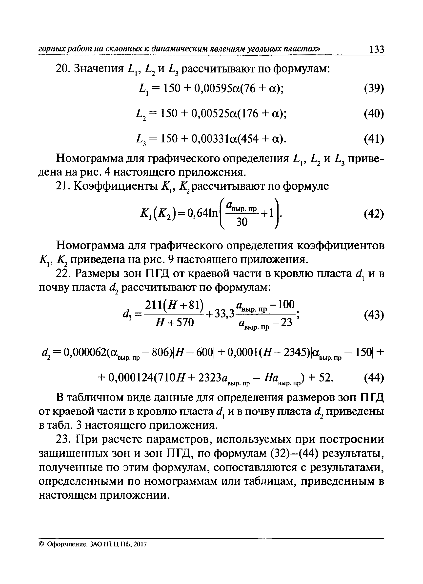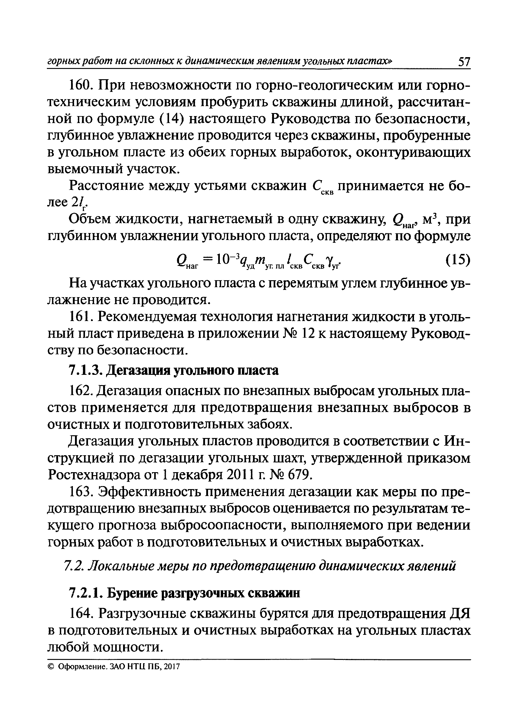 | Оглавление: | Приказ Федеральной службы по экологическому, технологическому и атомному надзору от 21 августа 2017 г. № 327 «Об утверждении Руководства по безопасности «Рекомендации по безопасному ведению горных работ на склонных к динамическим явлениям угольных пластах» Руководство по безопасности «Рекомендации по безопасному ведению горных работ на склонных к динамическим явлениям угольных пластах». I. Общие положения II. Организация работ по предотвращению динамических явлений III. Проектная документация шахт, отрабатывающих склонные к динамическим явлениям угольные пласты IV. Порядок разработки и утверждения комплекса мер по прогнозу и предотвращению динамических явлений V. Ведение горных работ на склонных к динамическим явлениям угольных пластах 1. Вскрытие склонных к динамическим явлениям угольных пластов 1.1. Вскрытие склонных к горным ударам угольных пластов 1.2. Вскрытие склонных к внезапным выбросам угольных пластов (или пропластков мощностью более 0,3 м) 1.3. Меры по предотвращению внезапных выбросов при вскрытии угольных пластов вертикальными стволами 1.3.1. Бурение дренажных скважин 1.3.2. Гидрорыхление угольного пласта 1.3.3. Возведение каркасной крепи 1.4. Меры по предотвращению внезапных выбросов при вскрытии угольных пластов квершлагами и другими полевыми выработками 1.4.1. Бурение дренажных скважин 1.4.2. Гидрорыхление угольного пласта 1.4.3. Увлажнение угольного пласта 1.4.4. Возведение каркасной крепи 2. Порядок отработки свиты угольных пластов 3. Вскрытие и подготовка шахтного поля на склонных к динамическим явлениям угольных пластах 3.1. Вскрытие и подготовка шахтного поля на склонных к горным ударам угольных пластах 3.2. Вскрытие и подготовка шахтного поля на склонных к внезапным выбросам угольных пластах 4. Проведение горных выработок 4.1. Проведение горных выработок на склонных к горным ударам угольных пластах 4.2. Проведение горных выработок на склонных к внезапным выбросам угольных пластах 5. Ведение очистных работ 5.1. Ведение очистных работ на склонных к горным ударам угольных пластах 5.2. Ведение очистных работ на склонных к выбросам угольных пластах 6. Ведение горных работ на склонных к внезапным высыпаниям угольных пластах крутого и крутонаклонного залегания 7. Меры по предотвращению динамических явлений 7.1. Региональные меры по предотвращению динамических явлений 7.1.1. Опережающая отработка защитных угольных пластов 7.1.2. Гидрообработка угольного пласта 7.1.3. Дегазация угольного пласта 7.2. Локальные меры по предотвращению динамических явлений 7.2.1. Бурение разгрузочных скважин 7.2.2. Меры по предотвращению динамических явлений при проведении подготовительных выработок в зонах повышенного горного давления по пласту Тройному Воркутского месторождения 7.2.3. Параметры разгрузочных скважин, в процессе бурения которых проводятся прогноз удароопасности и (или) выбросоопасности и оценка эффективности мер по предотвращению динамических явлений по параметрам искусственного акустического сигнала 7.2.4. Гидрообработка угольного пласта 7.2.5. Камуфлетное взрывание 7.3. Рекомендуемые ограничения по совмещению технологических процессов и мер по предотвращению внезапных выбросов VI. Мониторинг массива горных пород по геофизическим наблюдениям 1. Мониторинг массива горных пород по непрерывным сейсмическим наблюдениям 2. Мони