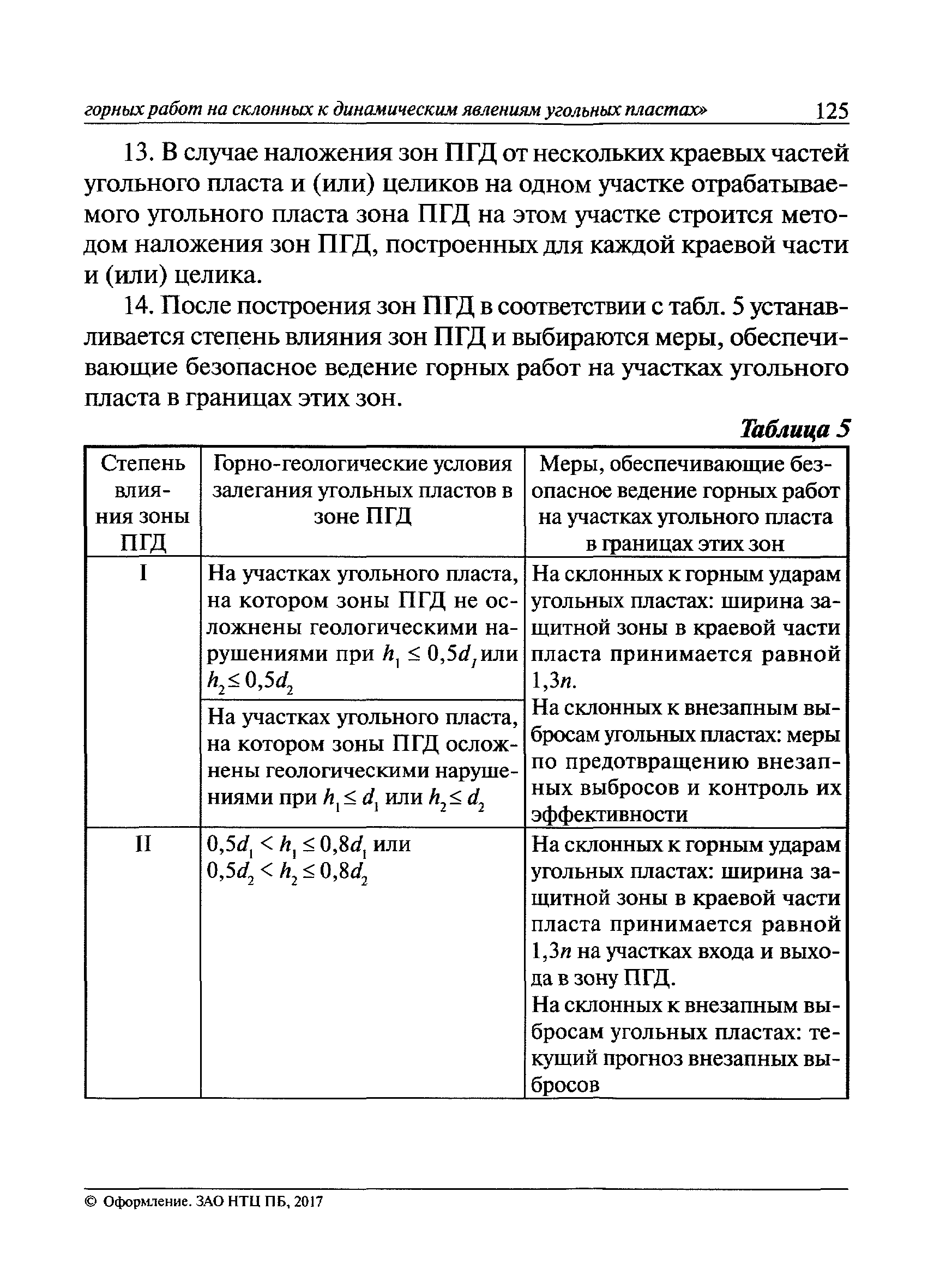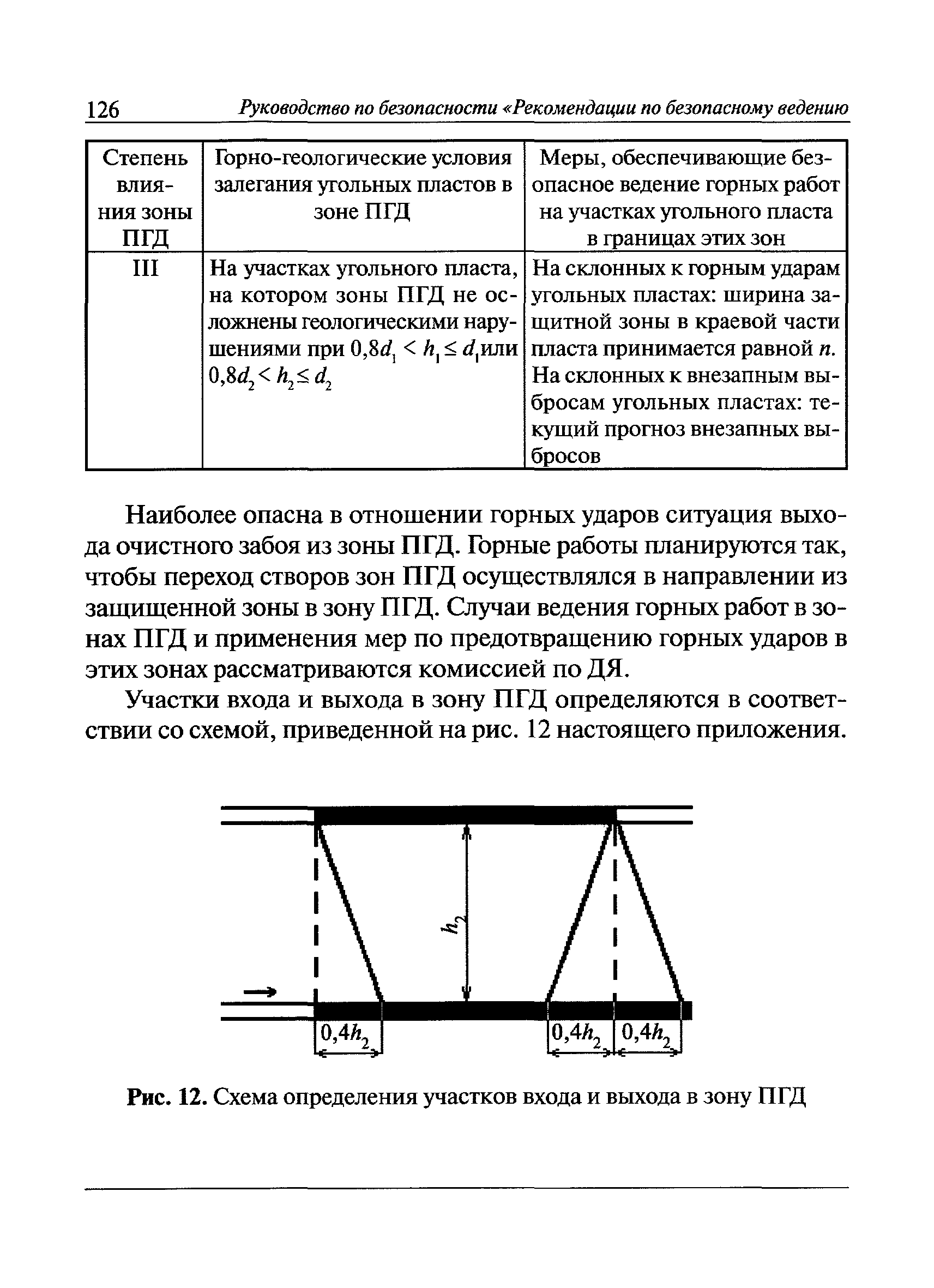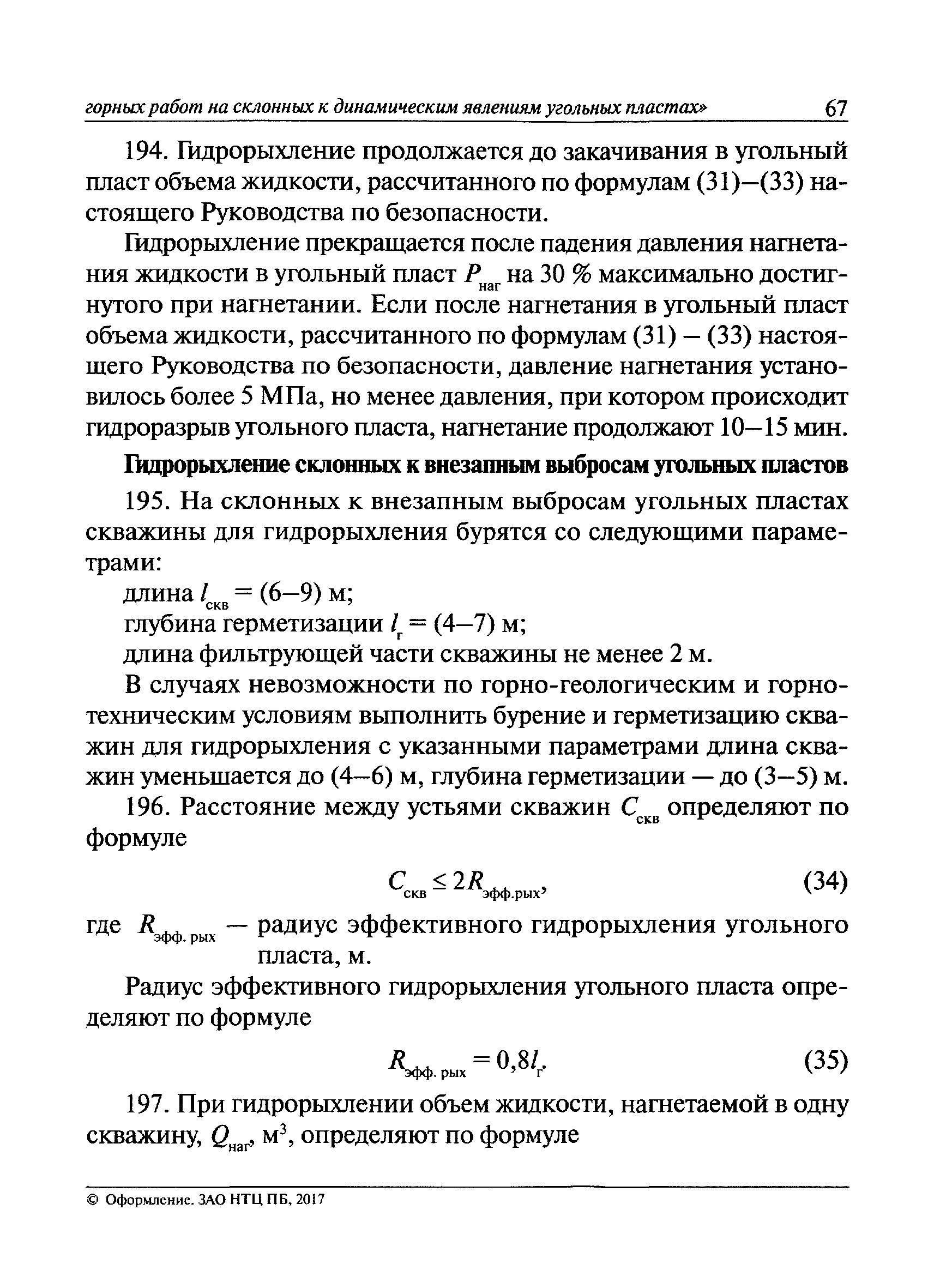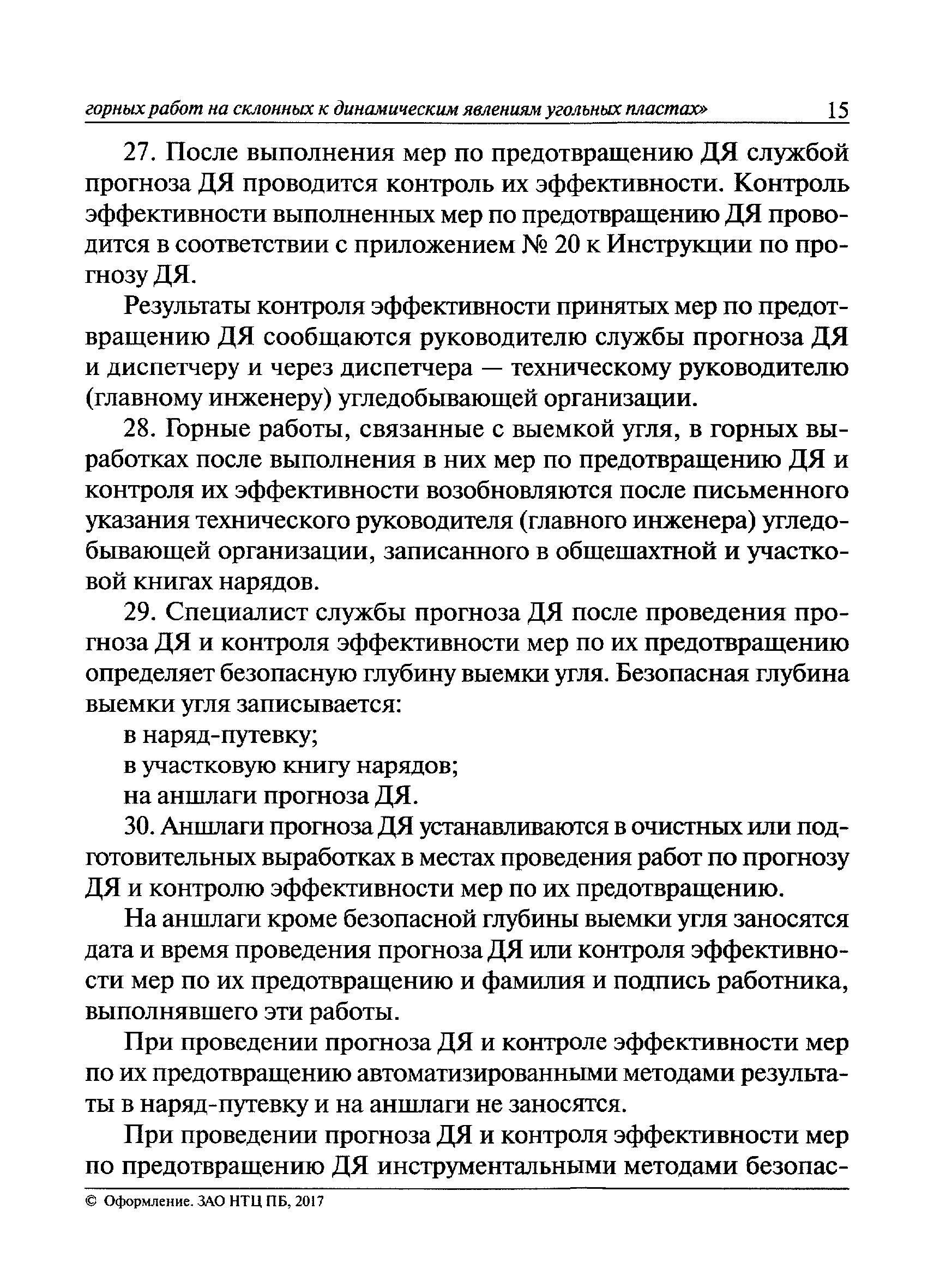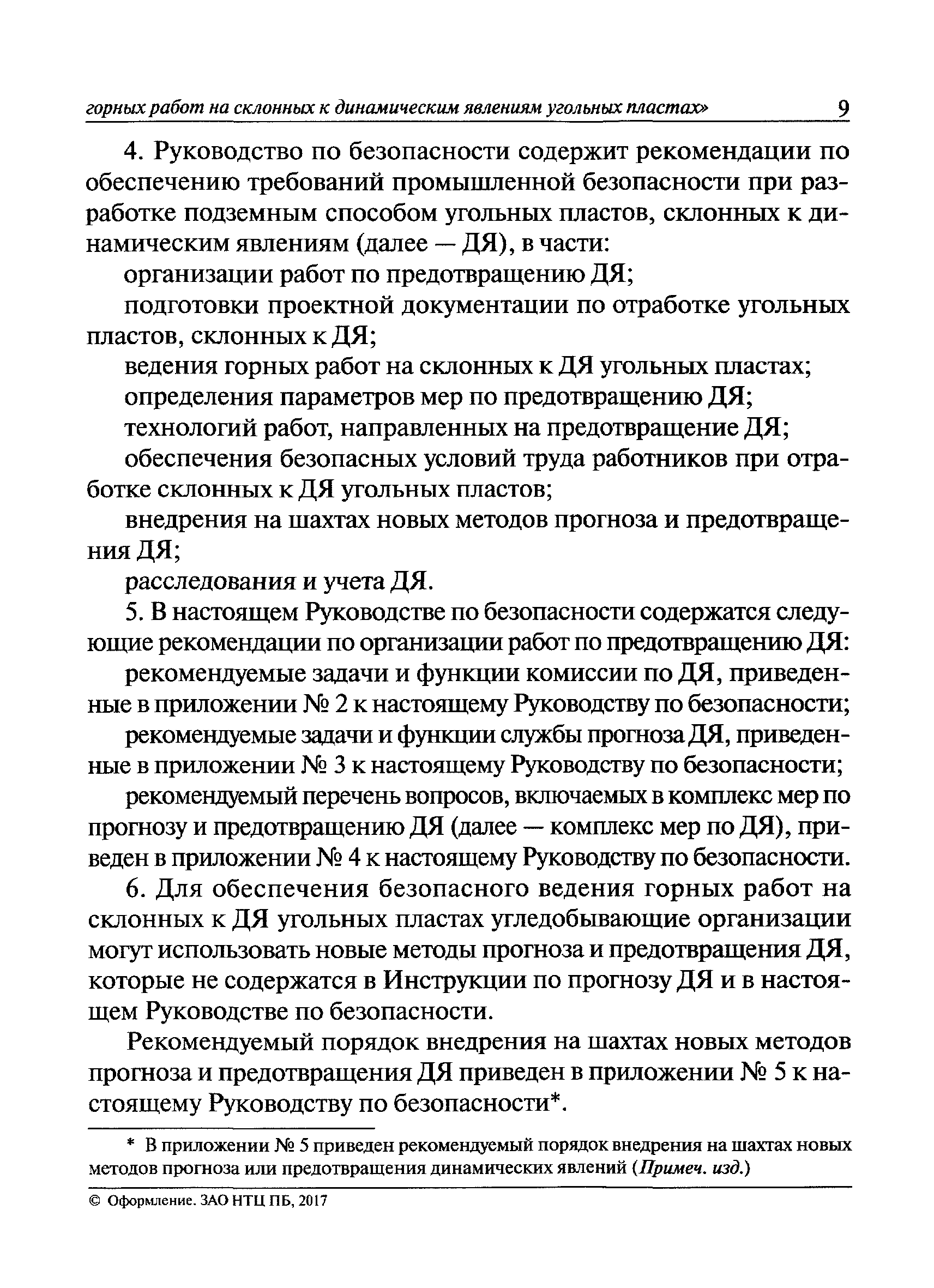 | Оглавление: | Приказ Федеральной службы по экологическому, технологическому и атомному надзору от 21 августа 2017 г. № 327 «Об утверждении Руководства по безопасности «Рекомендации по безопасному ведению горных работ на склонных к динамическим явлениям угольных пластах» Руководство по безопасности «Рекомендации по безопасному ведению горных работ на склонных к динамическим явлениям угольных пластах». I. Общие положения II. Организация работ по предотвращению динамических явлений III. Проектная документация шахт, отрабатывающих склонные к динамическим явлениям угольные пласты IV. Порядок разработки и утверждения комплекса мер по прогнозу и предотвращению динамических явлений V. Ведение горных работ на склонных к динамическим явлениям угольных пластах 1. Вскрытие склонных к динамическим явлениям угольных пластов 1.1. Вскрытие склонных к горным ударам угольных пластов 1.2. Вскрытие склонных к внезапным выбросам угольных пластов (или пропластков мощностью более 0,3 м) 1.3. Меры по предотвращению внезапных выбросов при вскрытии угольных пластов вертикальными стволами 1.3.1. Бурение дренажных скважин 1.3.2. Гидрорыхление угольного пласта 1.3.3. Возведение каркасной крепи 1.4. Меры по предотвращению внезапных выбросов при вскрытии угольных пластов квершлагами и другими полевыми выработками 1.4.1. Бурение дренажных скважин 1.4.2. Гидрорыхление угольного пласта 1.4.3. Увлажнение угольного пласта 1.4.4. Возведение каркасной крепи 2. Порядок отработки свиты угольных пластов 3. Вскрытие и подготовка шахтного поля на склонных к динамическим явлениям угольных пластах 3.1. Вскрытие и подготовка шахтного поля на склонных к горным ударам угольных пластах 3.2. Вскрытие и подготовка шахтного поля на склонных к внезапным выбросам угольных пластах 4. Проведение горных выработок 4.1. Проведение горных выработок на склонных к горным ударам угольных пластах 4.2. Проведение горных выработок на склонных к внезапным выбросам угольных пластах 5. Ведение очистных работ 5.1. Ведение очистных работ на склонных к горным ударам угольных пластах 5.2. Ведение очистных работ на склонных к выбросам угольных пластах 6. Ведение горных работ на склонных к внезапным высыпаниям угольных пластах крутого и крутонаклонного залегания 7. Меры по предотвращению динамических явлений 7.1. Региональные меры по предотвращению динамических явлений 7.1.1. Опережающая отработка защитных угольных пластов 7.1.2. Гидрообработка угольного пласта 7.1.3. Дегазация угольного пласта 7.2. Локальные меры по предотвращению динамических явлений 7.2.1. Бурение разгрузочных скважин 7.2.2. Меры по предотвращению динамических явлений при проведении подготовительных выработок в зонах повышенного горного давления по пласту Тройному Воркутского месторождения 7.2.3. Параметры разгрузочных скважин, в процессе бурения которых проводятся прогноз удароопасности и (или) выбросоопасности и оценка эффективности мер по предотвращению динамических явлений по параметрам искусственного акустического сигнала 7.2.4. Гидрообработка угольного пласта 7.2.5. Камуфлетное взрывание 7.3. Рекомендуемые ограничения по совмещению технологических процессов и мер по предотвращению внезапных выбросов VI. Мониторинг массива горных пород по геофизическим наблюдениям 1. Мониторинг массива горных пород по непрерывным сейсмическим наблюдениям 2. Мони