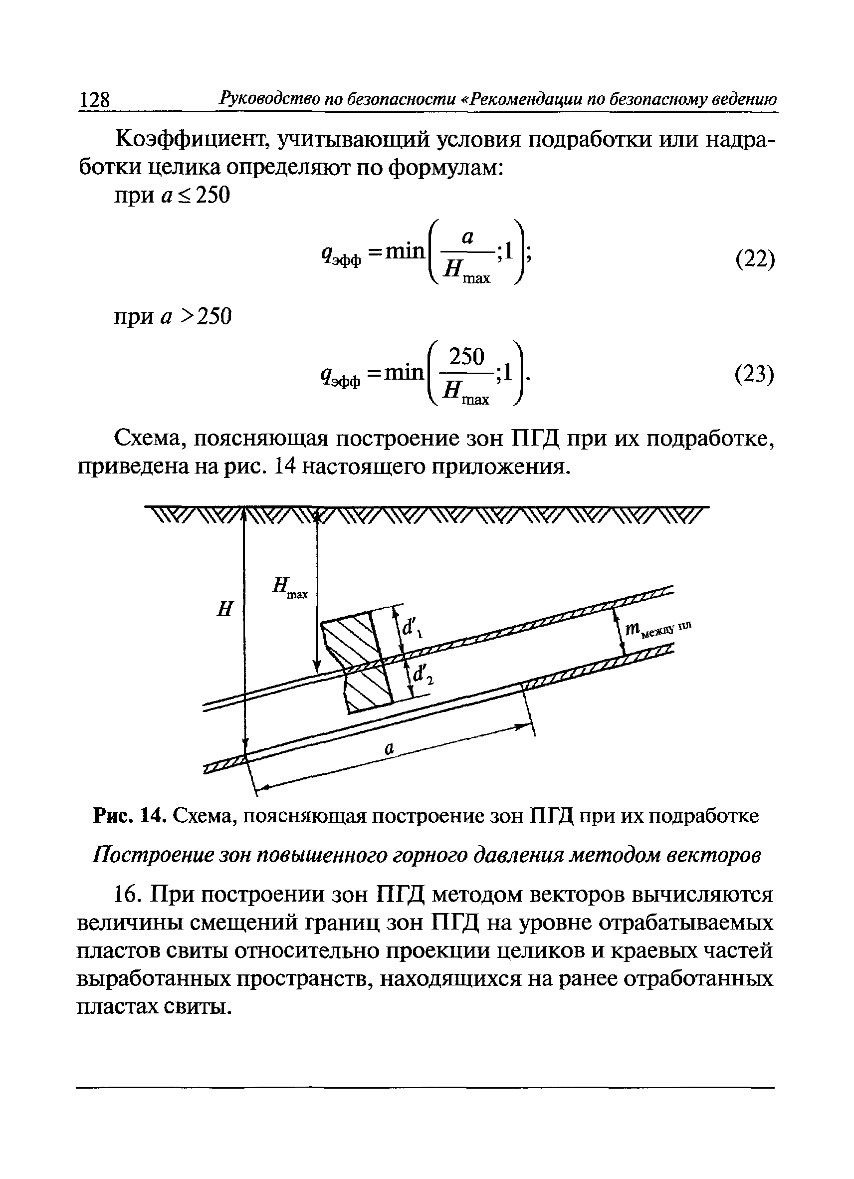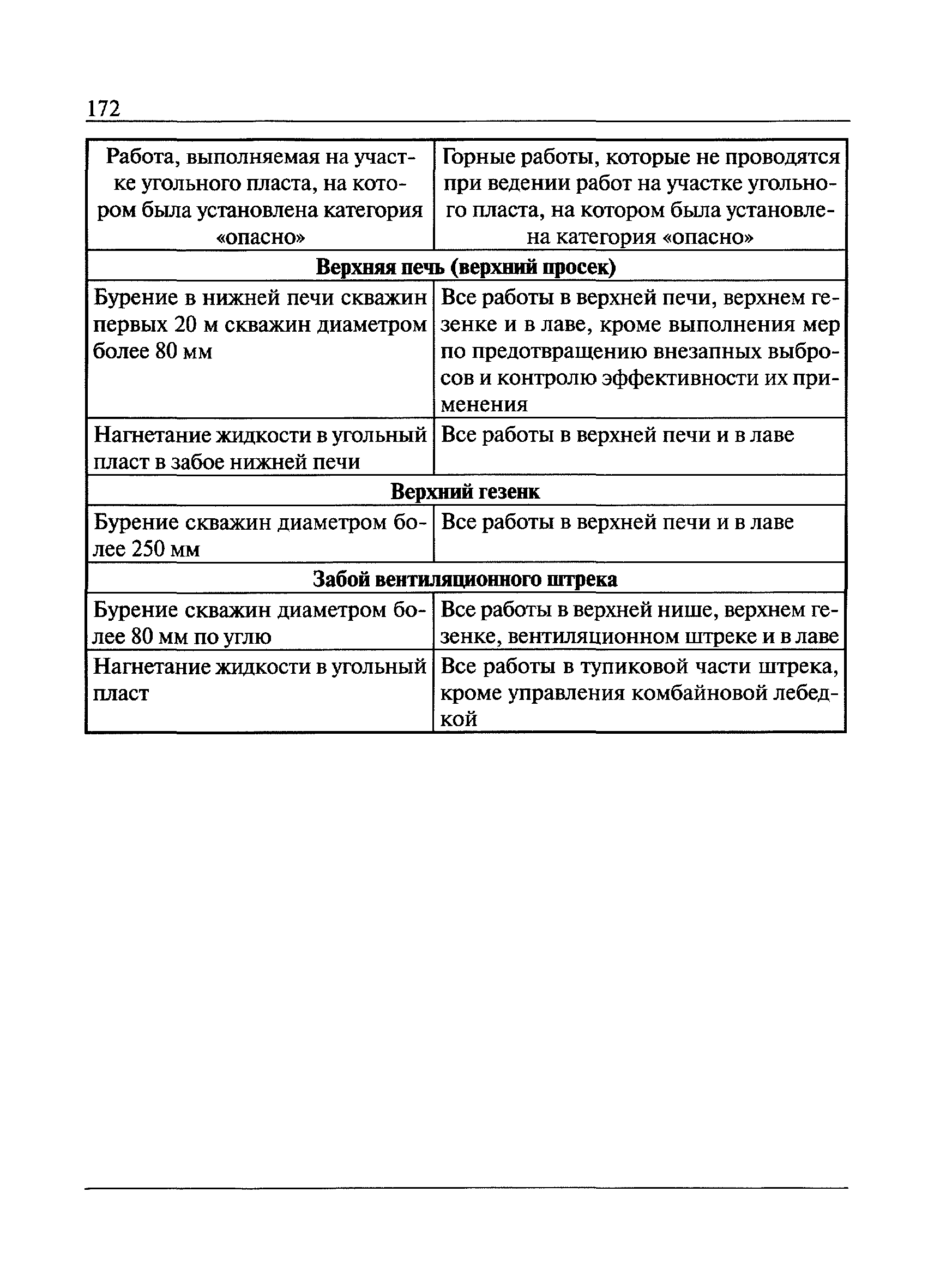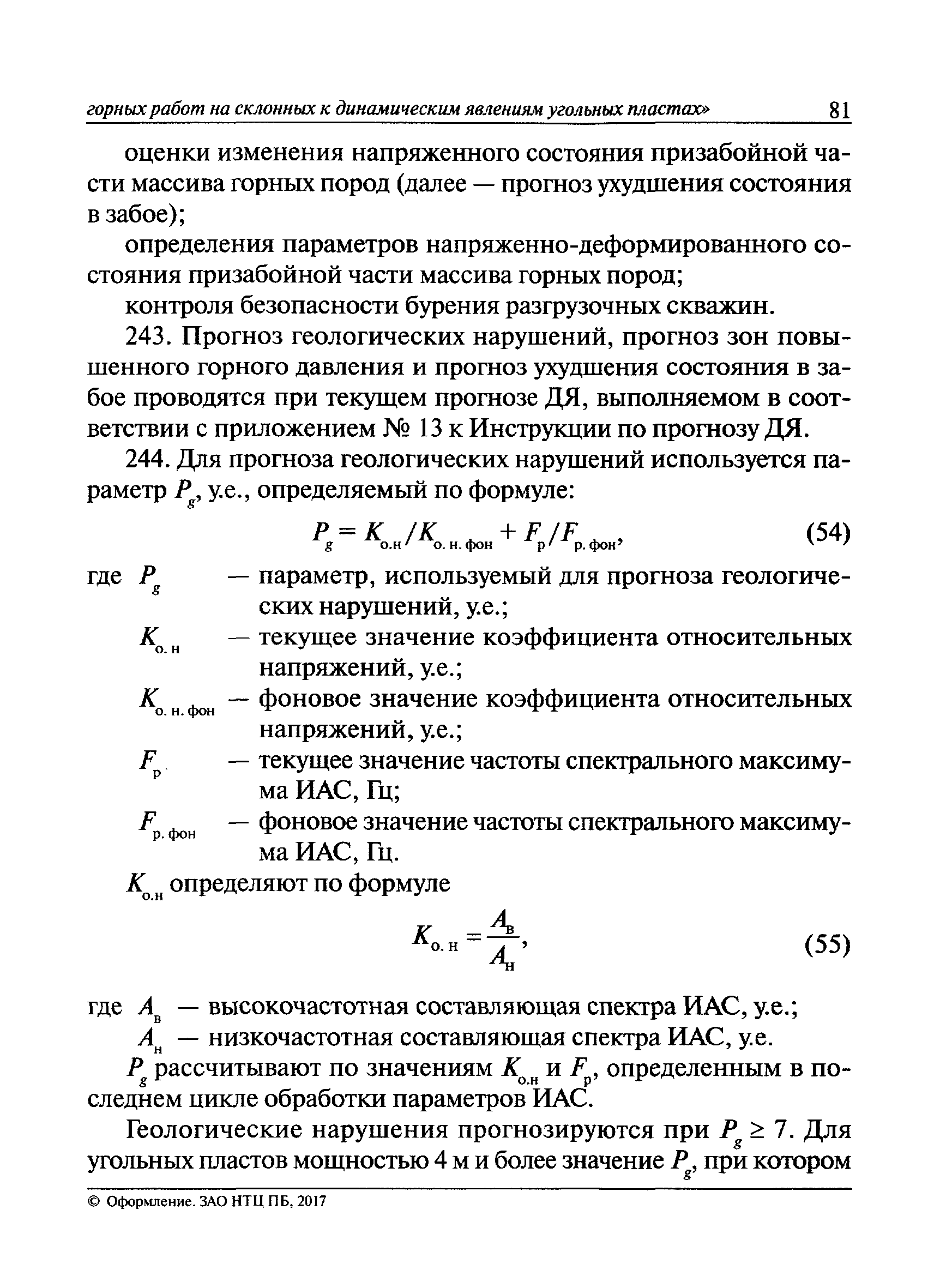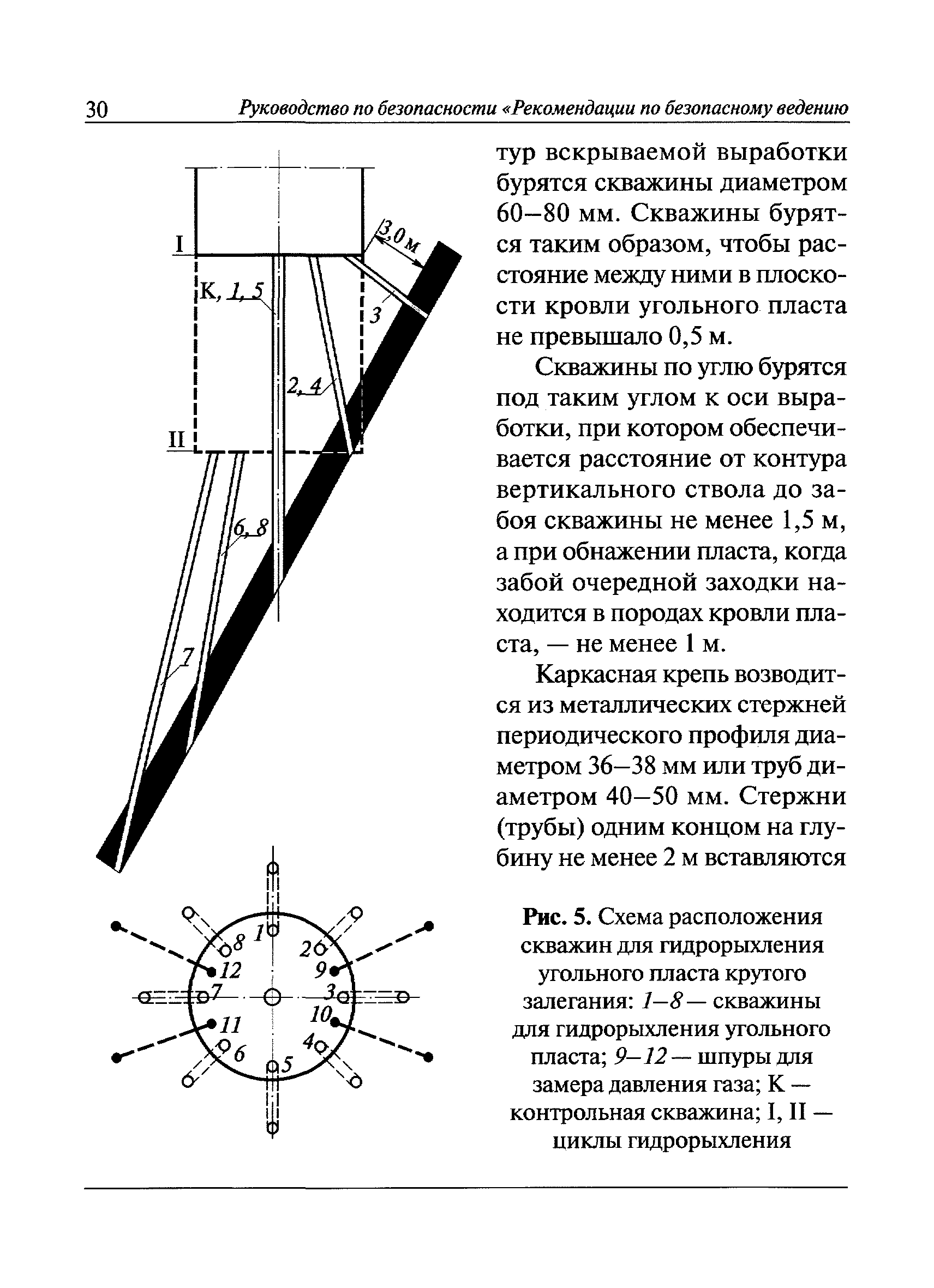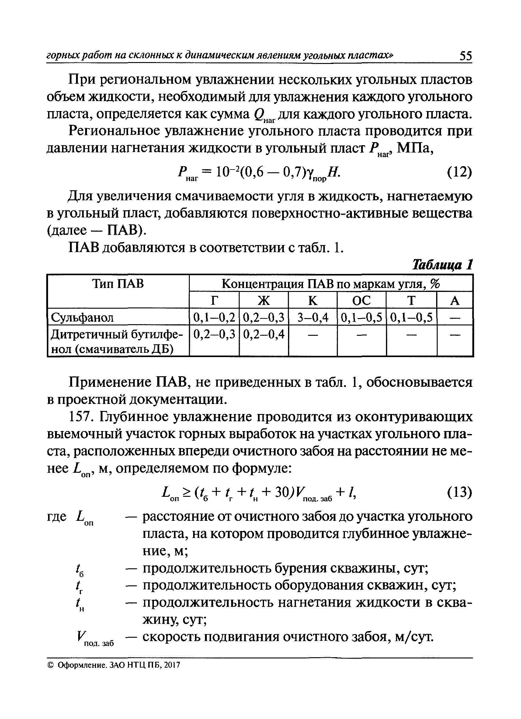 | Оглавление: | Приказ Федеральной службы по экологическому, технологическому и атомному надзору от 21 августа 2017 г. № 327 «Об утверждении Руководства по безопасности «Рекомендации по безопасному ведению горных работ на склонных к динамическим явлениям угольных пластах» Руководство по безопасности «Рекомендации по безопасному ведению горных работ на склонных к динамическим явлениям угольных пластах». I. Общие положения II. Организация работ по предотвращению динамических явлений III. Проектная документация шахт, отрабатывающих склонные к динамическим явлениям угольные пласты IV. Порядок разработки и утверждения комплекса мер по прогнозу и предотвращению динамических явлений V. Ведение горных работ на склонных к динамическим явлениям угольных пластах 1. Вскрытие склонных к динамическим явлениям угольных пластов 1.1. Вскрытие склонных к горным ударам угольных пластов 1.2. Вскрытие склонных к внезапным выбросам угольных пластов (или пропластков мощностью более 0,3 м) 1.3. Меры по предотвращению внезапных выбросов при вскрытии угольных пластов вертикальными стволами 1.3.1. Бурение дренажных скважин 1.3.2. Гидрорыхление угольного пласта 1.3.3. Возведение каркасной крепи 1.4. Меры по предотвращению внезапных выбросов при вскрытии угольных пластов квершлагами и другими полевыми выработками 1.4.1. Бурение дренажных скважин 1.4.2. Гидрорыхление угольного пласта 1.4.3. Увлажнение угольного пласта 1.4.4. Возведение каркасной крепи 2. Порядок отработки свиты угольных пластов 3. Вскрытие и подготовка шахтного поля на склонных к динамическим явлениям угольных пластах 3.1. Вскрытие и подготовка шахтного поля на склонных к горным ударам угольных пластах 3.2. Вскрытие и подготовка шахтного поля на склонных к внезапным выбросам угольных пластах 4. Проведение горных выработок 4.1. Проведение горных выработок на склонных к горным ударам угольных пластах 4.2. Проведение горных выработок на склонных к внезапным выбросам угольных пластах 5. Ведение очистных работ 5.1. Ведение очистных работ на склонных к горным ударам угольных пластах 5.2. Ведение очистных работ на склонных к выбросам угольных пластах 6. Ведение горных работ на склонных к внезапным высыпаниям угольных пластах крутого и крутонаклонного залегания 7. Меры по предотвращению динамических явлений 7.1. Региональные меры по предотвращению динамических явлений 7.1.1. Опережающая отработка защитных угольных пластов 7.1.2. Гидрообработка угольного пласта 7.1.3. Дегазация угольного пласта 7.2. Локальные меры по предотвращению динамических явлений 7.2.1. Бурение разгрузочных скважин 7.2.2. Меры по предотвращению динамических явлений при проведении подготовительных выработок в зонах повышенного горного давления по пласту Тройному Воркутского месторождения 7.2.3. Параметры разгрузочных скважин, в процессе бурения которых проводятся прогноз удароопасности и (или) выбросоопасности и оценка эффективности мер по предотвращению динамических явлений по параметрам искусственного акустического сигнала 7.2.4. Гидрообработка угольного пласта 7.2.5. Камуфлетное взрывание 7.3. Рекомендуемые ограничения по совмещению технологических процессов и мер по предотвращению внезапных выбросов VI. Мониторинг массива горных пород по геофизическим наблюдениям 1. Мониторинг массива горных пород по непрерывным сейсмическим наблюдениям 2. Мони