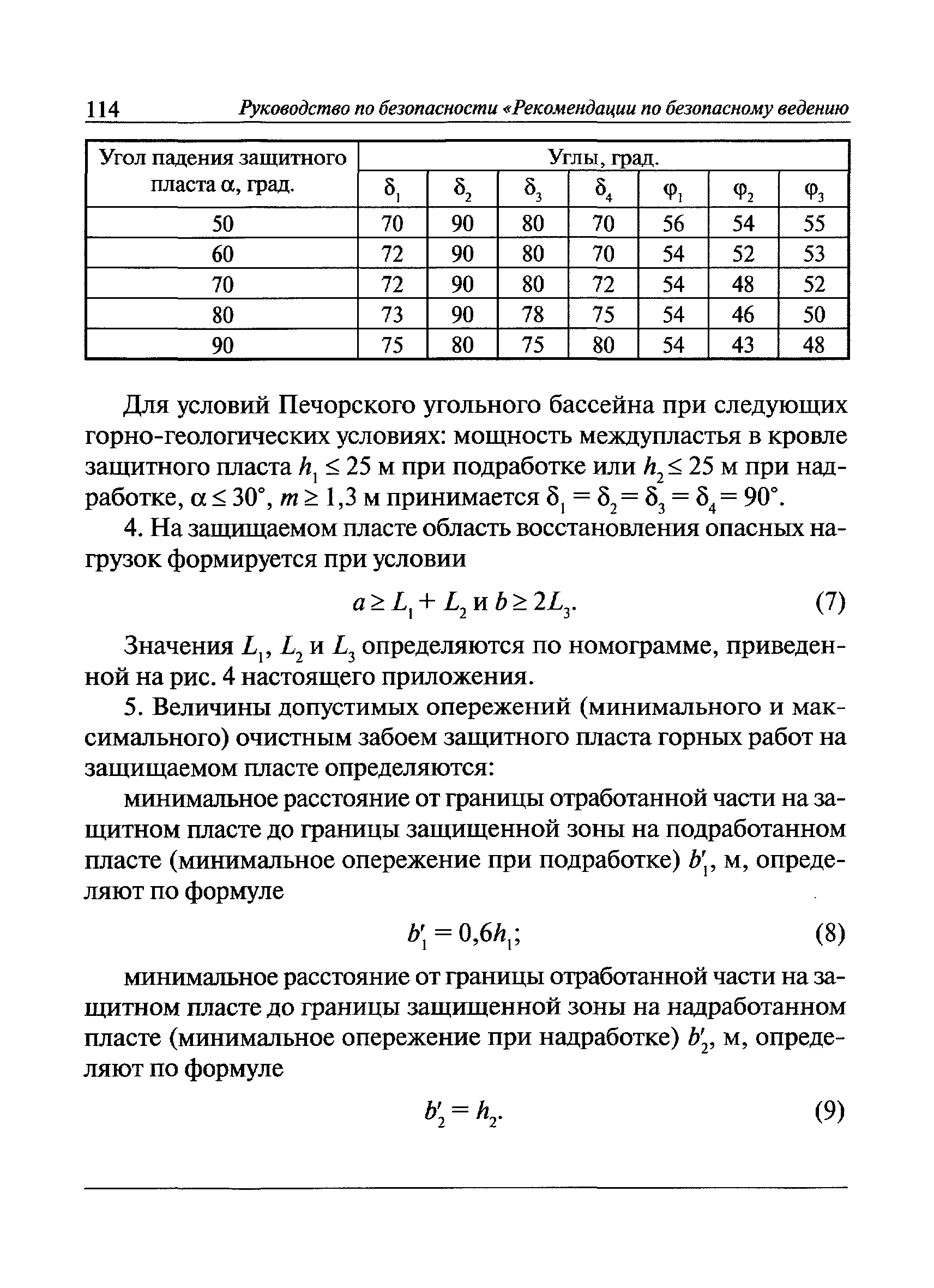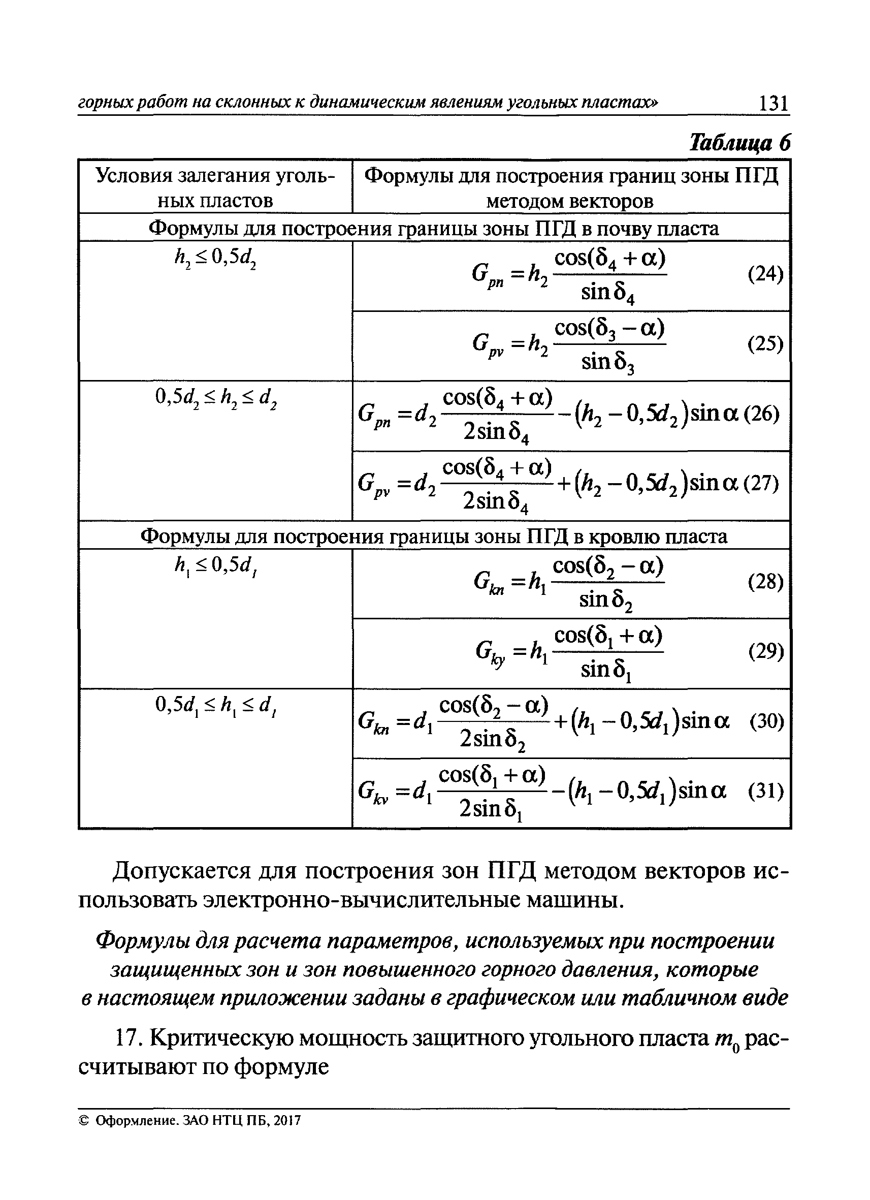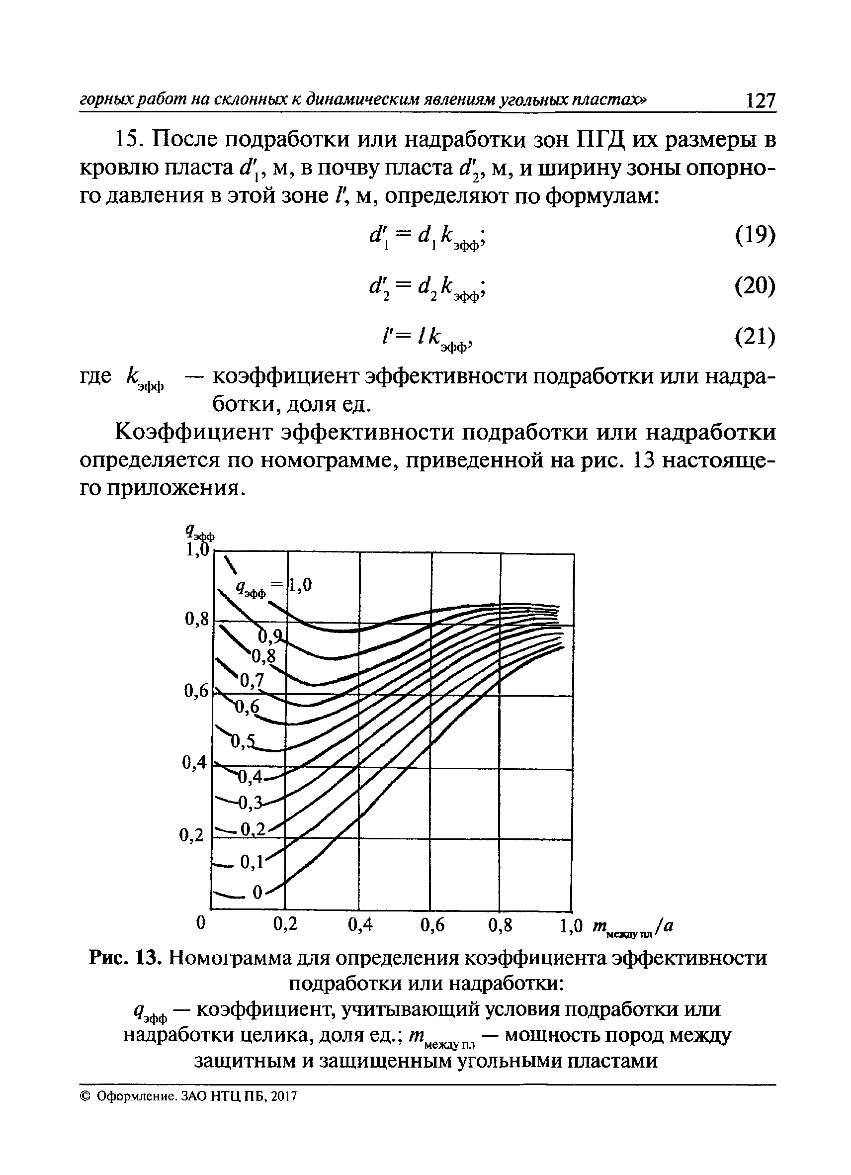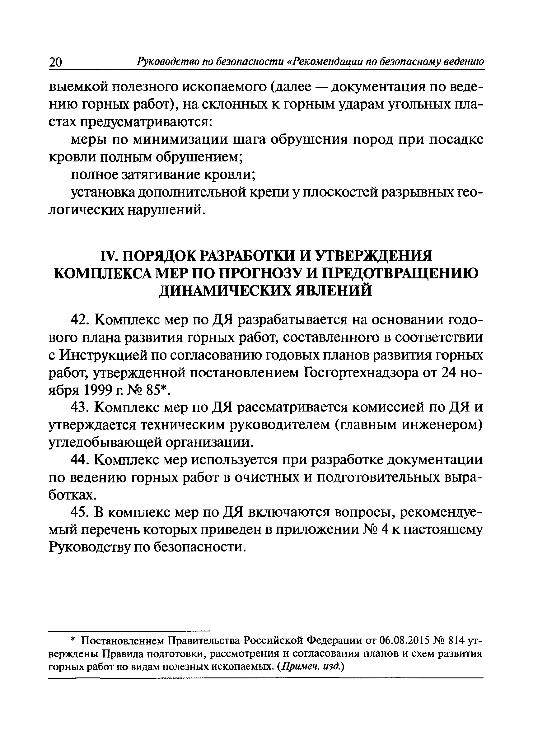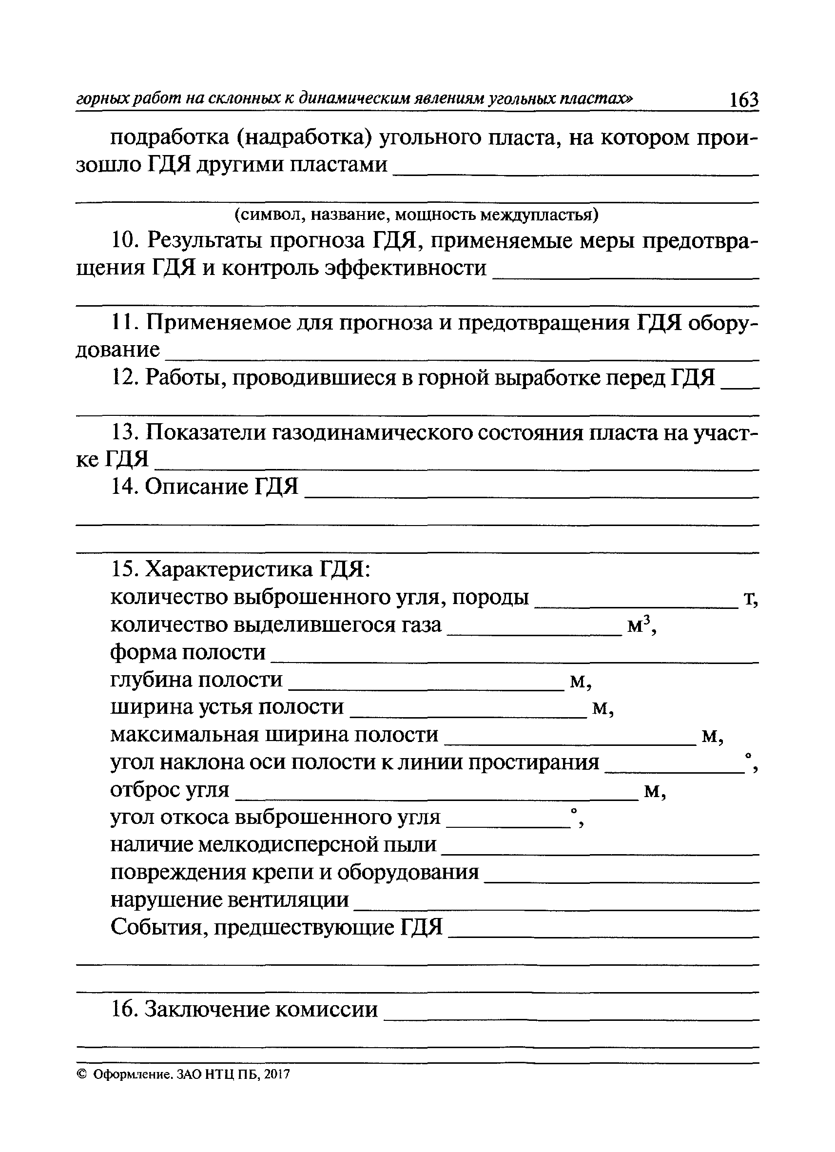 | Оглавление: | Приказ Федеральной службы по экологическому, технологическому и атомному надзору от 21 августа 2017 г. № 327 «Об утверждении Руководства по безопасности «Рекомендации по безопасному ведению горных работ на склонных к динамическим явлениям угольных пластах» Руководство по безопасности «Рекомендации по безопасному ведению горных работ на склонных к динамическим явлениям угольных пластах». I. Общие положения II. Организация работ по предотвращению динамических явлений III. Проектная документация шахт, отрабатывающих склонные к динамическим явлениям угольные пласты IV. Порядок разработки и утверждения комплекса мер по прогнозу и предотвращению динамических явлений V. Ведение горных работ на склонных к динамическим явлениям угольных пластах 1. Вскрытие склонных к динамическим явлениям угольных пластов 1.1. Вскрытие склонных к горным ударам угольных пластов 1.2. Вскрытие склонных к внезапным выбросам угольных пластов (или пропластков мощностью более 0,3 м) 1.3. Меры по предотвращению внезапных выбросов при вскрытии угольных пластов вертикальными стволами 1.3.1. Бурение дренажных скважин 1.3.2. Гидрорыхление угольного пласта 1.3.3. Возведение каркасной крепи 1.4. Меры по предотвращению внезапных выбросов при вскрытии угольных пластов квершлагами и другими полевыми выработками 1.4.1. Бурение дренажных скважин 1.4.2. Гидрорыхление угольного пласта 1.4.3. Увлажнение угольного пласта 1.4.4. Возведение каркасной крепи 2. Порядок отработки свиты угольных пластов 3. Вскрытие и подготовка шахтного поля на склонных к динамическим явлениям угольных пластах 3.1. Вскрытие и подготовка шахтного поля на склонных к горным ударам угольных пластах 3.2. Вскрытие и подготовка шахтного поля на склонных к внезапным выбросам угольных пластах 4. Проведение горных выработок 4.1. Проведение горных выработок на склонных к горным ударам угольных пластах 4.2. Проведение горных выработок на склонных к внезапным выбросам угольных пластах 5. Ведение очистных работ 5.1. Ведение очистных работ на склонных к горным ударам угольных пластах 5.2. Ведение очистных работ на склонных к выбросам угольных пластах 6. Ведение горных работ на склонных к внезапным высыпаниям угольных пластах крутого и крутонаклонного залегания 7. Меры по предотвращению динамических явлений 7.1. Региональные меры по предотвращению динамических явлений 7.1.1. Опережающая отработка защитных угольных пластов 7.1.2. Гидрообработка угольного пласта 7.1.3. Дегазация угольного пласта 7.2. Локальные меры по предотвращению динамических явлений 7.2.1. Бурение разгрузочных скважин 7.2.2. Меры по предотвращению динамических явлений при проведении подготовительных выработок в зонах повышенного горного давления по пласту Тройному Воркутского месторождения 7.2.3. Параметры разгрузочных скважин, в процессе бурения которых проводятся прогноз удароопасности и (или) выбросоопасности и оценка эффективности мер по предотвращению динамических явлений по параметрам искусственного акустического сигнала 7.2.4. Гидрообработка угольного пласта 7.2.5. Камуфлетное взрывание 7.3. Рекомендуемые ограничения по совмещению технологических процессов и мер по предотвращению внезапных выбросов VI. Мониторинг массива горных пород по геофизическим наблюдениям 1. Мониторинг массива горных пород по непрерывным сейсмическим наблюдениям 2. Мони