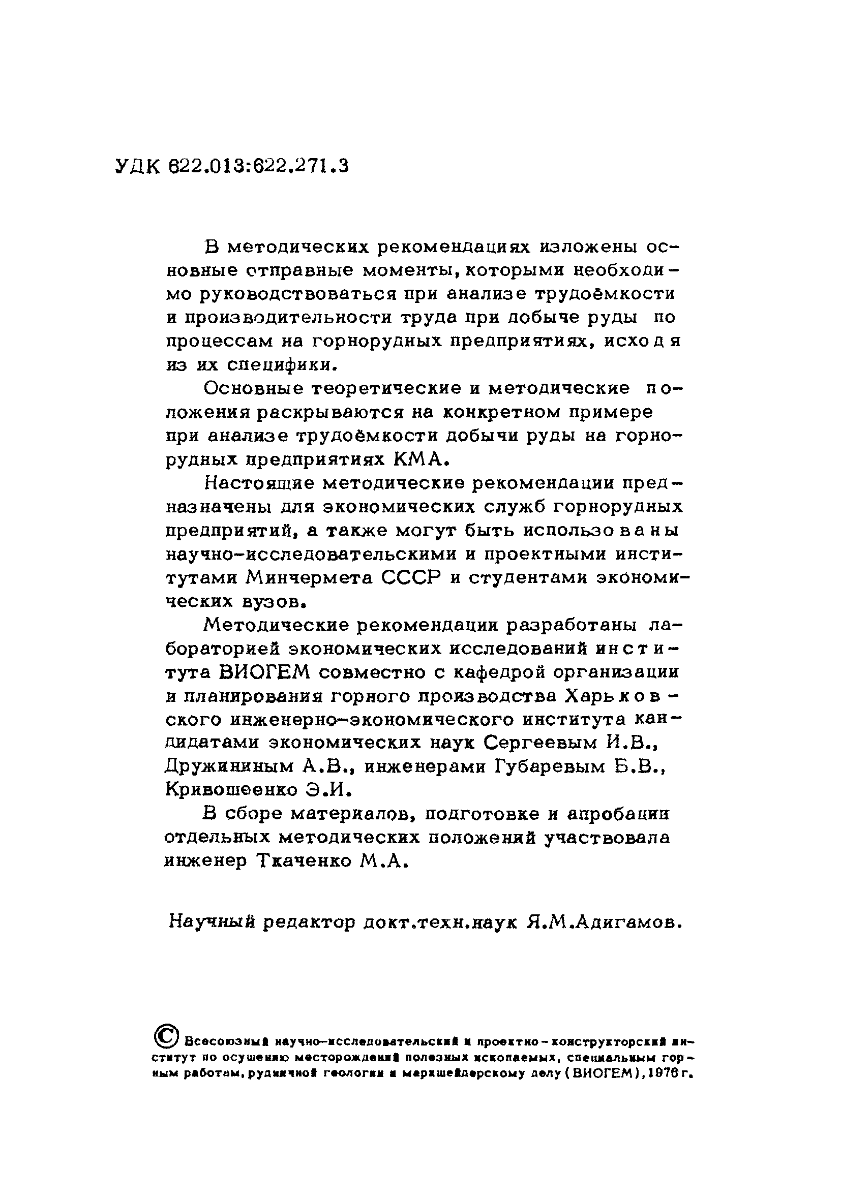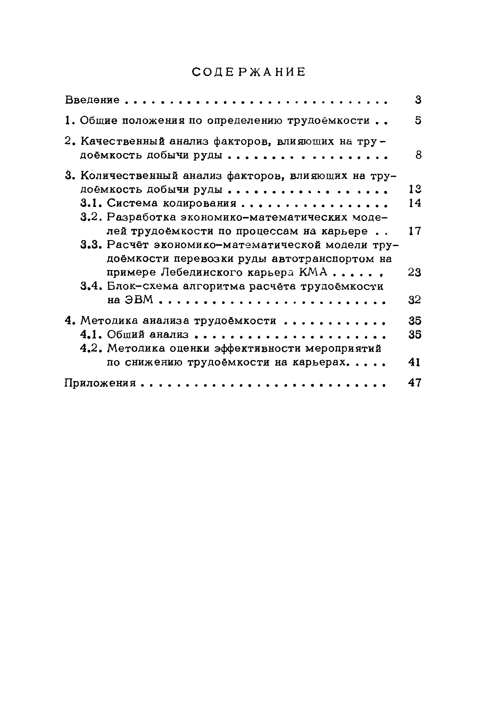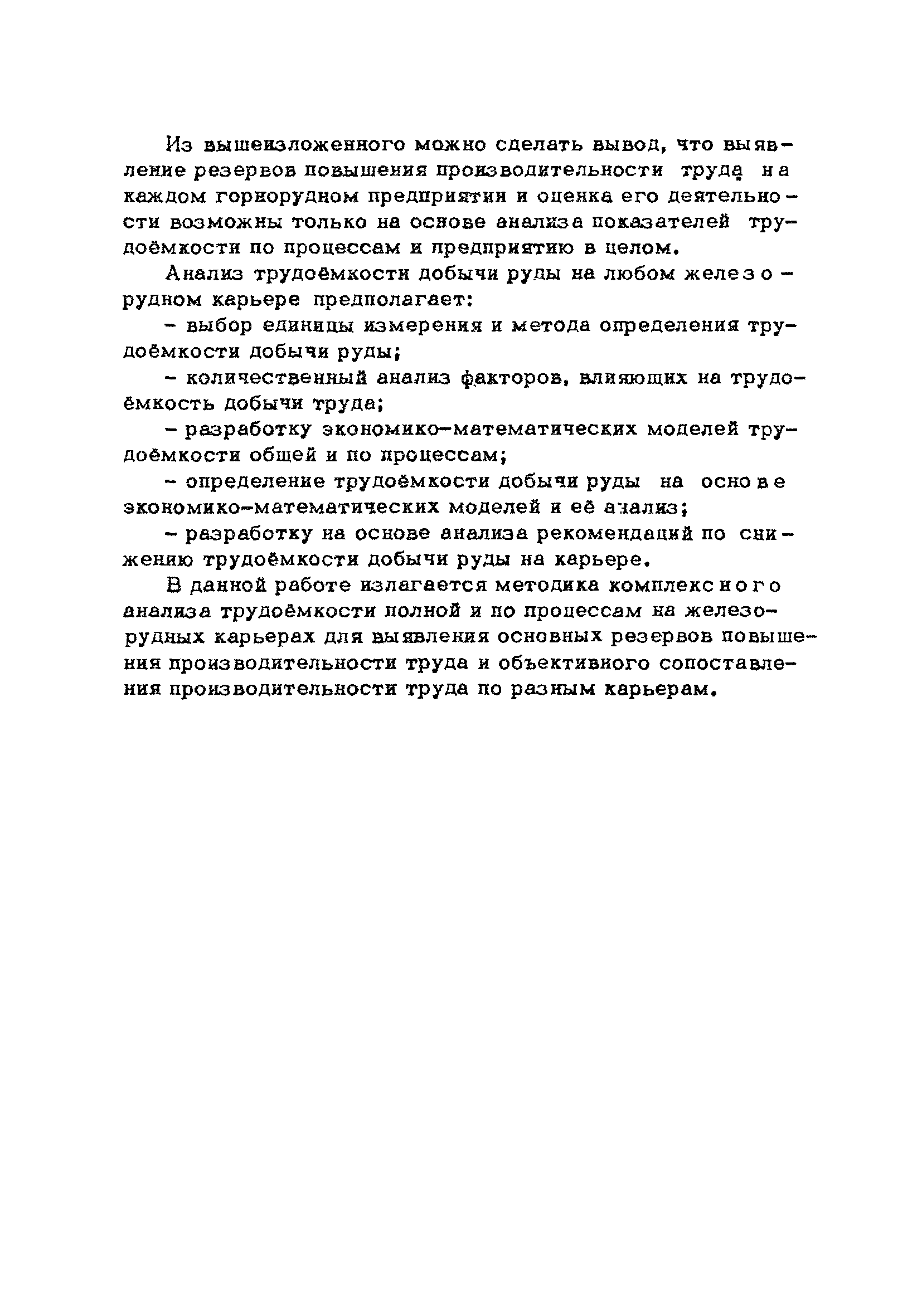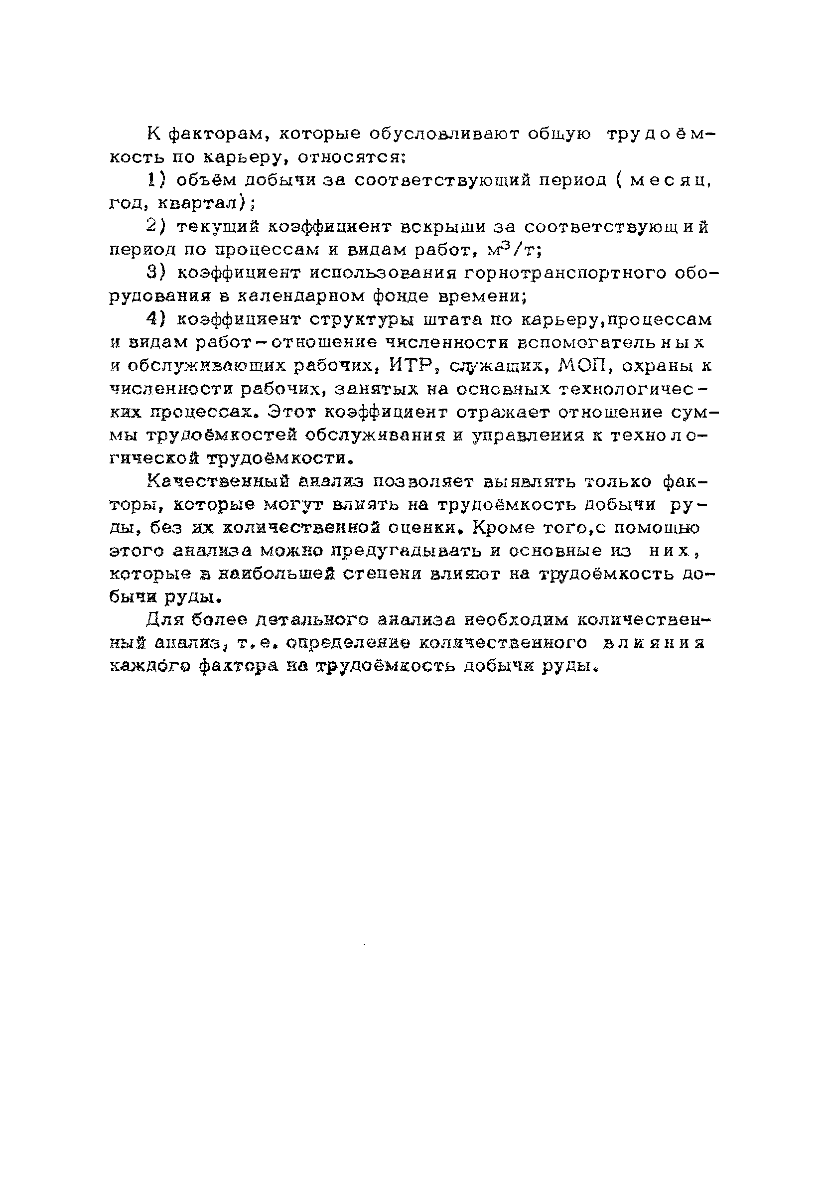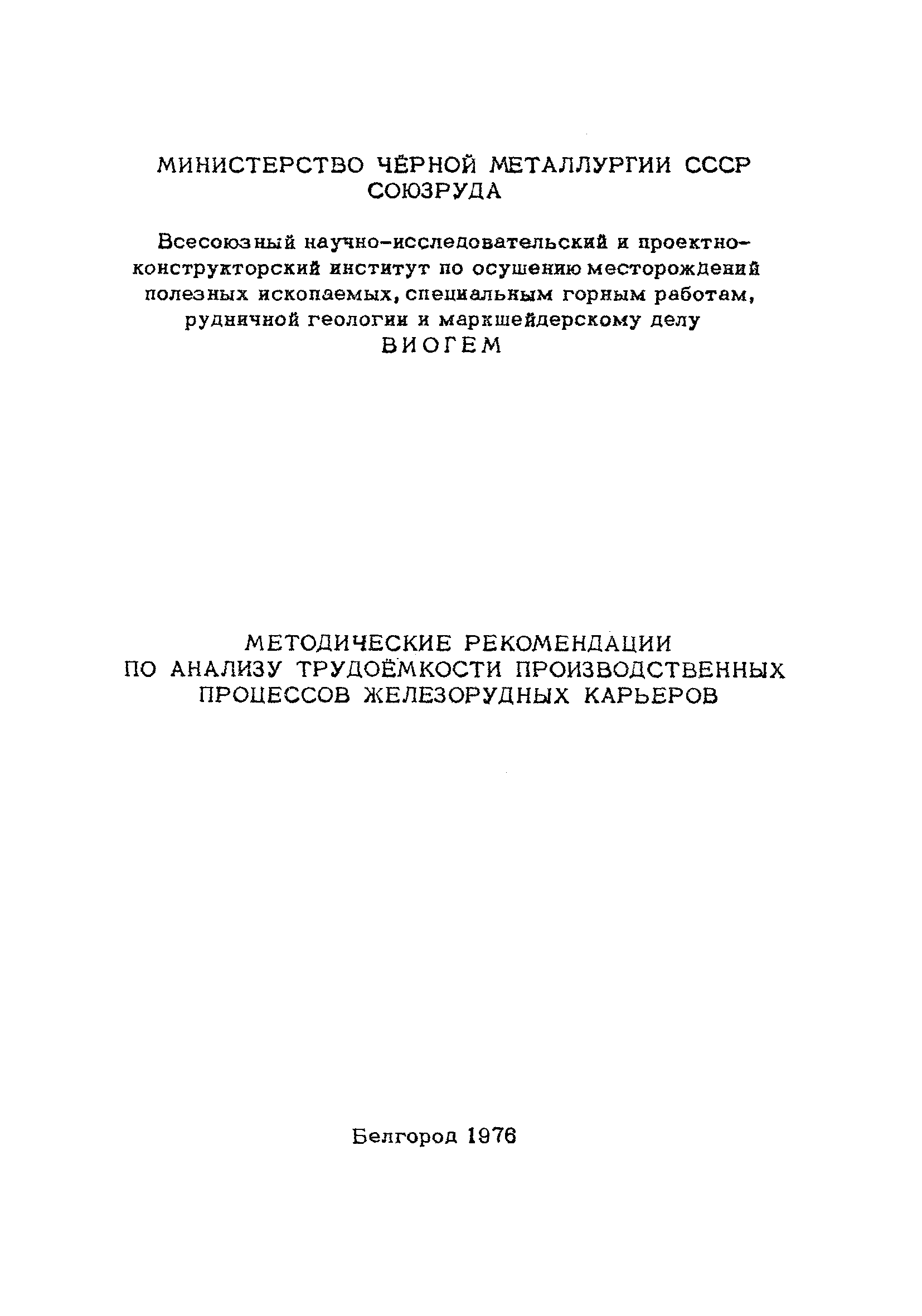 Методические рекомендации по анализу трудоемкости производственных процессов железорудных карьеров| Статус: | справочные материалы, мп, тпр | | Название рус.: | Методические рекомендации по анализу трудоемкости производственных процессов железорудных карьеров | | Дата добавления в базу: | 01.01.2018 | | Дата актуализации: | 01.01.2021 | | Область применения: | В методических рекомендациях изложены основные отправные моменты, которыми необходимо руководствоваться при анализе трудоемкости и производительности труда при добыче руды по процессам на горнорудных предприятиях, исходя из их специфики. Методические рекомендации предназначены для экономических служб горнорудных предприятий, а также могут быть использованы научно-исследовательскими и проектными институтами Минчермета СССР и студентами экономических вузов. | | Оглавление: | Введение 1 Общие положения по определению трудоёмкости 2 Качественный анализ факторов, влияющих на трудоёмкость добычи руды 3 Количественный анализ факторов, влияющих на трудоёмкость добычи руды 3.1 Система кодирования 3.2 Разработка экономико—математических моделей трудоёмкости по процессам на карьере 3.3 Расчёт экономико—математической модели трудоёмкости перевозки руды автотранспортом на примере Лебединского карьера КМА 3.4 Блок-схема алгоритма расчёта трудоёмкости на ЭВМ 4 Методика анализа трудоёмкости 4.1 Общий анализ 4.2 Методика оценки эффективности мероприятий по снижению трудоёмкости на карьерах Приложение 1. Расчет трудоемкости по Лебединскому карьеру Приложение 2. Изменения трудоемкости по процессам на Лебединском карьере, соответствующие изменению материально-технических условий производства Приложение 3. Экономико-математические модели трудоемкости по процессам на карьерах КМА, человеко-час на 1000 т руды | | Разработан: | ВИОГЕМ