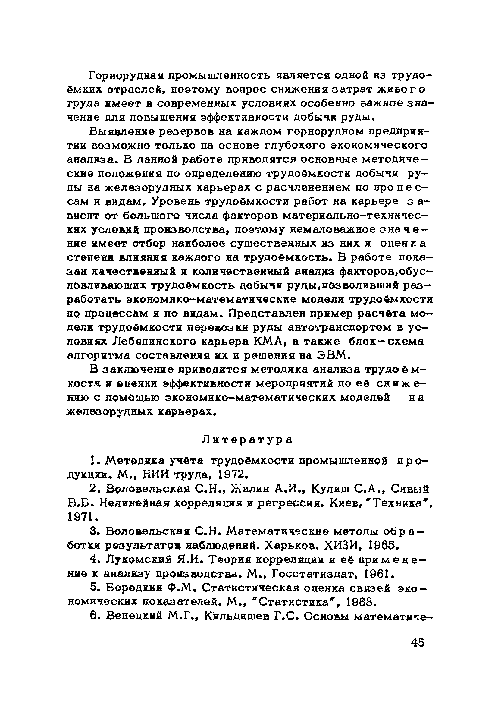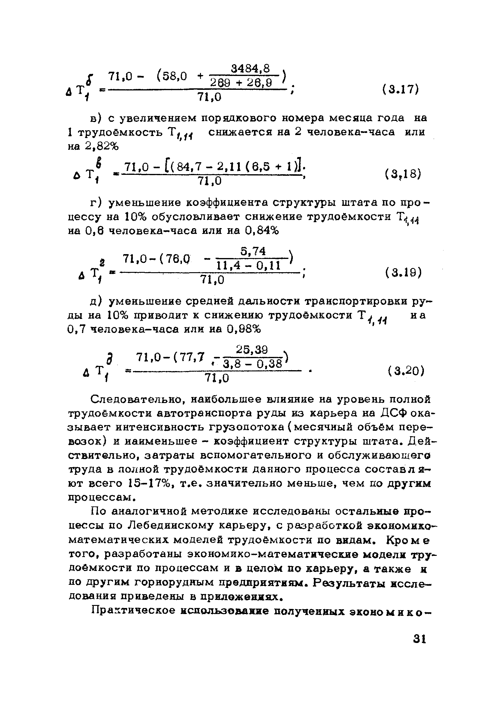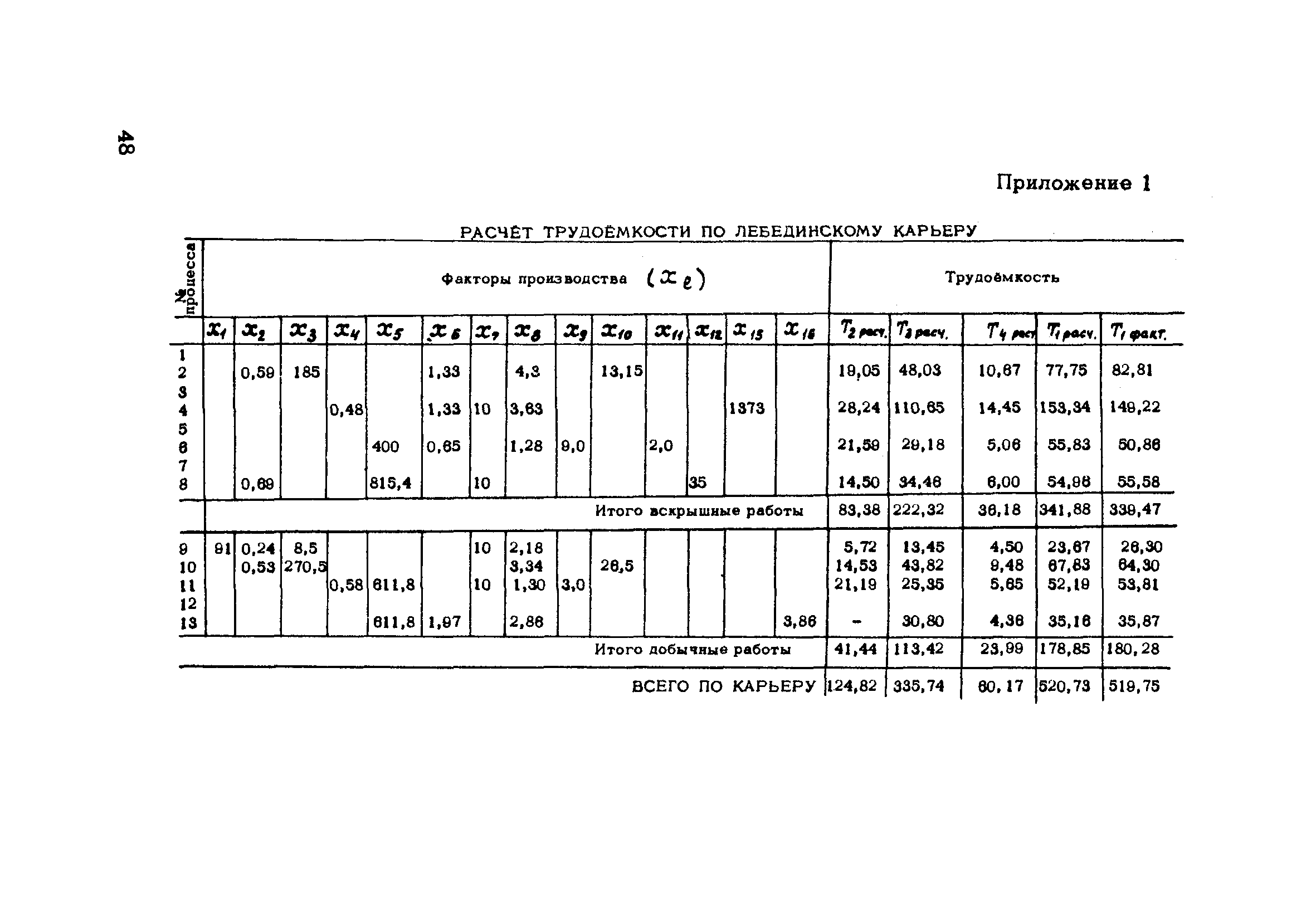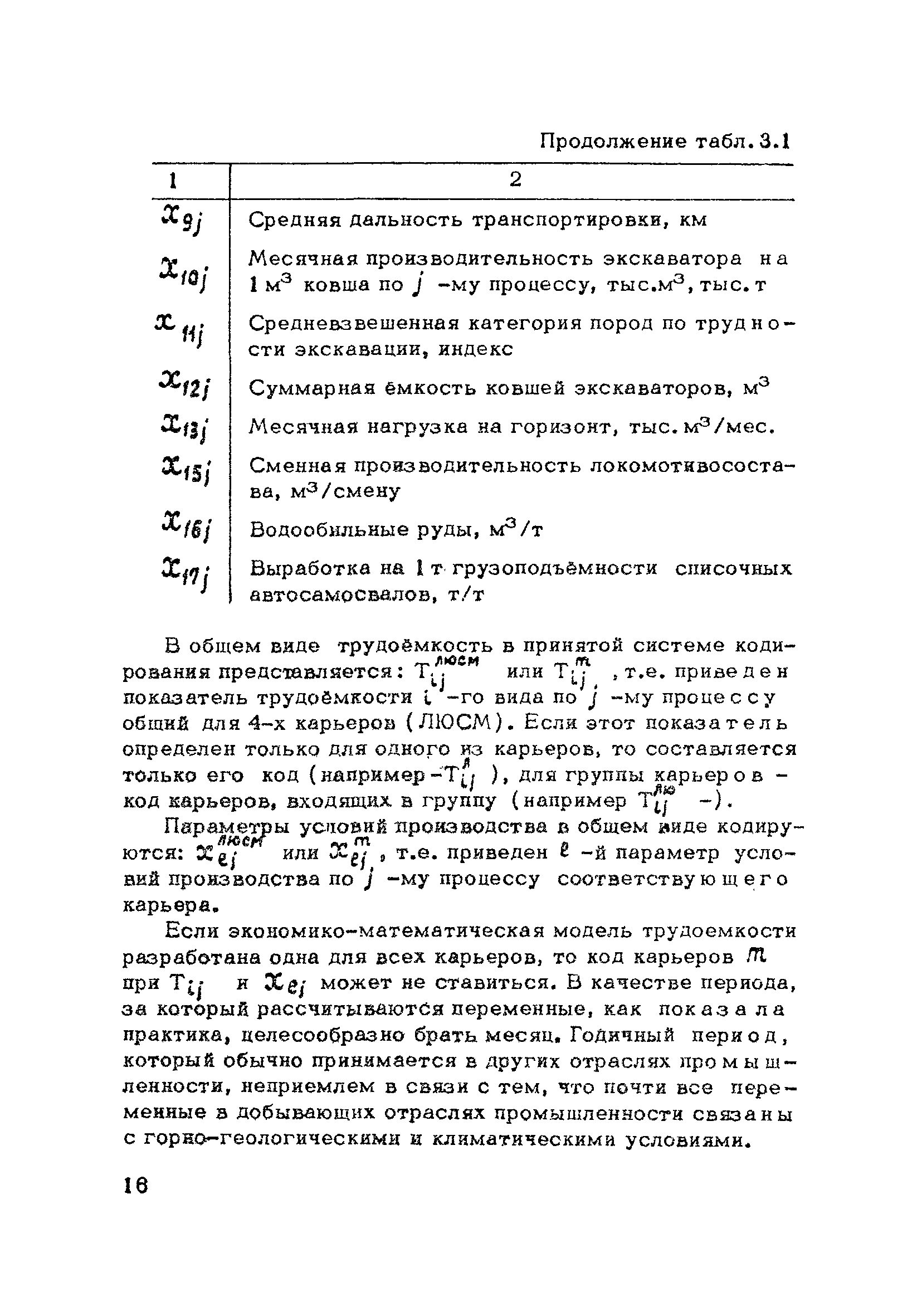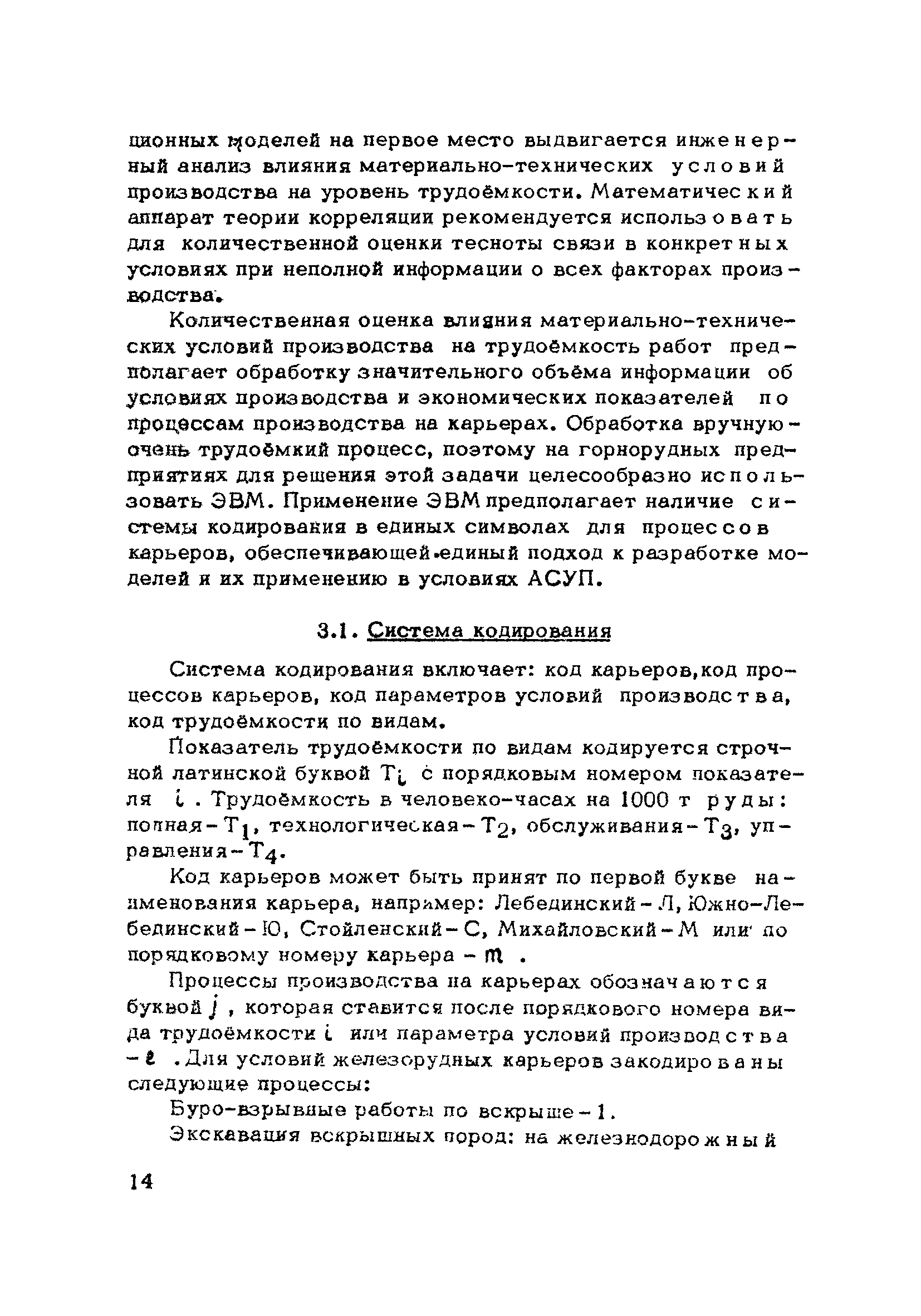 Методические рекомендации по анализу трудоемкости производственных процессов железорудных карьеров| Статус: | справочные материалы, мп, тпр | | Название рус.: | Методические рекомендации по анализу трудоемкости производственных процессов железорудных карьеров | | Дата добавления в базу: | 01.01.2018 | | Дата актуализации: | 01.01.2021 | | Область применения: | В методических рекомендациях изложены основные отправные моменты, которыми необходимо руководствоваться при анализе трудоемкости и производительности труда при добыче руды по процессам на горнорудных предприятиях, исходя из их специфики. Методические рекомендации предназначены для экономических служб горнорудных предприятий, а также могут быть использованы научно-исследовательскими и проектными институтами Минчермета СССР и студентами экономических вузов. | | Оглавление: | Введение 1 Общие положения по определению трудоёмкости 2 Качественный анализ факторов, влияющих на трудоёмкость добычи руды 3 Количественный анализ факторов, влияющих на трудоёмкость добычи руды 3.1 Система кодирования 3.2 Разработка экономико—математических моделей трудоёмкости по процессам на карьере 3.3 Расчёт экономико—математической модели трудоёмкости перевозки руды автотранспортом на примере Лебединского карьера КМА 3.4 Блок-схема алгоритма расчёта трудоёмкости на ЭВМ 4 Методика анализа трудоёмкости 4.1 Общий анализ 4.2 Методика оценки эффективности мероприятий по снижению трудоёмкости на карьерах Приложение 1. Расчет трудоемкости по Лебединскому карьеру Приложение 2. Изменения трудоемкости по процессам на Лебединском карьере, соответствующие изменению материально-технических условий производства Приложение 3. Экономико-математические модели трудоемкости по процессам на карьерах КМА, человеко-час на 1000 т руды | | Разработан: | ВИОГЕМ