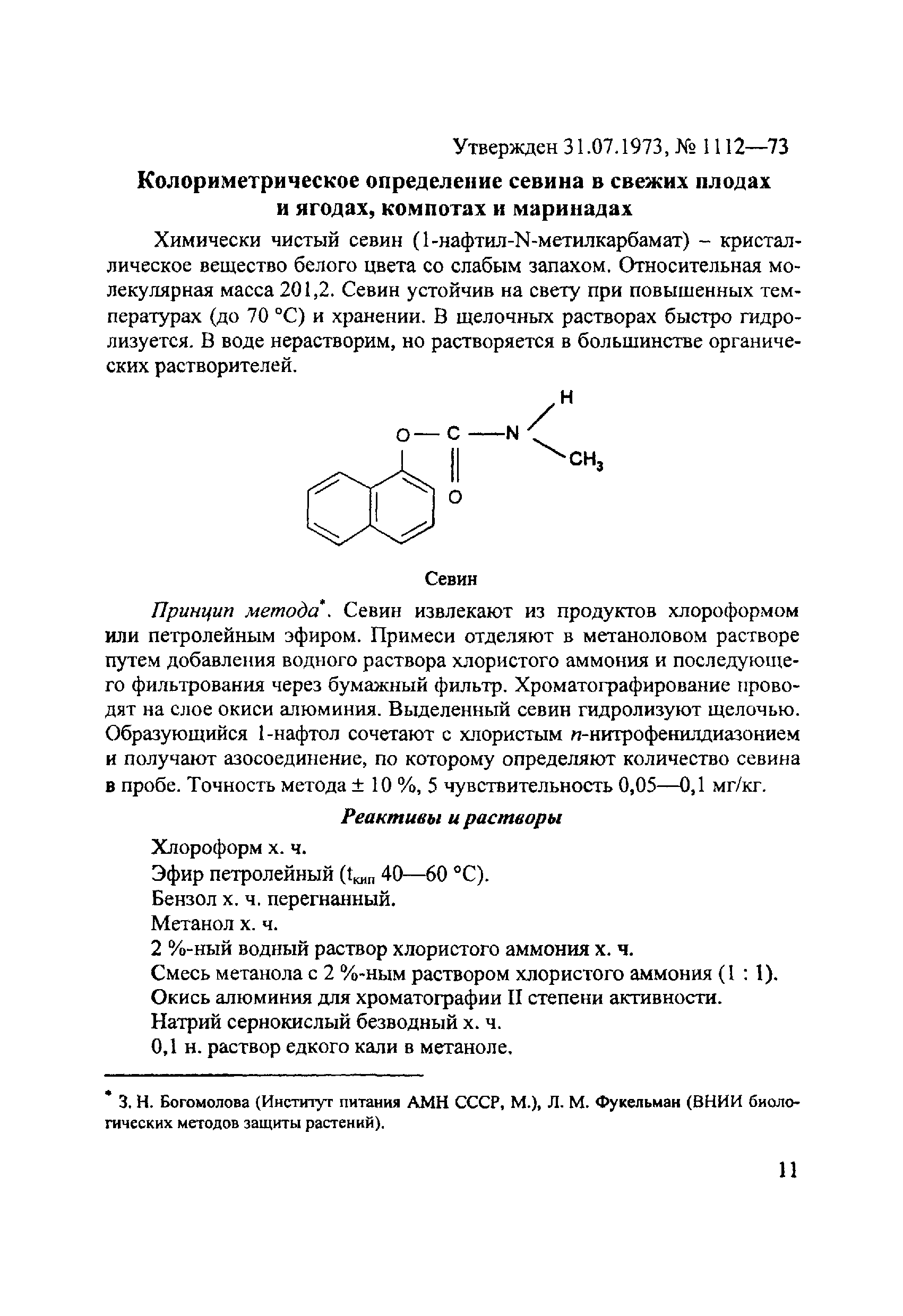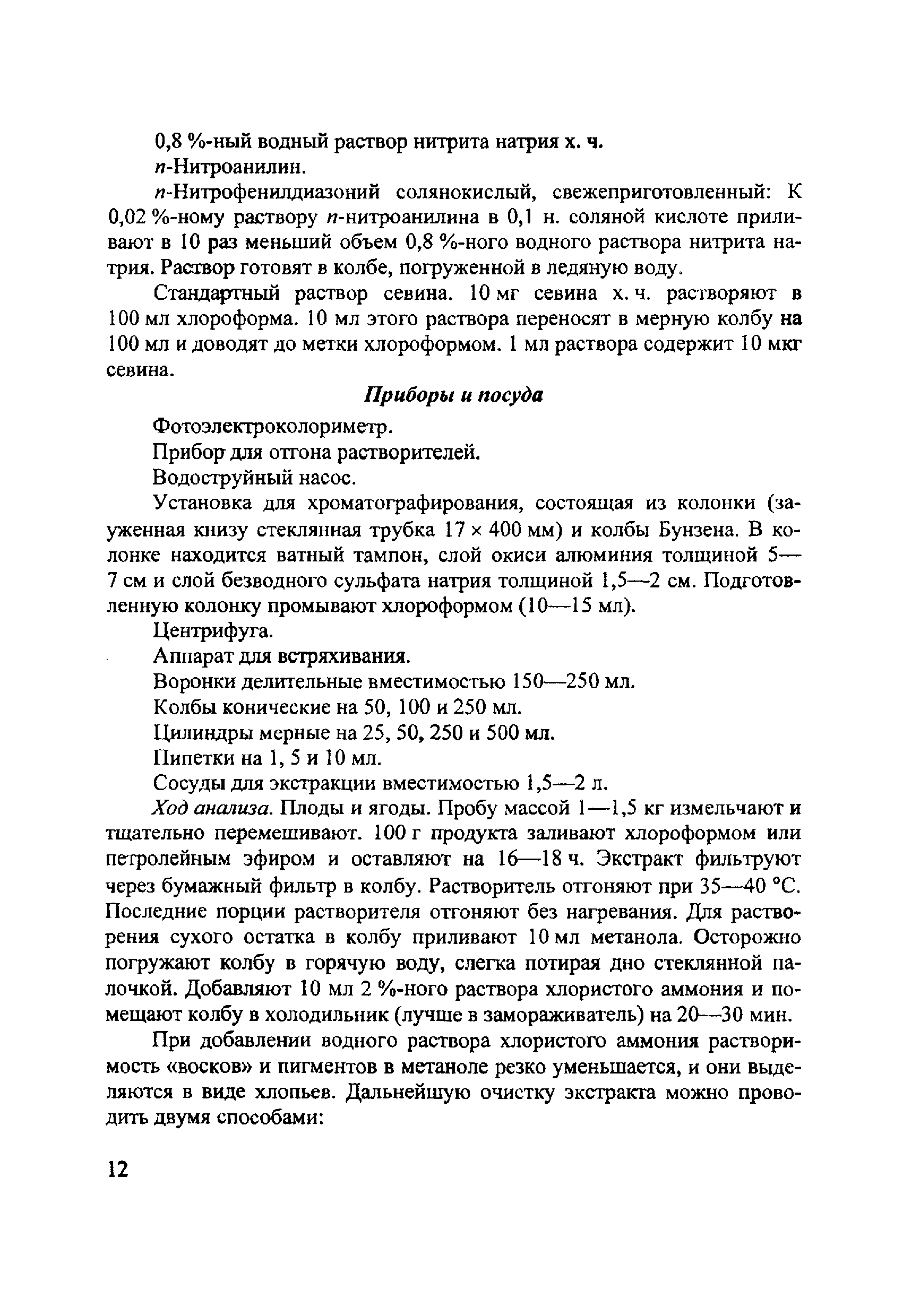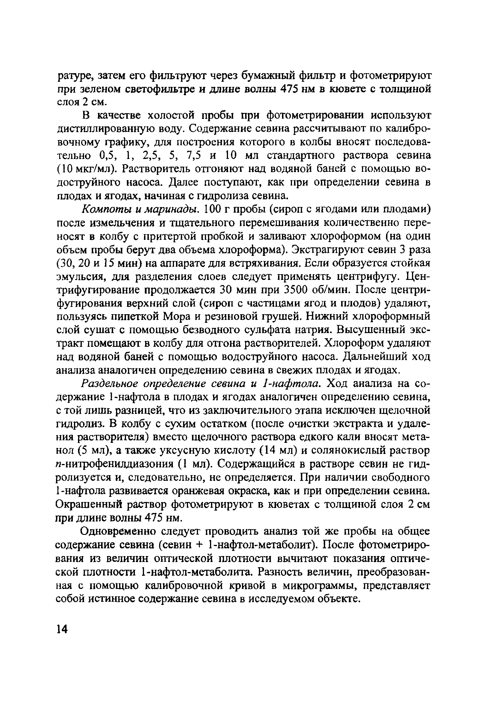 Колориметрическое определение севина в свежих плодах и ягодах, компотах и маринадах| Статус: | действует | | Название рус.: | Колориметрическое определение севина в свежих плодах и ягодах, компотах и маринадах | | Дата добавления в базу: | 01.01.2018 | | Дата актуализации: | 01.01.2021 | | Оглавление: | Реактивы и растворы Приборы и посуда Ход анализа Компоты и маринады Раздельное определение севина и 1-нафтола | | Разработан: | Институт питания АМН СССР ВНИИ биологических методов защиты растений