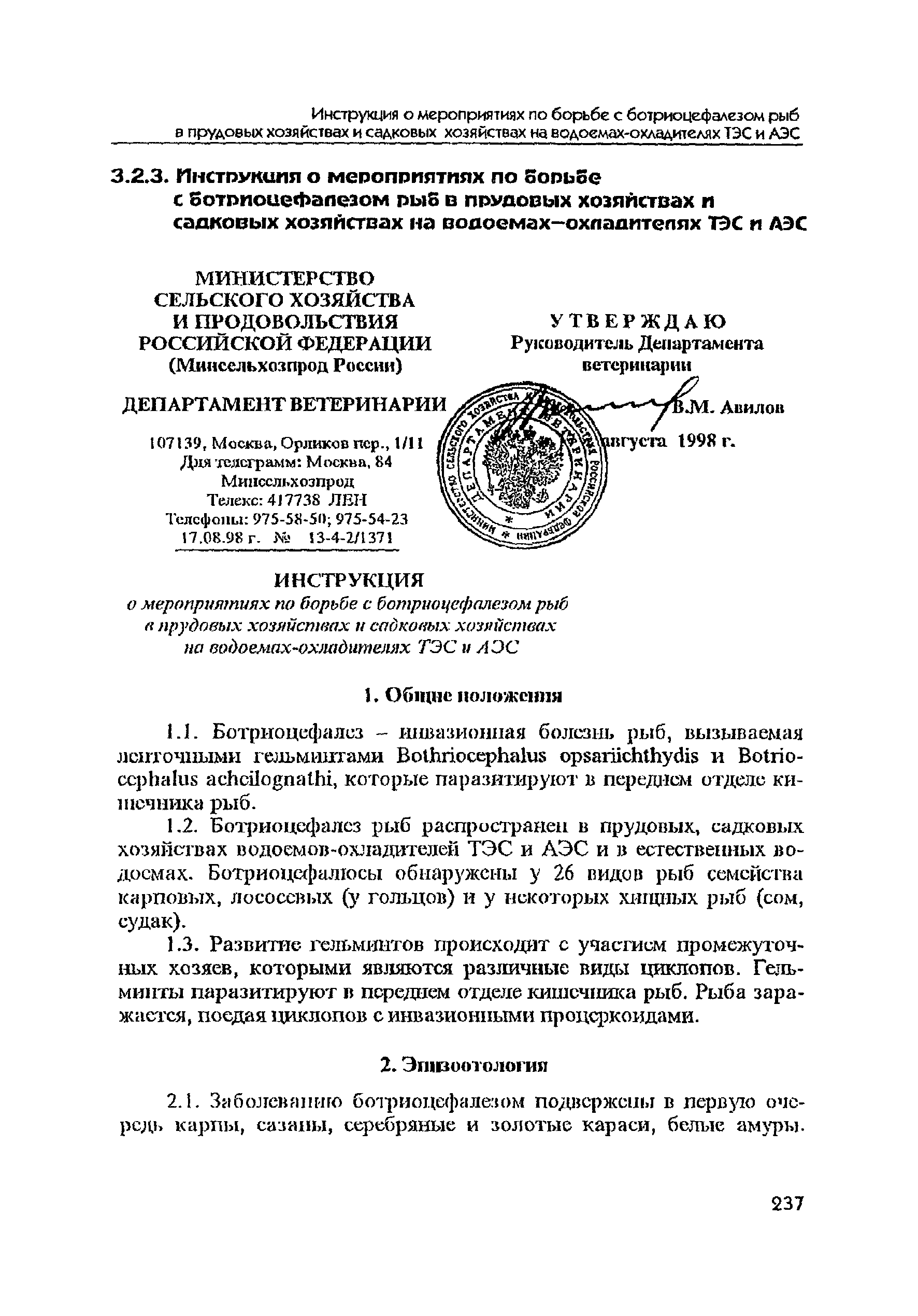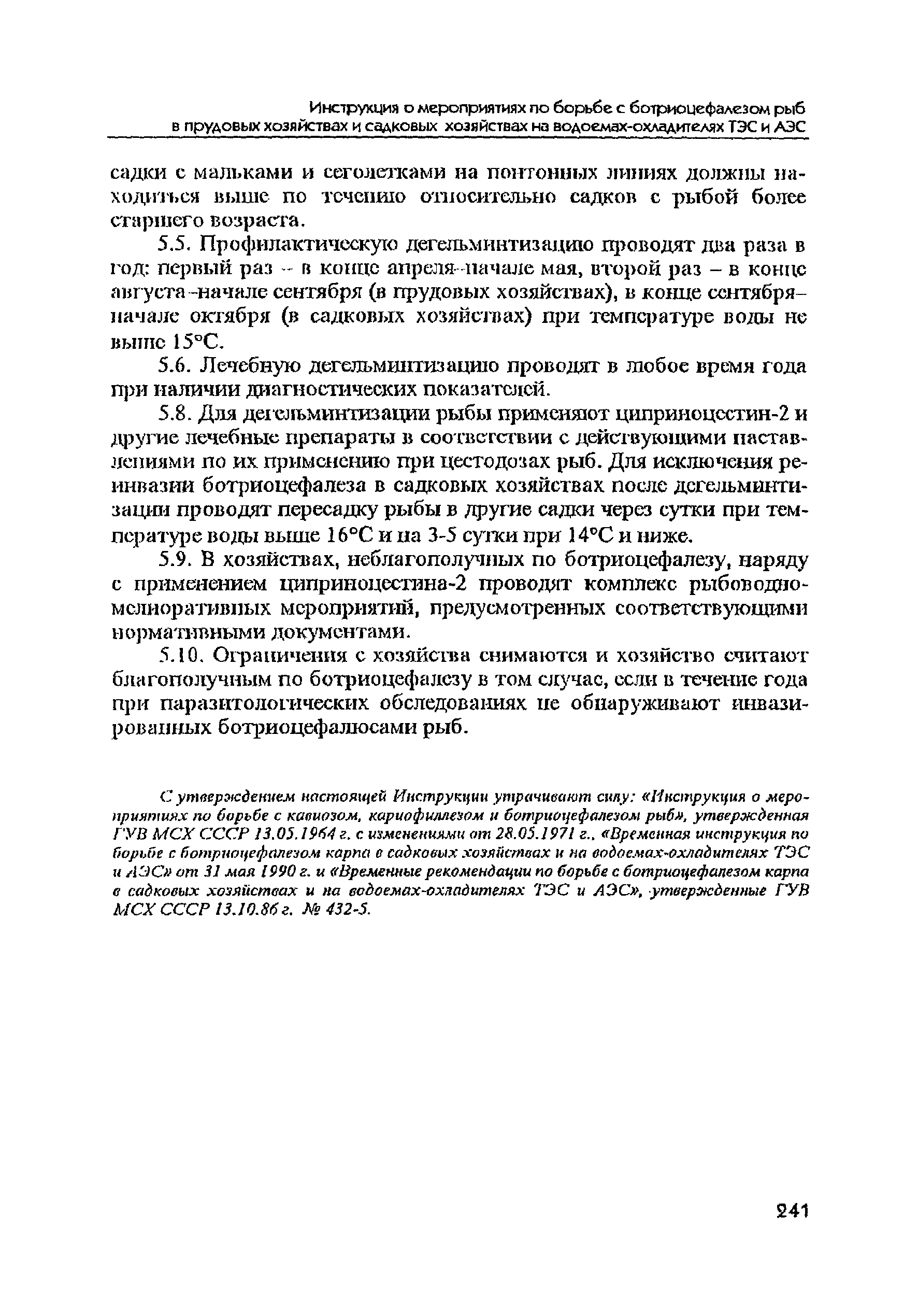 | Название рус.: | Инструкция о мероприятиях по борьбе с ботриоцефалезом рыб в прудовых хозяйствах и садковых хозяйствах на водоемах-охладителях ТЭС и АЭС |