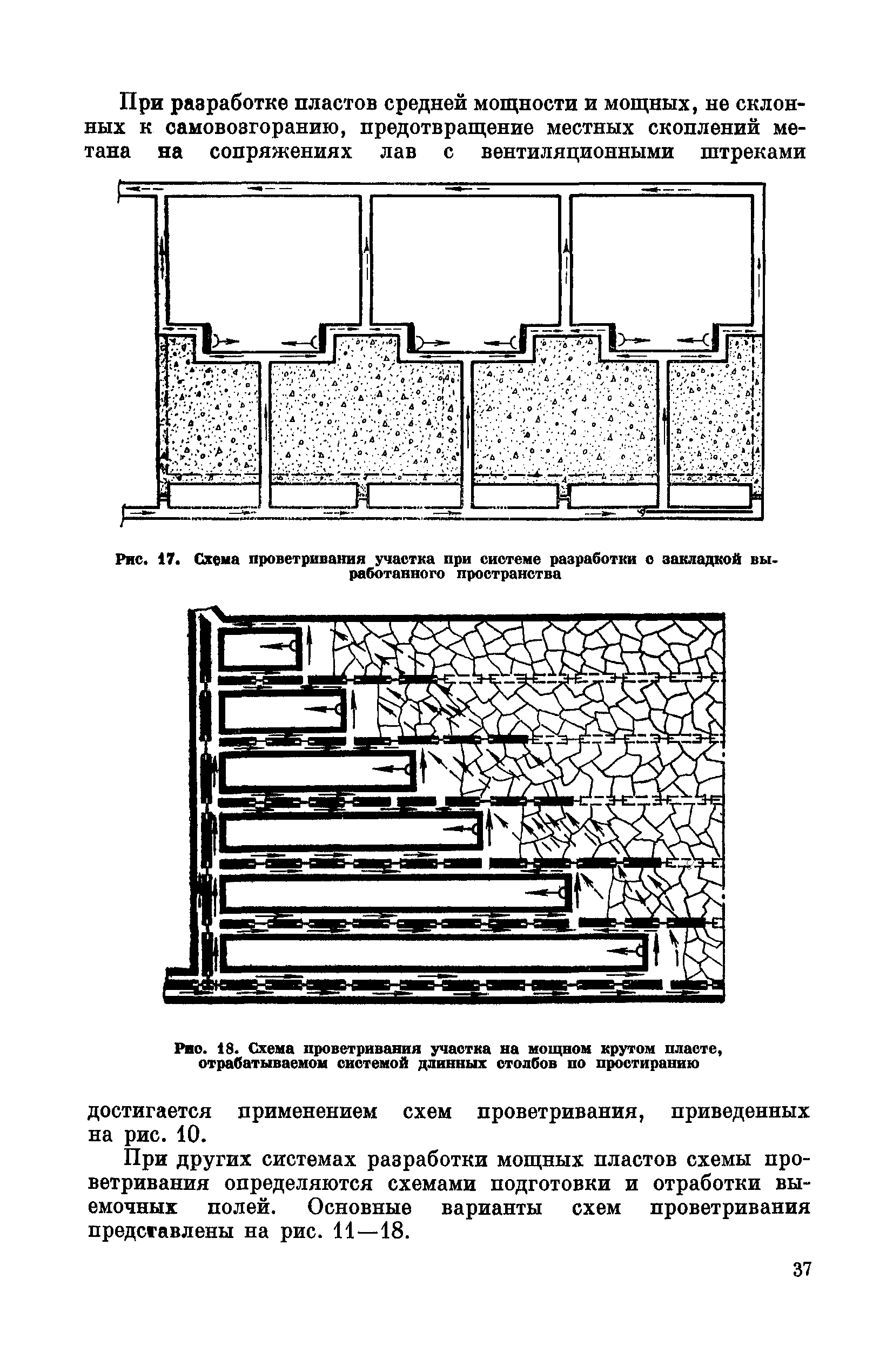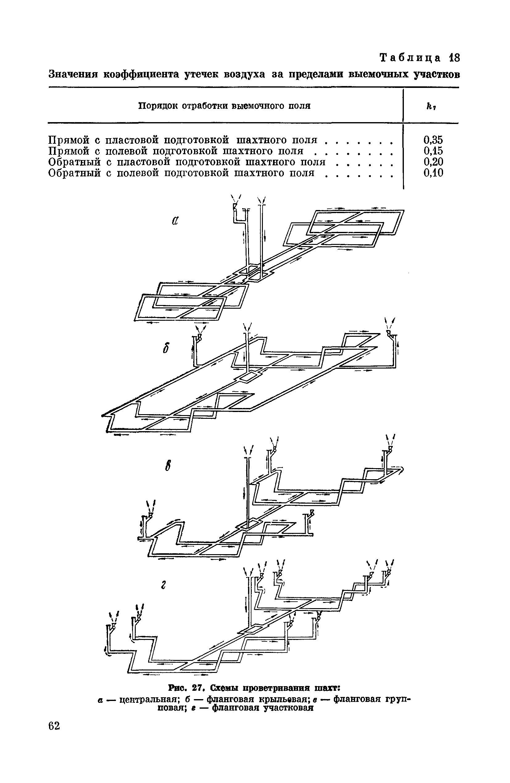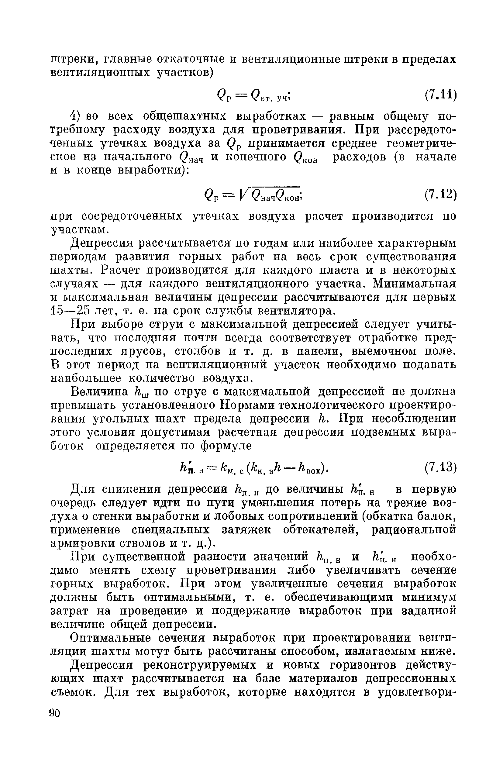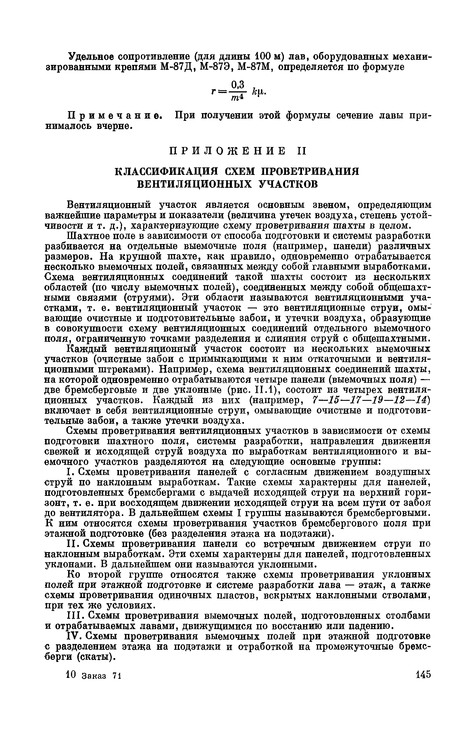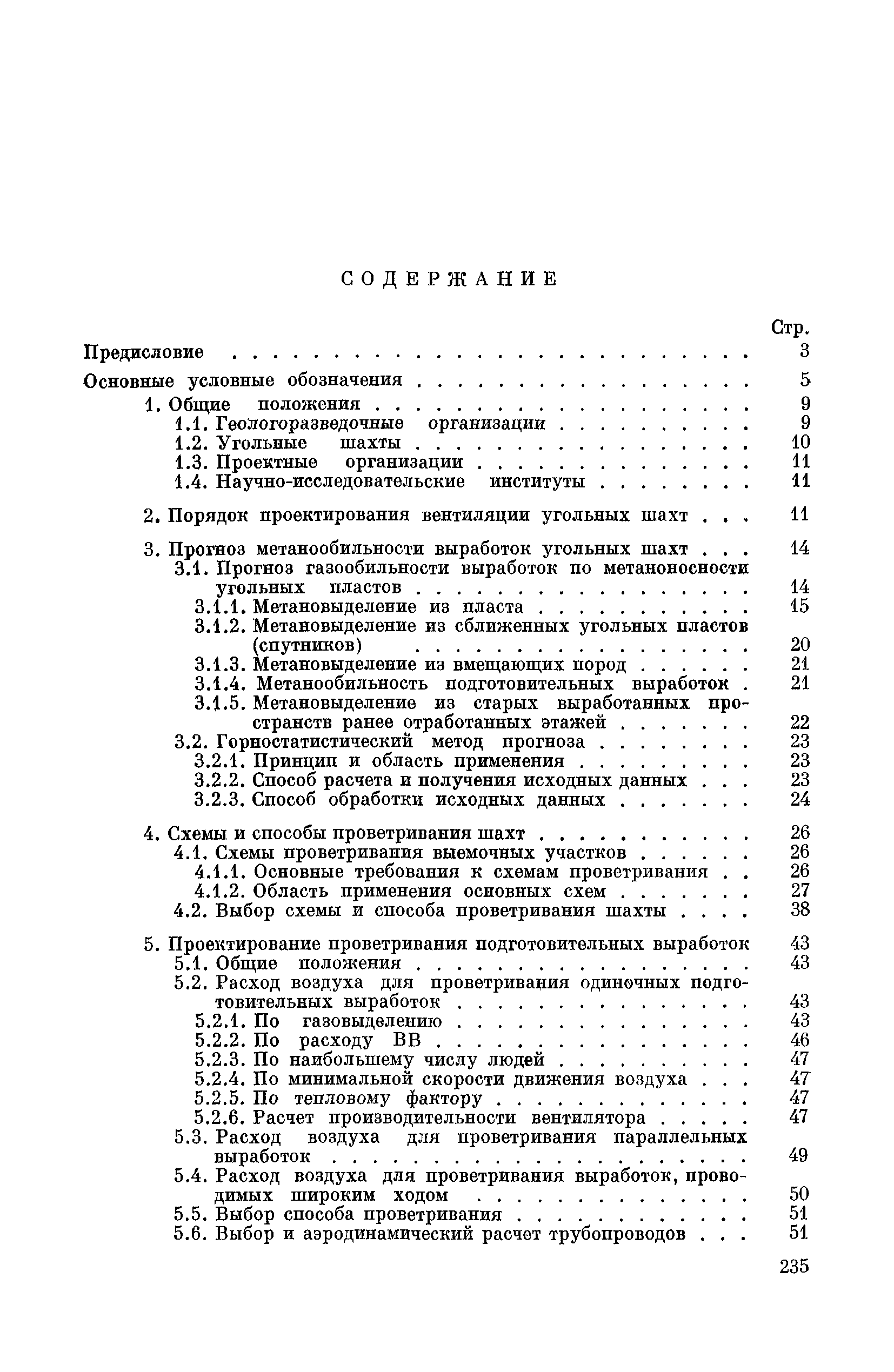| Оглавление: | Предисловие Основные условные обозначения 1 Общие положения 1.1 Геологоразведочные организации 1.2 Угольные шахты 1.3 Проектные организации 1.4 Научно-исследовательские институты 2 Порядок проектирования вентиляции угольных шахт 3 Прогноз метанообильности выработок угольных шахт 3.1 Прогноз газообильности выработок по метаноносности угольных пластов 3.1.1 Метановыделение из пласта 3.1.2 Метановыделение из сближенных угольных пластов (спутников) 3.1.3 Метановыделение из вмещающих пород 3.1.4 Метанообильность подготовительных выработок 3.1.5 Метановыделение из старых выработанных пространств ранее отработанных этажей 3.2 Горностатистический метод прогноза 3.2.1 Принцип п область применения 3.2.2 Способ расчета и получения исходных данных 3.2.3 Способ обработки исходных данных 4 Схемы и способы проветривания шахт 4.1 Схемы проветривания выемочных участков 4.1.1 Основные требования к схемам проветривания 4.1.2 Область применения основных схем 4.2 Выбор схемы и способа проветривания шахты 5 Проектирование проветривания подготовительных выработок 5.1 Общие положения 5.2 Расход воздуха для проветривания одиночных подготовительных выработок 5.2.1 По газовыделению 5.2.2. По расходу ВВ 5.2.3 По наибольшему числу людей 5.2.4 По минимальной скорости движения воздуха 5.2.5 По тепловому фактору 5.2.6 Расчет производительности вентилятора 5.3 Расход воздуха для проветривания параллельных выработок 5.4 Расход воздуха для проветривания выработок, проводимых широким ходом 5.5 Выбор способа проветривания 5.6 Выбор и аэродинамический расчет трубопроводов 5.7 Выбор вентиляторов жесткого проветривания 5.8 Установка вентиляторов местного проветривания 6 Расчет расхода воздуха для проветривания угольных шахт 6.1 Общие положения 6.2 Упрощенный расчет расхода воздуха 6.2.1 Для Донецкого бассейна и шахт с аналогичными условиями 6.2.2 Для Кузнецкого бассейна и шахт с аналогичными условиями 6.3 Допустимая нагрузка на очистную выработку по газовому фактору 6.3.1 Для забоев типа лав 6.3.2 Для систем разработки с очистными забоями типа камер 6.4 Полный расчет расхода воздуха 6.4.1 Расход воздуха для проветривания забоев 6.4.2 Расход воздуха для проветривания выемочного участка 6.4.3 Расход воздуха для проветривания камер 6.4.4 Утечки воздуха через вентиляционные сооружения 6.4.5 Расход воздуха для проветривания вентиляционного участка и шахты 6.4.6 Производительность вентиляторных установок 7 Расчет депрессии шахт 7.1 Общешахтная депрессия 7.2 Расчет оптимальных сечений выработок 7.2.1 Исходные данные 7.2.2 Определение расчетной депрессии направлений 7.2.3 Обеспечение точности результата упрощенного расчета 7.2.4 Выбор определяющего направления 7.2.5 Расчет сечений выработок направления 7.2.6 Возможная корректировка местоположения воздухоподающего и вентиляционного стволов 7.2.7 Техника расчета сечений выработок 7.3 Размещение и расчет регуляторов распределения воздуха в горных выработках 8 Выбор вентиляторов 8.1 Вентиляторы для одиночной работы 8.2 Вентиляторы для совместной работы 9 Определение устойчивости проветривания шахт и повышение ее при конструировании схем 9.1 Расчет устойчивости проветривания 9.1.1 Общие сведения 9.1.2 Исходные данные и порядок анализа 9.1.3 Нахождение диагоналей и ветвей, влияющих на направление движения воздуха в диагоналях 9.1.4 Предварительный анализ устойчивости 9.1.5 О
