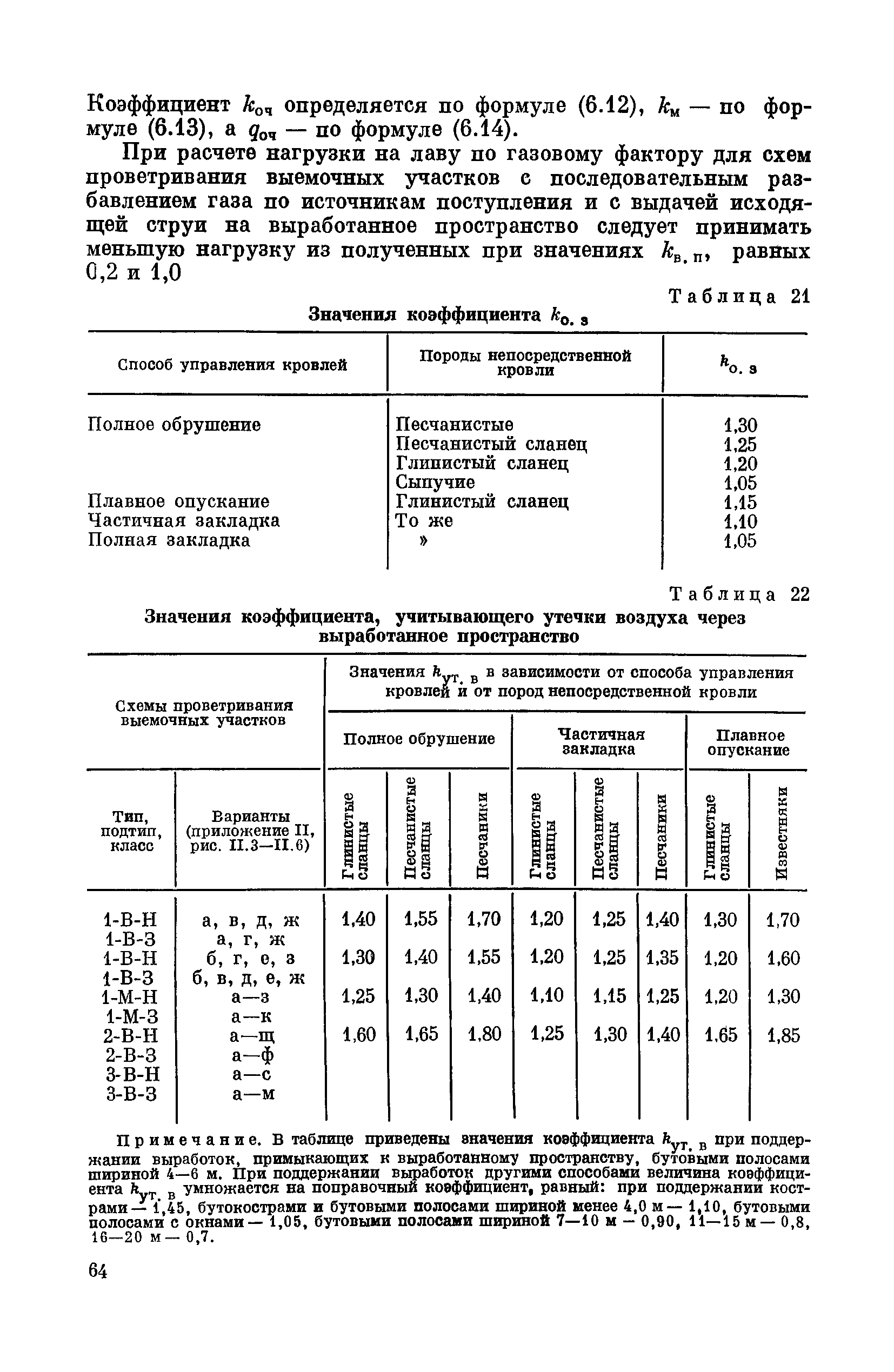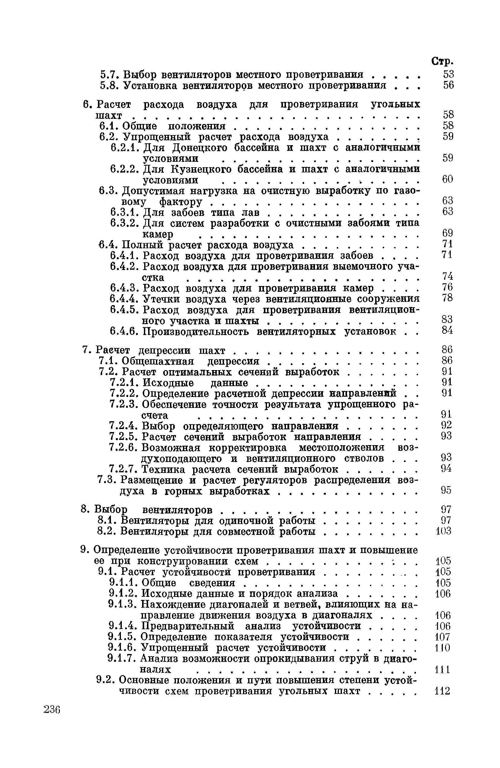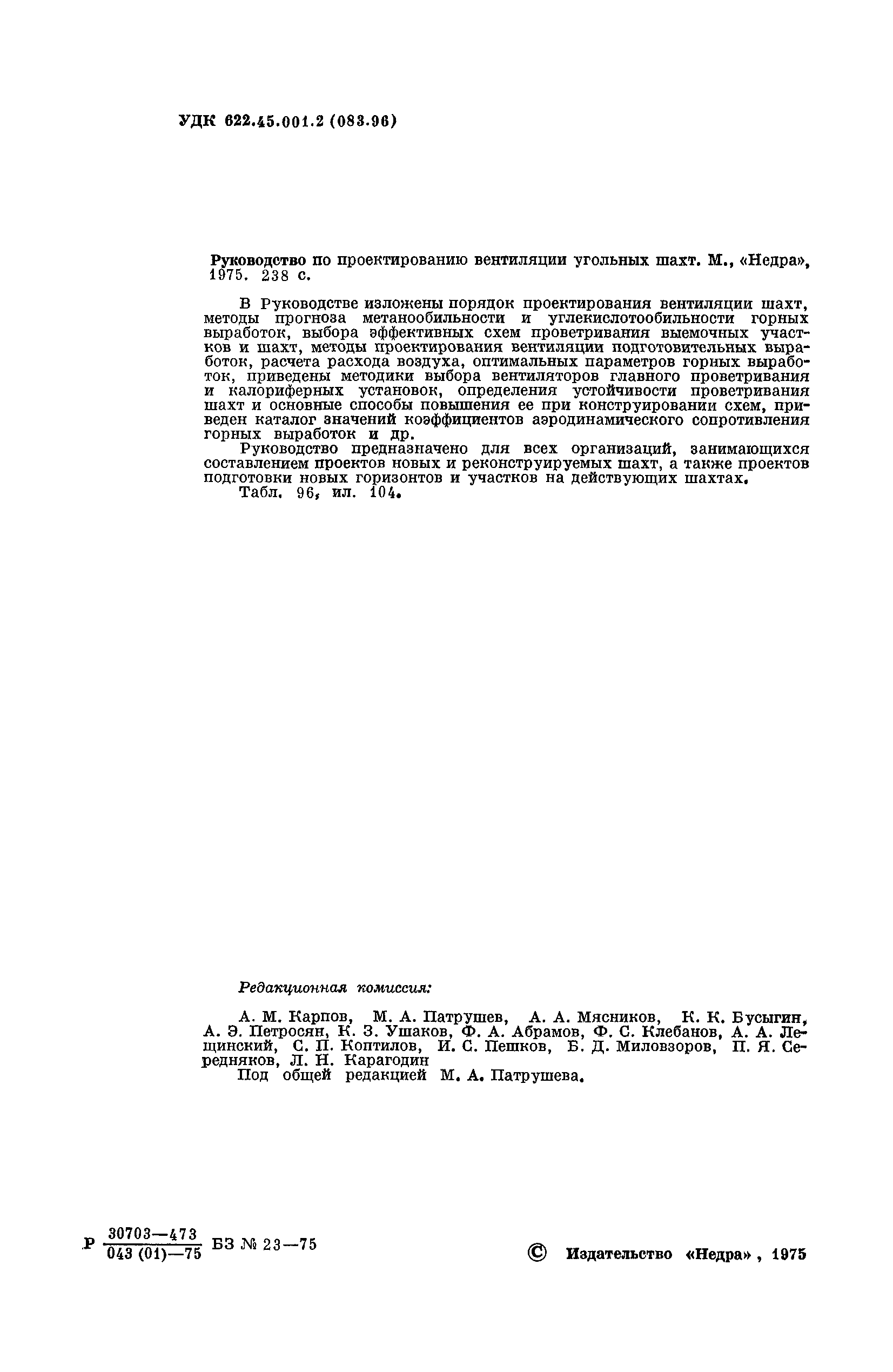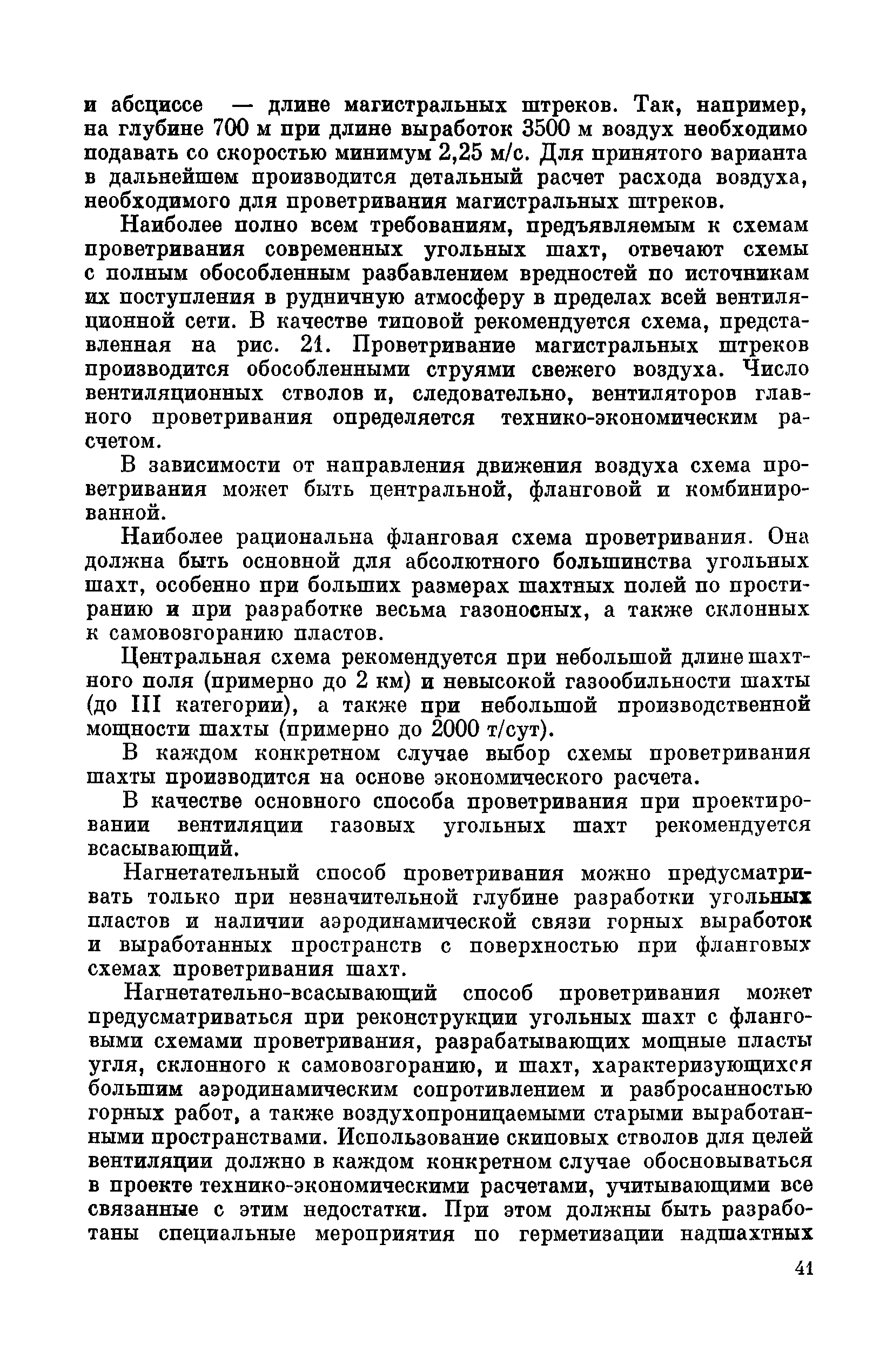 | Оглавление: | Предисловие Основные условные обозначения 1 Общие положения 1.1 Геологоразведочные организации 1.2 Угольные шахты 1.3 Проектные организации 1.4 Научно-исследовательские институты 2 Порядок проектирования вентиляции угольных шахт 3 Прогноз метанообильности выработок угольных шахт 3.1 Прогноз газообильности выработок по метаноносности угольных пластов 3.1.1 Метановыделение из пласта 3.1.2 Метановыделение из сближенных угольных пластов (спутников) 3.1.3 Метановыделение из вмещающих пород 3.1.4 Метанообильность подготовительных выработок 3.1.5 Метановыделение из старых выработанных пространств ранее отработанных этажей 3.2 Горностатистический метод прогноза 3.2.1 Принцип п область применения 3.2.2 Способ расчета и получения исходных данных 3.2.3 Способ обработки исходных данных 4 Схемы и способы проветривания шахт 4.1 Схемы проветривания выемочных участков 4.1.1 Основные требования к схемам проветривания 4.1.2 Область применения основных схем 4.2 Выбор схемы и способа проветривания шахты 5 Проектирование проветривания подготовительных выработок 5.1 Общие положения 5.2 Расход воздуха для проветривания одиночных подготовительных выработок 5.2.1 По газовыделению 5.2.2. По расходу ВВ 5.2.3 По наибольшему числу людей 5.2.4 По минимальной скорости движения воздуха 5.2.5 По тепловому фактору 5.2.6 Расчет производительности вентилятора 5.3 Расход воздуха для проветривания параллельных выработок 5.4 Расход воздуха для проветривания выработок, проводимых широким ходом 5.5 Выбор способа проветривания 5.6 Выбор и аэродинамический расчет трубопроводов 5.7 Выбор вентиляторов жесткого проветривания 5.8 Установка вентиляторов местного проветривания 6 Расчет расхода воздуха для проветривания угольных шахт 6.1 Общие положения 6.2 Упрощенный расчет расхода воздуха 6.2.1 Для Донецкого бассейна и шахт с аналогичными условиями 6.2.2 Для Кузнецкого бассейна и шахт с аналогичными условиями 6.3 Допустимая нагрузка на очистную выработку по газовому фактору 6.3.1 Для забоев типа лав 6.3.2 Для систем разработки с очистными забоями типа камер 6.4 Полный расчет расхода воздуха 6.4.1 Расход воздуха для проветривания забоев 6.4.2 Расход воздуха для проветривания выемочного участка 6.4.3 Расход воздуха для проветривания камер 6.4.4 Утечки воздуха через вентиляционные сооружения 6.4.5 Расход воздуха для проветривания вентиляционного участка и шахты 6.4.6 Производительность вентиляторных установок 7 Расчет депрессии шахт 7.1 Общешахтная депрессия 7.2 Расчет оптимальных сечений выработок 7.2.1 Исходные данные 7.2.2 Определение расчетной депрессии направлений 7.2.3 Обеспечение точности результата упрощенного расчета 7.2.4 Выбор определяющего направления 7.2.5 Расчет сечений выработок направления 7.2.6 Возможная корректировка местоположения воздухоподающего и вентиляционного стволов 7.2.7 Техника расчета сечений выработок 7.3 Размещение и расчет регуляторов распределения воздуха в горных выработках 8 Выбор вентиляторов 8.1 Вентиляторы для одиночной работы 8.2 Вентиляторы для совместной работы 9 Определение устойчивости проветривания шахт и повышение ее при конструировании схем 9.1 Расчет устойчивости проветривания 9.1.1 Общие сведения 9.1.2 Исходные данные и порядок анализа 9.1.3 Нахождение диагоналей и ветвей, влияющих на направление движения воздуха в диагоналях 9.1.4 Предварительный анализ устойчивости 9.1.5 О