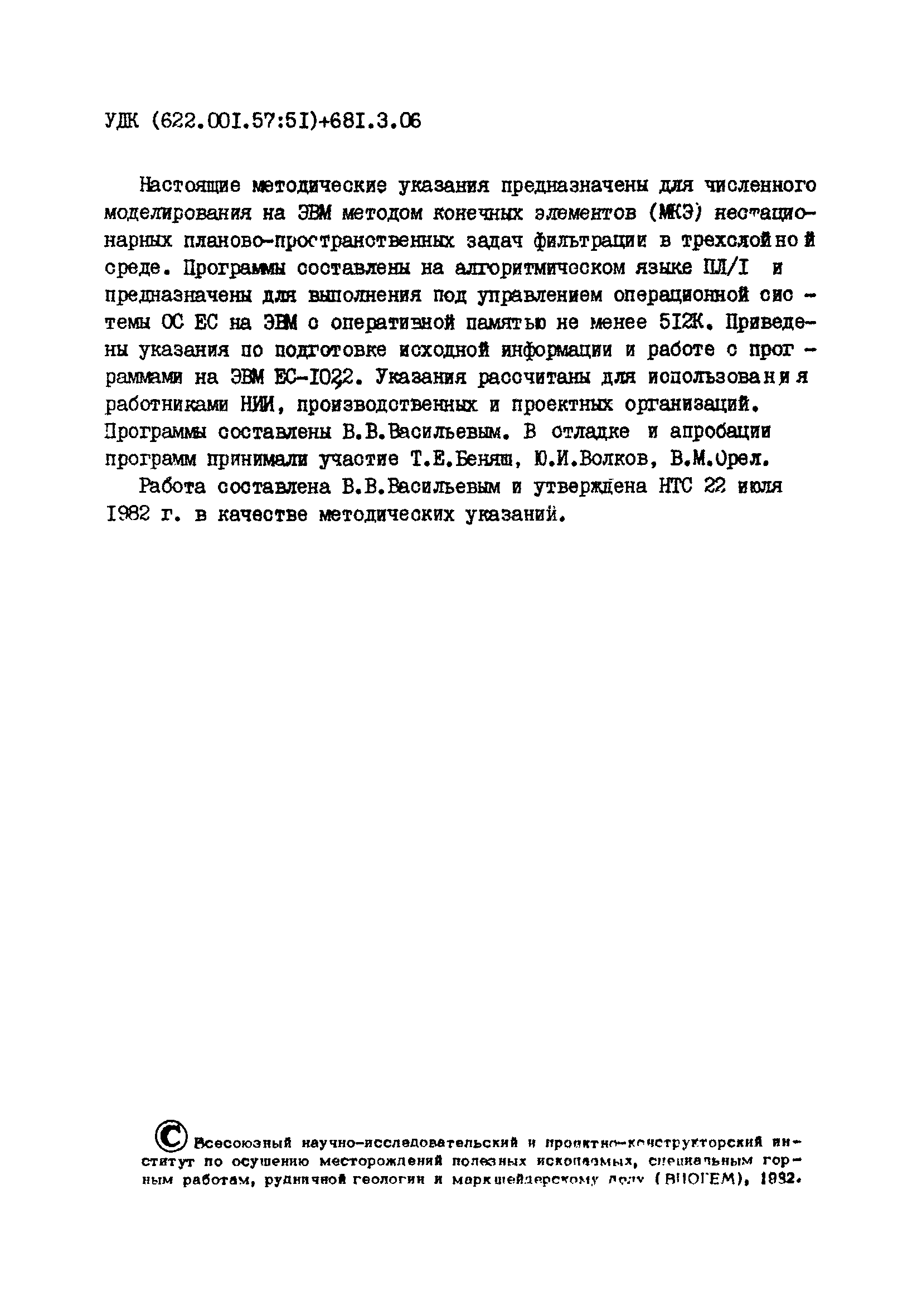 | Название рус.: | Методические указания по применению метода конечных элементов для решения планово-пространственных задач фильтрации в трехслойной среде на ЭЦВМ |