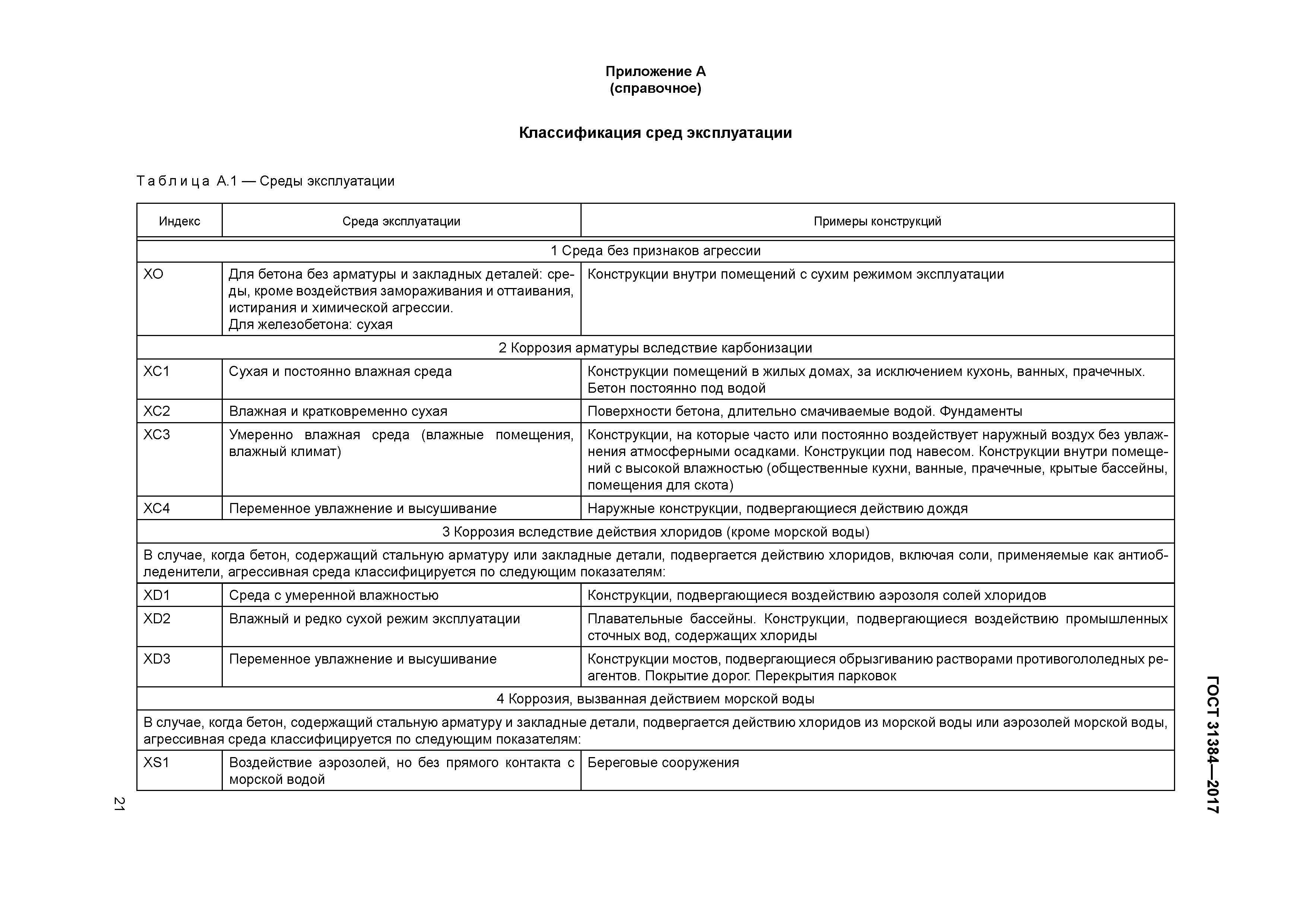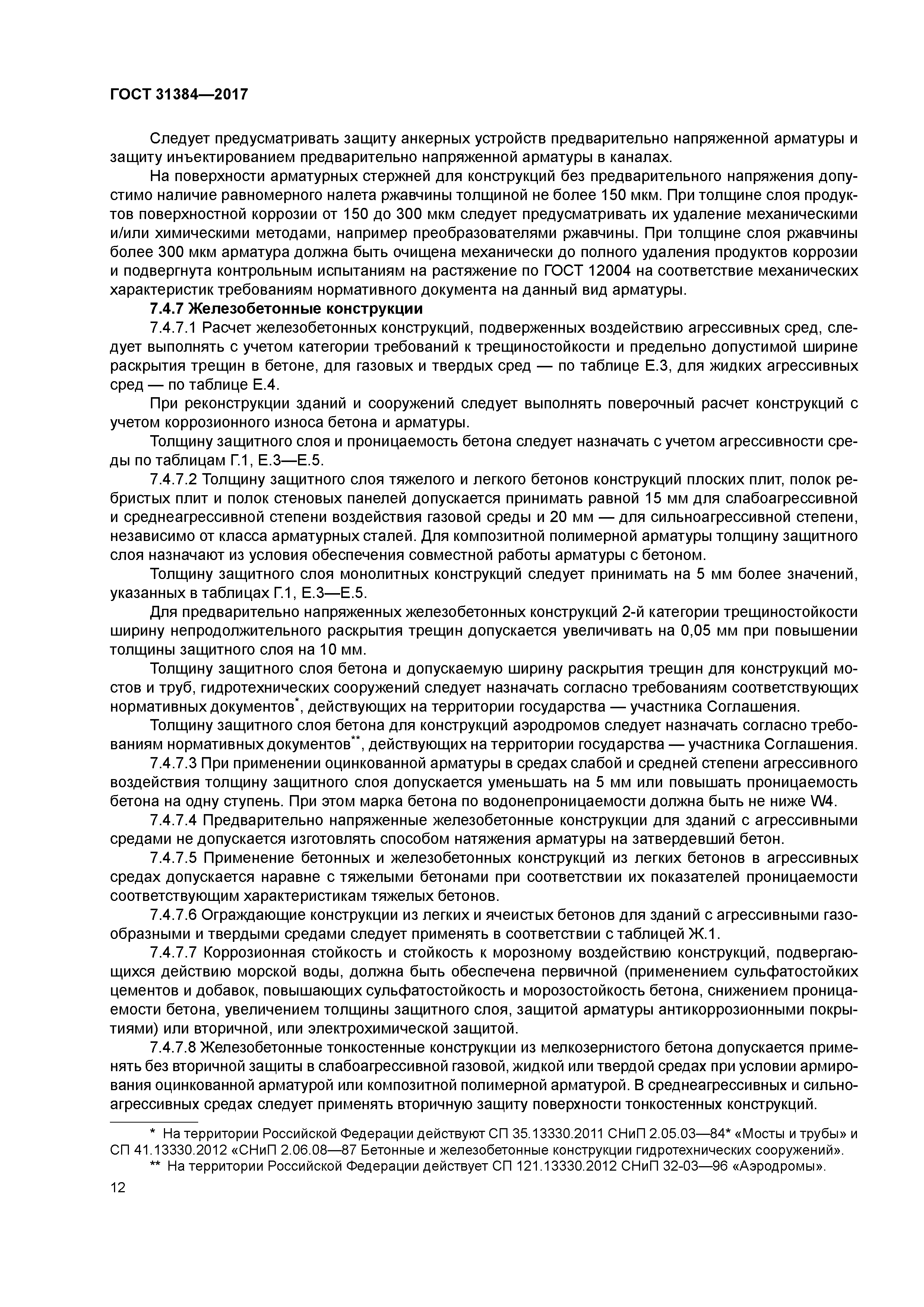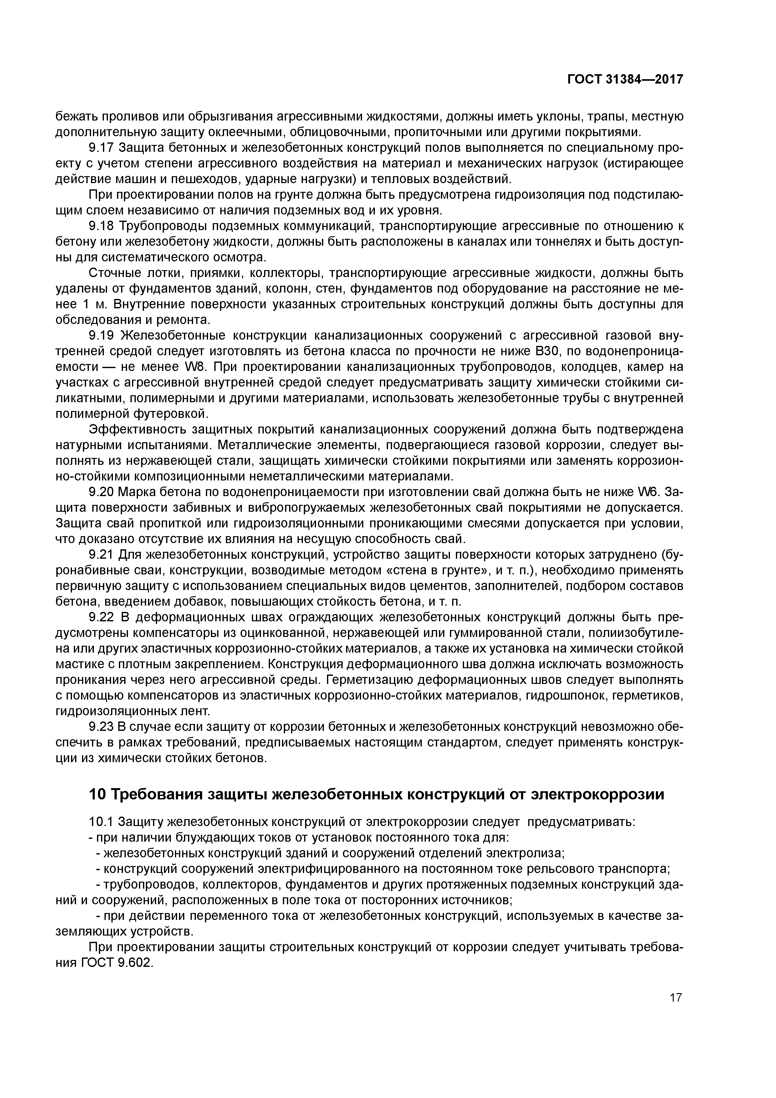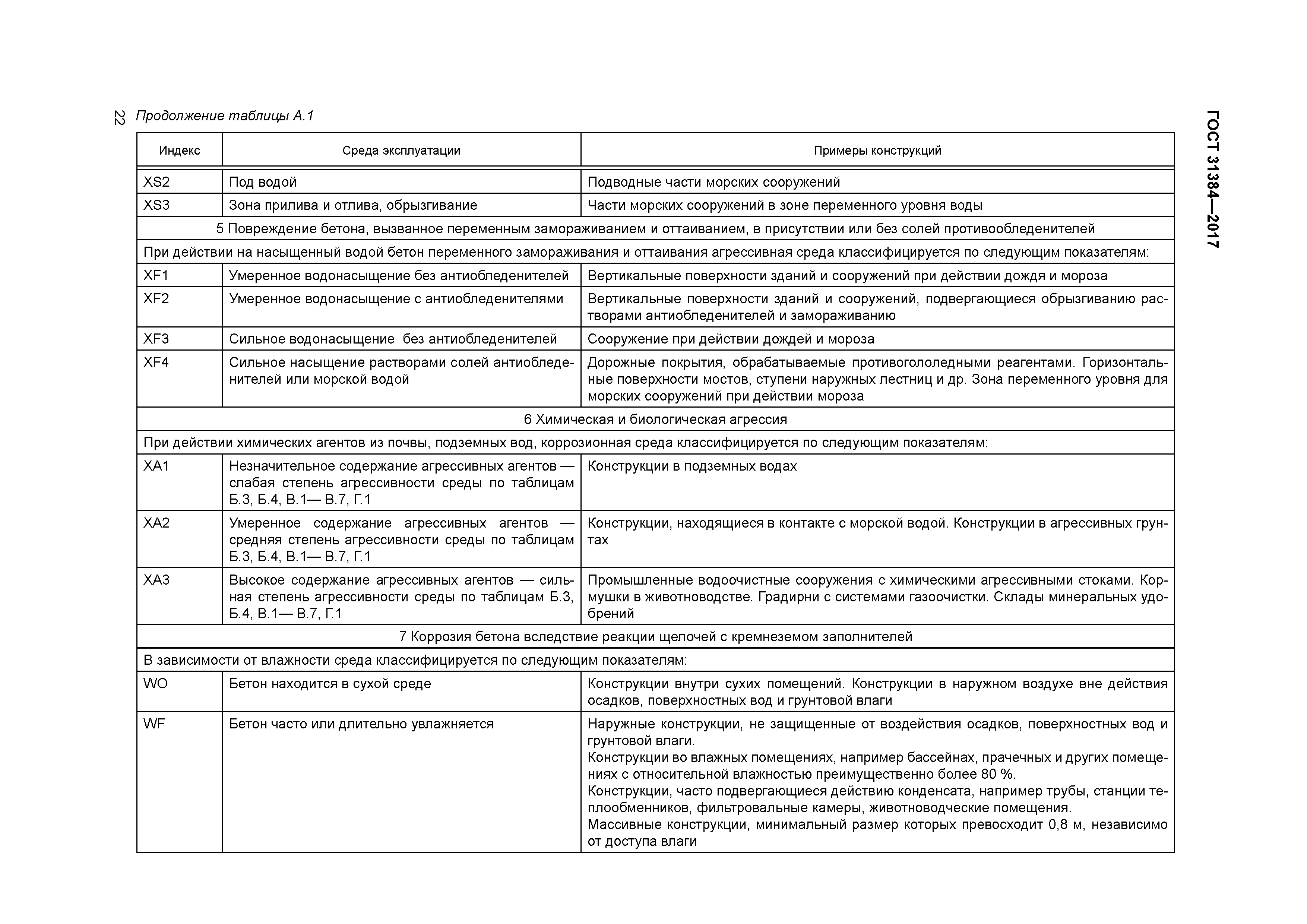 | Область применения: | Стандарт устанавливает требования, учитываемые при проектировании защиты от коррозии бетонных и железобетонных конструкций в зданиях и сооружениях, как вновь возводимых, так и реконструируемых, предназначенных для эксплуатации в агрессивных средах с температурой от минус 70 °С до плюс 50 °С. В стандарте определены технические требования к защите от коррозии бетонных и железобетонных конструкций для срока эксплуатации 50 лет. Для бетонных и железобетонных конструкций со сроком эксплуатации 100 лет и конструкций зданий и сооружений класса КС-3, имеющих повышенный уровень ответственности по ГОСТ 27751, оценка степени агрессивности повышается на один уровень. Если оценка степени агрессивности среды не может быть увеличена (например, для сильноагрессивной среды), защита от коррозии выполняется по специальному проекту. Проектирование реконструкции зданий и сооружений должно предусматривать анализ коррозионного состояния конструкций и защитных покрытий с учетом вида и степени агрессивности среды в новых условиях эксплуатации. Требования стандарта следует учитывать при разработке других нормативных документов, а также технических условий, по которым изготовляются или возводятся конструкции конкретных видов, для которых устанавливают нормируемые показатели качества, обеспечивающие технологическую и техническую эффективность, а также при разработке технологической и проектной документации на данные конструкции. Требования стандарта не распространяются на проектирование защиты бетонных и железобетонных конструкций от коррозии, вызываемой радиоактивными веществами, а также на проектирование конструкций из специальных бетонов (полимербетонов, бетонополимеров, кислото-, жаростойких бетонов и т. п.). |