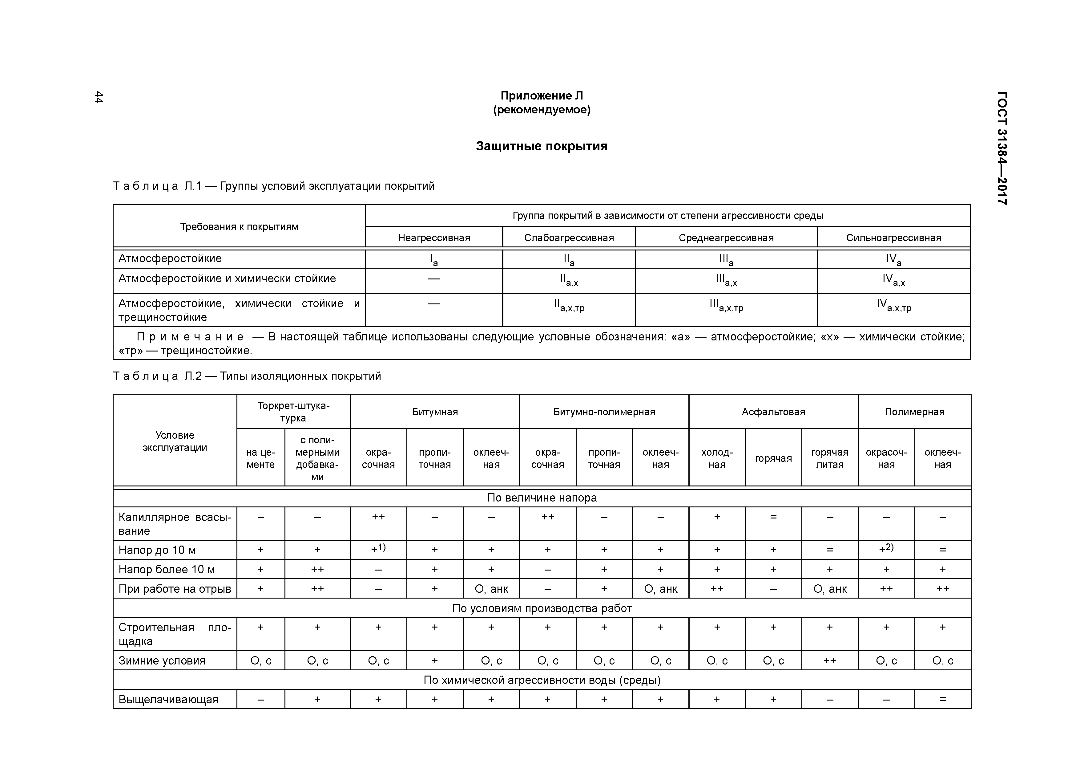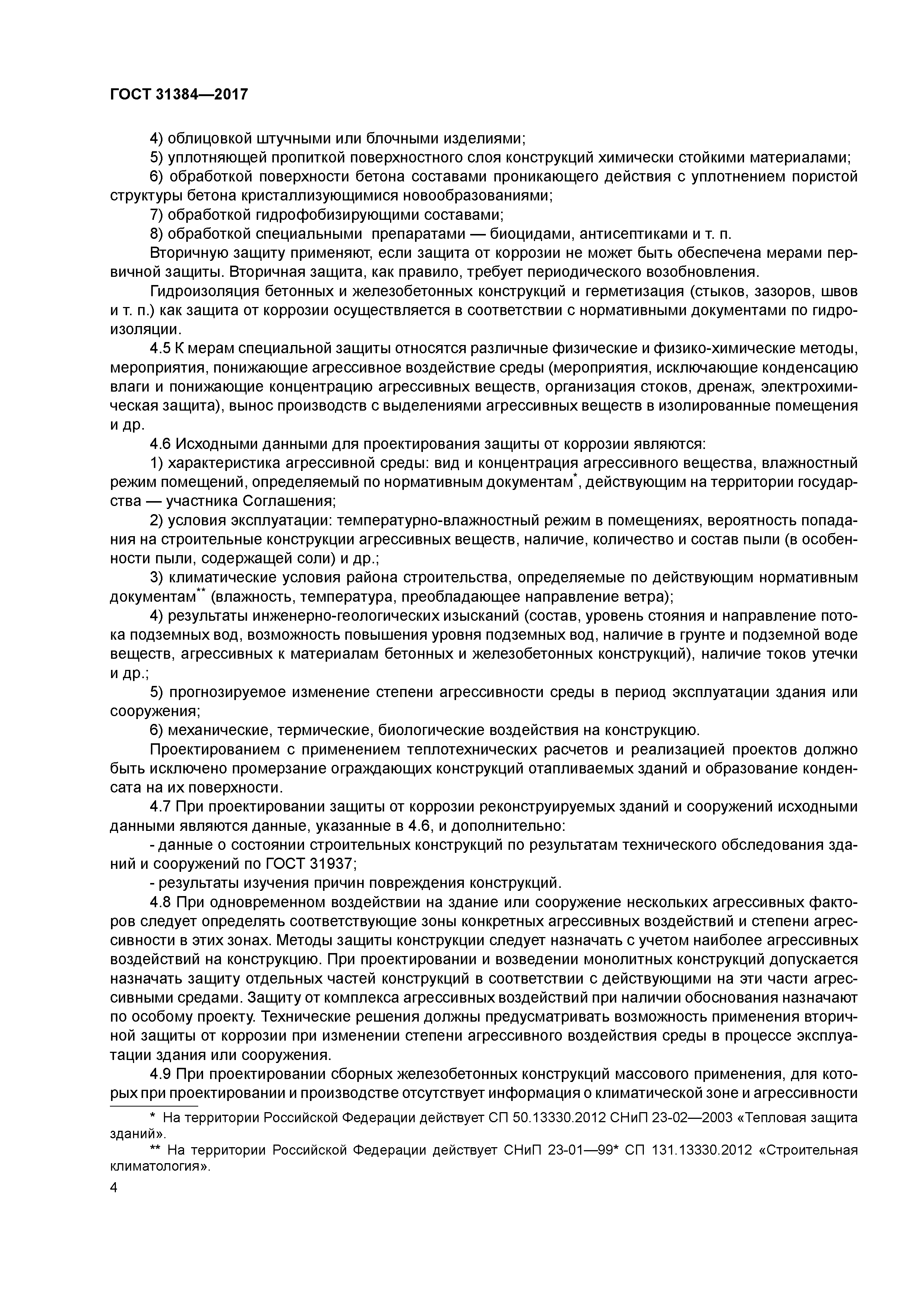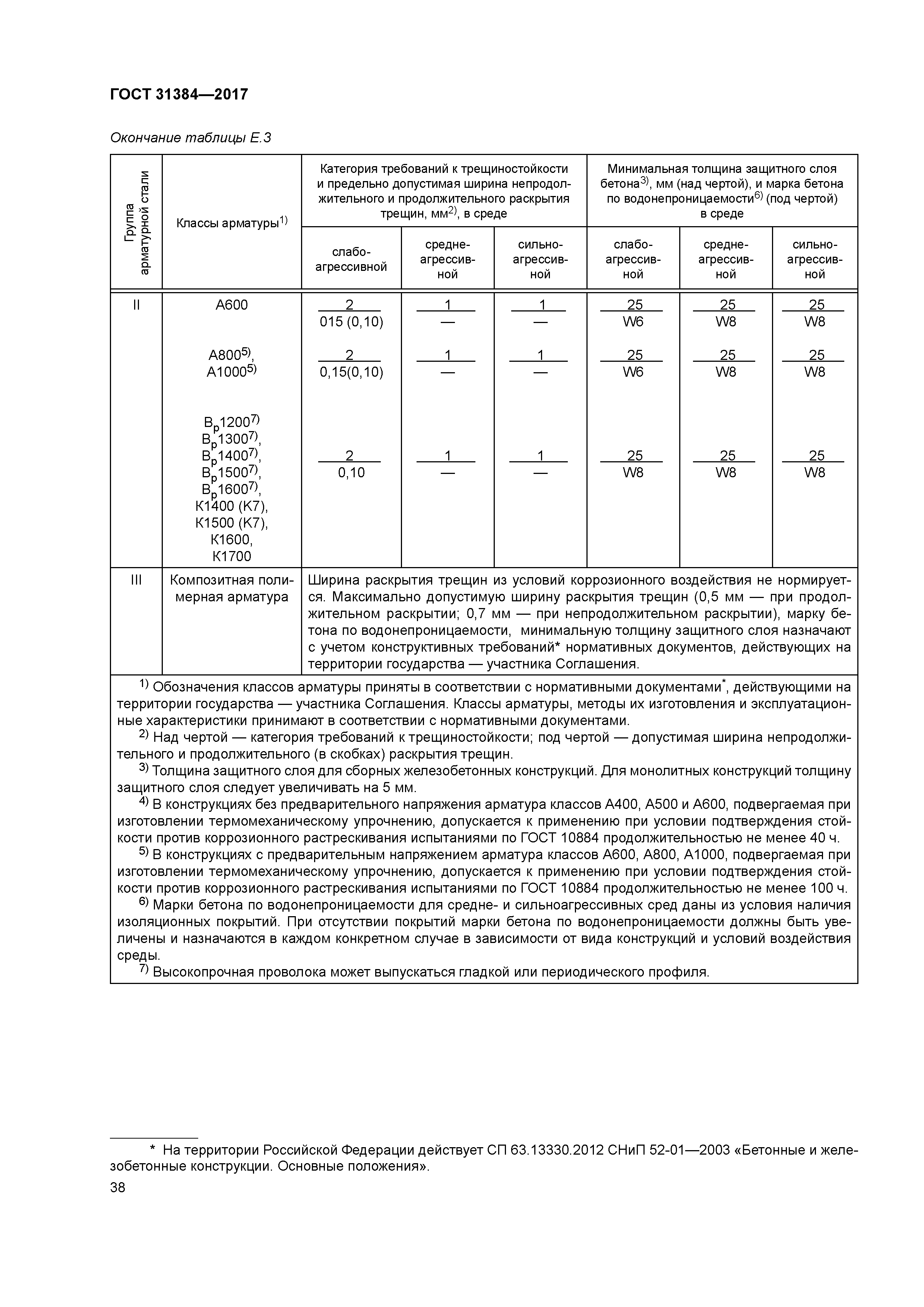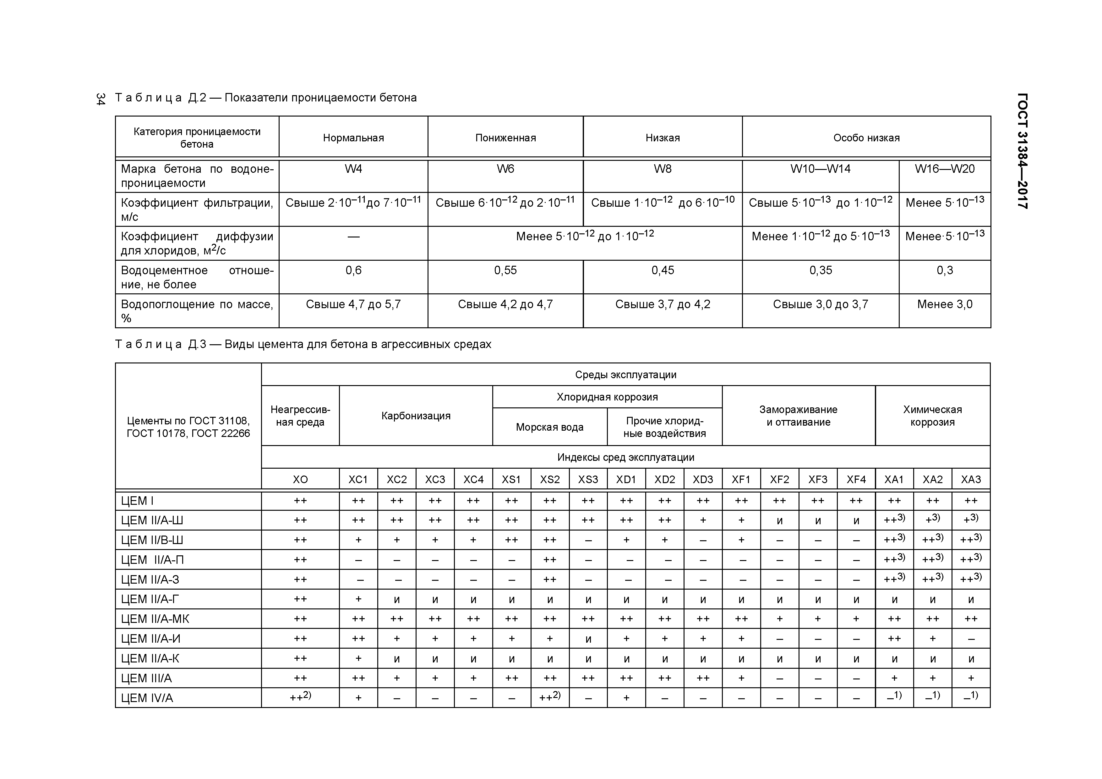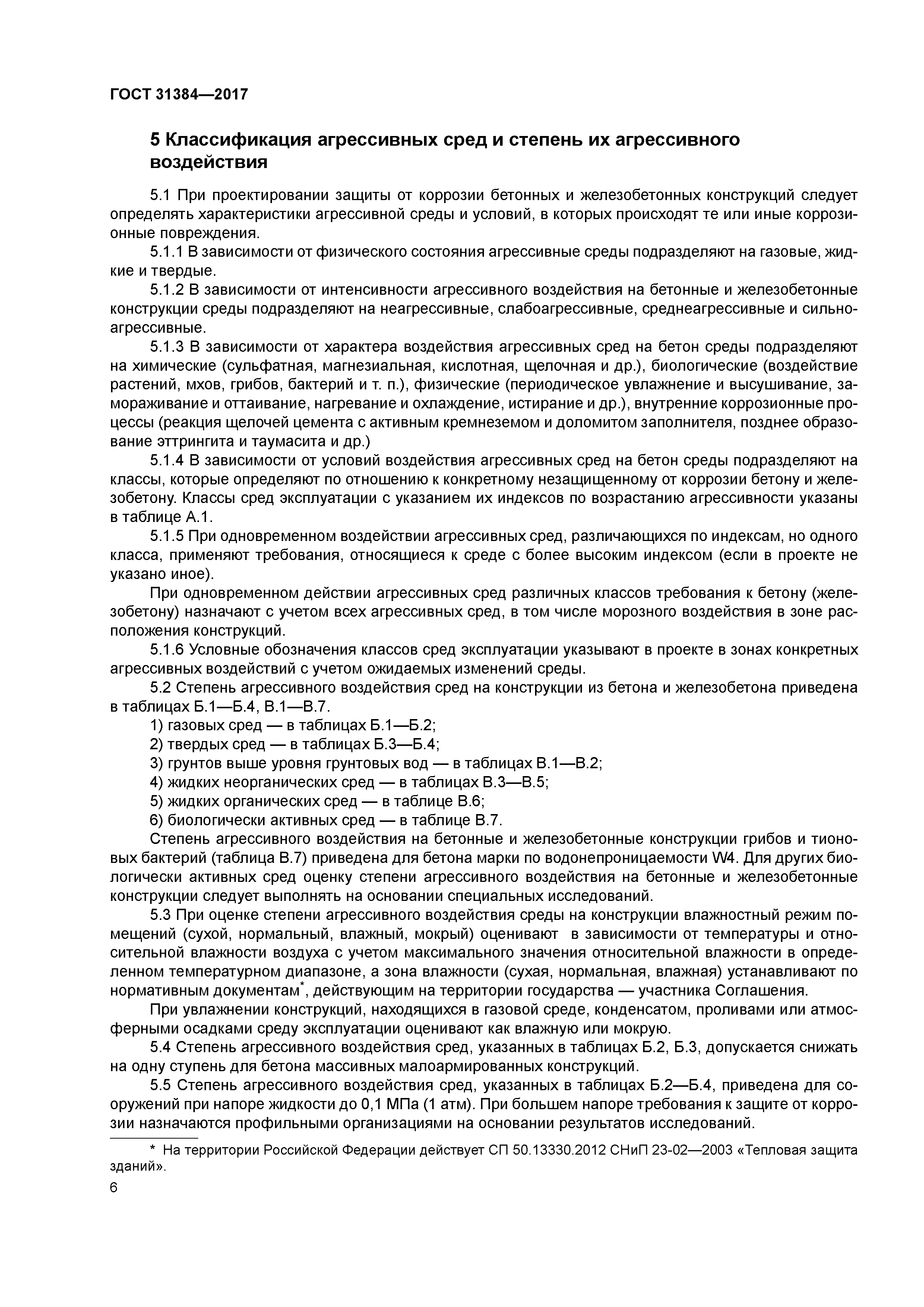 | Область применения: | Стандарт устанавливает требования, учитываемые при проектировании защиты от коррозии бетонных и железобетонных конструкций в зданиях и сооружениях, как вновь возводимых, так и реконструируемых, предназначенных для эксплуатации в агрессивных средах с температурой от минус 70 °С до плюс 50 °С. В стандарте определены технические требования к защите от коррозии бетонных и железобетонных конструкций для срока эксплуатации 50 лет. Для бетонных и железобетонных конструкций со сроком эксплуатации 100 лет и конструкций зданий и сооружений класса КС-3, имеющих повышенный уровень ответственности по ГОСТ 27751, оценка степени агрессивности повышается на один уровень. Если оценка степени агрессивности среды не может быть увеличена (например, для сильноагрессивной среды), защита от коррозии выполняется по специальному проекту. Проектирование реконструкции зданий и сооружений должно предусматривать анализ коррозионного состояния конструкций и защитных покрытий с учетом вида и степени агрессивности среды в новых условиях эксплуатации. Требования стандарта следует учитывать при разработке других нормативных документов, а также технических условий, по которым изготовляются или возводятся конструкции конкретных видов, для которых устанавливают нормируемые показатели качества, обеспечивающие технологическую и техническую эффективность, а также при разработке технологической и проектной документации на данные конструкции. Требования стандарта не распространяются на проектирование защиты бетонных и железобетонных конструкций от коррозии, вызываемой радиоактивными веществами, а также на проектирование конструкций из специальных бетонов (полимербетонов, бетонополимеров, кислото-, жаростойких бетонов и т. п.). |