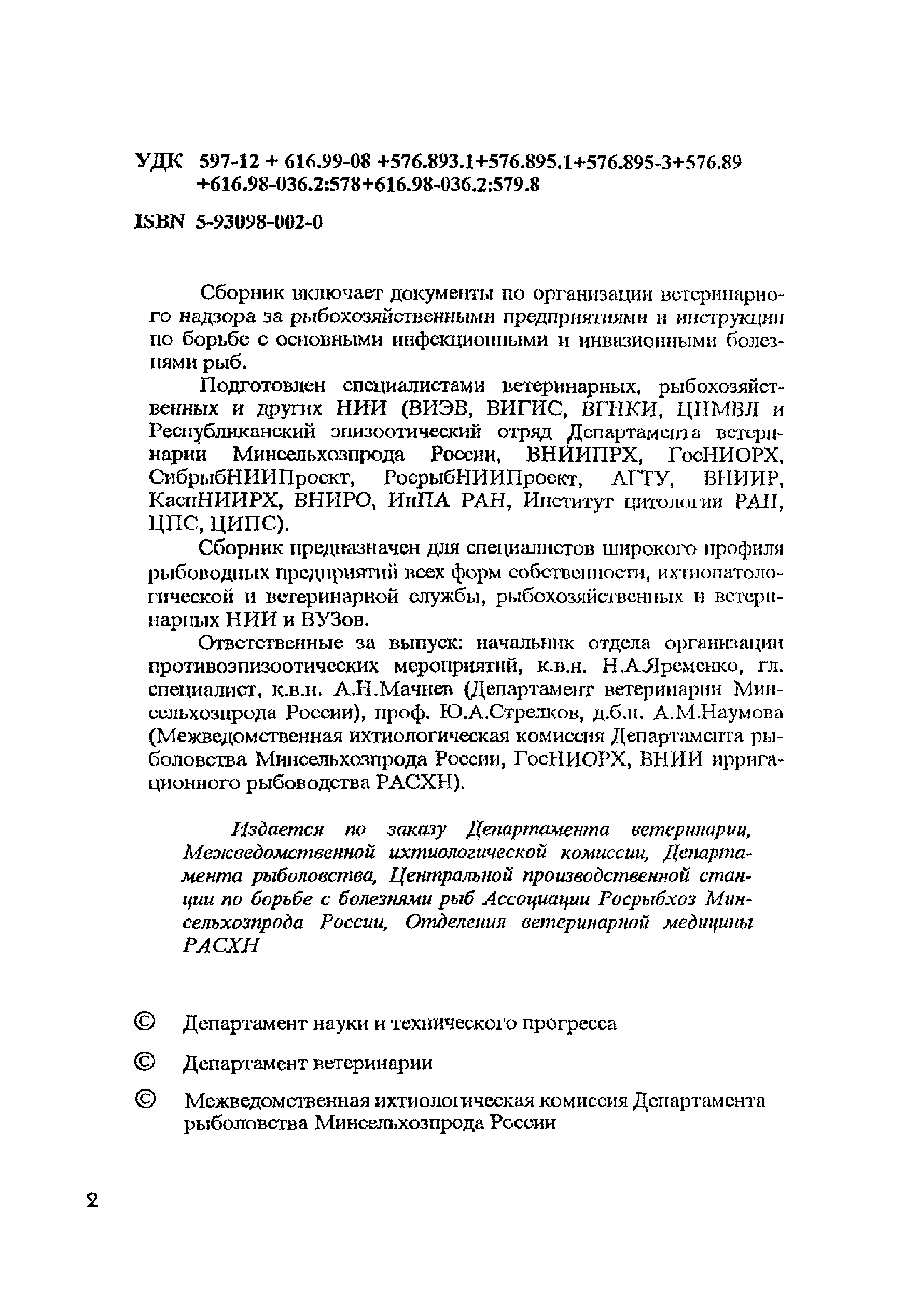 | Область применения: | Документ предназначен для специалистов широкого профиля рыбоводных предприятий всех форм собственности, ихтиопатологической и ветеринарной службы, рыбохозяйственных и ветеринарных НИИ и ВУЗов |