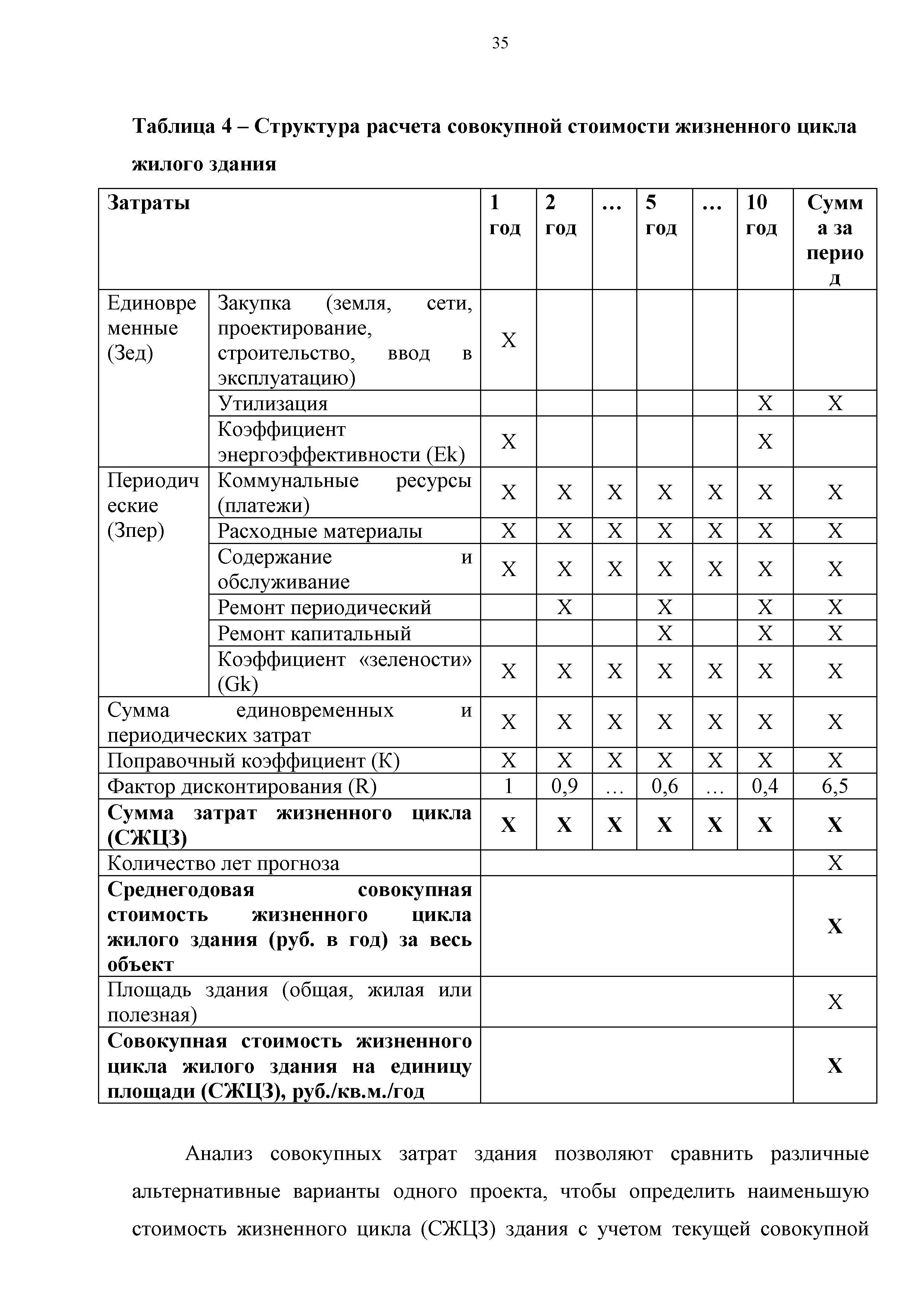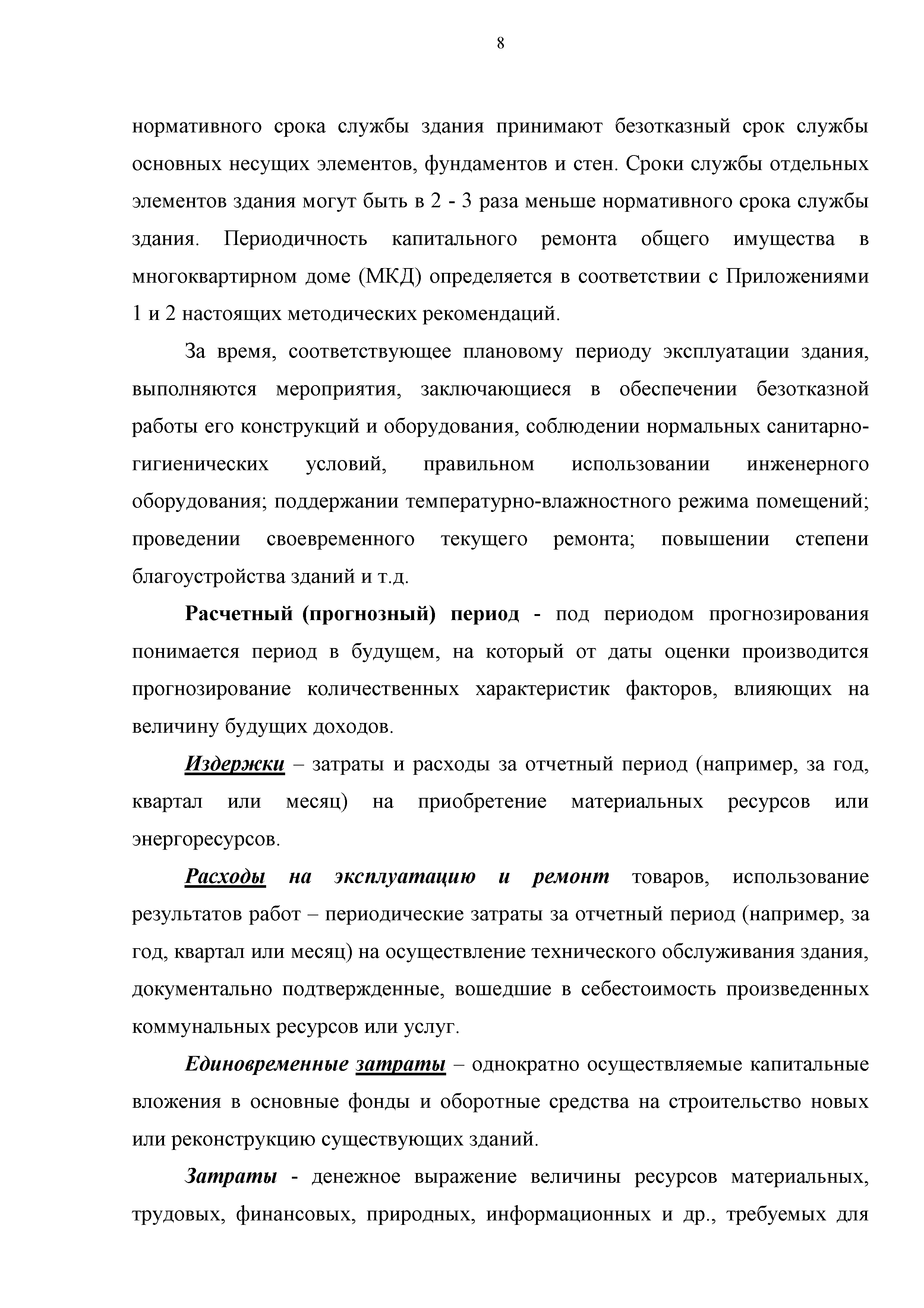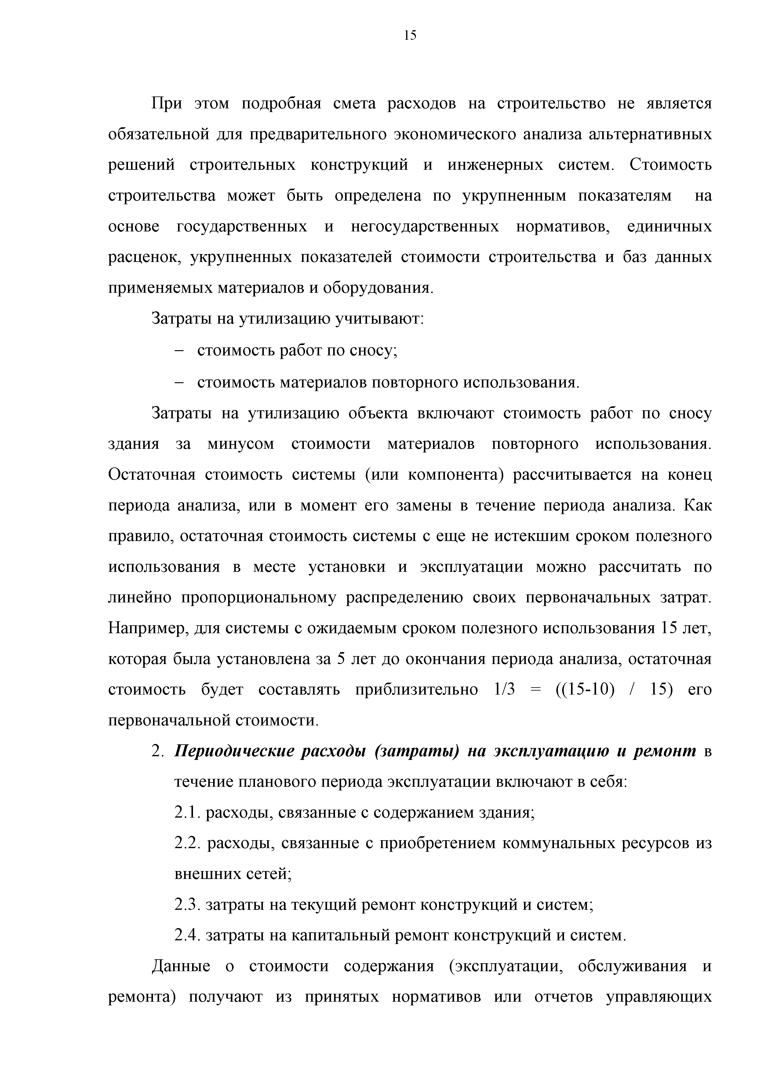 | Оглавление: | 1 Общие положения Методики, обозначение целей ее применения и заинтересованных сторон 2 Основные понятия, определения и принципы 3 Ожидаемая экономическая и социальная эффективность 4 Категории затрат, учитываемых в совокупной стоимости жизненного цикла здания 5 Формула для расчета совокупной стоимости жизненного цикла здания 6 Алгоритм расчета совокупной стоимости энергоэффективного жилого дома 7 Единовременные затраты на ввод и вывод из жилого дома 8 Периодические расходы (затраты) на эксплуатацию и ремонт 8.1 Расходы (издержки) на эксплуатацию 8.2 Затраты на текущий ремонт 8.3 Затраты на капитальный ремонт 8.4 Расходы на содержание общего имущества 9 Учет инфляции и дисконтирования 10 Обоснование внедрения коэффициентов энергоэффективности и "зелености" 11 Расчет стоимость совокупных затрат жизненного цикла жилого здания 12 Дополнительные расчеты 13 Пример расчета жизненного цикла жилого здания с учетом стоимости совокупных затрат 14 Глоссарий Приложение 1. Минимальная продолжительность эффективной эксплуатации зданий и объектов (ВСН 58-88(р)) Приложение 2. Минимальная продолжительность эффективной эксплуатации элементов зданий и объектов (ВСН 58-88(р)) Приложение 3. Значения фактора дисконтирования Приложение 4. Значения индекса роста цен (инфляция) |