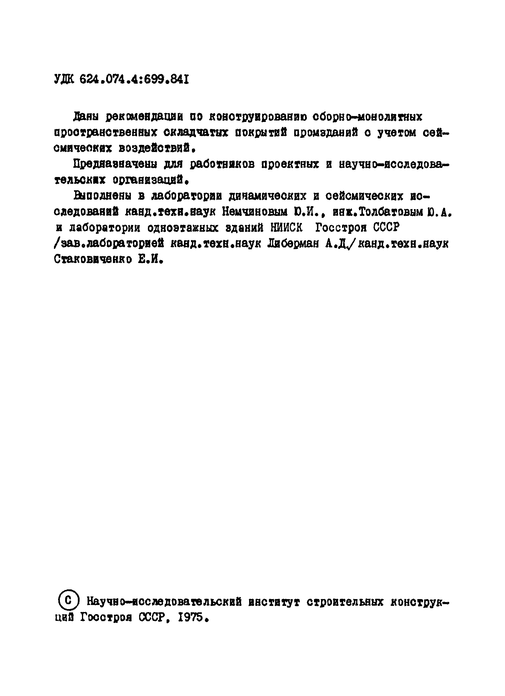 | Название рус.: | Методические рекомендации по расчету и конструированию складчатых покрытий для сейсмических районов |