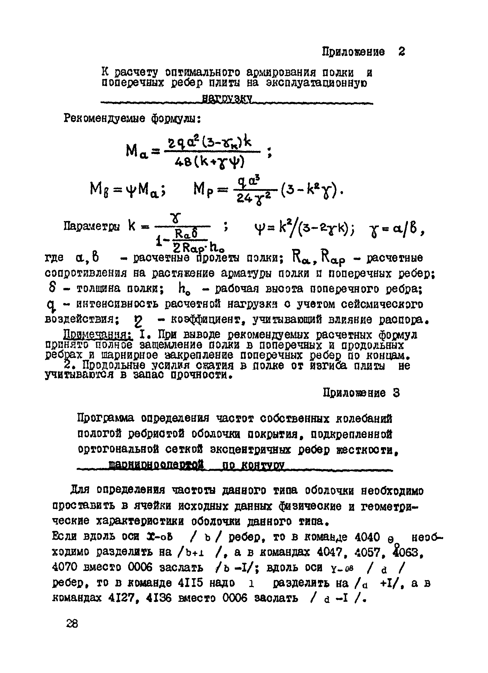 | Оглавление: | 1. Общие положения 2. Требования к конструктивным схемам зданий, перекрываемых складчатыми покрытиями. Основные принципы проектирования 3. Предложения по решению узлов и стыков конструкций перекрытий серий КП-145/73 для применения в сейсмических районах 4. Определение расчетной сейсмической нагрузки на перекрытие 5. Расчет складчатого покрытия 6. Примеры расчета Приложение 1. Определение частот основного тона вертикальных колебаний покрытий Приложение 2. Расчет оптимального армирования полки и поперечных ребер плиты на эксплуатационную нагрузку Приложение 3. Программа определения частот собственных колебаний пологой ребристой оболочки покрытия, подкрепленной ортогональной сеткой эксцентричных ребер жесткости, шарнироопертой по контуру Литература |