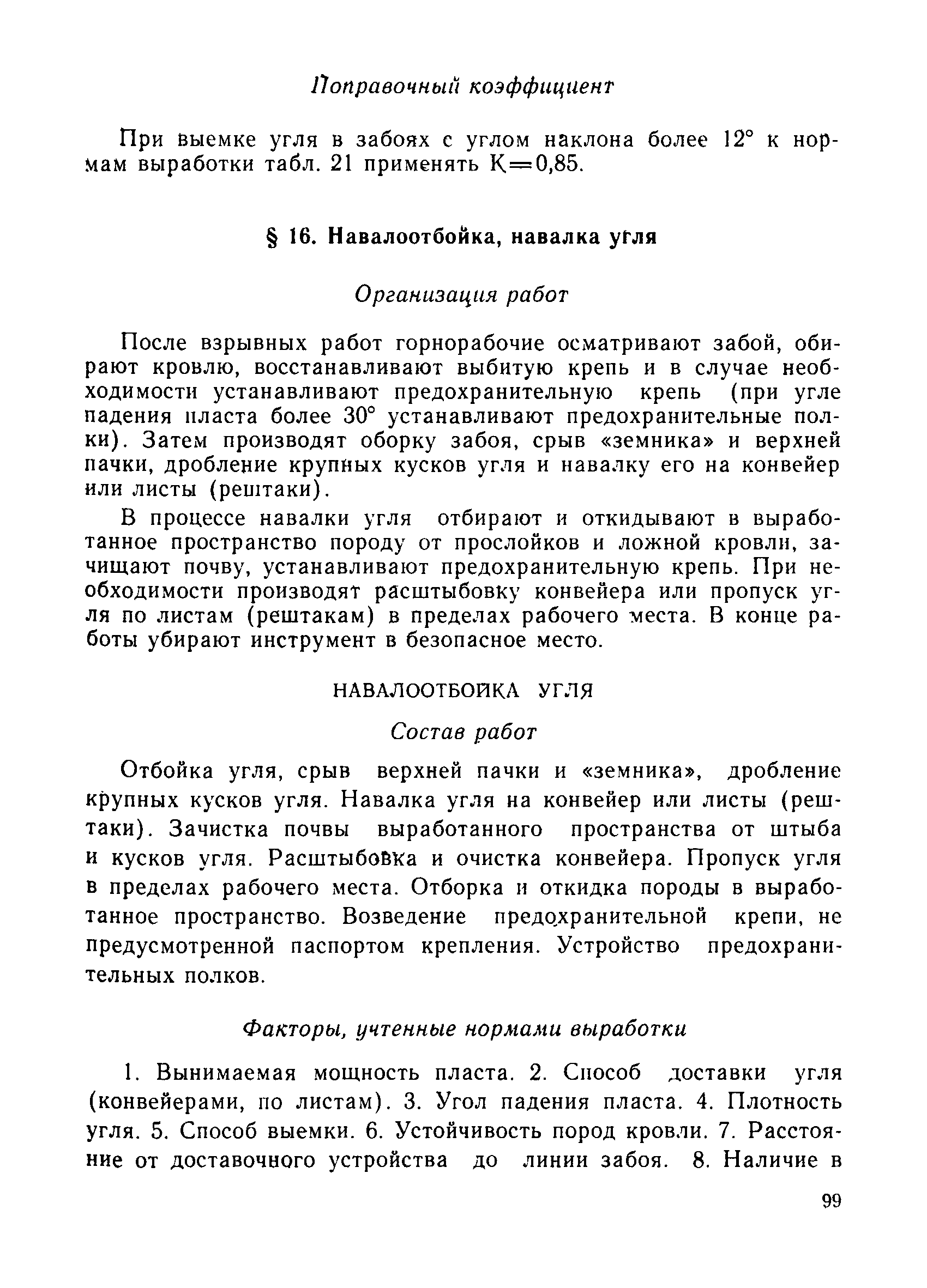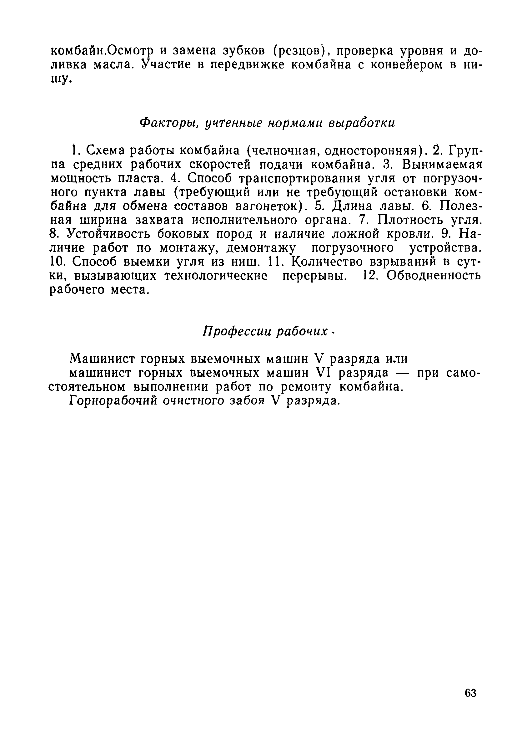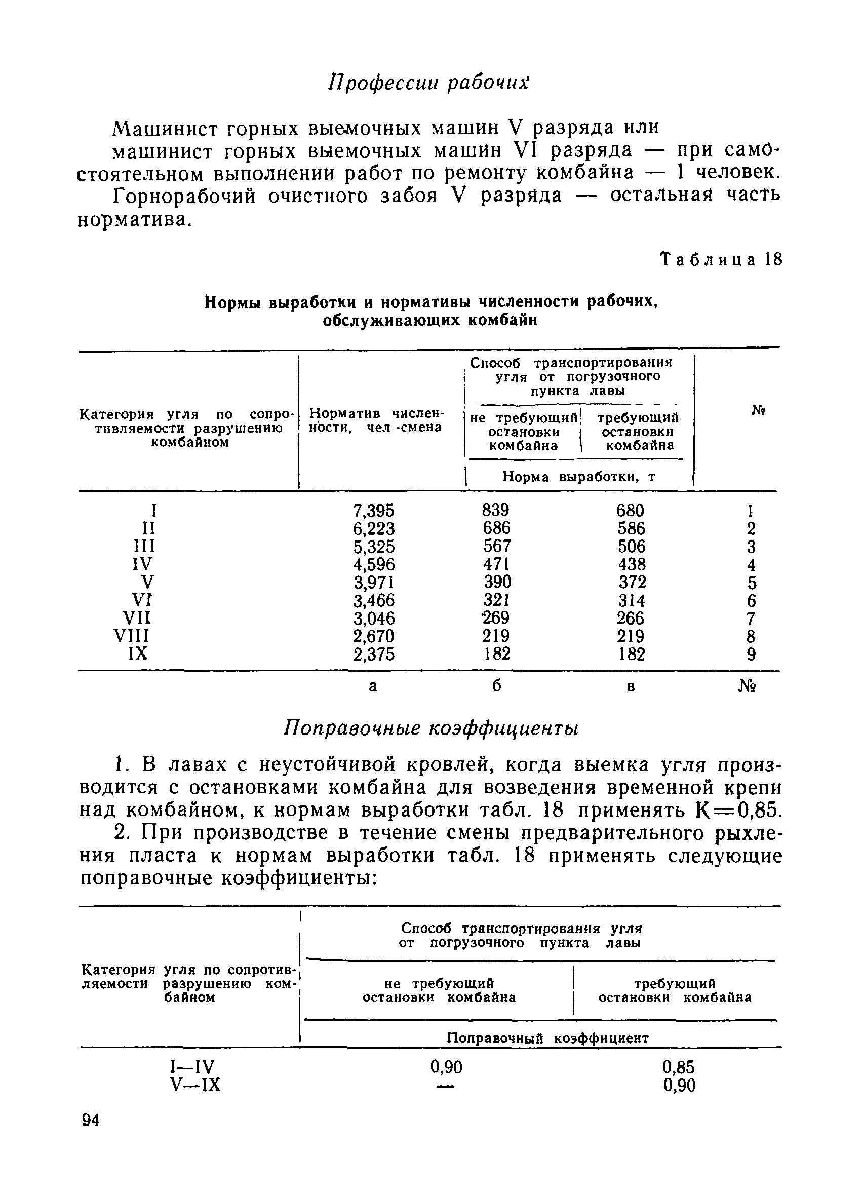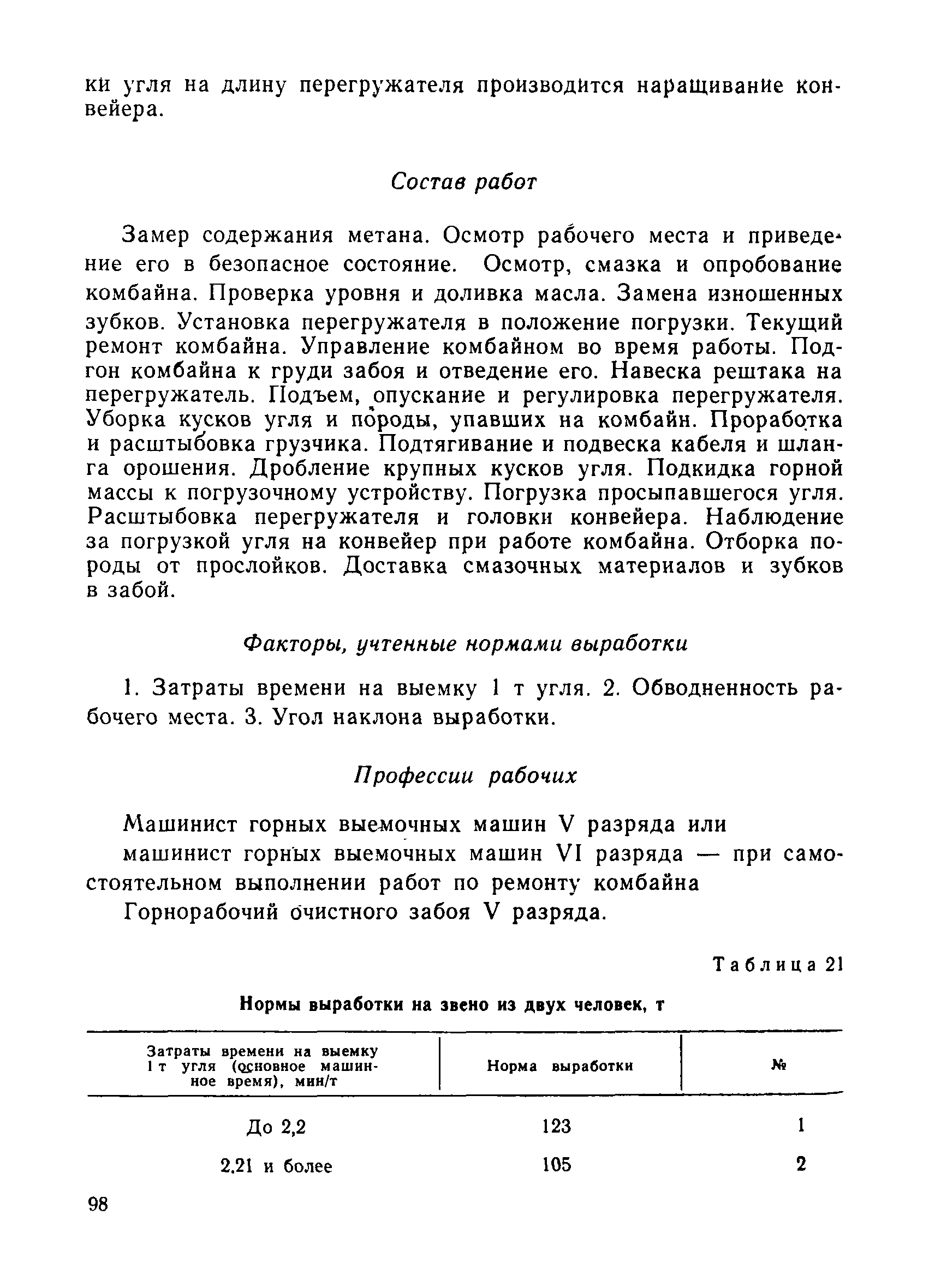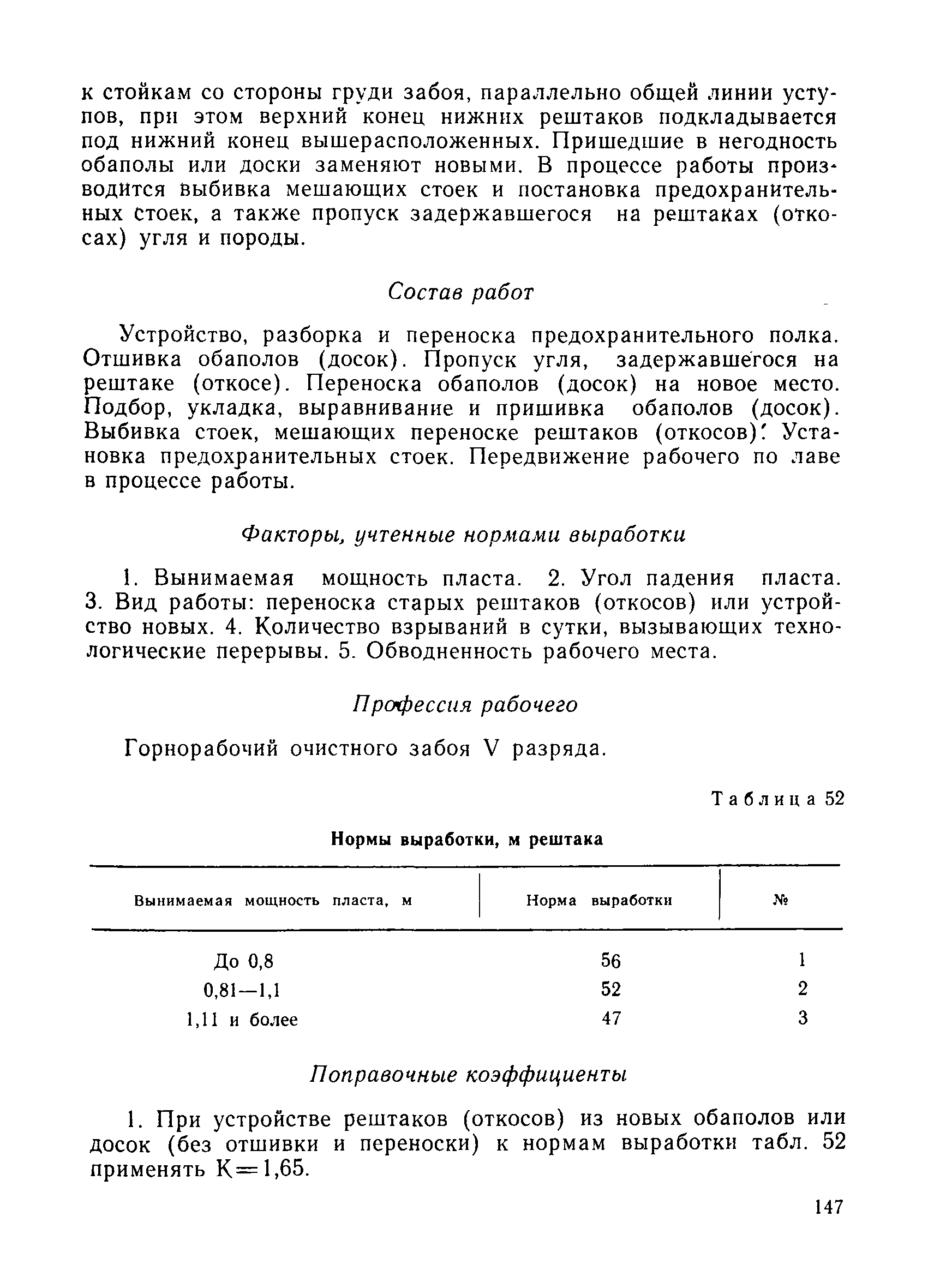 Единые нормы выработки (времени) для шахт производственного объединения "Приморскуголь"| Статус: | справочные материалы, мп, тпр | | Название рус.: | Единые нормы выработки (времени) для шахт производственного объединения "Приморскуголь" | | Дата добавления в базу: | 01.01.2018 | | Дата актуализации: | 01.01.2021 | | Область применения: | Единые нормы выработки (времени) обязательны для применения на всех действующих шахтах производственного объединения "Приморскуголь" | | Оглавление: | Общая часть Техническая часть Нормативная часть Раздел I. Очистные работы § 1. Выемка угля механизированными комплексами типа КМ-81 § 2. Выемка угля механизированными комплексами типов ОМКТ, ОКП, МК § 3. Выемка угля узкозахватными комбайнами типов КШ и ГШ-68 § 4. Оформление забоя после выемки угля узкозахватными комбайнами типов КШ и ГШ-68 § 5. Выемка угля узкозахватными комбайнами 1К-101, 2К-52, МК-67, БК-52 § 6. Оформление забоя после выемки угля узкозахватными комбайнами 1K-101, 2К-52, МК-67 и БК-52 § 7. Выемка угля комбайнами типов УКР, «Темп», КТ, А-70 в лавах на пластах наклонного и крутого падения § 8. Спуск (перегон) комбайнов типов УКР, «Темп», КТ, А-70 в лавах на пластах наклонного и крутого падения с передвижкой крана-балки § 9. Передвижка предохранительной лебедки 1ЛГКН § 10. Оформление забоя после выемки угля комбайнами типов УКР, «Темп», КТ, А-70 в лавах на пластах наклонного падения § 11. Выемка угля в лавах комбайном «Урал-2М» и подготовка его к выемке следующей полосы угля § 12. Оформление забоя после выемки угля комбайном «Урал-2М» § 13. Передвижка гидрофицированной посадочной крепи «Спутник» § 14. Выемка угля в лавах, оборудованных комбайнами К-56М A. Выемка угля Б. Разворот комбайна на пластах пологого падения B. Перегон комбайна § 15. Выемка угля проходческими комбайнами в очистных забоях на пластах пологого падения § 16. Навалоотбойка, навалка угля § 17. Бурение шпуров по углю ручными электросверлами (пневмосверлами) в лавах и камерах § 18. Уборка угля в очистных забоях с помощью скреперной установки § 19. Передвижка скреперной установки § 20. Выемка угля отбойными молотками § 21. Выемка угля с применением ВМ в очистных забоях на пластах крутого падения § 22. Крепление очистных забоев на пластах пологого и наклонного падения металлическими (клиновыми и гидравлическими) стойками § 23. Крепление очистных забоев деревянной крепью § 24. Возведение за комбайном временной деревянной крепи, предусмотренной паспортом крепления § 25. Навеска и снятие металлических шарнирных верхняков § 26. Затяжка кровли, почвы и забоя при креплении § 27. Передвижка специальной крепи типа ОКС на сопряжениях лав со штреками § 28. Установка рам на сопряжениях лав с прилегающими выработками § 29. Выбивка и извлечение металлических (клиновых и гидравлических) стоек в лавах на пластах пологого и наклонного падения при посадке кровли на металлическую органную крепь § 30. Возведение деревянной органной крепи § 31. Кладка и переноска деревянных костров § 32. Установка распорной крепи в очистных забоях § 33. Посадка кровли при помощи лебедки § 34. Бурение шпуров в стойках при посадке кровли с помощью малогабаритных патронов § 35. Передвижка перегружателей гидродомкратом при помощи упорной стойки § 36. Переноска рештаков (листов) в лавах на пластах пологого и наклонного падения § 37. Переноска деревянных рештаков (откосов) в лавах на пластах круто