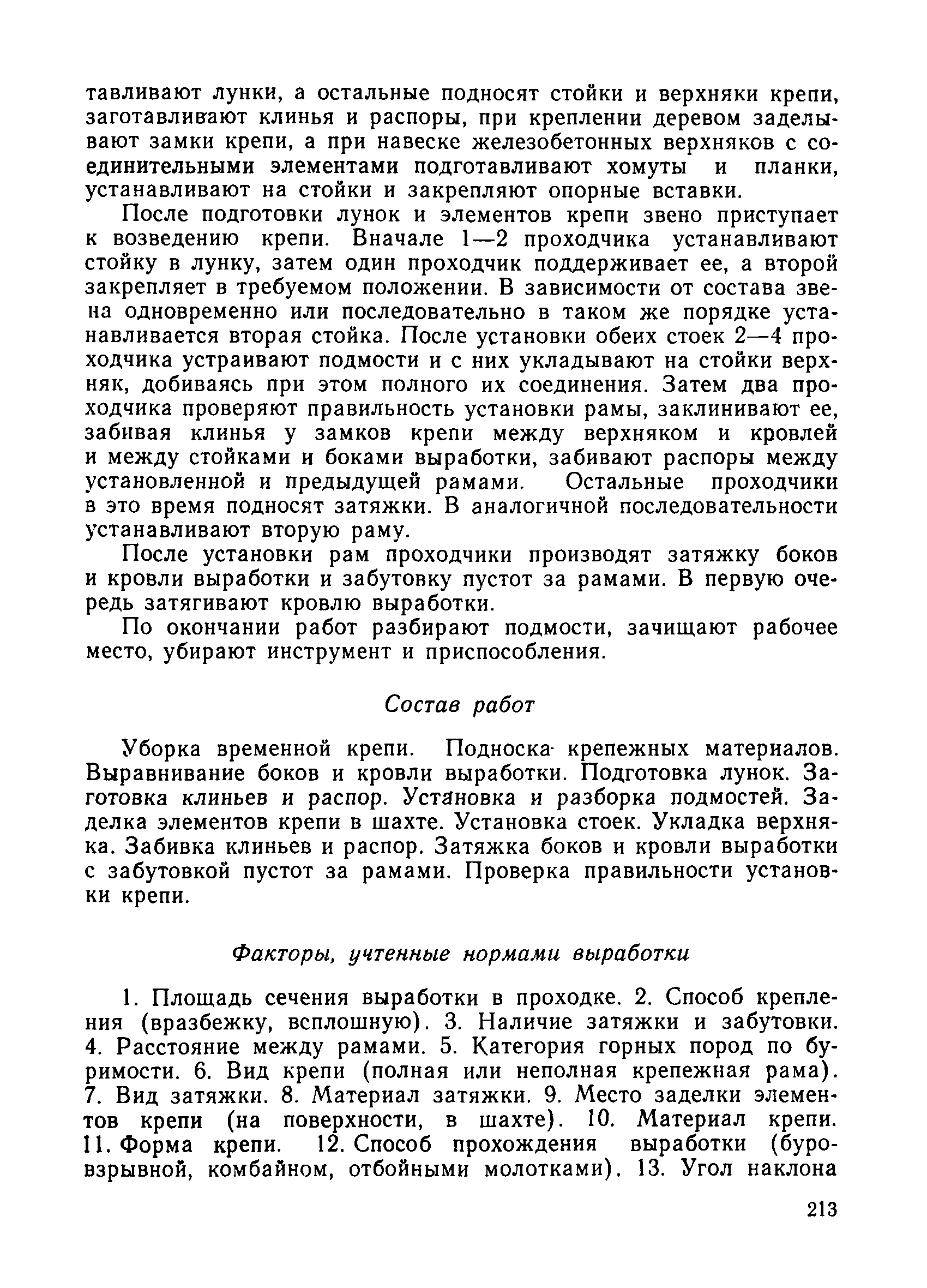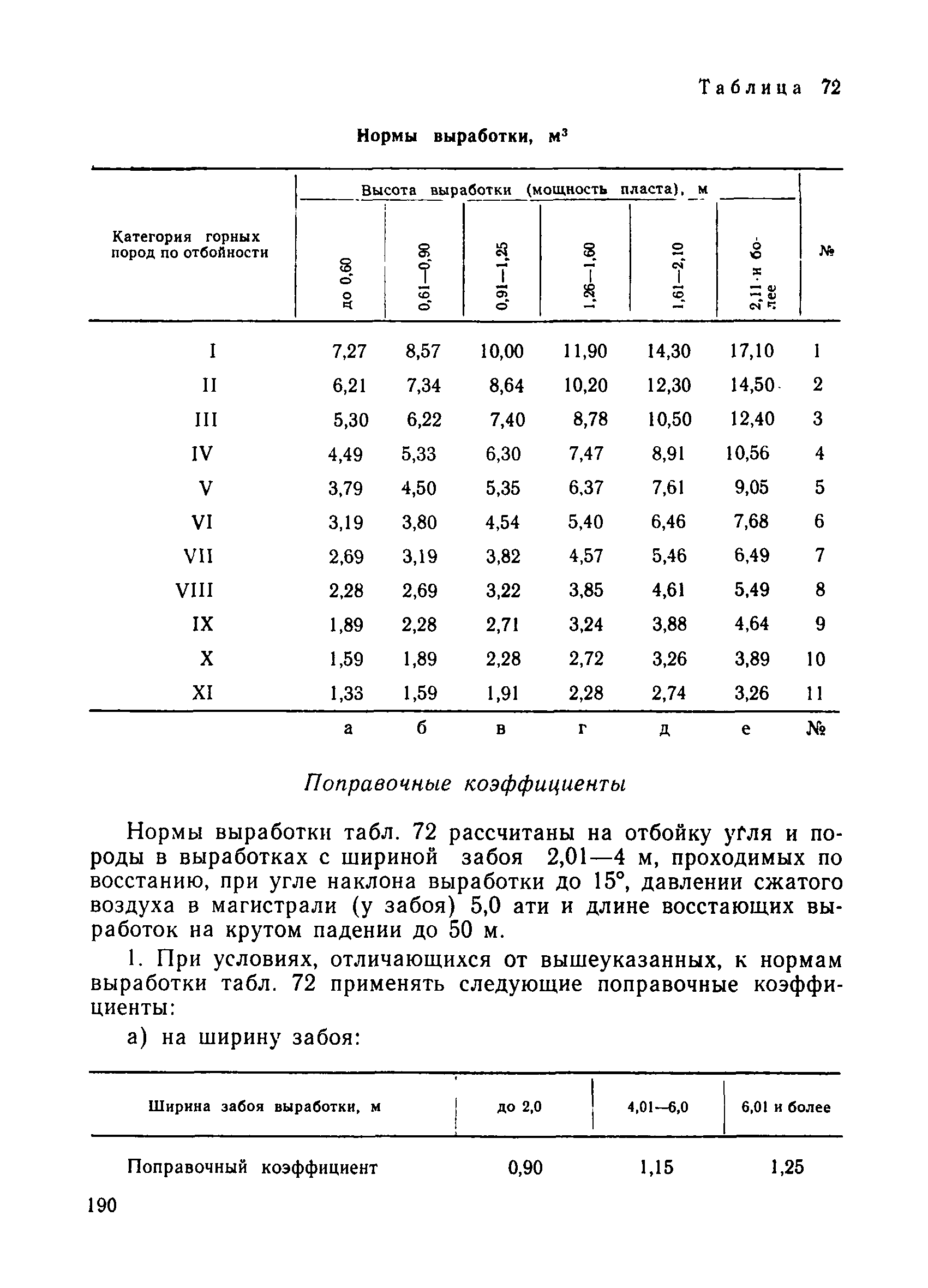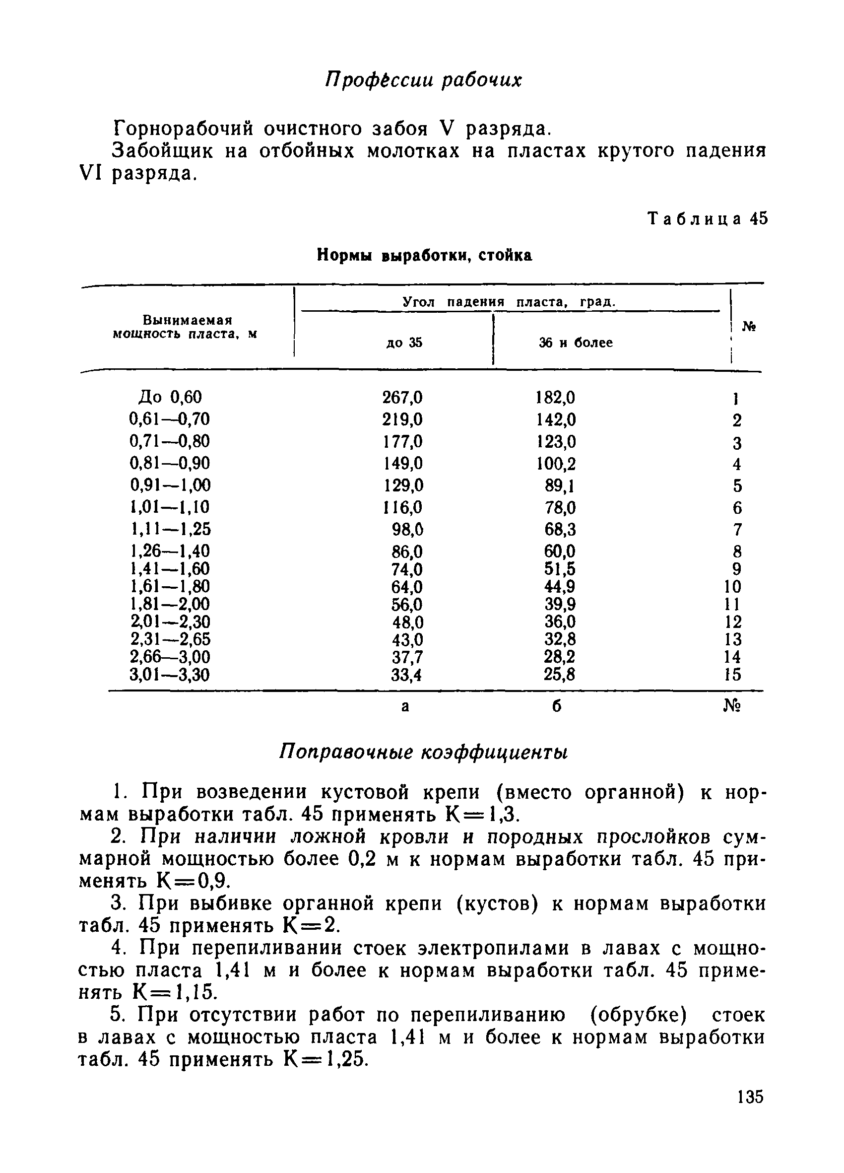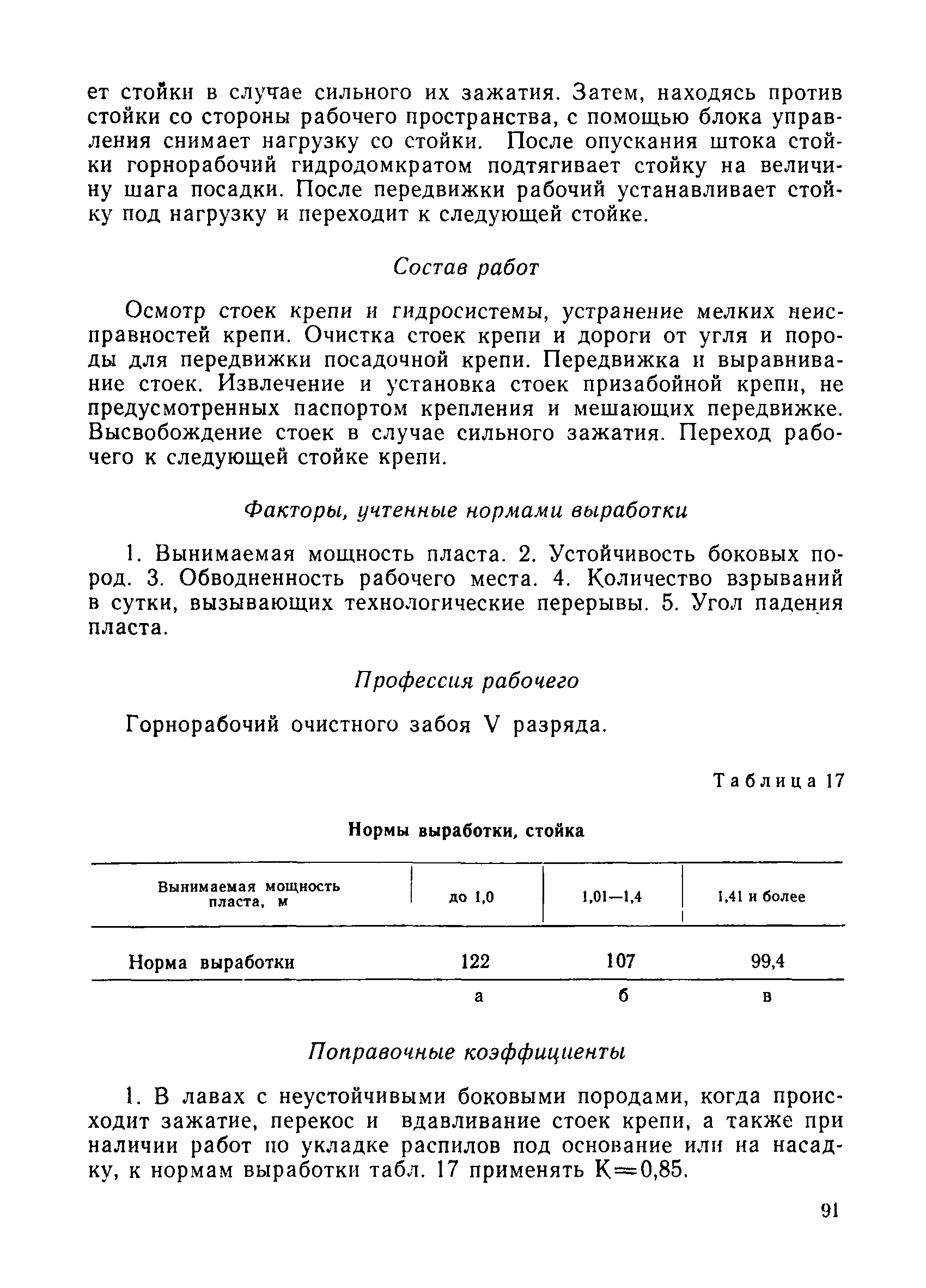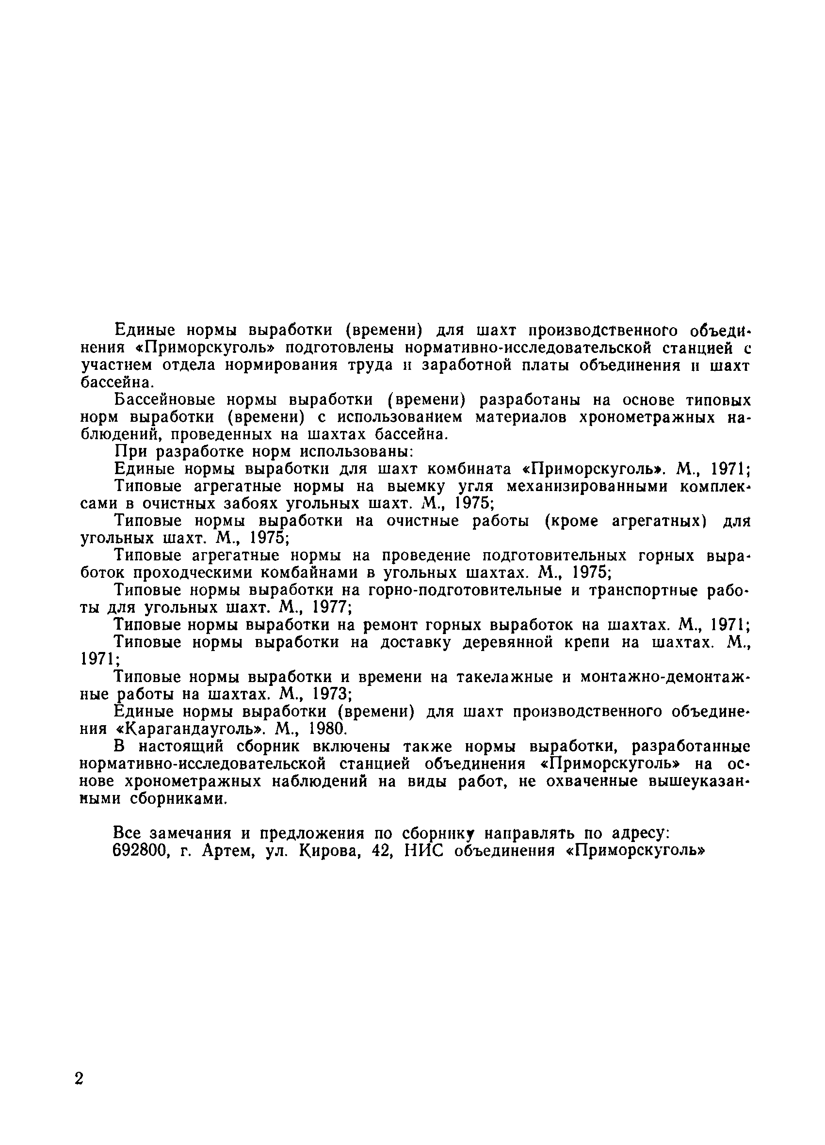 Единые нормы выработки (времени) для шахт производственного объединения "Приморскуголь"| Статус: | справочные материалы, мп, тпр | | Название рус.: | Единые нормы выработки (времени) для шахт производственного объединения "Приморскуголь" | | Дата добавления в базу: | 01.01.2018 | | Дата актуализации: | 01.01.2021 | | Область применения: | Единые нормы выработки (времени) обязательны для применения на всех действующих шахтах производственного объединения "Приморскуголь" | | Оглавление: | Общая часть Техническая часть Нормативная часть Раздел I. Очистные работы § 1. Выемка угля механизированными комплексами типа КМ-81 § 2. Выемка угля механизированными комплексами типов ОМКТ, ОКП, МК § 3. Выемка угля узкозахватными комбайнами типов КШ и ГШ-68 § 4. Оформление забоя после выемки угля узкозахватными комбайнами типов КШ и ГШ-68 § 5. Выемка угля узкозахватными комбайнами 1К-101, 2К-52, МК-67, БК-52 § 6. Оформление забоя после выемки угля узкозахватными комбайнами 1K-101, 2К-52, МК-67 и БК-52 § 7. Выемка угля комбайнами типов УКР, «Темп», КТ, А-70 в лавах на пластах наклонного и крутого падения § 8. Спуск (перегон) комбайнов типов УКР, «Темп», КТ, А-70 в лавах на пластах наклонного и крутого падения с передвижкой крана-балки § 9. Передвижка предохранительной лебедки 1ЛГКН § 10. Оформление забоя после выемки угля комбайнами типов УКР, «Темп», КТ, А-70 в лавах на пластах наклонного падения § 11. Выемка угля в лавах комбайном «Урал-2М» и подготовка его к выемке следующей полосы угля § 12. Оформление забоя после выемки угля комбайном «Урал-2М» § 13. Передвижка гидрофицированной посадочной крепи «Спутник» § 14. Выемка угля в лавах, оборудованных комбайнами К-56М A. Выемка угля Б. Разворот комбайна на пластах пологого падения B. Перегон комбайна § 15. Выемка угля проходческими комбайнами в очистных забоях на пластах пологого падения § 16. Навалоотбойка, навалка угля § 17. Бурение шпуров по углю ручными электросверлами (пневмосверлами) в лавах и камерах § 18. Уборка угля в очистных забоях с помощью скреперной установки § 19. Передвижка скреперной установки § 20. Выемка угля отбойными молотками § 21. Выемка угля с применением ВМ в очистных забоях на пластах крутого падения § 22. Крепление очистных забоев на пластах пологого и наклонного падения металлическими (клиновыми и гидравлическими) стойками § 23. Крепление очистных забоев деревянной крепью § 24. Возведение за комбайном временной деревянной крепи, предусмотренной паспортом крепления § 25. Навеска и снятие металлических шарнирных верхняков § 26. Затяжка кровли, почвы и забоя при креплении § 27. Передвижка специальной крепи типа ОКС на сопряжениях лав со штреками § 28. Установка рам на сопряжениях лав с прилегающими выработками § 29. Выбивка и извлечение металлических (клиновых и гидравлических) стоек в лавах на пластах пологого и наклонного падения при посадке кровли на металлическую органную крепь § 30. Возведение деревянной органной крепи § 31. Кладка и переноска деревянных костров § 32. Установка распорной крепи в очистных забоях § 33. Посадка кровли при помощи лебедки § 34. Бурение шпуров в стойках при посадке кровли с помощью малогабаритных патронов § 35. Передвижка перегружателей гидродомкратом при помощи упорной стойки § 36. Переноска рештаков (листов) в лавах на пластах пологого и наклонного падения § 37. Переноска деревянных рештаков (откосов) в лавах на пластах круто