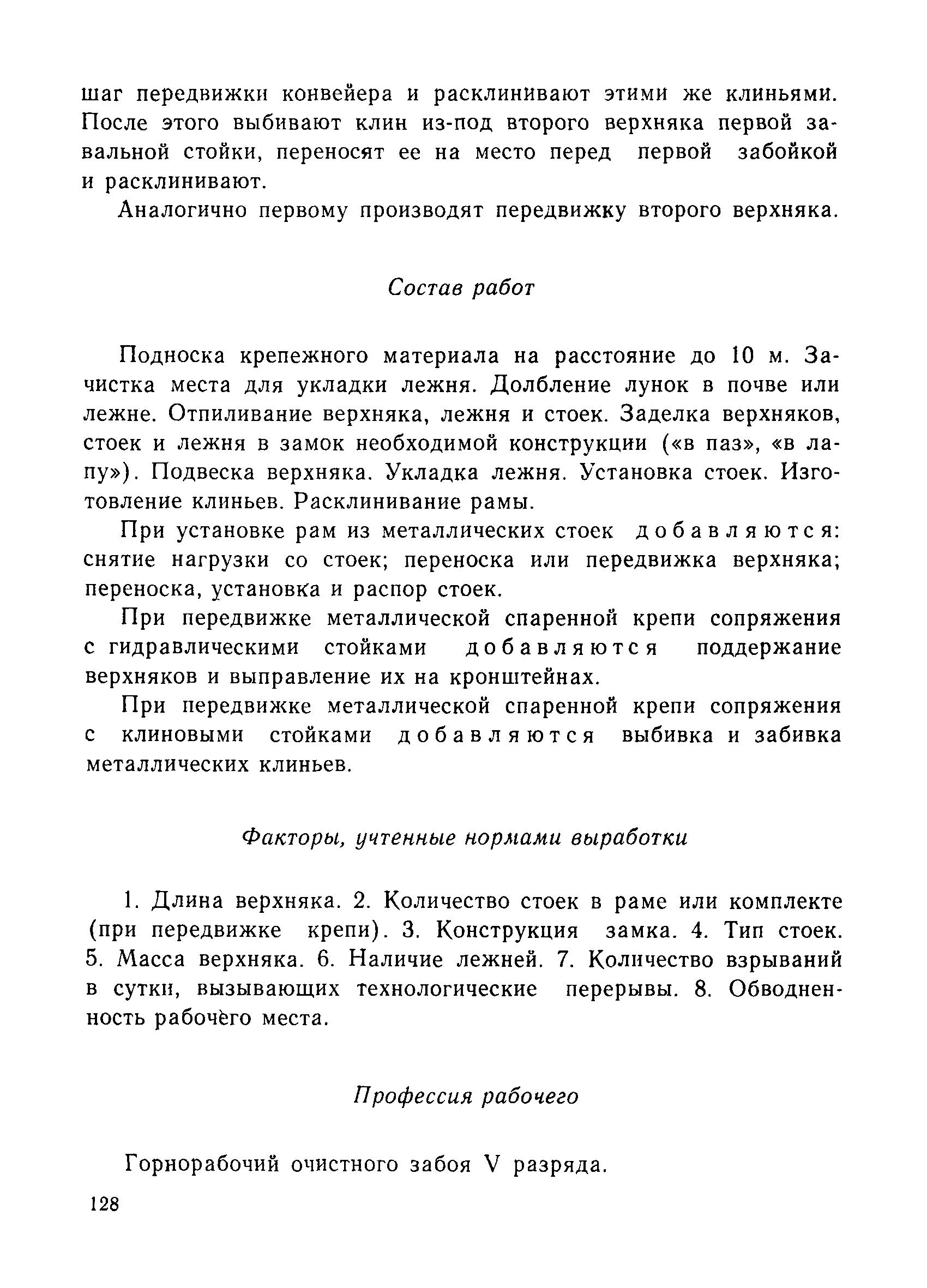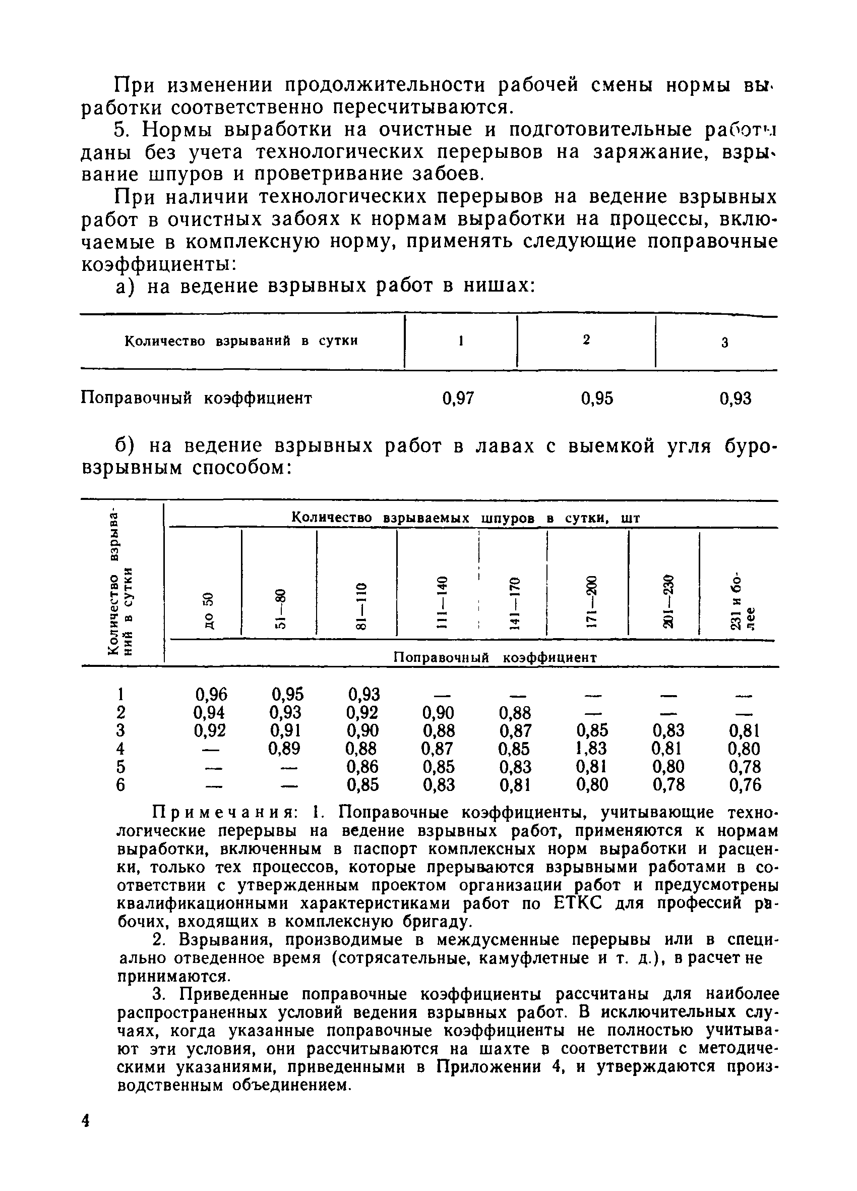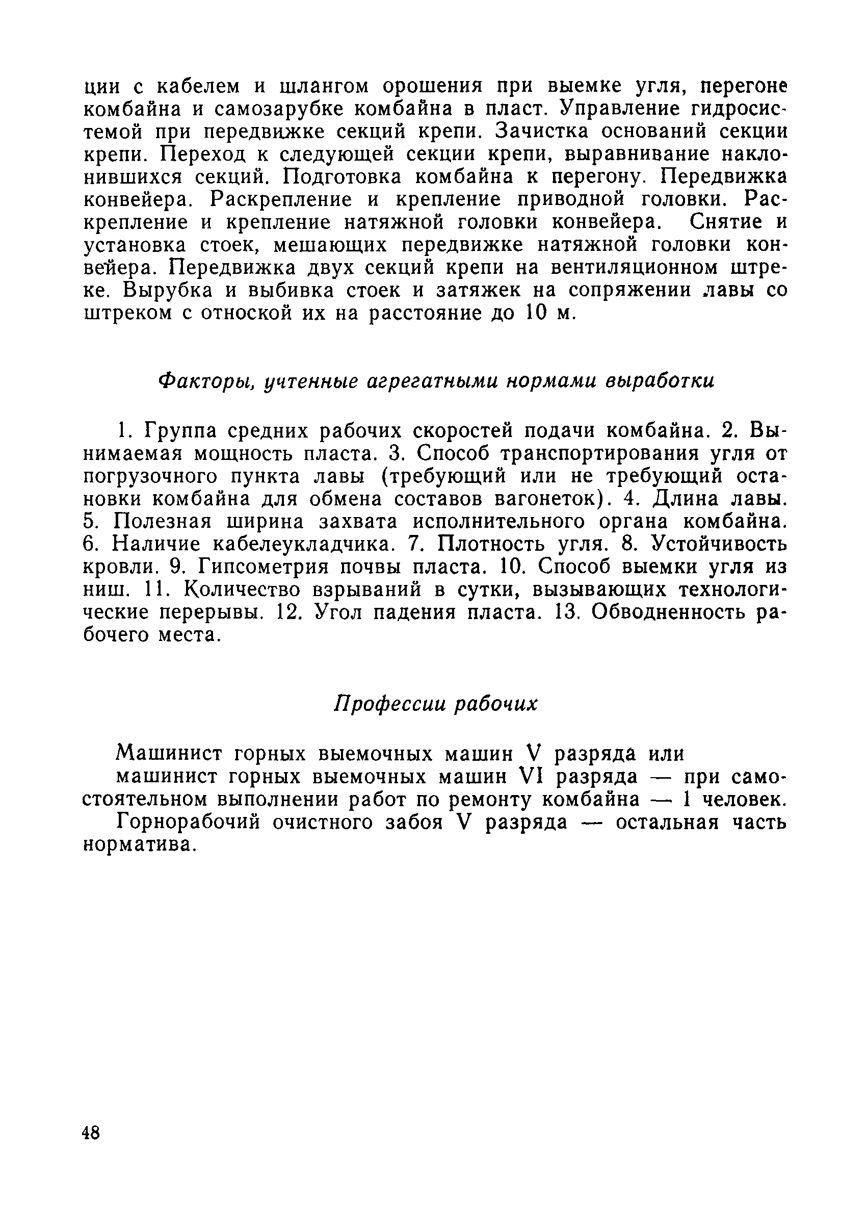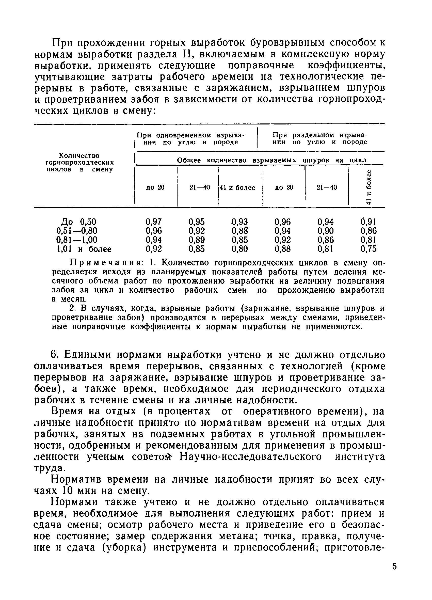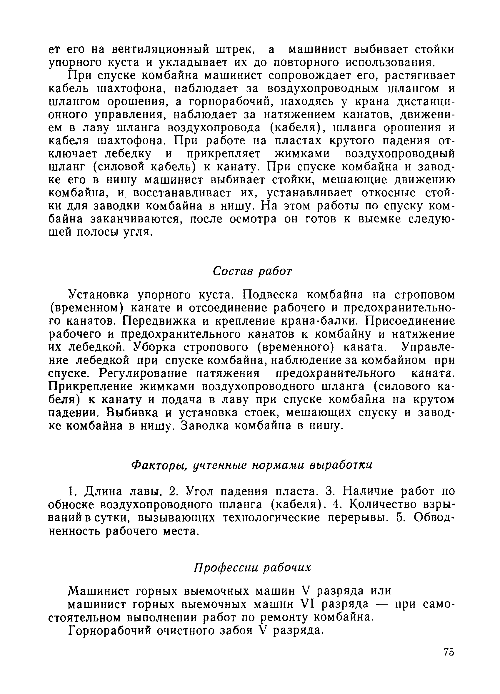 Единые нормы выработки (времени) для шахт производственного объединения "Приморскуголь"| Статус: | справочные материалы, мп, тпр | | Название рус.: | Единые нормы выработки (времени) для шахт производственного объединения "Приморскуголь" | | Дата добавления в базу: | 01.01.2018 | | Дата актуализации: | 01.01.2021 | | Область применения: | Единые нормы выработки (времени) обязательны для применения на всех действующих шахтах производственного объединения "Приморскуголь" | | Оглавление: | Общая часть Техническая часть Нормативная часть Раздел I. Очистные работы § 1. Выемка угля механизированными комплексами типа КМ-81 § 2. Выемка угля механизированными комплексами типов ОМКТ, ОКП, МК § 3. Выемка угля узкозахватными комбайнами типов КШ и ГШ-68 § 4. Оформление забоя после выемки угля узкозахватными комбайнами типов КШ и ГШ-68 § 5. Выемка угля узкозахватными комбайнами 1К-101, 2К-52, МК-67, БК-52 § 6. Оформление забоя после выемки угля узкозахватными комбайнами 1K-101, 2К-52, МК-67 и БК-52 § 7. Выемка угля комбайнами типов УКР, «Темп», КТ, А-70 в лавах на пластах наклонного и крутого падения § 8. Спуск (перегон) комбайнов типов УКР, «Темп», КТ, А-70 в лавах на пластах наклонного и крутого падения с передвижкой крана-балки § 9. Передвижка предохранительной лебедки 1ЛГКН § 10. Оформление забоя после выемки угля комбайнами типов УКР, «Темп», КТ, А-70 в лавах на пластах наклонного падения § 11. Выемка угля в лавах комбайном «Урал-2М» и подготовка его к выемке следующей полосы угля § 12. Оформление забоя после выемки угля комбайном «Урал-2М» § 13. Передвижка гидрофицированной посадочной крепи «Спутник» § 14. Выемка угля в лавах, оборудованных комбайнами К-56М A. Выемка угля Б. Разворот комбайна на пластах пологого падения B. Перегон комбайна § 15. Выемка угля проходческими комбайнами в очистных забоях на пластах пологого падения § 16. Навалоотбойка, навалка угля § 17. Бурение шпуров по углю ручными электросверлами (пневмосверлами) в лавах и камерах § 18. Уборка угля в очистных забоях с помощью скреперной установки § 19. Передвижка скреперной установки § 20. Выемка угля отбойными молотками § 21. Выемка угля с применением ВМ в очистных забоях на пластах крутого падения § 22. Крепление очистных забоев на пластах пологого и наклонного падения металлическими (клиновыми и гидравлическими) стойками § 23. Крепление очистных забоев деревянной крепью § 24. Возведение за комбайном временной деревянной крепи, предусмотренной паспортом крепления § 25. Навеска и снятие металлических шарнирных верхняков § 26. Затяжка кровли, почвы и забоя при креплении § 27. Передвижка специальной крепи типа ОКС на сопряжениях лав со штреками § 28. Установка рам на сопряжениях лав с прилегающими выработками § 29. Выбивка и извлечение металлических (клиновых и гидравлических) стоек в лавах на пластах пологого и наклонного падения при посадке кровли на металлическую органную крепь § 30. Возведение деревянной органной крепи § 31. Кладка и переноска деревянных костров § 32. Установка распорной крепи в очистных забоях § 33. Посадка кровли при помощи лебедки § 34. Бурение шпуров в стойках при посадке кровли с помощью малогабаритных патронов § 35. Передвижка перегружателей гидродомкратом при помощи упорной стойки § 36. Переноска рештаков (листов) в лавах на пластах пологого и наклонного падения § 37. Переноска деревянных рештаков (откосов) в лавах на пластах круто