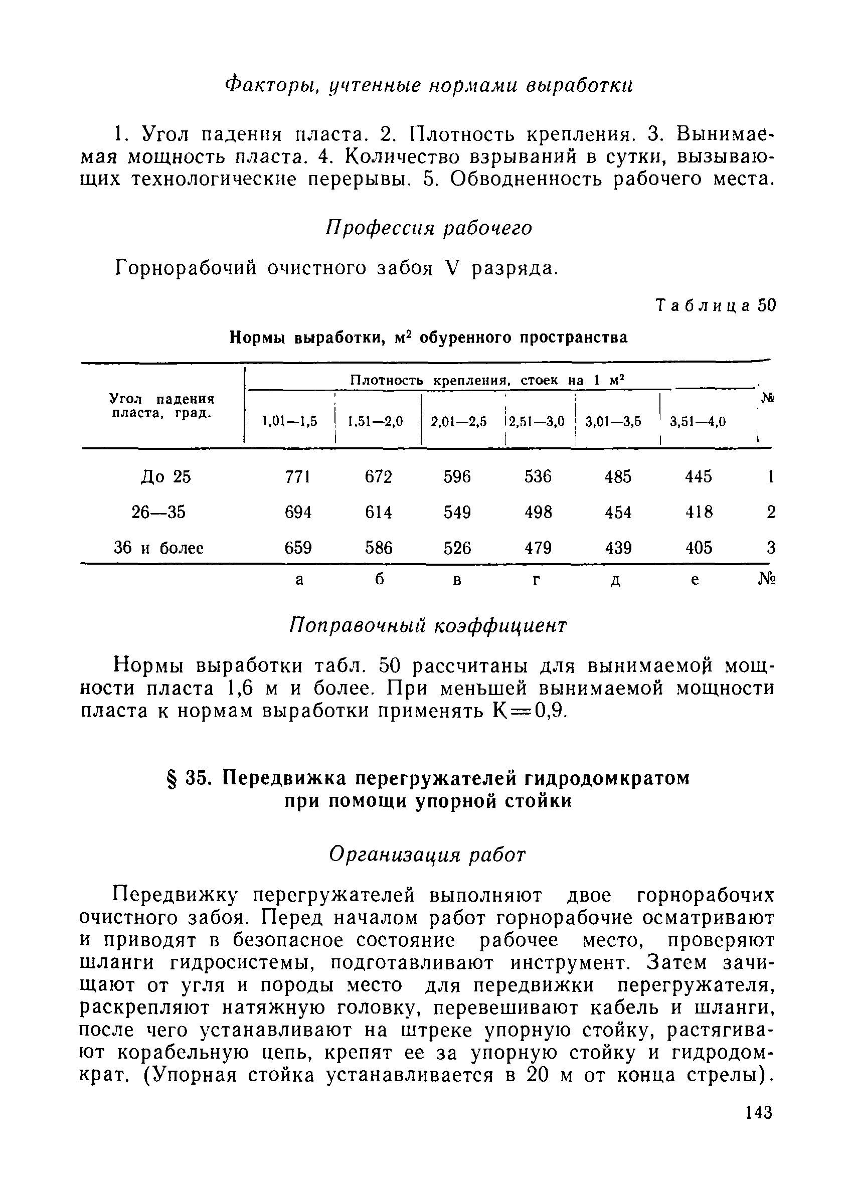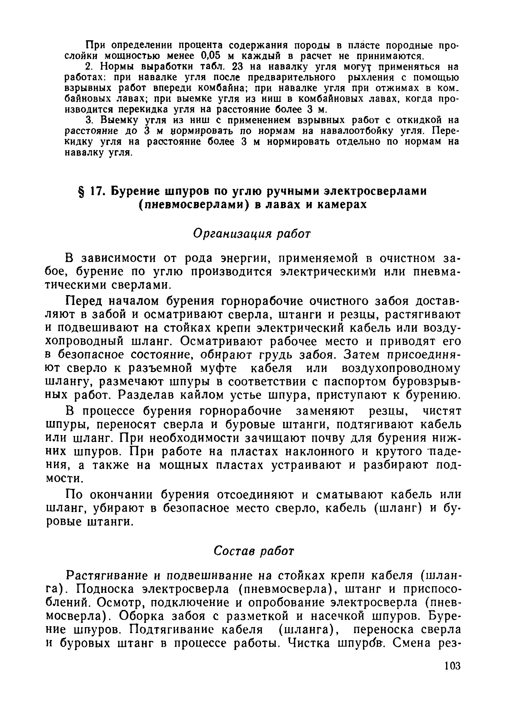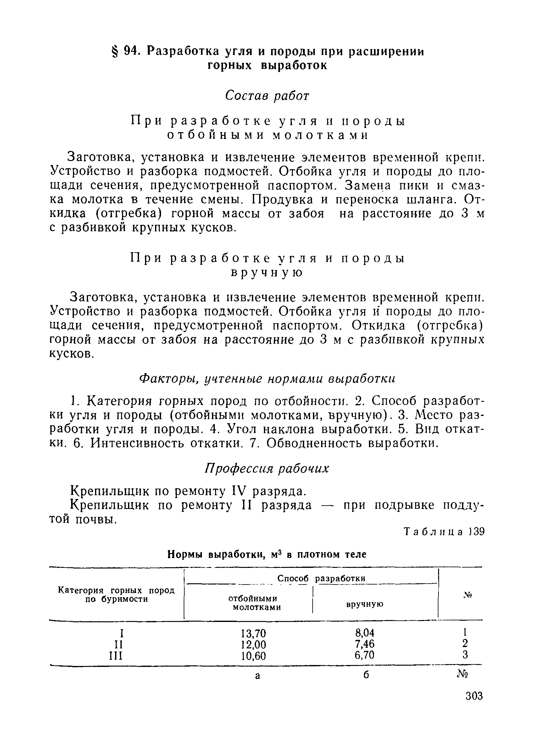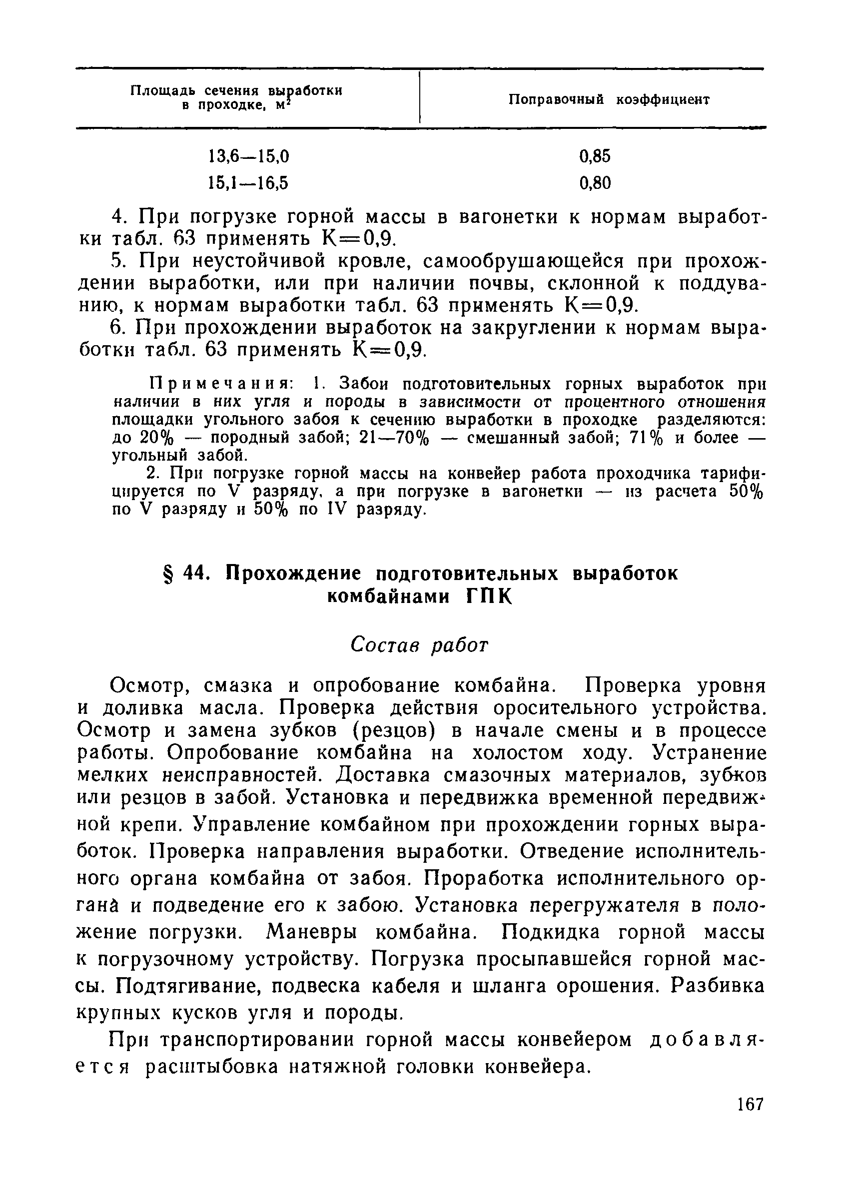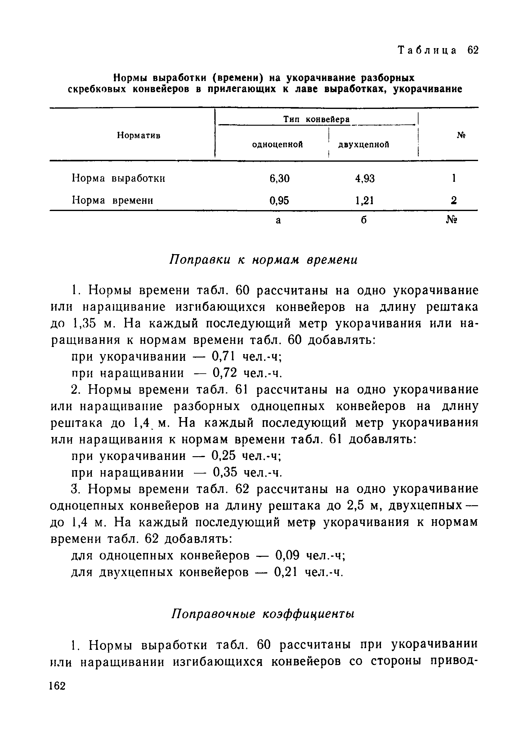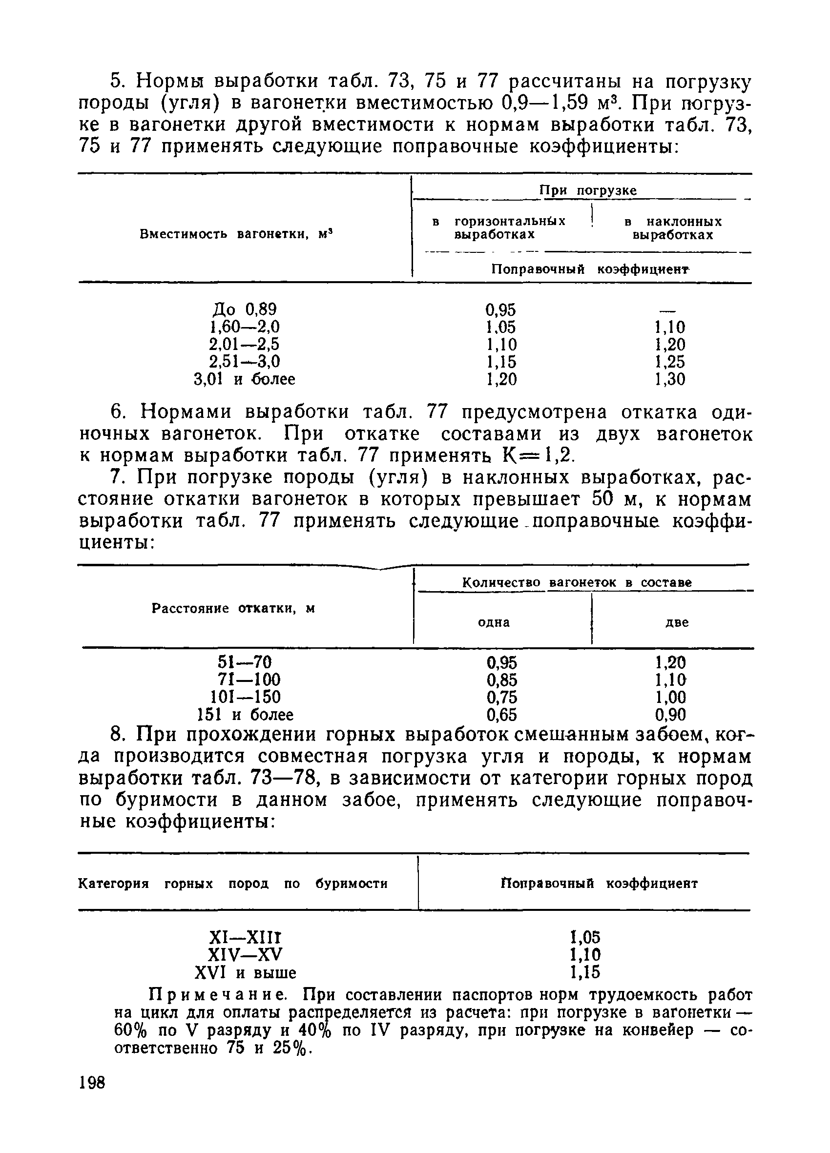 Единые нормы выработки (времени) для шахт производственного объединения "Приморскуголь"| Статус: | справочные материалы, мп, тпр | | Название рус.: | Единые нормы выработки (времени) для шахт производственного объединения "Приморскуголь" | | Дата добавления в базу: | 01.01.2018 | | Дата актуализации: | 01.01.2021 | | Область применения: | Единые нормы выработки (времени) обязательны для применения на всех действующих шахтах производственного объединения "Приморскуголь" | | Оглавление: | Общая часть Техническая часть Нормативная часть Раздел I. Очистные работы § 1. Выемка угля механизированными комплексами типа КМ-81 § 2. Выемка угля механизированными комплексами типов ОМКТ, ОКП, МК § 3. Выемка угля узкозахватными комбайнами типов КШ и ГШ-68 § 4. Оформление забоя после выемки угля узкозахватными комбайнами типов КШ и ГШ-68 § 5. Выемка угля узкозахватными комбайнами 1К-101, 2К-52, МК-67, БК-52 § 6. Оформление забоя после выемки угля узкозахватными комбайнами 1K-101, 2К-52, МК-67 и БК-52 § 7. Выемка угля комбайнами типов УКР, «Темп», КТ, А-70 в лавах на пластах наклонного и крутого падения § 8. Спуск (перегон) комбайнов типов УКР, «Темп», КТ, А-70 в лавах на пластах наклонного и крутого падения с передвижкой крана-балки § 9. Передвижка предохранительной лебедки 1ЛГКН § 10. Оформление забоя после выемки угля комбайнами типов УКР, «Темп», КТ, А-70 в лавах на пластах наклонного падения § 11. Выемка угля в лавах комбайном «Урал-2М» и подготовка его к выемке следующей полосы угля § 12. Оформление забоя после выемки угля комбайном «Урал-2М» § 13. Передвижка гидрофицированной посадочной крепи «Спутник» § 14. Выемка угля в лавах, оборудованных комбайнами К-56М A. Выемка угля Б. Разворот комбайна на пластах пологого падения B. Перегон комбайна § 15. Выемка угля проходческими комбайнами в очистных забоях на пластах пологого падения § 16. Навалоотбойка, навалка угля § 17. Бурение шпуров по углю ручными электросверлами (пневмосверлами) в лавах и камерах § 18. Уборка угля в очистных забоях с помощью скреперной установки § 19. Передвижка скреперной установки § 20. Выемка угля отбойными молотками § 21. Выемка угля с применением ВМ в очистных забоях на пластах крутого падения § 22. Крепление очистных забоев на пластах пологого и наклонного падения металлическими (клиновыми и гидравлическими) стойками § 23. Крепление очистных забоев деревянной крепью § 24. Возведение за комбайном временной деревянной крепи, предусмотренной паспортом крепления § 25. Навеска и снятие металлических шарнирных верхняков § 26. Затяжка кровли, почвы и забоя при креплении § 27. Передвижка специальной крепи типа ОКС на сопряжениях лав со штреками § 28. Установка рам на сопряжениях лав с прилегающими выработками § 29. Выбивка и извлечение металлических (клиновых и гидравлических) стоек в лавах на пластах пологого и наклонного падения при посадке кровли на металлическую органную крепь § 30. Возведение деревянной органной крепи § 31. Кладка и переноска деревянных костров § 32. Установка распорной крепи в очистных забоях § 33. Посадка кровли при помощи лебедки § 34. Бурение шпуров в стойках при посадке кровли с помощью малогабаритных патронов § 35. Передвижка перегружателей гидродомкратом при помощи упорной стойки § 36. Переноска рештаков (листов) в лавах на пластах пологого и наклонного падения § 37. Переноска деревянных рештаков (откосов) в лавах на пластах круто