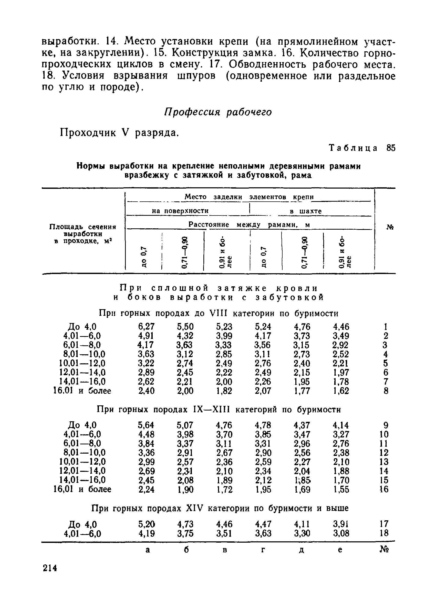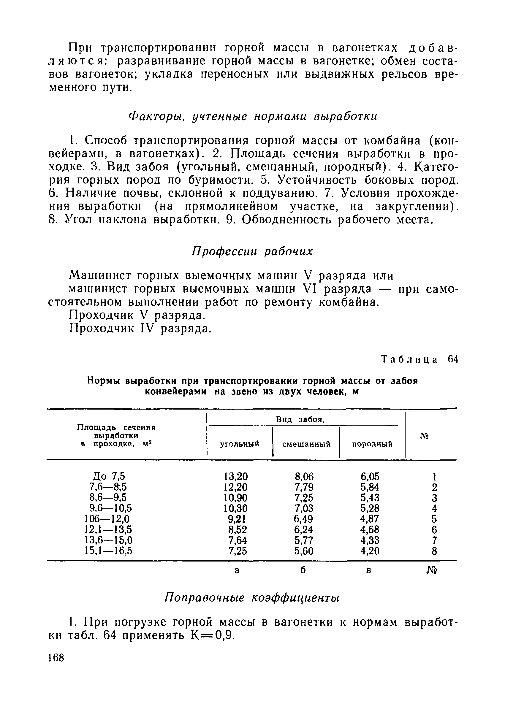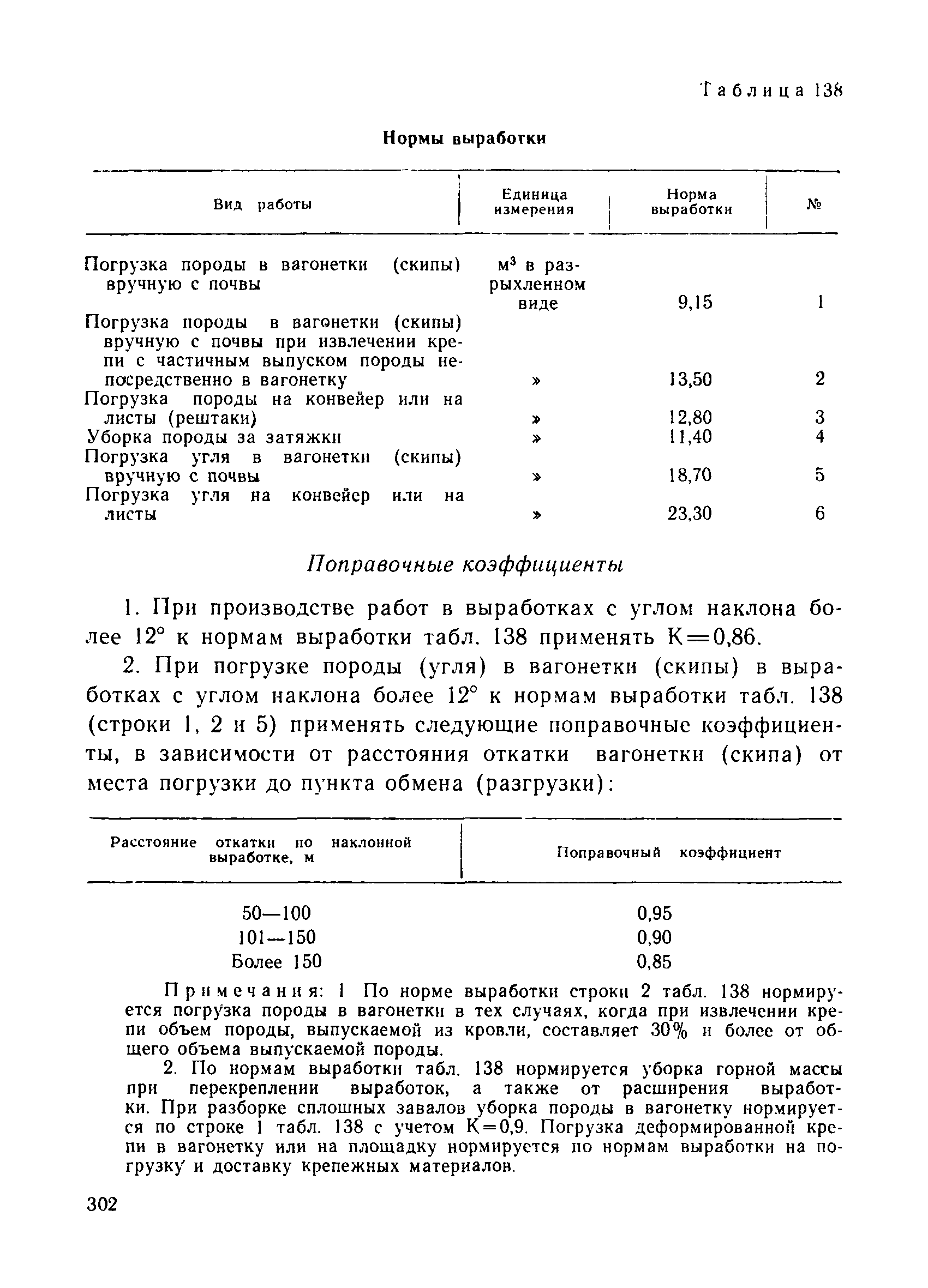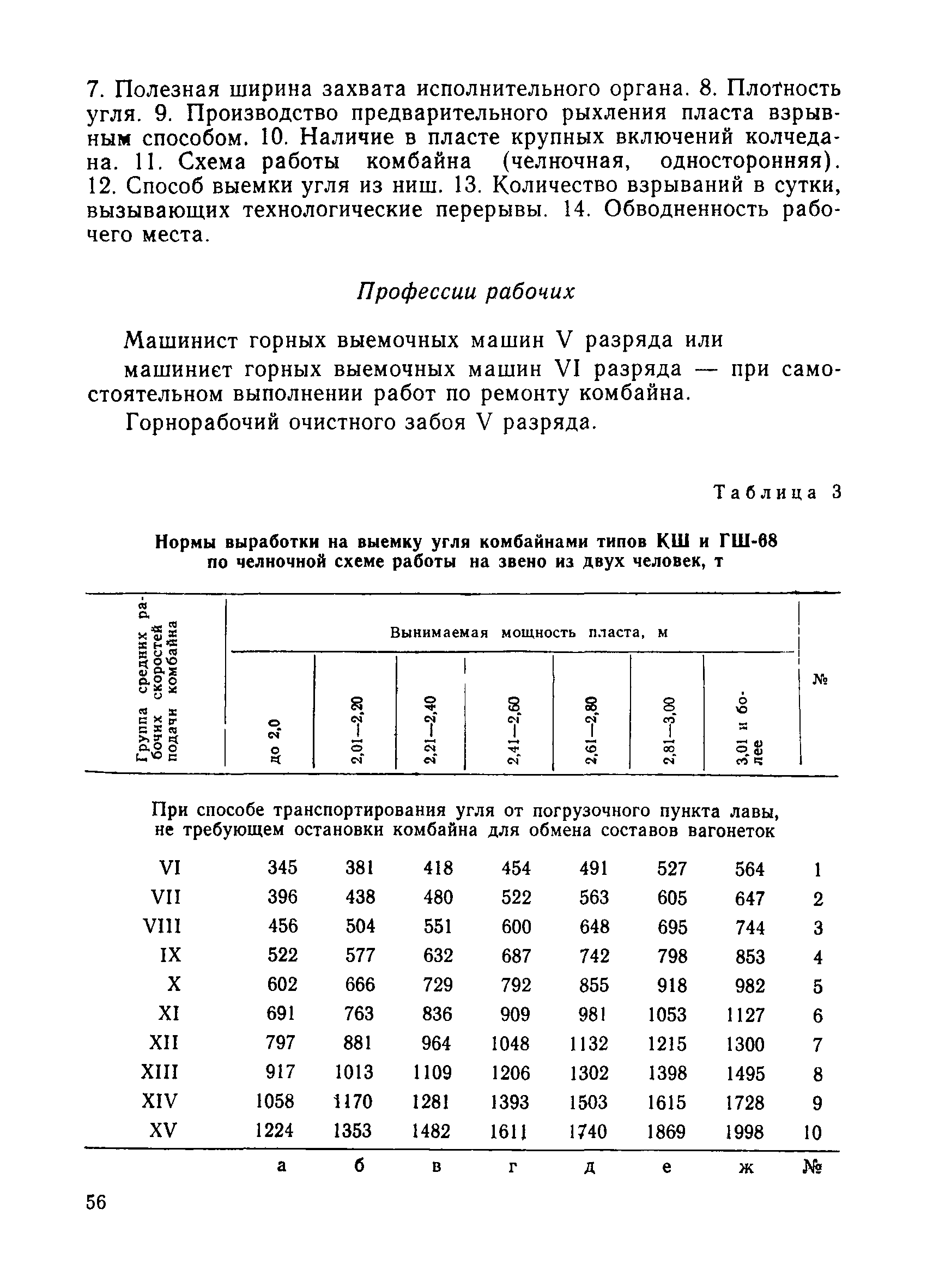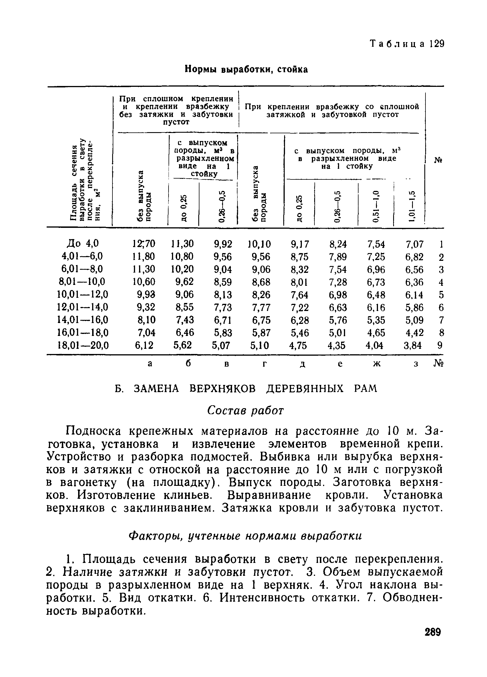 Единые нормы выработки (времени) для шахт производственного объединения "Приморскуголь"| Статус: | справочные материалы, мп, тпр | | Название рус.: | Единые нормы выработки (времени) для шахт производственного объединения "Приморскуголь" | | Дата добавления в базу: | 01.01.2018 | | Дата актуализации: | 01.01.2021 | | Область применения: | Единые нормы выработки (времени) обязательны для применения на всех действующих шахтах производственного объединения "Приморскуголь" | | Оглавление: | Общая часть Техническая часть Нормативная часть Раздел I. Очистные работы § 1. Выемка угля механизированными комплексами типа КМ-81 § 2. Выемка угля механизированными комплексами типов ОМКТ, ОКП, МК § 3. Выемка угля узкозахватными комбайнами типов КШ и ГШ-68 § 4. Оформление забоя после выемки угля узкозахватными комбайнами типов КШ и ГШ-68 § 5. Выемка угля узкозахватными комбайнами 1К-101, 2К-52, МК-67, БК-52 § 6. Оформление забоя после выемки угля узкозахватными комбайнами 1K-101, 2К-52, МК-67 и БК-52 § 7. Выемка угля комбайнами типов УКР, «Темп», КТ, А-70 в лавах на пластах наклонного и крутого падения § 8. Спуск (перегон) комбайнов типов УКР, «Темп», КТ, А-70 в лавах на пластах наклонного и крутого падения с передвижкой крана-балки § 9. Передвижка предохранительной лебедки 1ЛГКН § 10. Оформление забоя после выемки угля комбайнами типов УКР, «Темп», КТ, А-70 в лавах на пластах наклонного падения § 11. Выемка угля в лавах комбайном «Урал-2М» и подготовка его к выемке следующей полосы угля § 12. Оформление забоя после выемки угля комбайном «Урал-2М» § 13. Передвижка гидрофицированной посадочной крепи «Спутник» § 14. Выемка угля в лавах, оборудованных комбайнами К-56М A. Выемка угля Б. Разворот комбайна на пластах пологого падения B. Перегон комбайна § 15. Выемка угля проходческими комбайнами в очистных забоях на пластах пологого падения § 16. Навалоотбойка, навалка угля § 17. Бурение шпуров по углю ручными электросверлами (пневмосверлами) в лавах и камерах § 18. Уборка угля в очистных забоях с помощью скреперной установки § 19. Передвижка скреперной установки § 20. Выемка угля отбойными молотками § 21. Выемка угля с применением ВМ в очистных забоях на пластах крутого падения § 22. Крепление очистных забоев на пластах пологого и наклонного падения металлическими (клиновыми и гидравлическими) стойками § 23. Крепление очистных забоев деревянной крепью § 24. Возведение за комбайном временной деревянной крепи, предусмотренной паспортом крепления § 25. Навеска и снятие металлических шарнирных верхняков § 26. Затяжка кровли, почвы и забоя при креплении § 27. Передвижка специальной крепи типа ОКС на сопряжениях лав со штреками § 28. Установка рам на сопряжениях лав с прилегающими выработками § 29. Выбивка и извлечение металлических (клиновых и гидравлических) стоек в лавах на пластах пологого и наклонного падения при посадке кровли на металлическую органную крепь § 30. Возведение деревянной органной крепи § 31. Кладка и переноска деревянных костров § 32. Установка распорной крепи в очистных забоях § 33. Посадка кровли при помощи лебедки § 34. Бурение шпуров в стойках при посадке кровли с помощью малогабаритных патронов § 35. Передвижка перегружателей гидродомкратом при помощи упорной стойки § 36. Переноска рештаков (листов) в лавах на пластах пологого и наклонного падения § 37. Переноска деревянных рештаков (откосов) в лавах на пластах круто