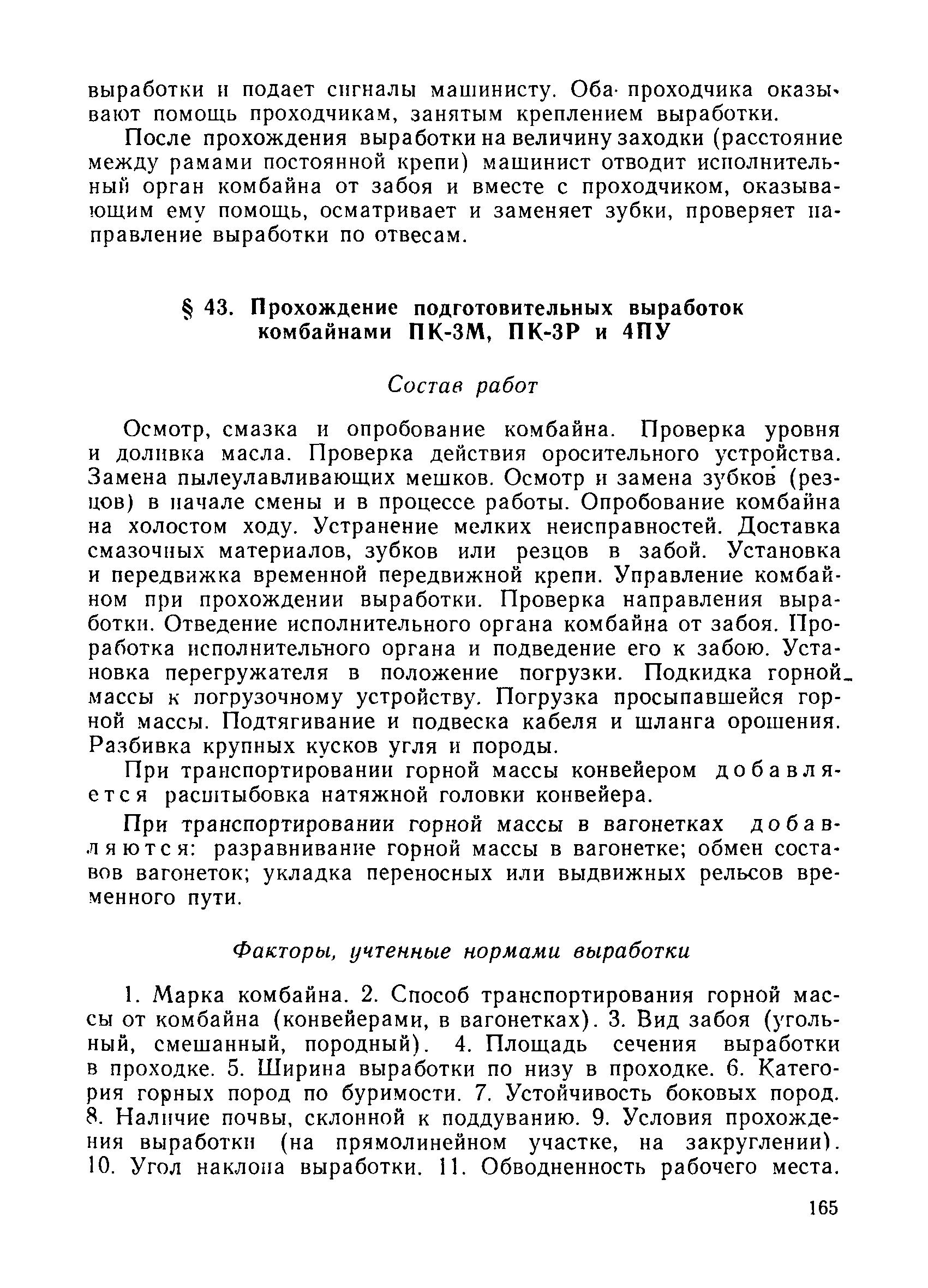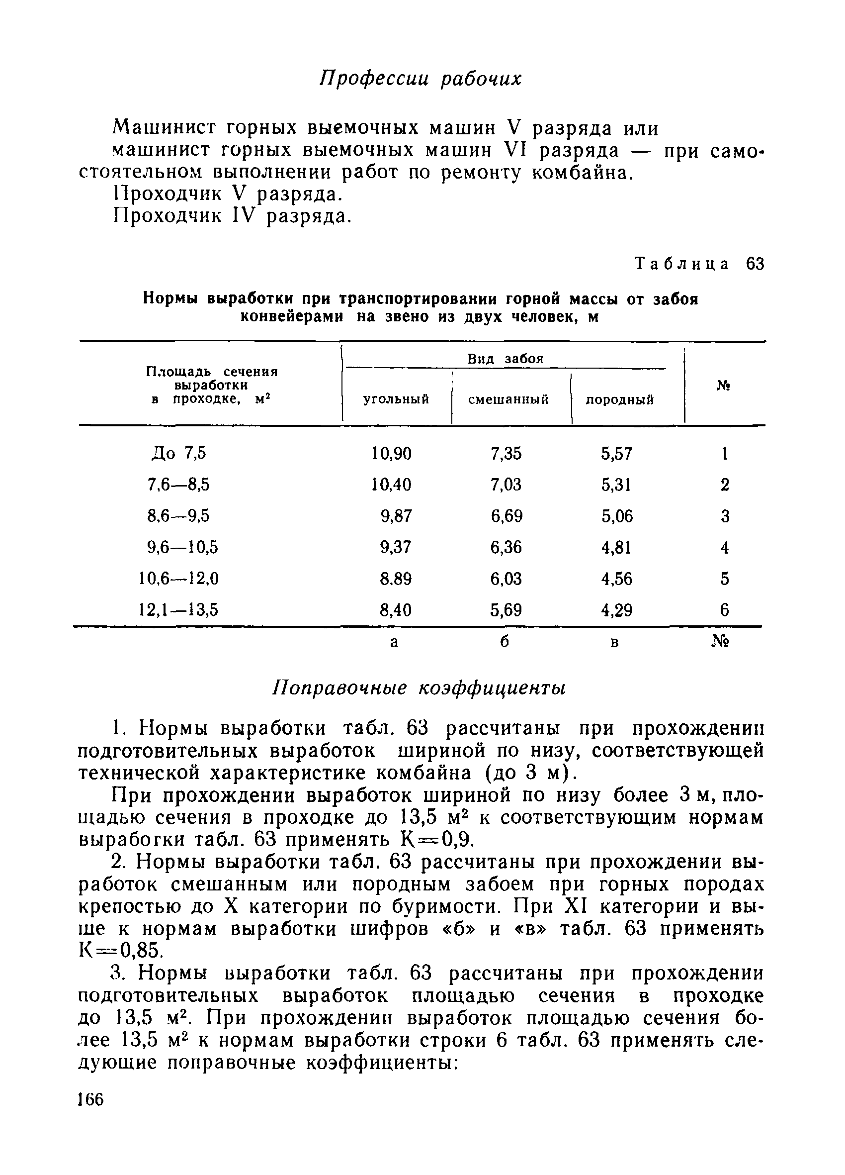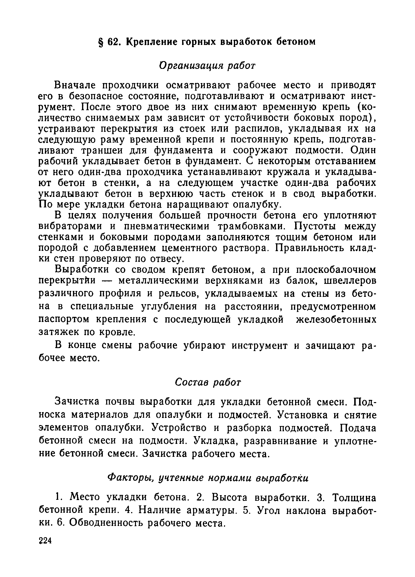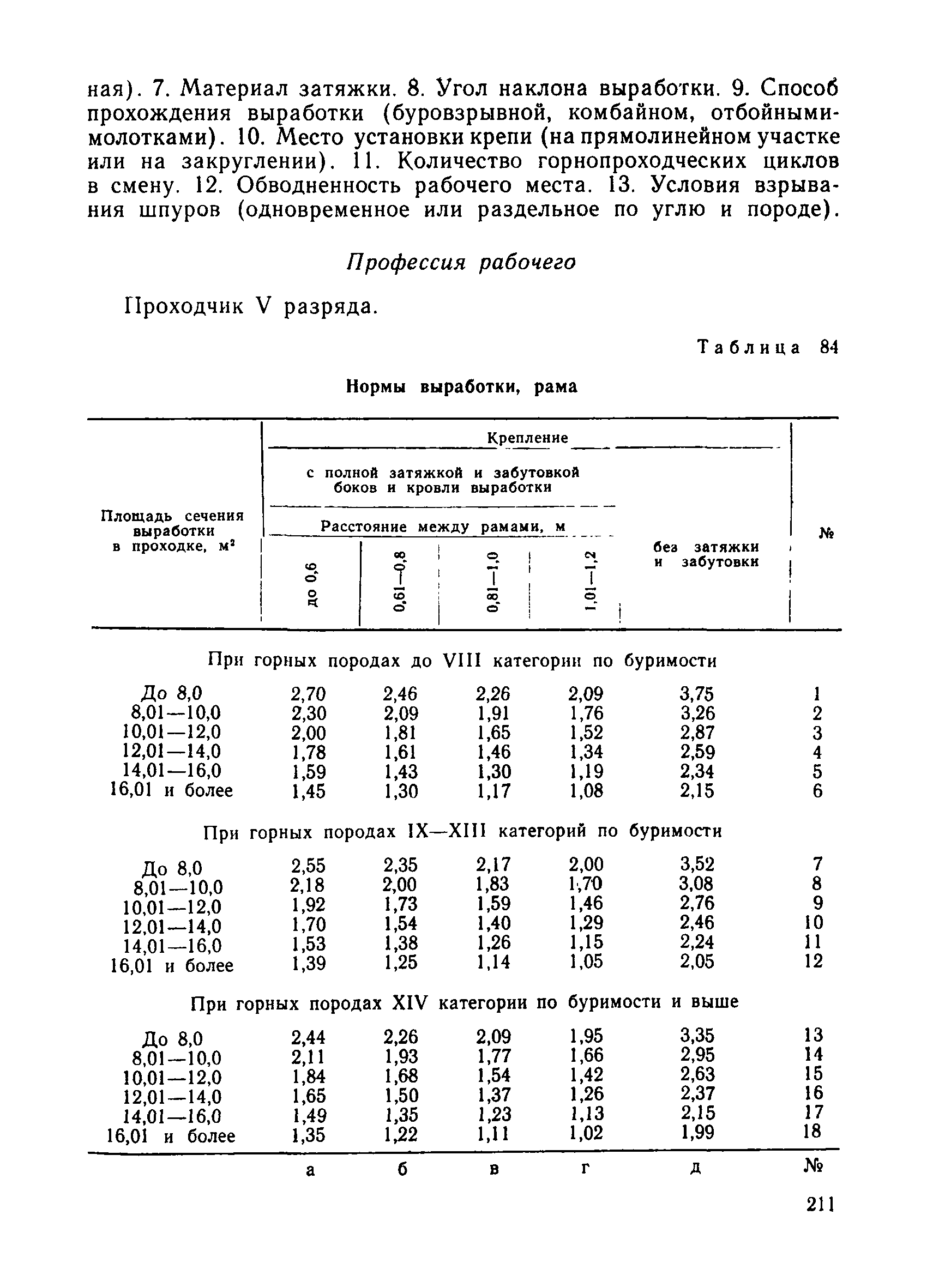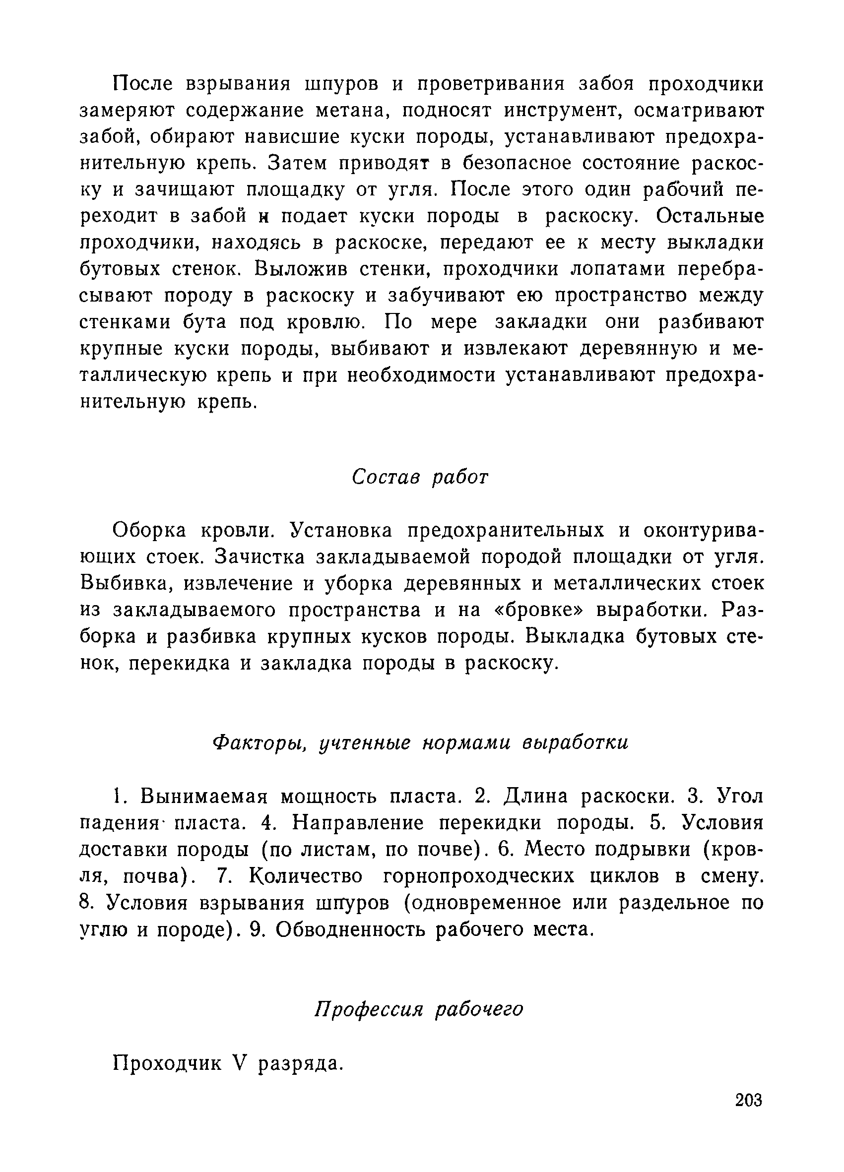 Единые нормы выработки (времени) для шахт производственного объединения "Приморскуголь"| Статус: | справочные материалы, мп, тпр | | Название рус.: | Единые нормы выработки (времени) для шахт производственного объединения "Приморскуголь" | | Дата добавления в базу: | 01.01.2018 | | Дата актуализации: | 01.01.2021 | | Область применения: | Единые нормы выработки (времени) обязательны для применения на всех действующих шахтах производственного объединения "Приморскуголь" | | Оглавление: | Общая часть Техническая часть Нормативная часть Раздел I. Очистные работы § 1. Выемка угля механизированными комплексами типа КМ-81 § 2. Выемка угля механизированными комплексами типов ОМКТ, ОКП, МК § 3. Выемка угля узкозахватными комбайнами типов КШ и ГШ-68 § 4. Оформление забоя после выемки угля узкозахватными комбайнами типов КШ и ГШ-68 § 5. Выемка угля узкозахватными комбайнами 1К-101, 2К-52, МК-67, БК-52 § 6. Оформление забоя после выемки угля узкозахватными комбайнами 1K-101, 2К-52, МК-67 и БК-52 § 7. Выемка угля комбайнами типов УКР, «Темп», КТ, А-70 в лавах на пластах наклонного и крутого падения § 8. Спуск (перегон) комбайнов типов УКР, «Темп», КТ, А-70 в лавах на пластах наклонного и крутого падения с передвижкой крана-балки § 9. Передвижка предохранительной лебедки 1ЛГКН § 10. Оформление забоя после выемки угля комбайнами типов УКР, «Темп», КТ, А-70 в лавах на пластах наклонного падения § 11. Выемка угля в лавах комбайном «Урал-2М» и подготовка его к выемке следующей полосы угля § 12. Оформление забоя после выемки угля комбайном «Урал-2М» § 13. Передвижка гидрофицированной посадочной крепи «Спутник» § 14. Выемка угля в лавах, оборудованных комбайнами К-56М A. Выемка угля Б. Разворот комбайна на пластах пологого падения B. Перегон комбайна § 15. Выемка угля проходческими комбайнами в очистных забоях на пластах пологого падения § 16. Навалоотбойка, навалка угля § 17. Бурение шпуров по углю ручными электросверлами (пневмосверлами) в лавах и камерах § 18. Уборка угля в очистных забоях с помощью скреперной установки § 19. Передвижка скреперной установки § 20. Выемка угля отбойными молотками § 21. Выемка угля с применением ВМ в очистных забоях на пластах крутого падения § 22. Крепление очистных забоев на пластах пологого и наклонного падения металлическими (клиновыми и гидравлическими) стойками § 23. Крепление очистных забоев деревянной крепью § 24. Возведение за комбайном временной деревянной крепи, предусмотренной паспортом крепления § 25. Навеска и снятие металлических шарнирных верхняков § 26. Затяжка кровли, почвы и забоя при креплении § 27. Передвижка специальной крепи типа ОКС на сопряжениях лав со штреками § 28. Установка рам на сопряжениях лав с прилегающими выработками § 29. Выбивка и извлечение металлических (клиновых и гидравлических) стоек в лавах на пластах пологого и наклонного падения при посадке кровли на металлическую органную крепь § 30. Возведение деревянной органной крепи § 31. Кладка и переноска деревянных костров § 32. Установка распорной крепи в очистных забоях § 33. Посадка кровли при помощи лебедки § 34. Бурение шпуров в стойках при посадке кровли с помощью малогабаритных патронов § 35. Передвижка перегружателей гидродомкратом при помощи упорной стойки § 36. Переноска рештаков (листов) в лавах на пластах пологого и наклонного падения § 37. Переноска деревянных рештаков (откосов) в лавах на пластах круто