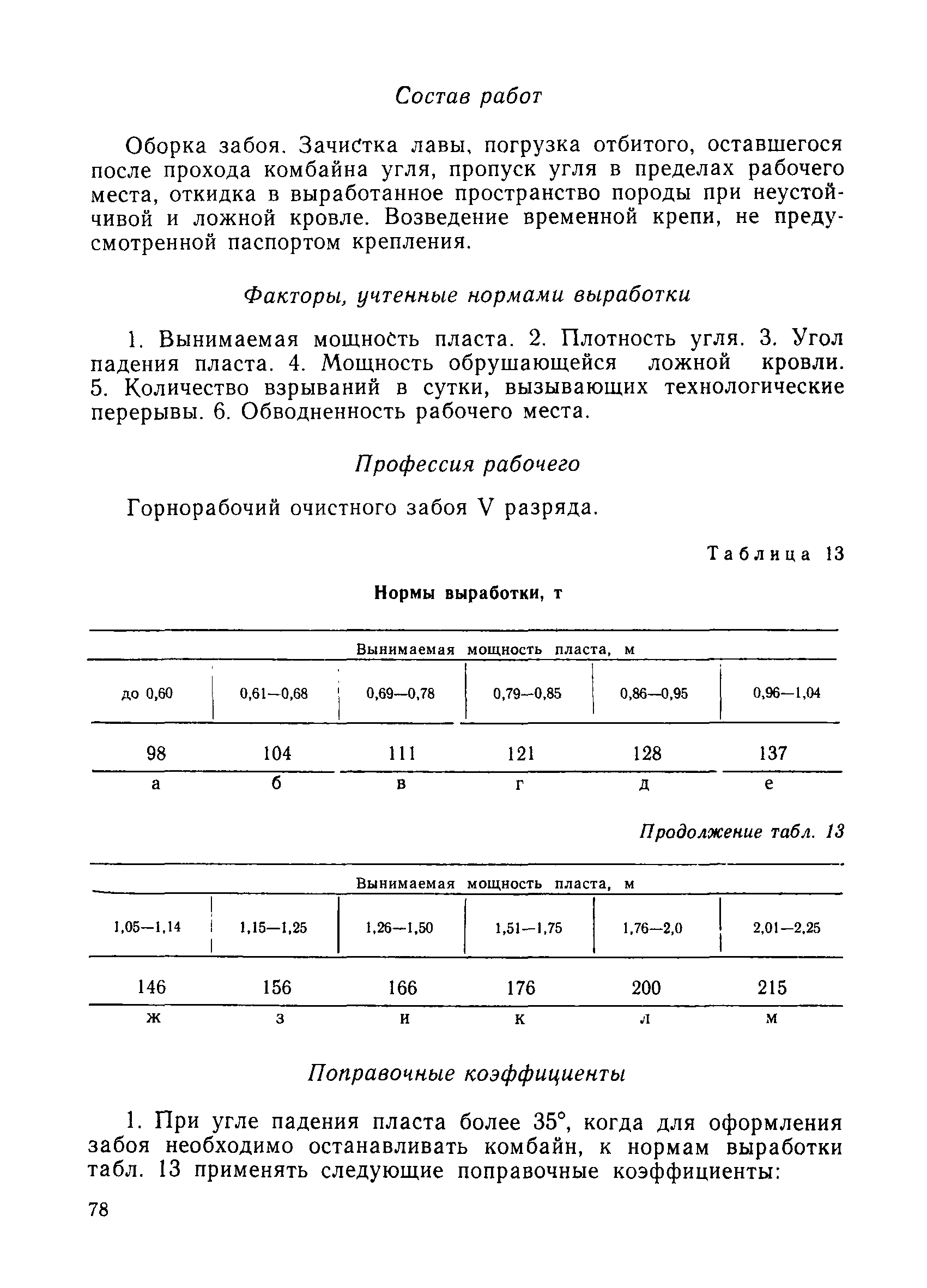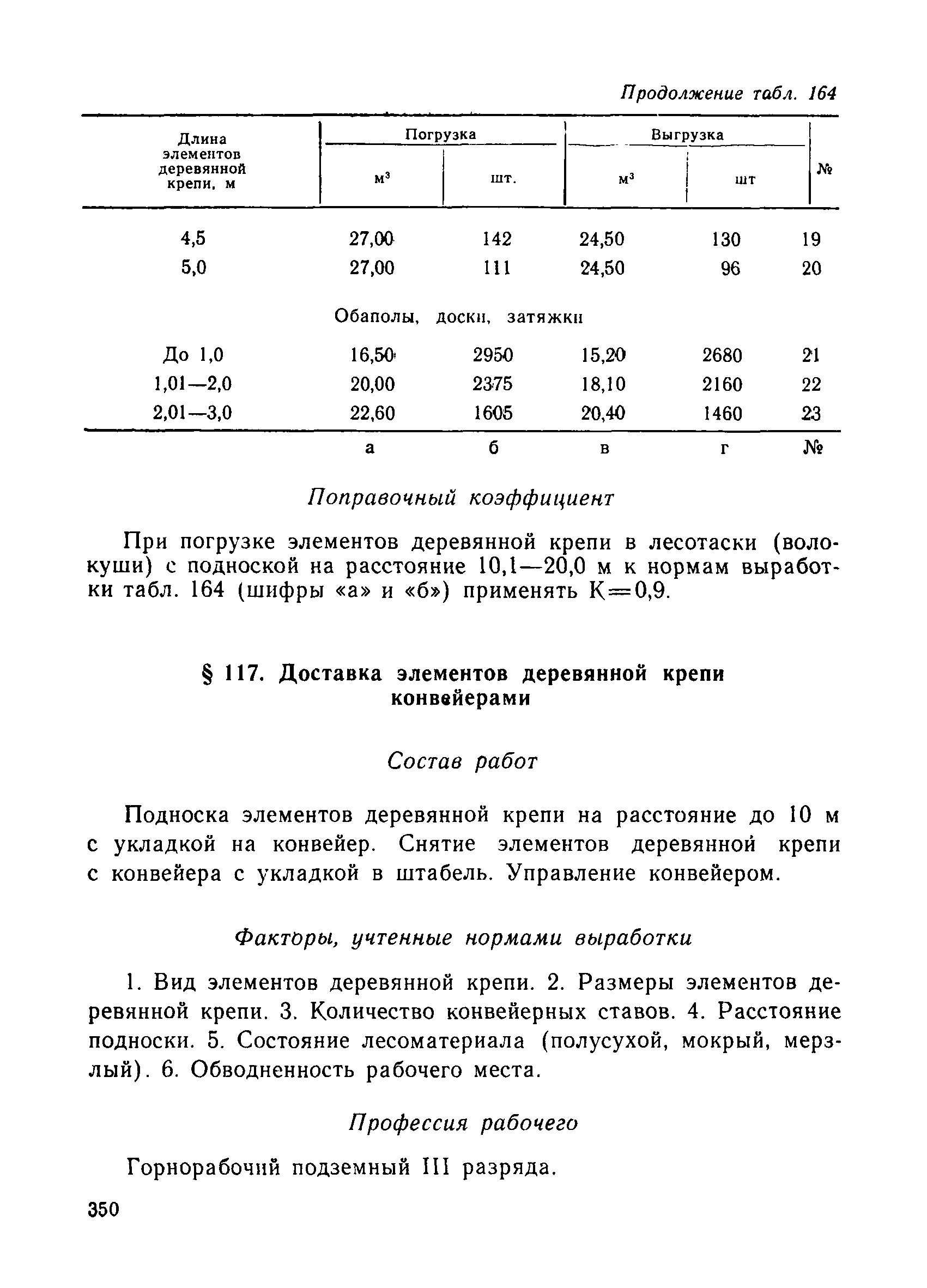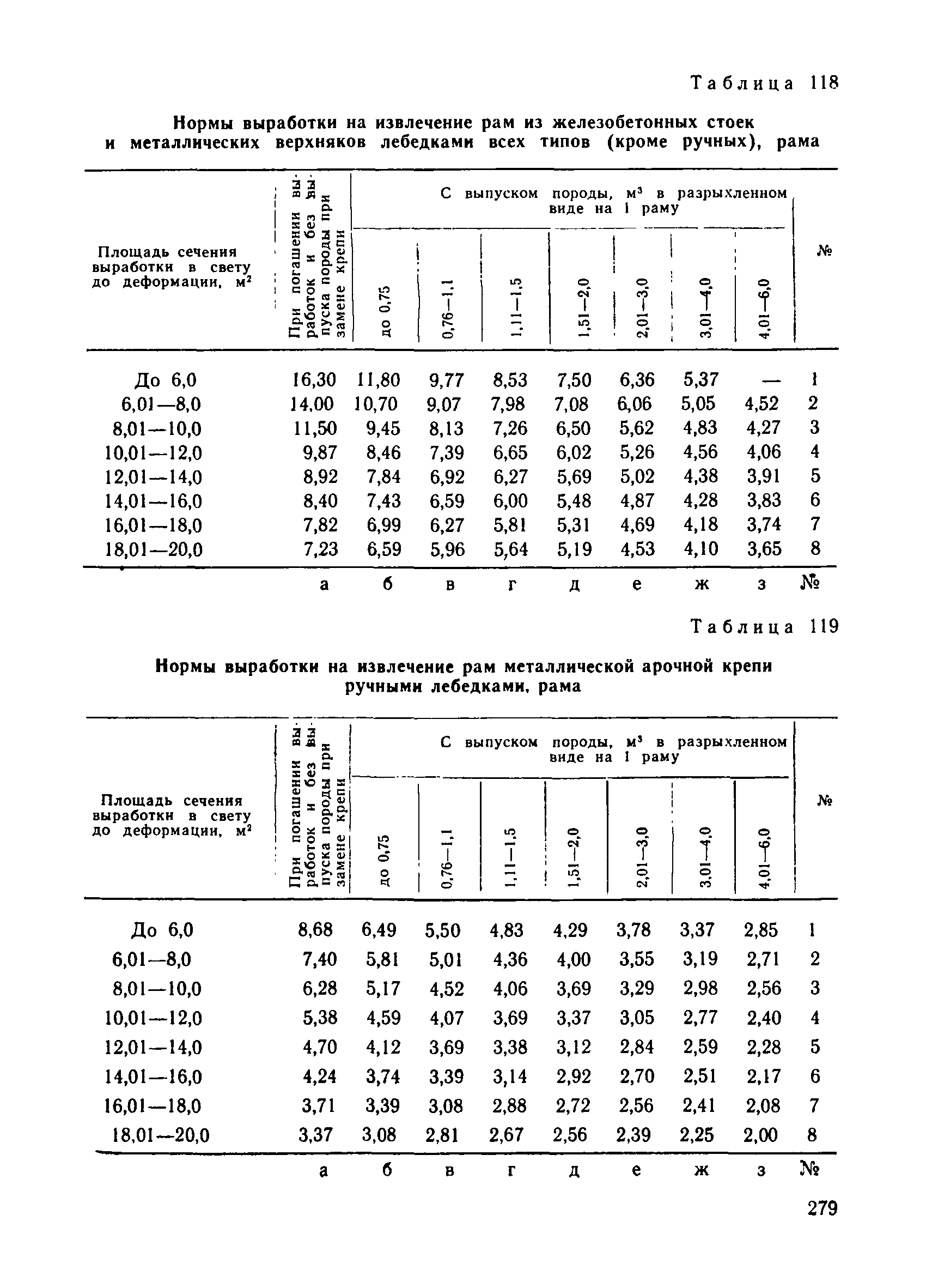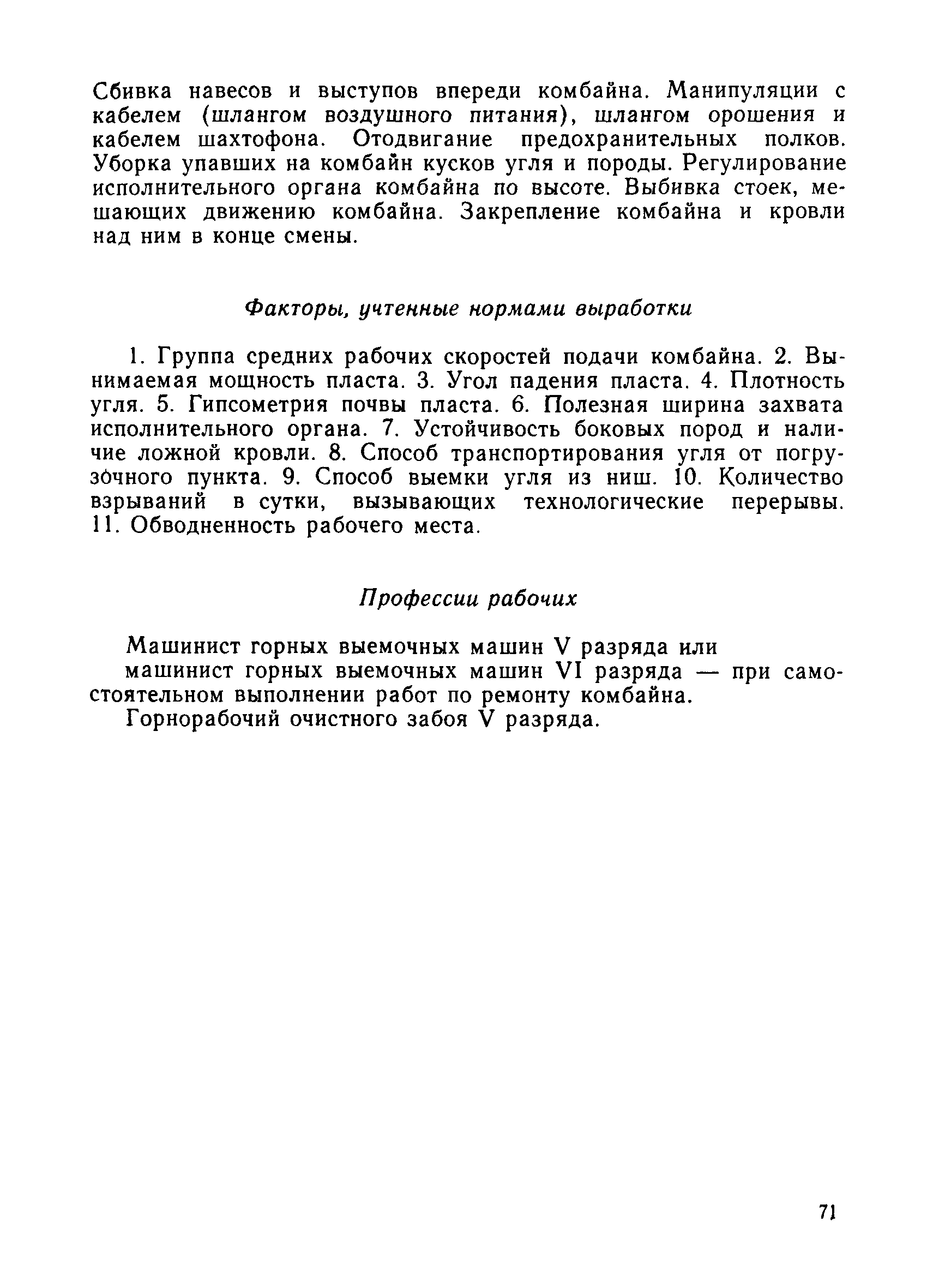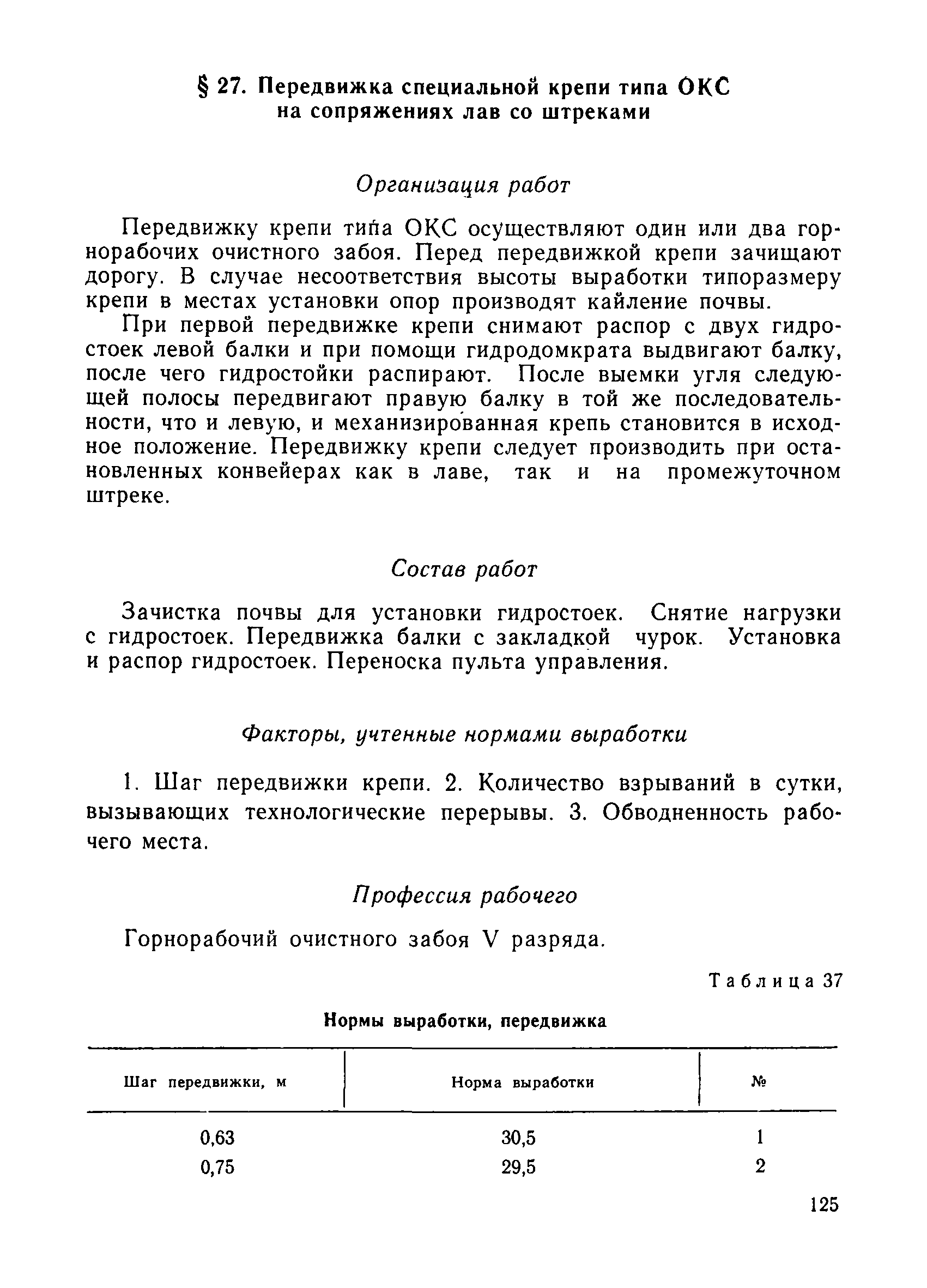 Единые нормы выработки (времени) для шахт производственного объединения "Приморскуголь"| Статус: | справочные материалы, мп, тпр | | Название рус.: | Единые нормы выработки (времени) для шахт производственного объединения "Приморскуголь" | | Дата добавления в базу: | 01.01.2018 | | Дата актуализации: | 01.01.2021 | | Область применения: | Единые нормы выработки (времени) обязательны для применения на всех действующих шахтах производственного объединения "Приморскуголь" | | Оглавление: | Общая часть Техническая часть Нормативная часть Раздел I. Очистные работы § 1. Выемка угля механизированными комплексами типа КМ-81 § 2. Выемка угля механизированными комплексами типов ОМКТ, ОКП, МК § 3. Выемка угля узкозахватными комбайнами типов КШ и ГШ-68 § 4. Оформление забоя после выемки угля узкозахватными комбайнами типов КШ и ГШ-68 § 5. Выемка угля узкозахватными комбайнами 1К-101, 2К-52, МК-67, БК-52 § 6. Оформление забоя после выемки угля узкозахватными комбайнами 1K-101, 2К-52, МК-67 и БК-52 § 7. Выемка угля комбайнами типов УКР, «Темп», КТ, А-70 в лавах на пластах наклонного и крутого падения § 8. Спуск (перегон) комбайнов типов УКР, «Темп», КТ, А-70 в лавах на пластах наклонного и крутого падения с передвижкой крана-балки § 9. Передвижка предохранительной лебедки 1ЛГКН § 10. Оформление забоя после выемки угля комбайнами типов УКР, «Темп», КТ, А-70 в лавах на пластах наклонного падения § 11. Выемка угля в лавах комбайном «Урал-2М» и подготовка его к выемке следующей полосы угля § 12. Оформление забоя после выемки угля комбайном «Урал-2М» § 13. Передвижка гидрофицированной посадочной крепи «Спутник» § 14. Выемка угля в лавах, оборудованных комбайнами К-56М A. Выемка угля Б. Разворот комбайна на пластах пологого падения B. Перегон комбайна § 15. Выемка угля проходческими комбайнами в очистных забоях на пластах пологого падения § 16. Навалоотбойка, навалка угля § 17. Бурение шпуров по углю ручными электросверлами (пневмосверлами) в лавах и камерах § 18. Уборка угля в очистных забоях с помощью скреперной установки § 19. Передвижка скреперной установки § 20. Выемка угля отбойными молотками § 21. Выемка угля с применением ВМ в очистных забоях на пластах крутого падения § 22. Крепление очистных забоев на пластах пологого и наклонного падения металлическими (клиновыми и гидравлическими) стойками § 23. Крепление очистных забоев деревянной крепью § 24. Возведение за комбайном временной деревянной крепи, предусмотренной паспортом крепления § 25. Навеска и снятие металлических шарнирных верхняков § 26. Затяжка кровли, почвы и забоя при креплении § 27. Передвижка специальной крепи типа ОКС на сопряжениях лав со штреками § 28. Установка рам на сопряжениях лав с прилегающими выработками § 29. Выбивка и извлечение металлических (клиновых и гидравлических) стоек в лавах на пластах пологого и наклонного падения при посадке кровли на металлическую органную крепь § 30. Возведение деревянной органной крепи § 31. Кладка и переноска деревянных костров § 32. Установка распорной крепи в очистных забоях § 33. Посадка кровли при помощи лебедки § 34. Бурение шпуров в стойках при посадке кровли с помощью малогабаритных патронов § 35. Передвижка перегружателей гидродомкратом при помощи упорной стойки § 36. Переноска рештаков (листов) в лавах на пластах пологого и наклонного падения § 37. Переноска деревянных рештаков (откосов) в лавах на пластах круто